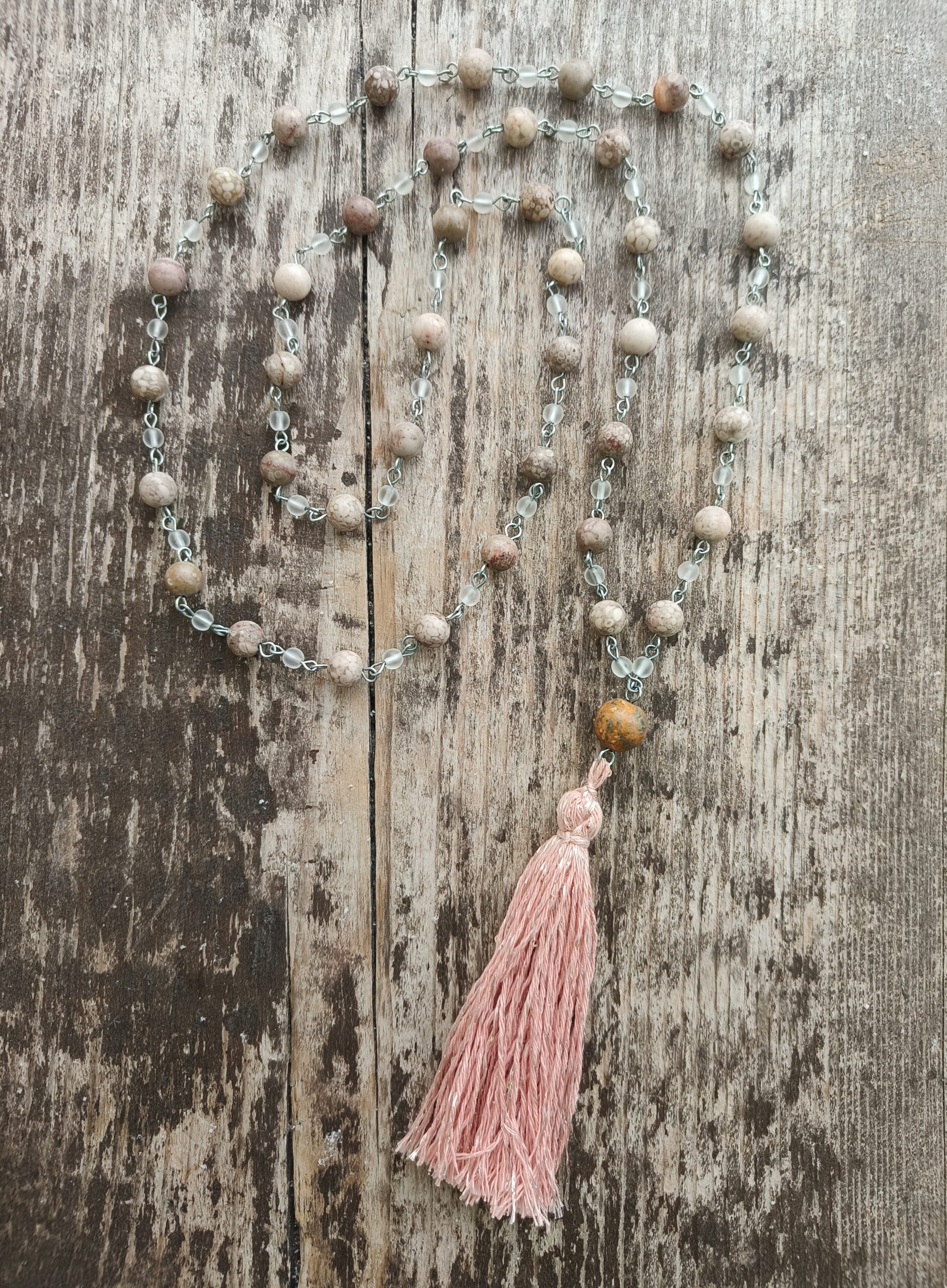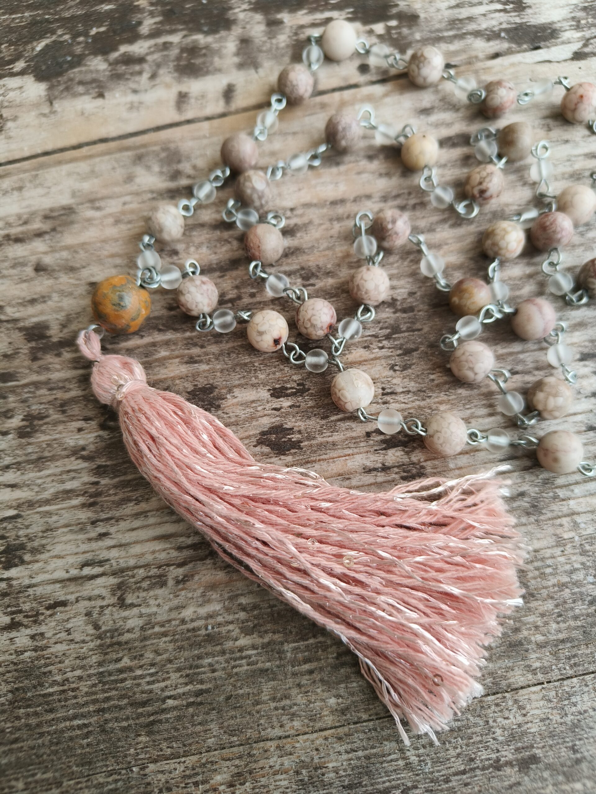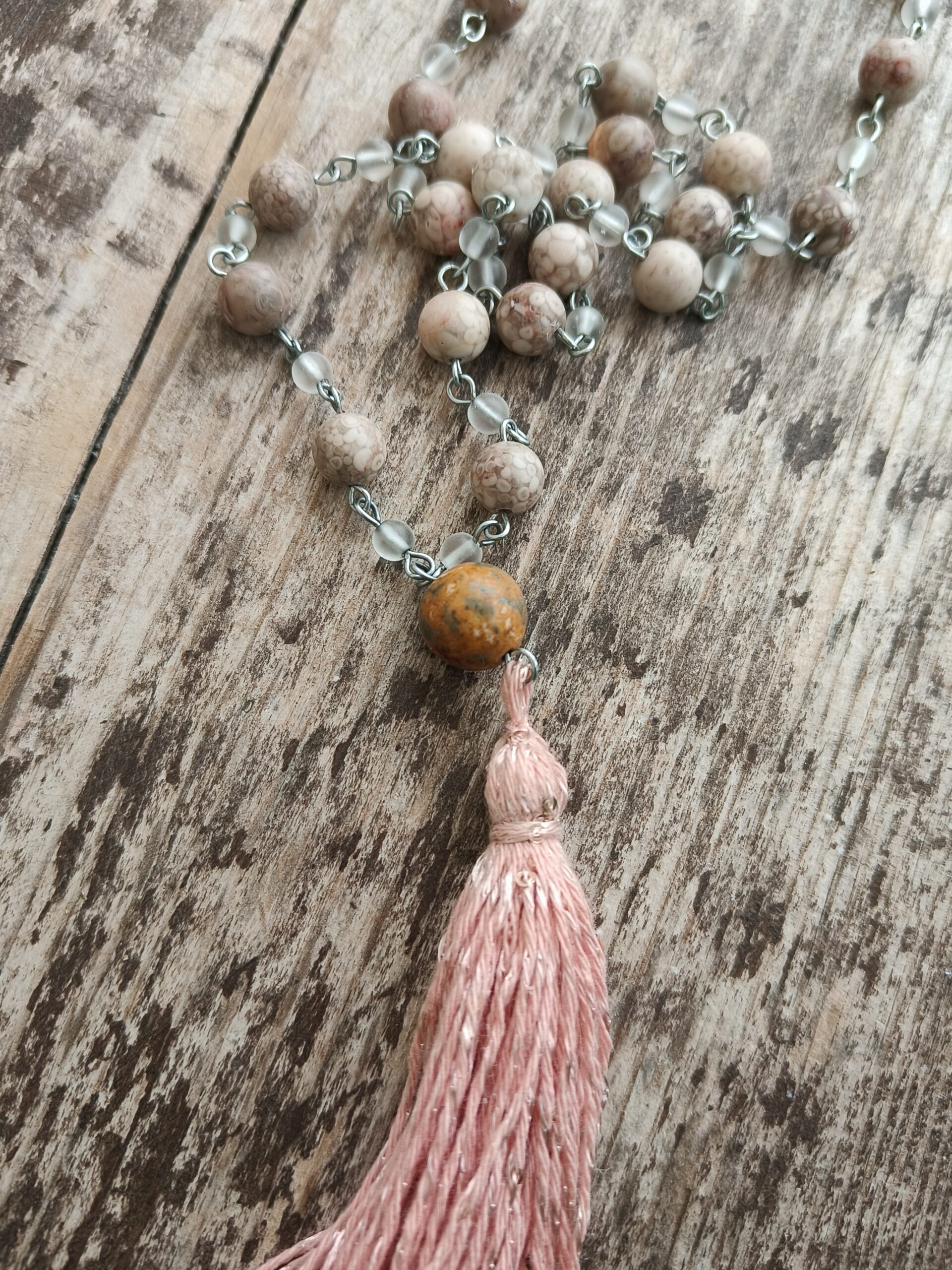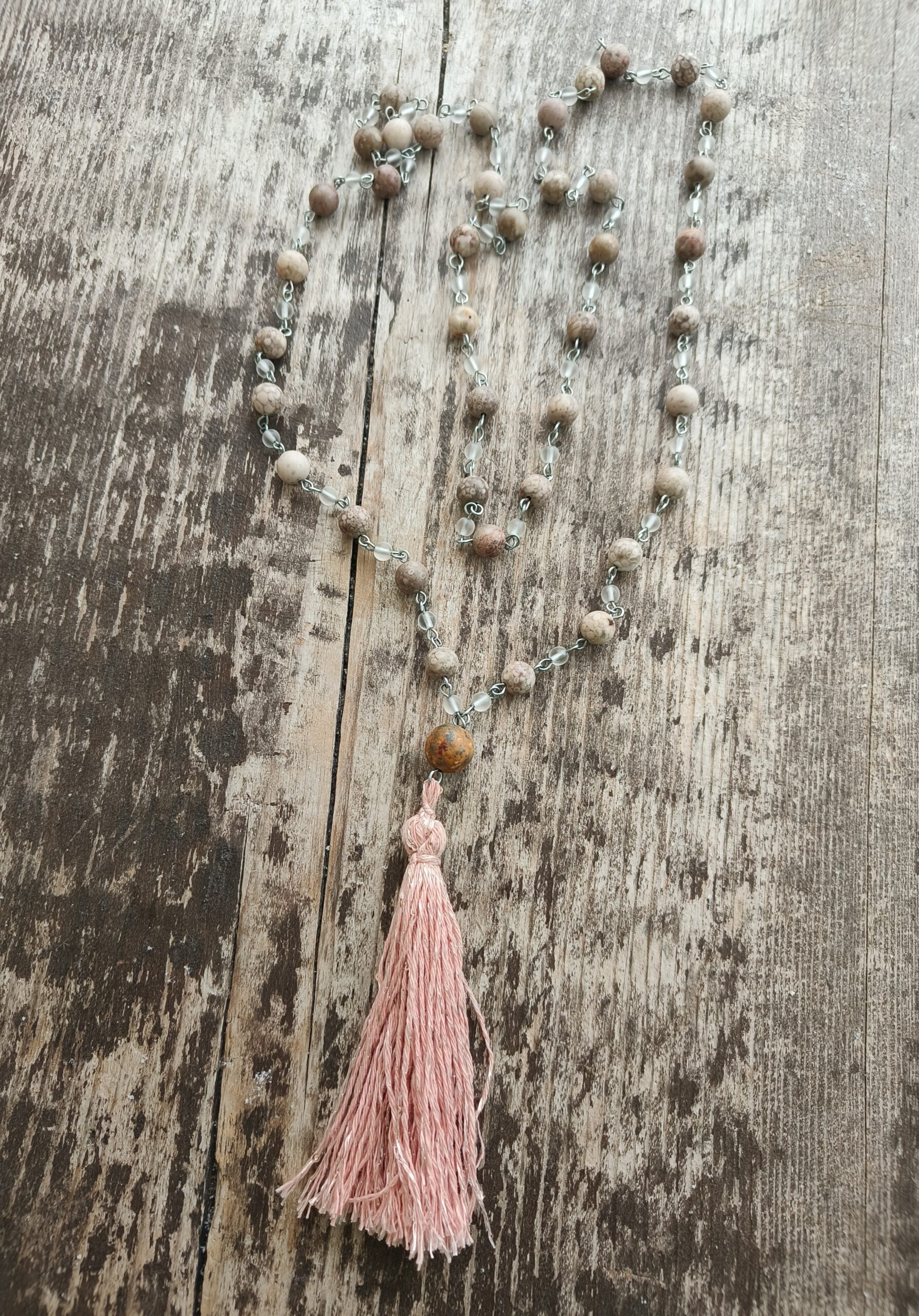 Boho stiilis pikk kaelakee tassel ripatsiga (narmastutiga). Valmistatud käsitsi beežidest jaspishelmestest ja mattidest läbipaistvatest klaashelmestest ning hõbeda värvi roostevabast terasest traadist. Tassel on tehtud läike ja litritega lõngast (60% polüester, 38% puuvill, 2% muud kiud). Kaelakee üldpikkus 64 cm. Helmestest ringne osa on 2 x 52 cm, millele lisandub tasseli ning jaspishelmega ripats 12 cm. Kee on pakendatud aknaga pruuni papist kinkekotikesse. Picasso jaspis on rahulik ja maandav kivi, mida seostatakse sisemise tasakaalu ja stabiilsusega. See toetab loovat mõtlemist ja aitab hoida selgust muutuste ajal. Jaspise pehme maaenergia sobib hästi igapäevaseks kandmiseks, pakkudes turvatunnet ja rahulikku enesekindlust.