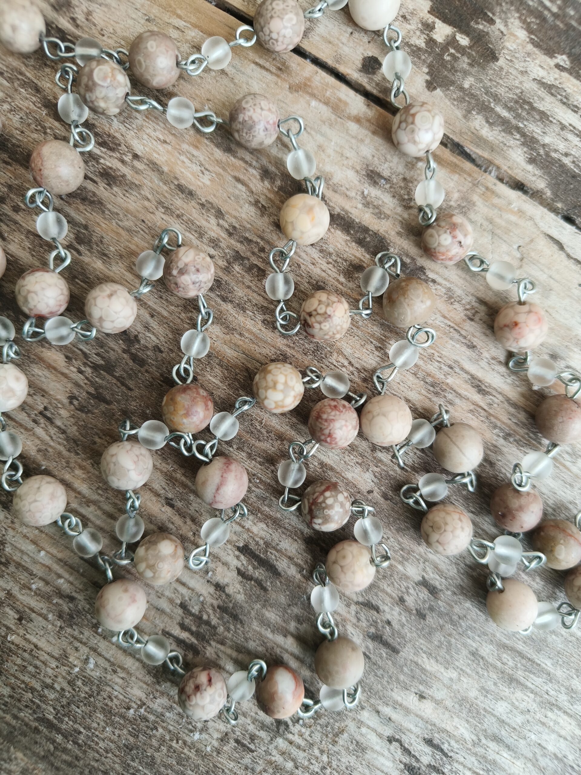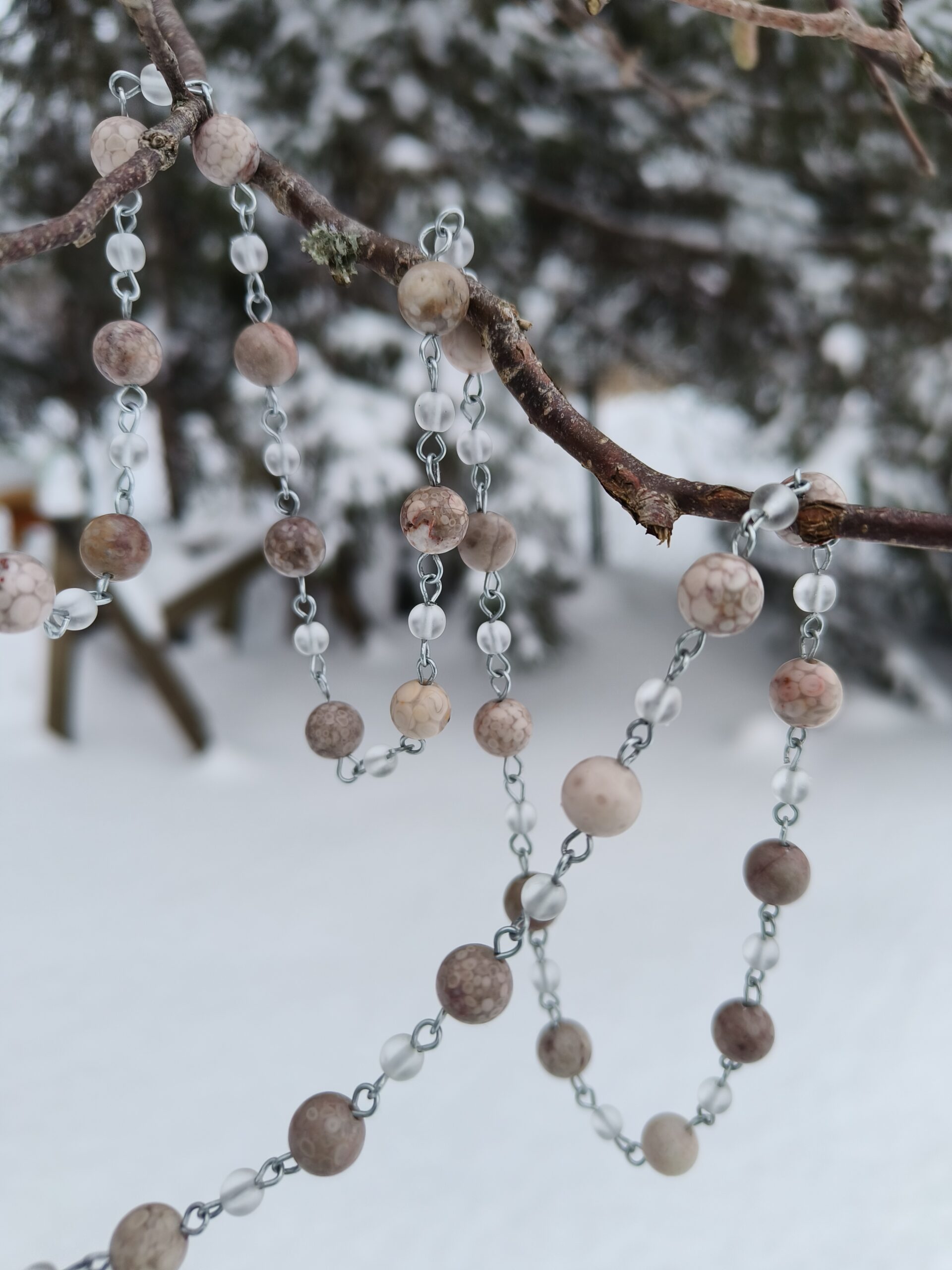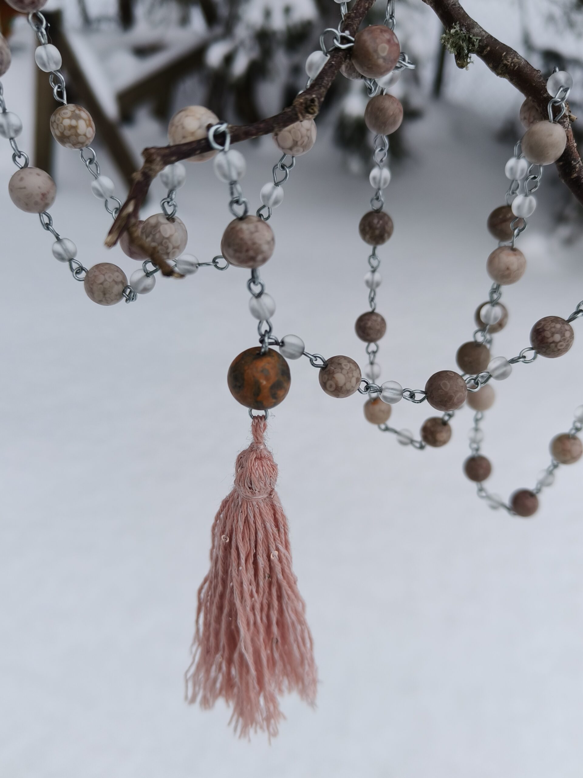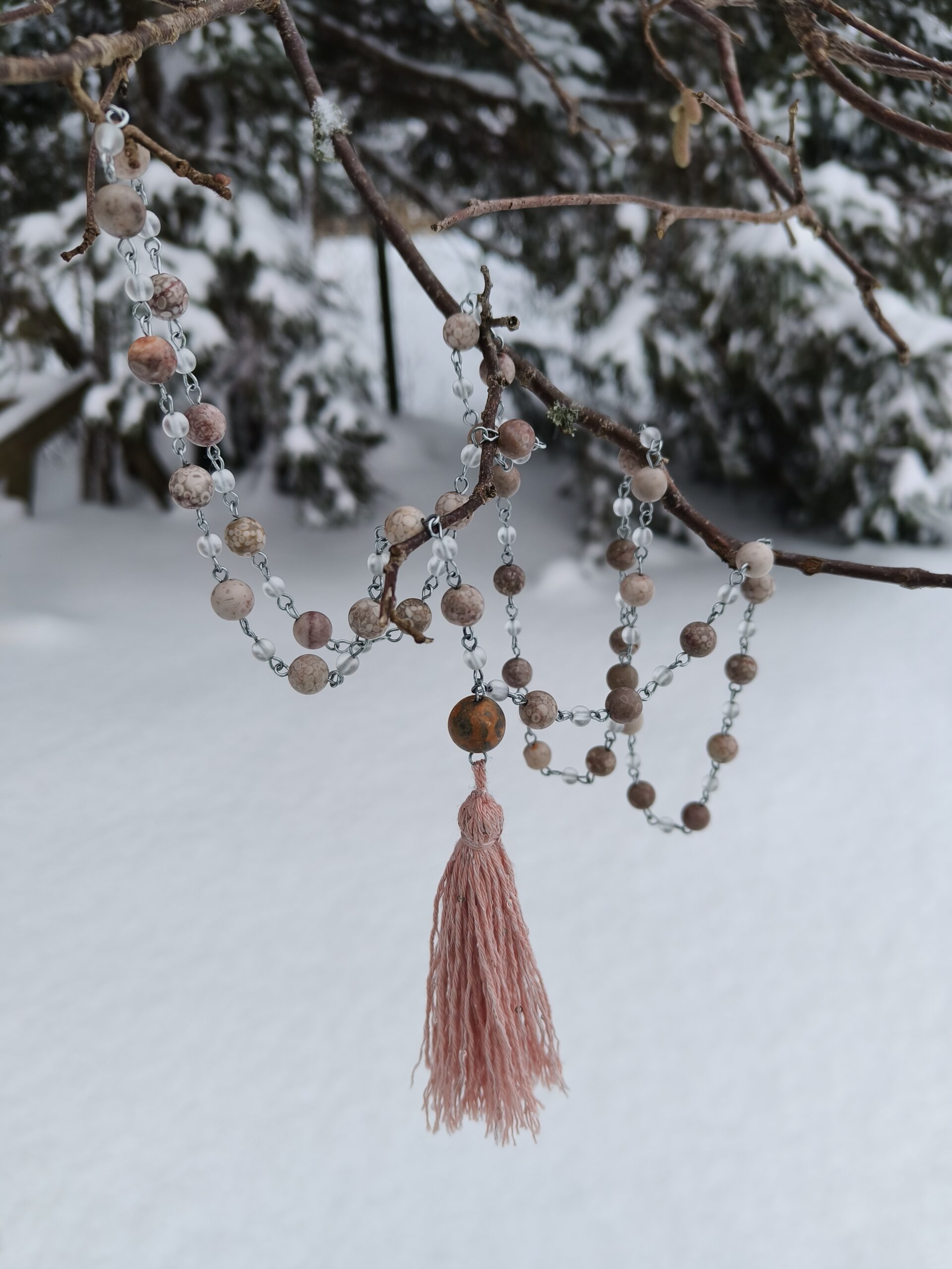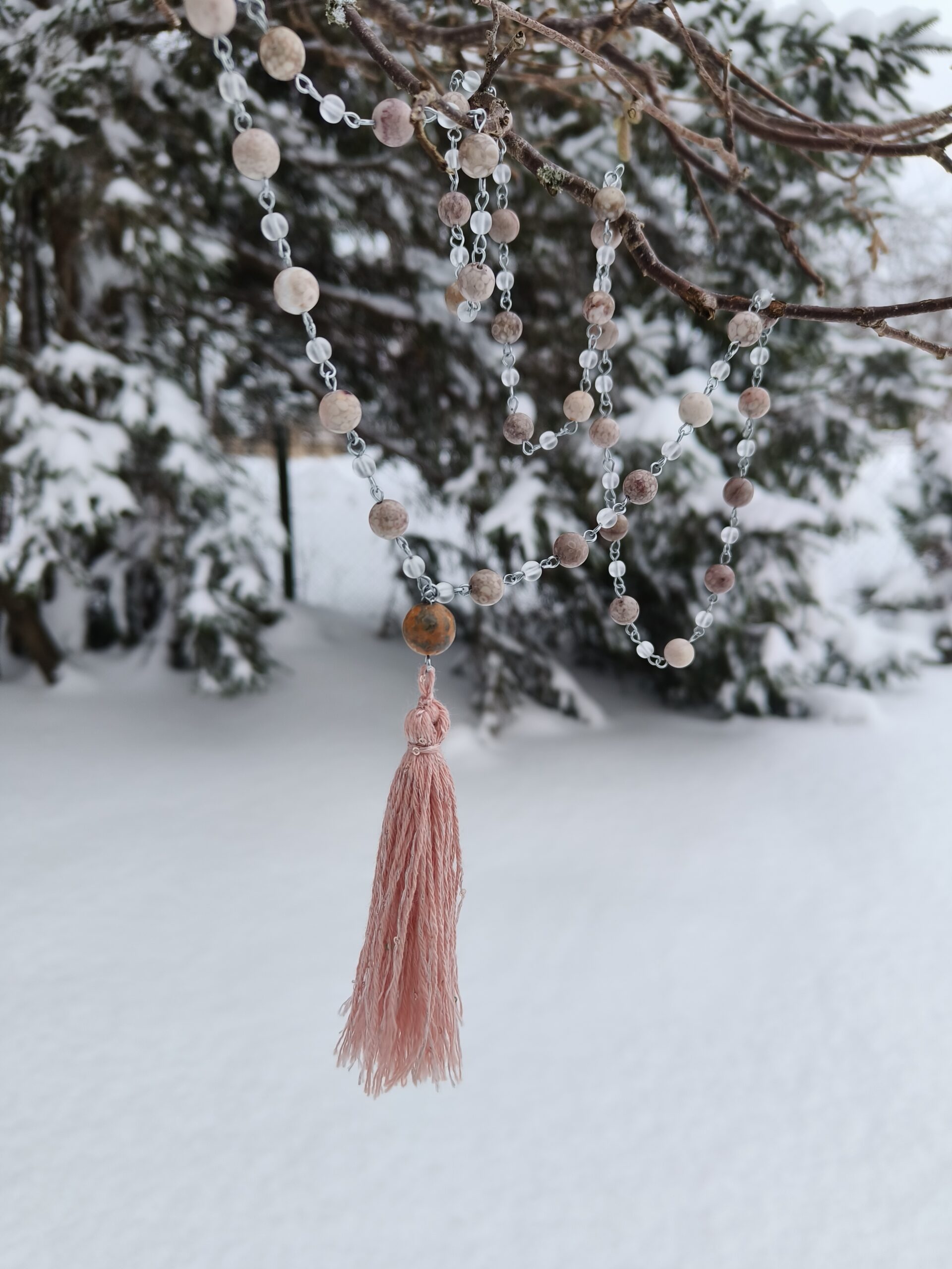 Boho stiilis pikk kaelakee tassel ripatsiga (narmastutiga). Valmistatud käsitsi beežidest jaspishelmestest ja mattidest läbipaistvatest klaashelmestest ning hõbeda värvi roostevabast terasest traadist. Tassel on tehtud läike ja litritega lõngast (60% polüester, 38% puuvill, 2% muud kiud). Kaelakee üldpikkus 64 cm. Helmestest ringne osa on 2 x 52 cm, millele lisandub tasseli ning jaspishelmega ripats 12 cm. Kee on pakendatud aknaga pruuni papist kinkekotikesse. Picasso jaspis on rahulik ja maandav kivi, mida seostatakse sisemise tasakaalu ja stabiilsusega. See toetab loovat mõtlemist ja aitab hoida selgust muutuste ajal. Jaspise pehme maaenergia sobib hästi igapäevaseks kandmiseks, pakkudes turvatunnet ja rahulikku enesekindlust.