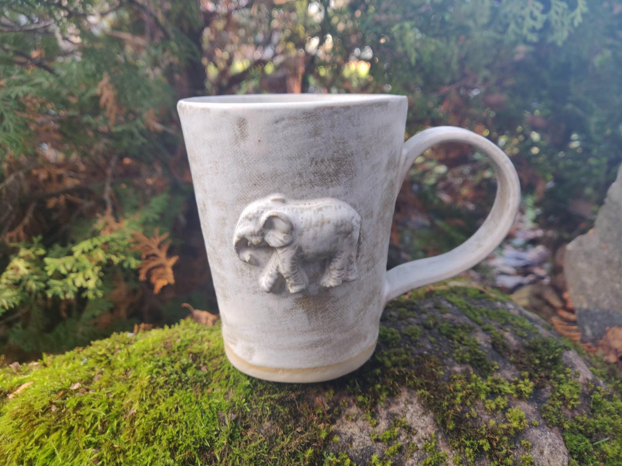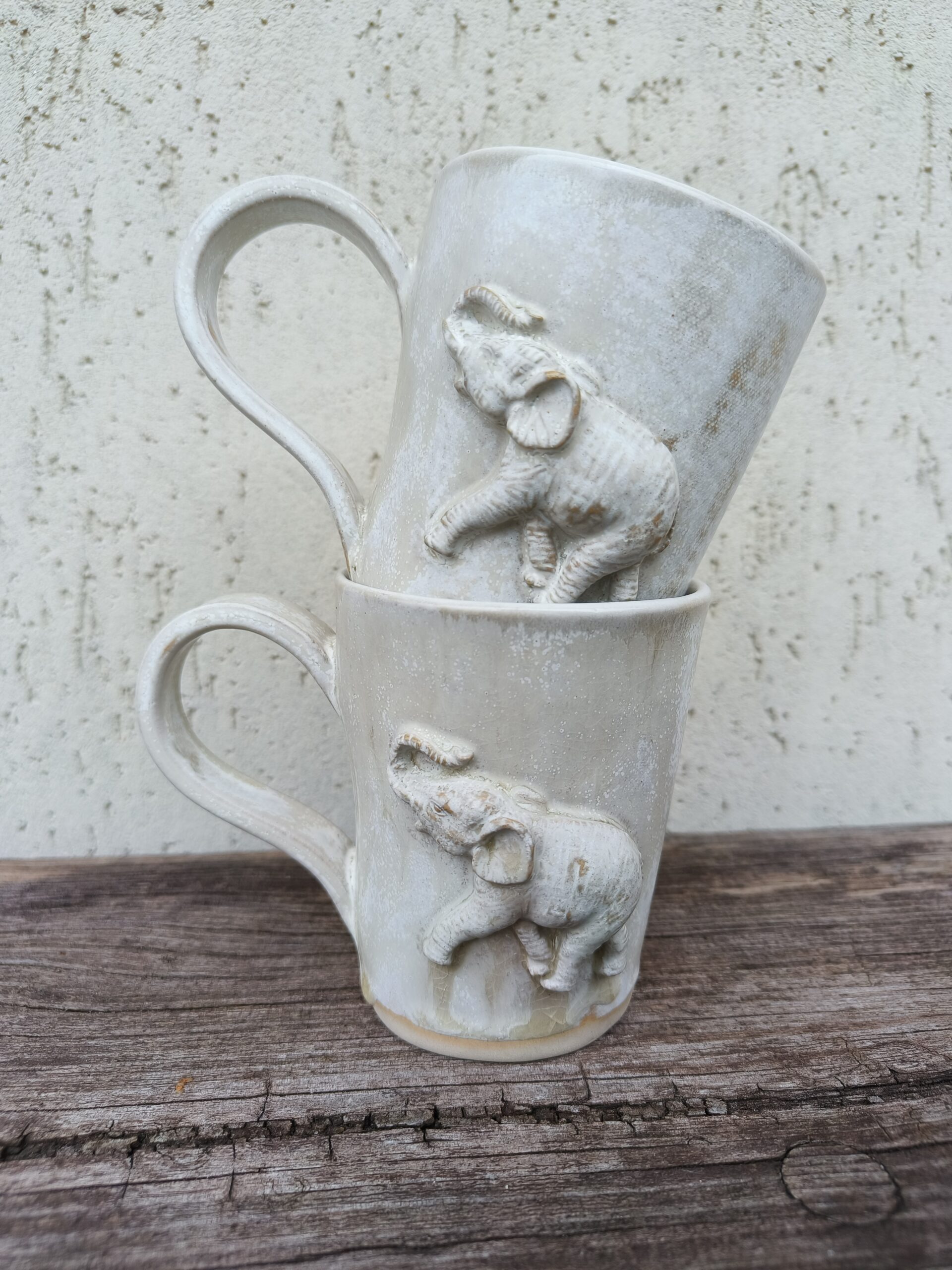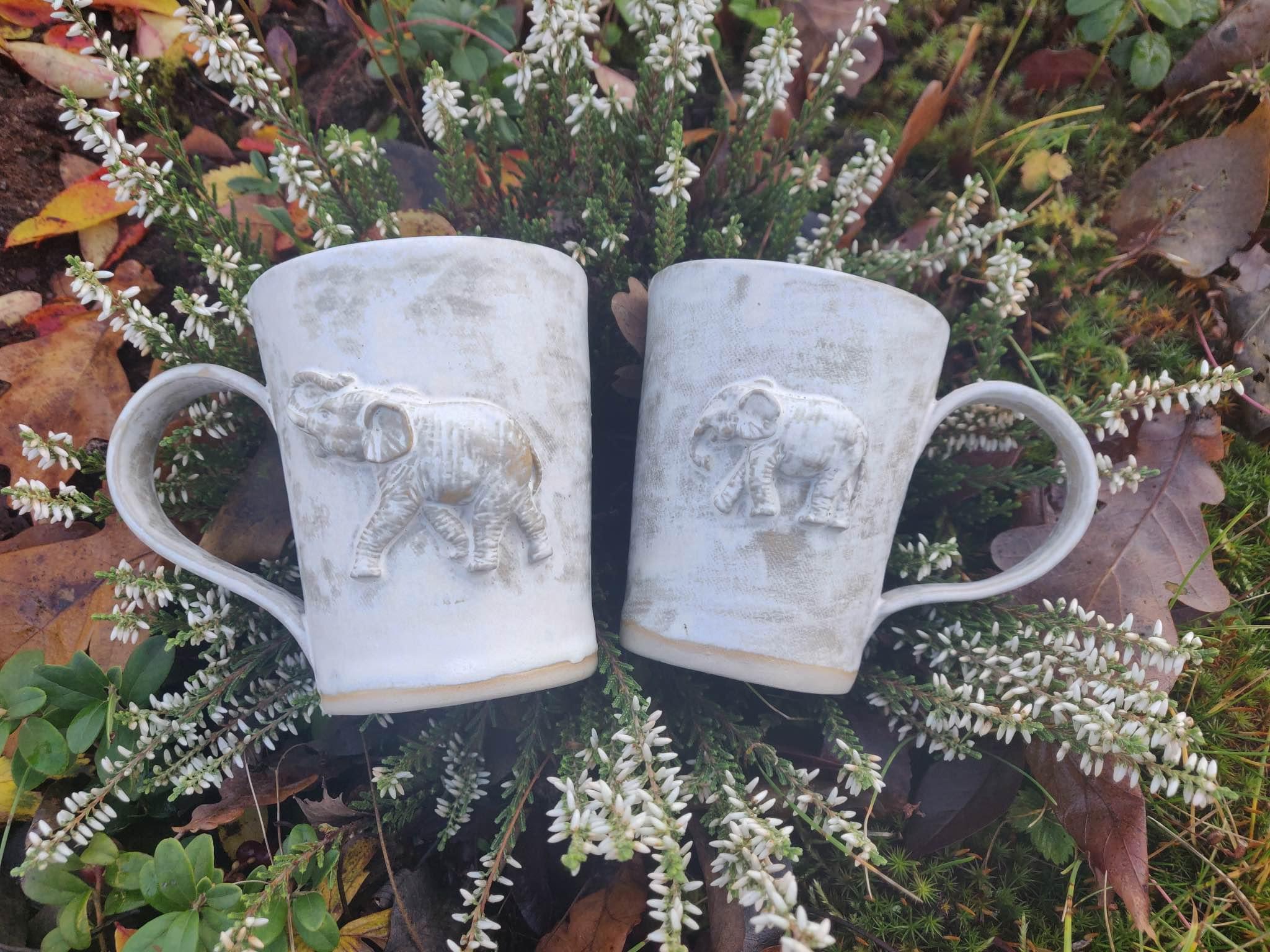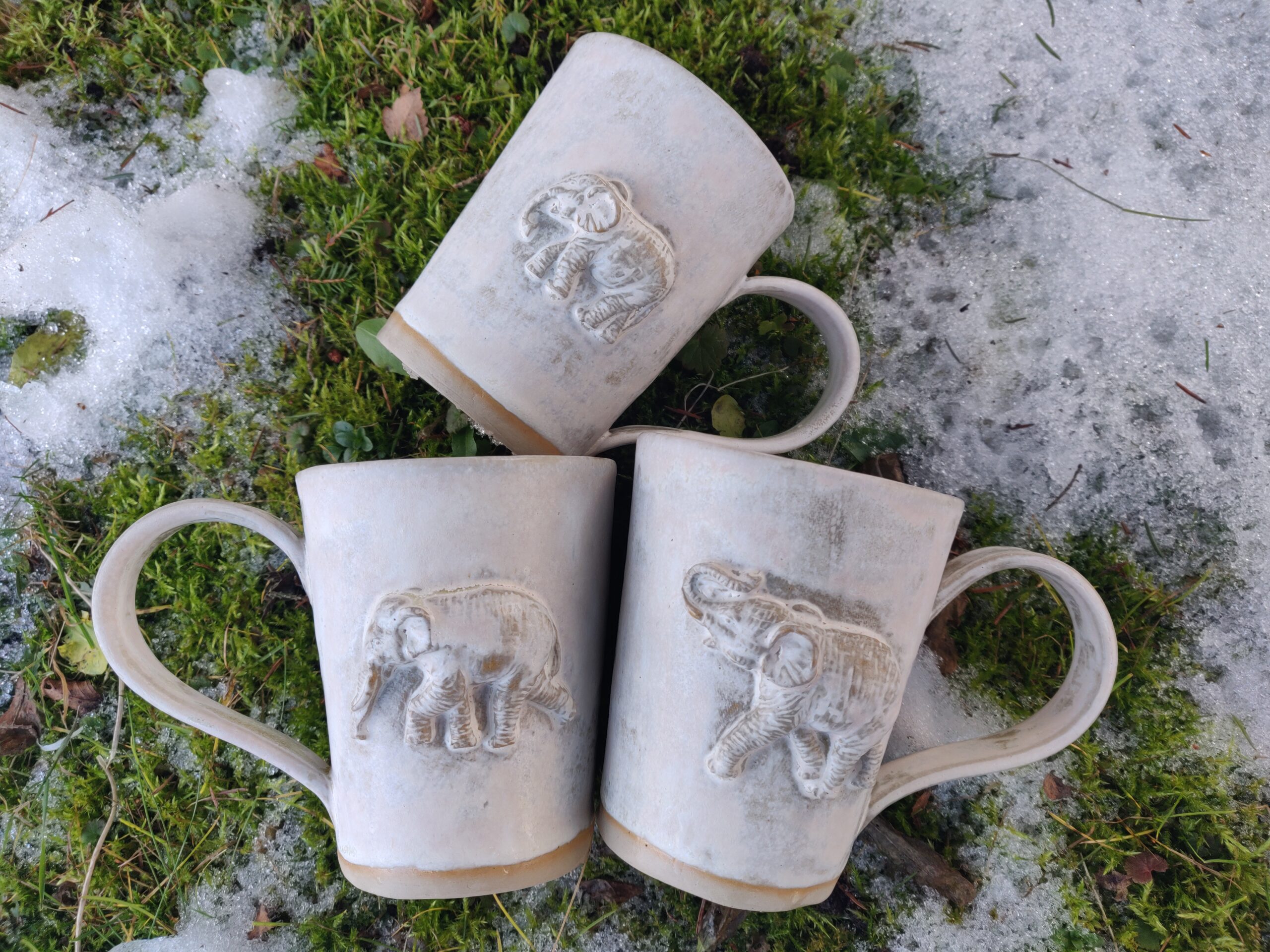 Kõrgkuumus käsitöökeraamika. Kolm ühesuurust tassi pealt mati ja seest läikiva glasuuriga. Igal tassil on erinev elevant. Ühe tassi mõlemal küljel samasugused elevandid. Tasside läbimõõt ülevalt 8,5 cm ja alt 6,5 cm. Kõrgus 10 cm. Mahutavus 300 ml. Võib pesta nõudepesumasinas. Komplekti sobivad alustaldrikud leiab SIIT.
