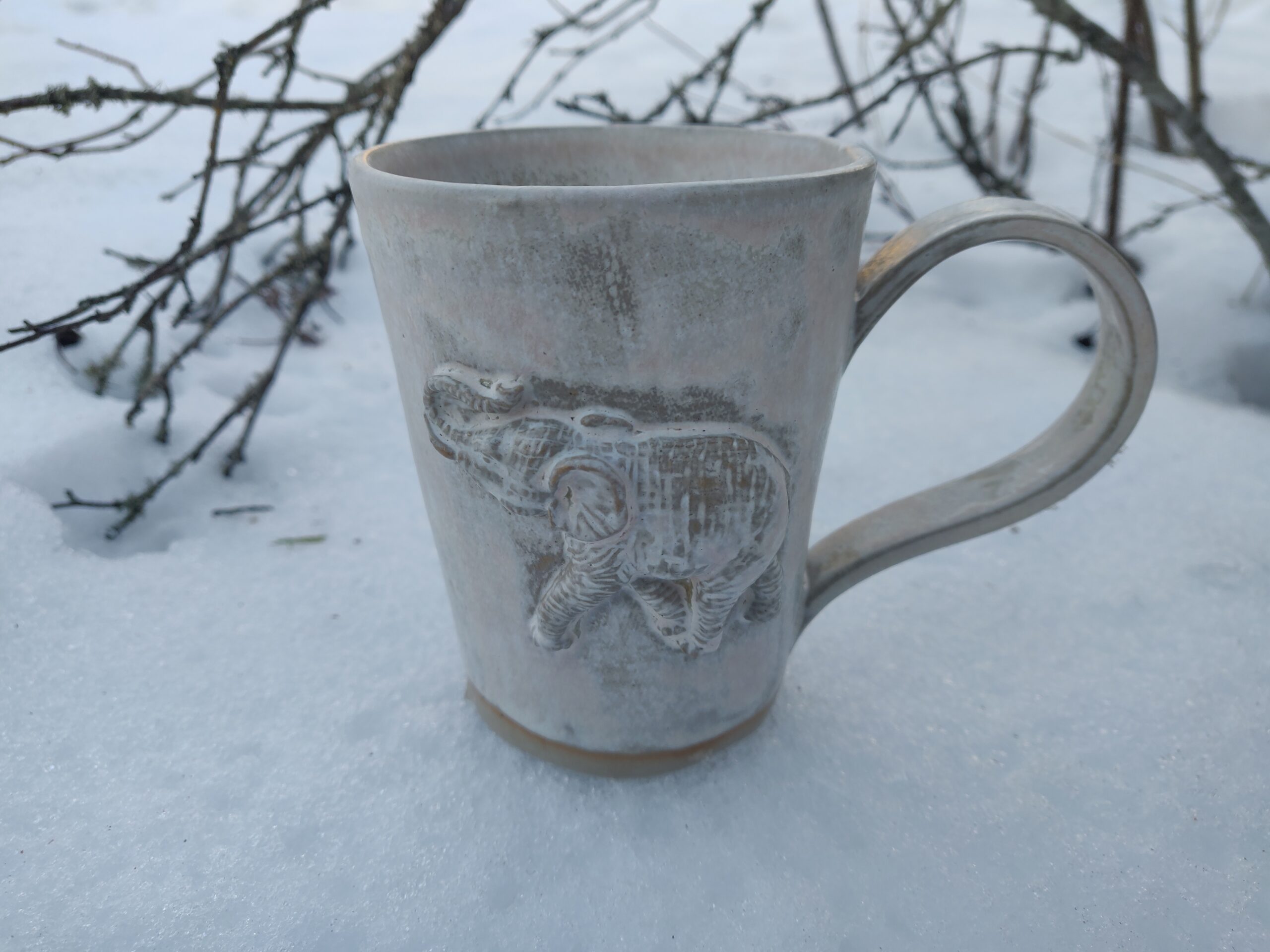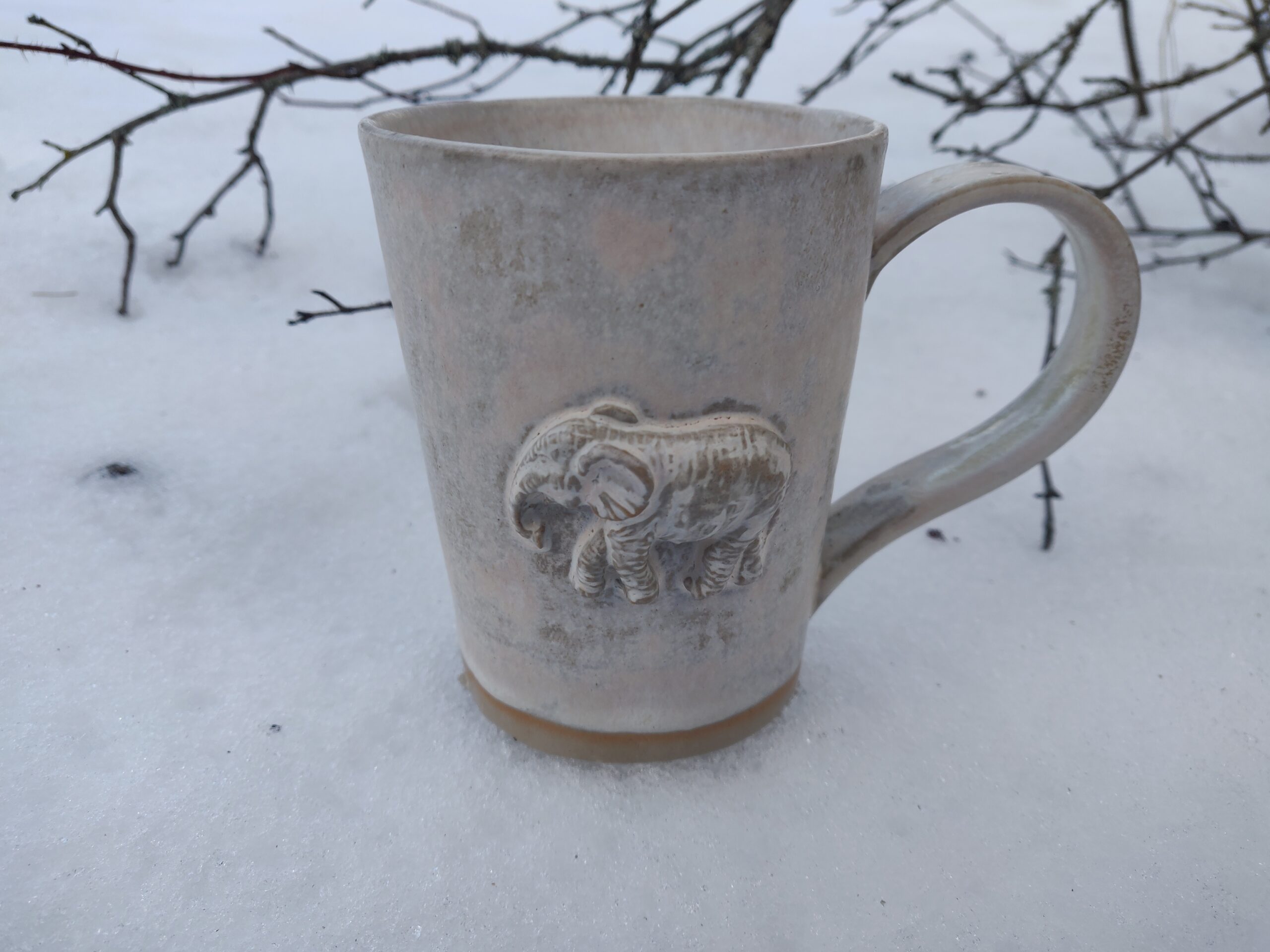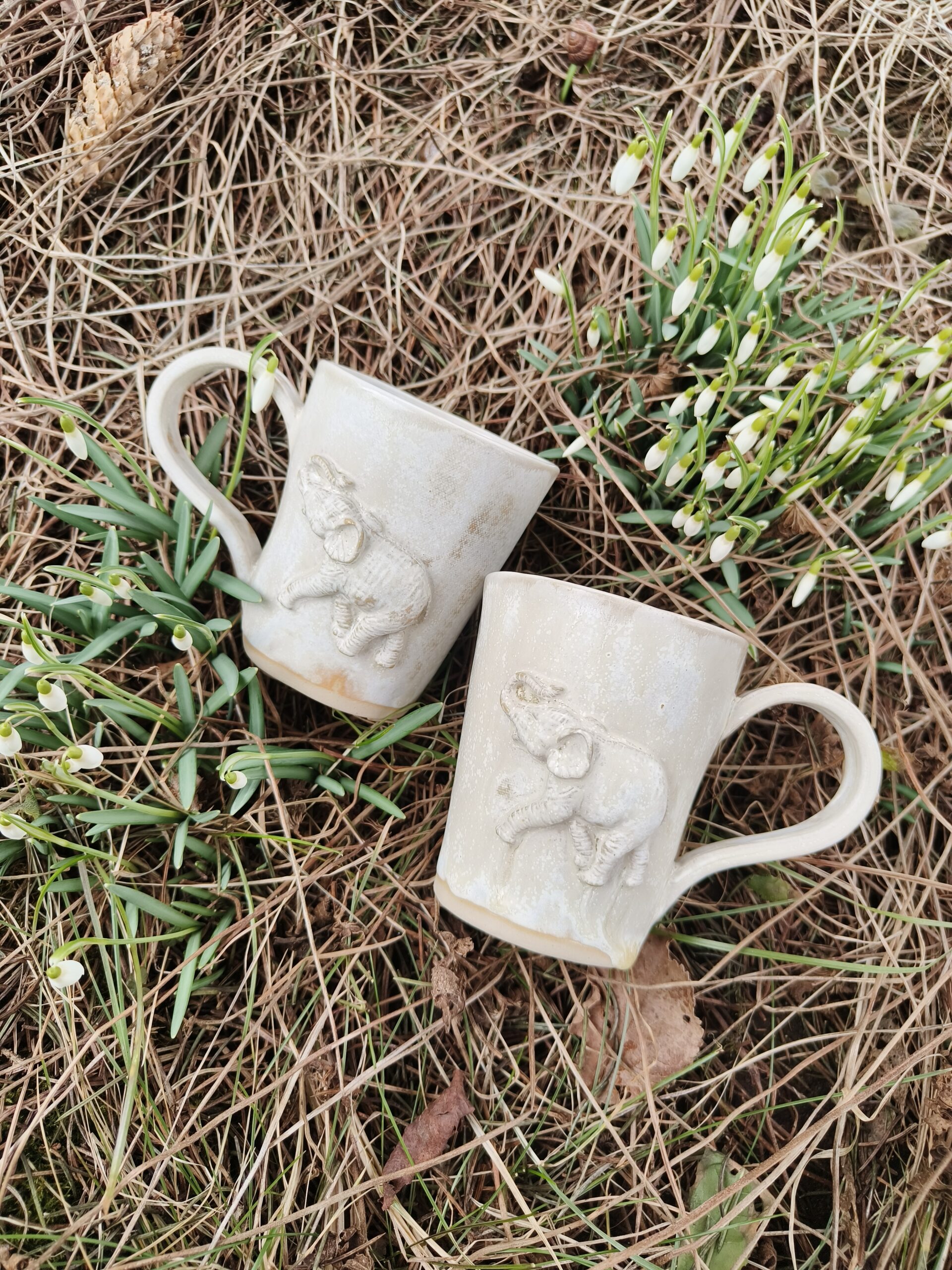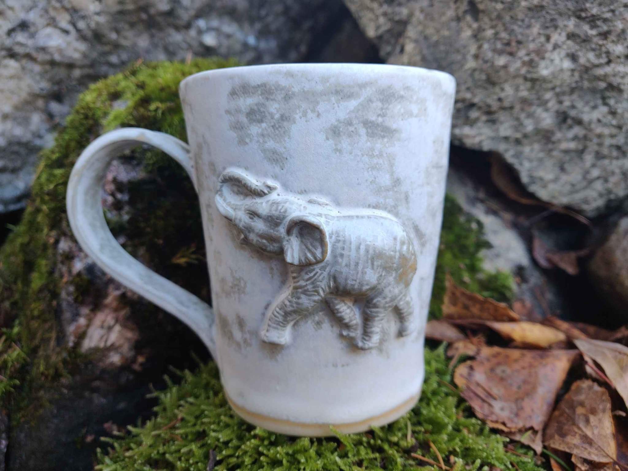 Kõrgkuumus käsitöökeraamika. Kolm ühesuurust tassi pealt mati ja seest läikiva glasuuriga. Igal tassil on erinev elevant. Ühe tassi mõlemal küljel samasugused elevandid. Tasside läbimõõt ülevalt 8,5 cm ja alt 6,5 cm. Kõrgus 10 cm. Mahutavus 300 ml. Võib pesta nõudepesumasinas. Komplekti sobivad alustaldrikud leiab SIIT.