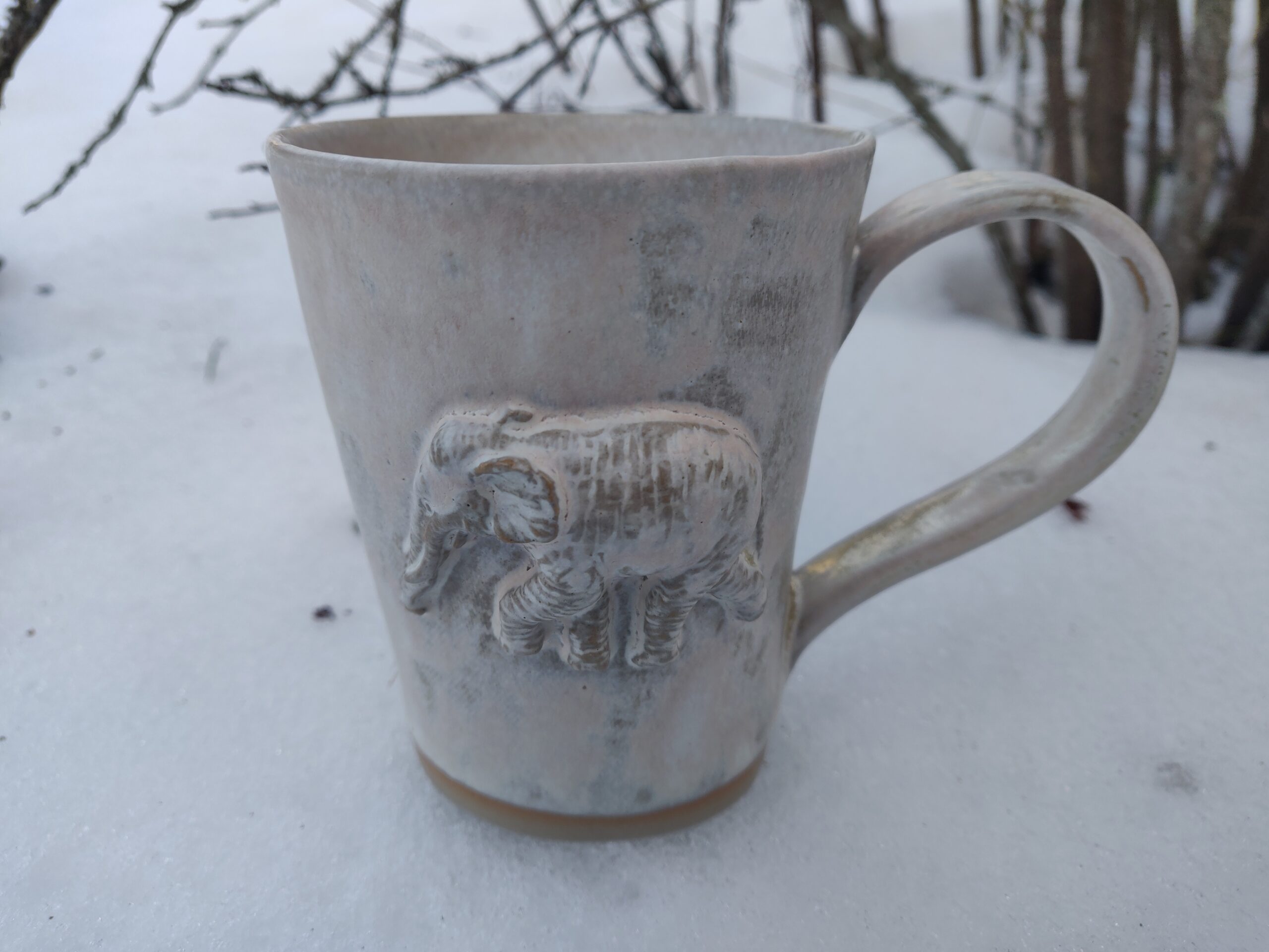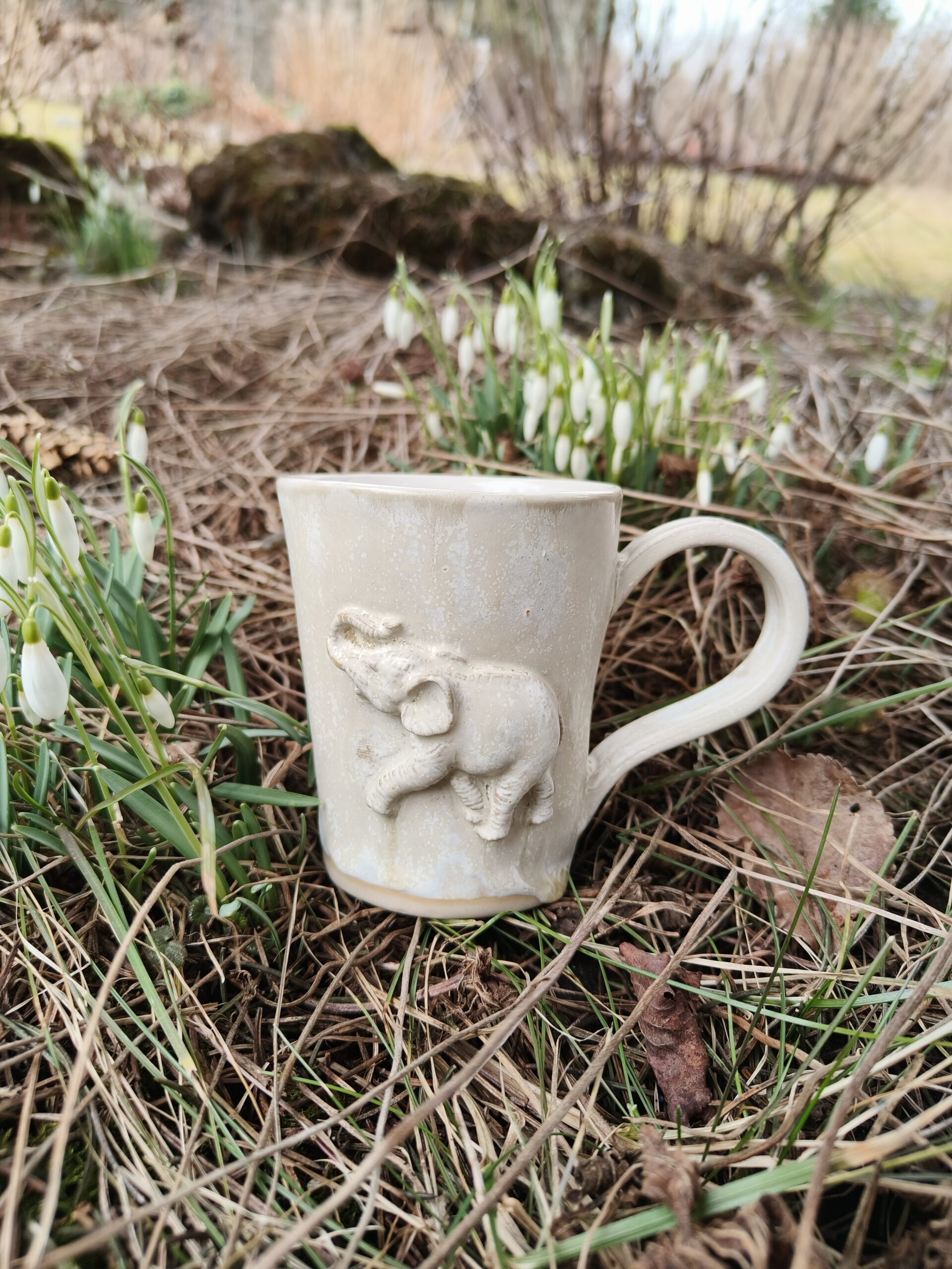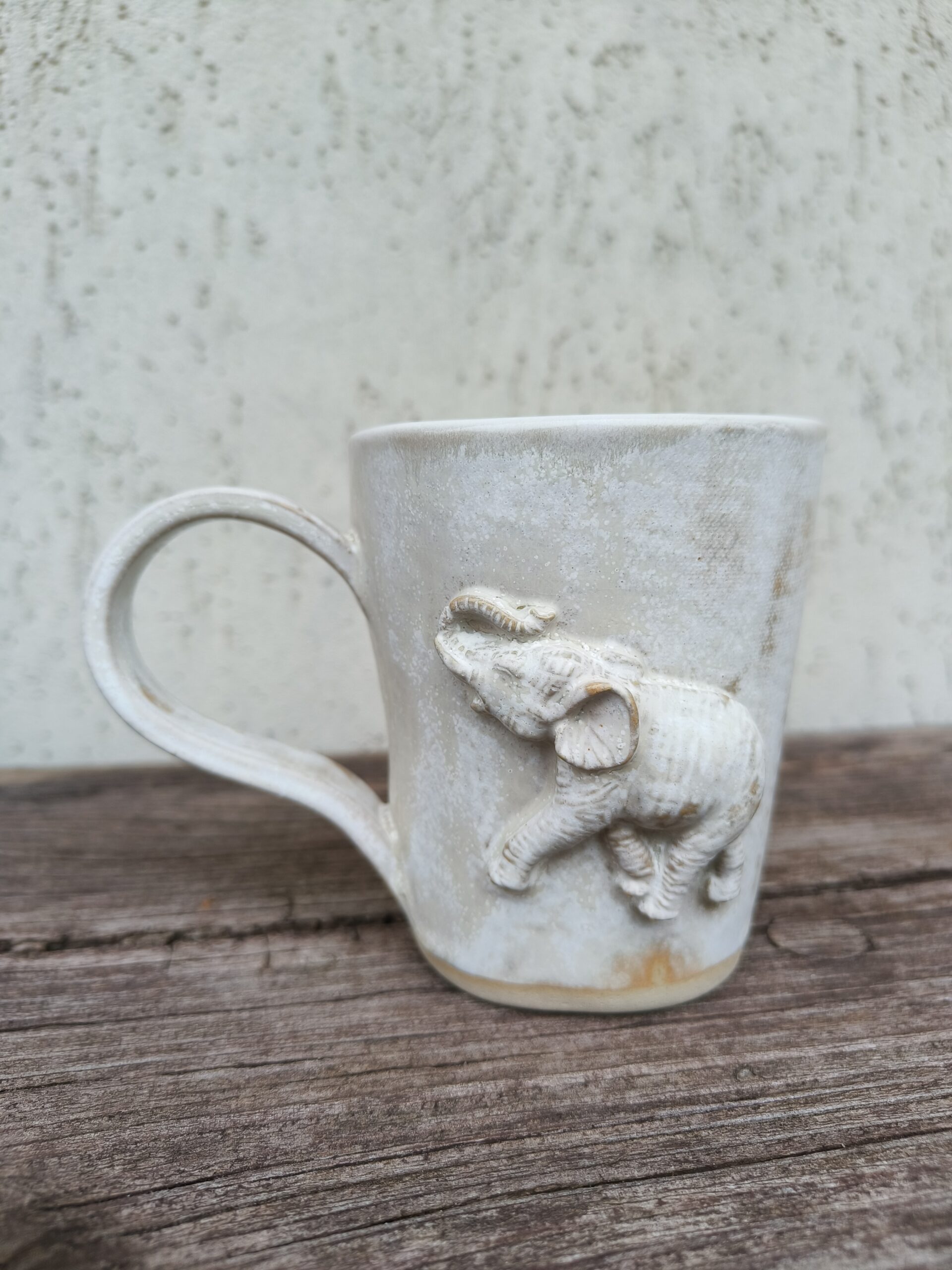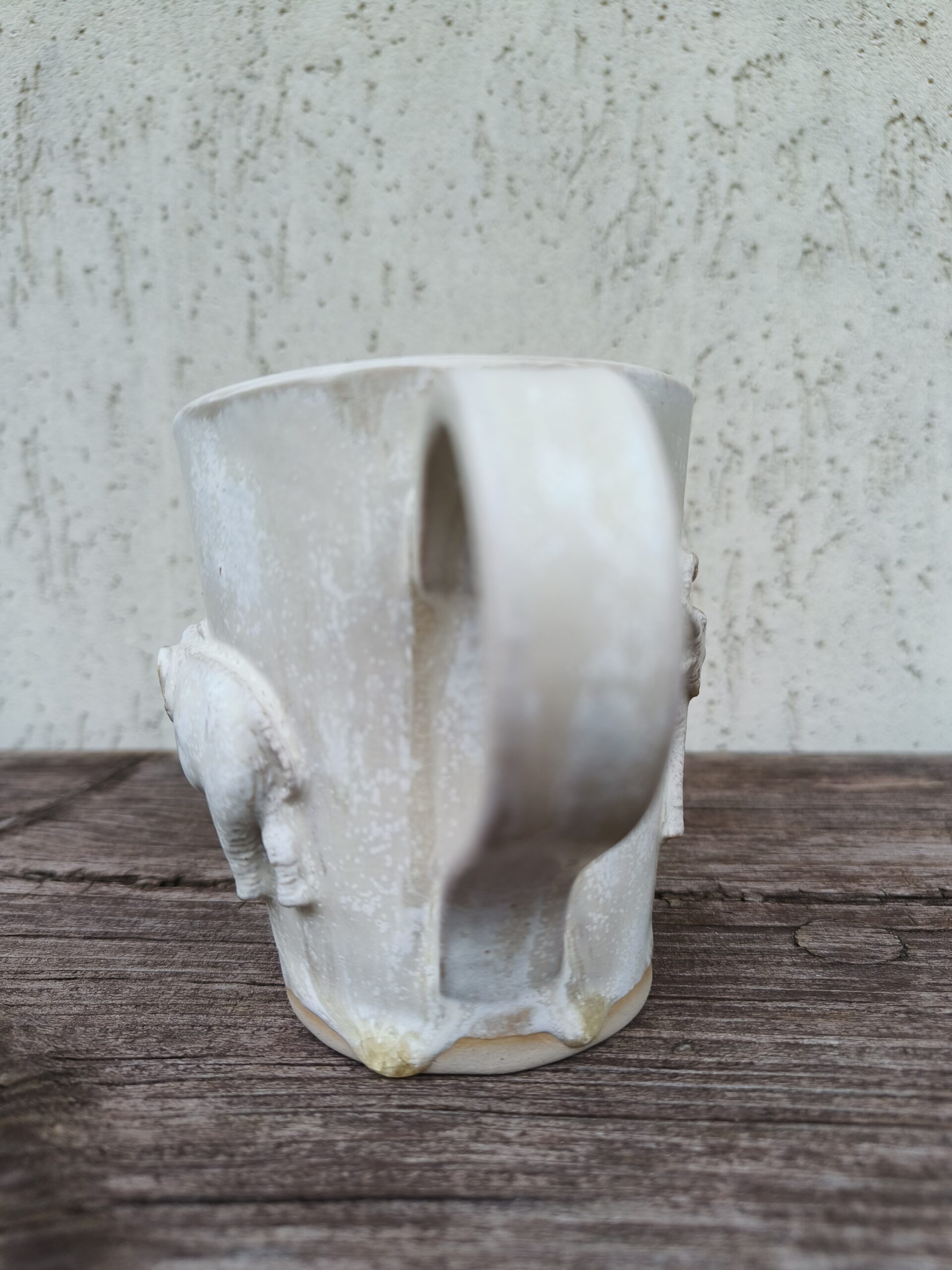 Kõrgkuumus käsitöökeraamika. Kolm ühesuurust tassi pealt mati ja seest läikiva glasuuriga. Igal tassil on erinev elevant. Ühe tassi mõlemal küljel samasugused elevandid. Tasside läbimõõt ülevalt 8,5 cm ja alt 6,5 cm. Kõrgus 10 cm. Mahutavus 300 ml. Võib pesta nõudepesumasinas. Komplekti sobivad alustaldrikud leiab SIIT.