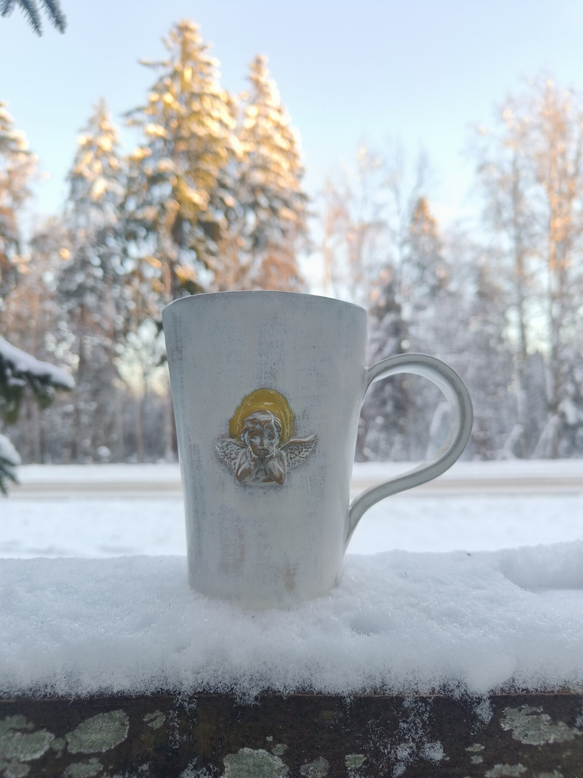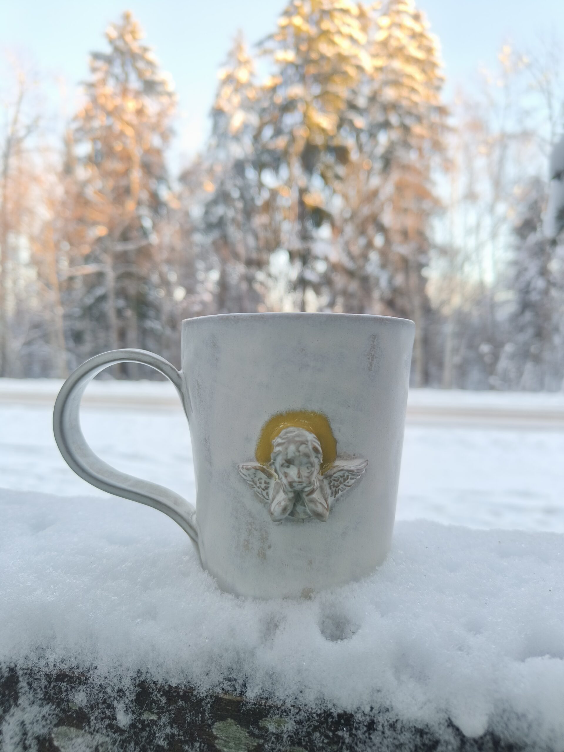 Kõrgkuumus käsitöökeraamika. Kahes suuruses tassid. Tassi mõlemal küljel pühapaistega ingel. Suurema tassi mahutavus 450 ml. Läbimõõt ülevalt 9,5 cm ja alt 6,5 cm, kõrgus 13 cm. Väiksema tassi mahutavus 320 ml. Läbimõõt ülevalt 9 cm ja alt 6,5 cm, kõrgus 10 cm. Pealt mati, seest läikiva glasuuriga. Võib pesta nõudepesumasinas.