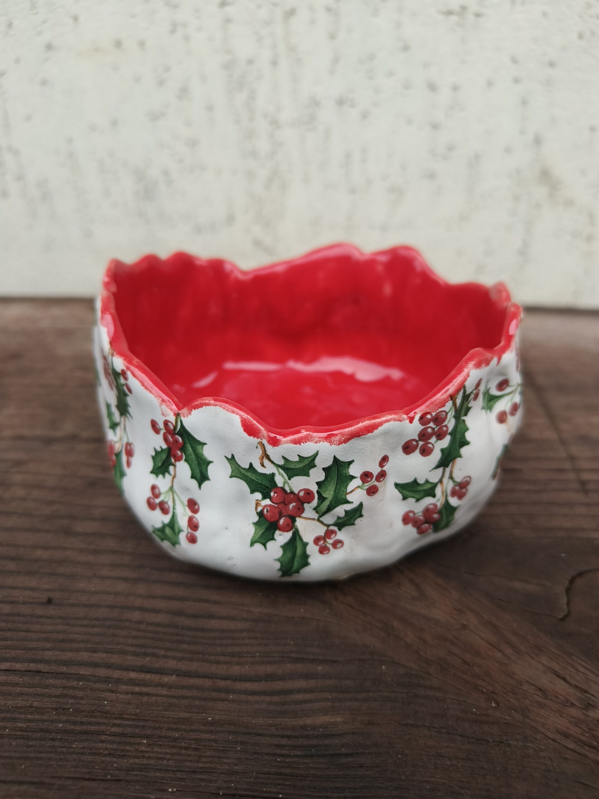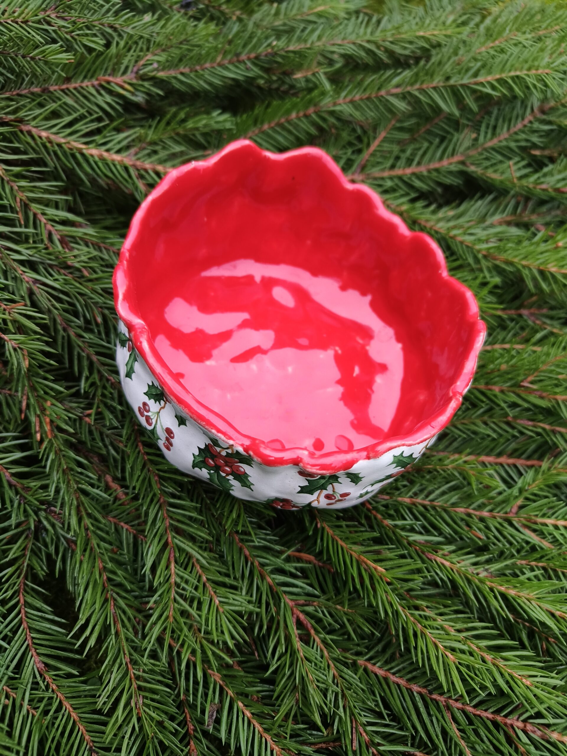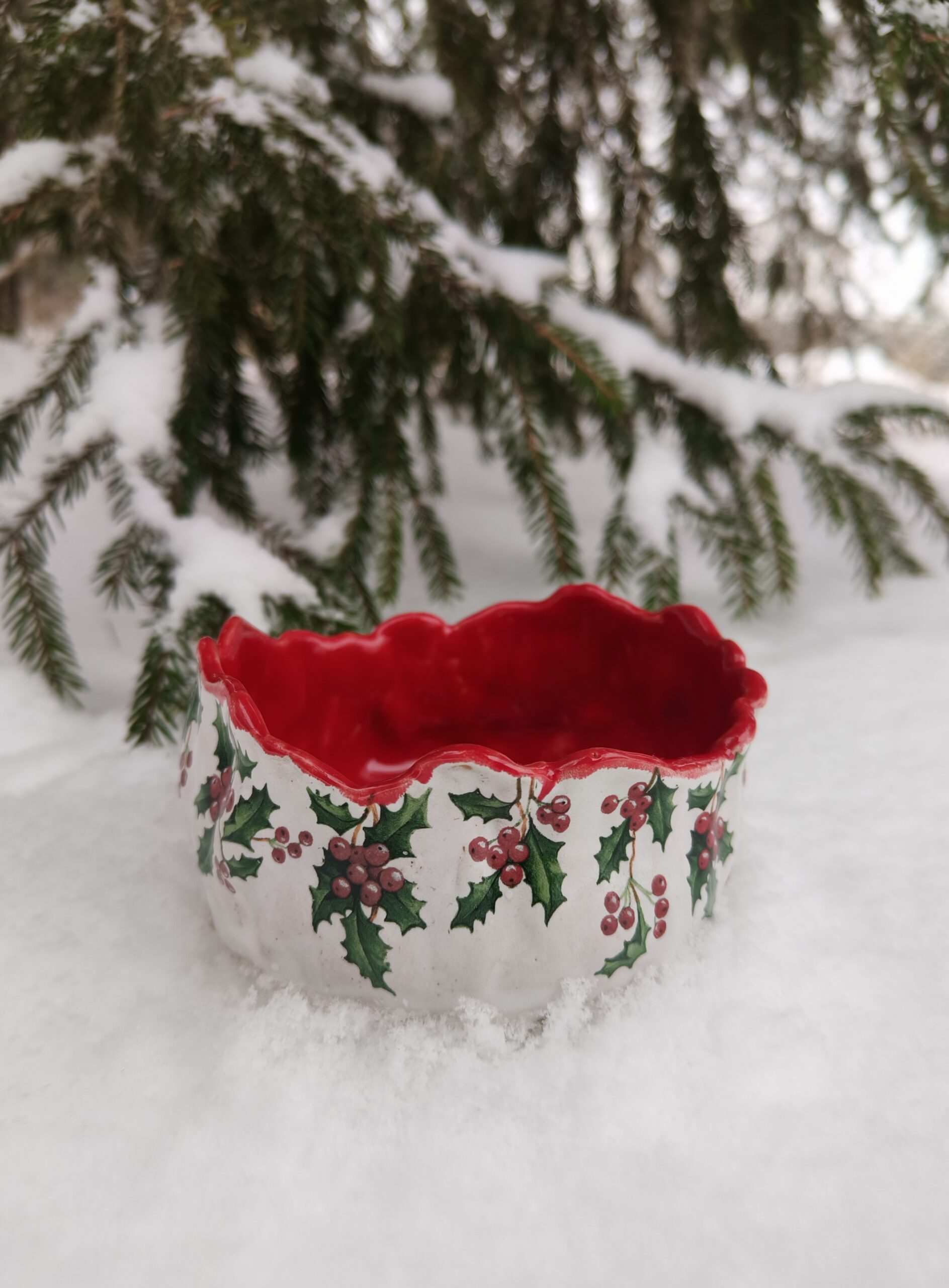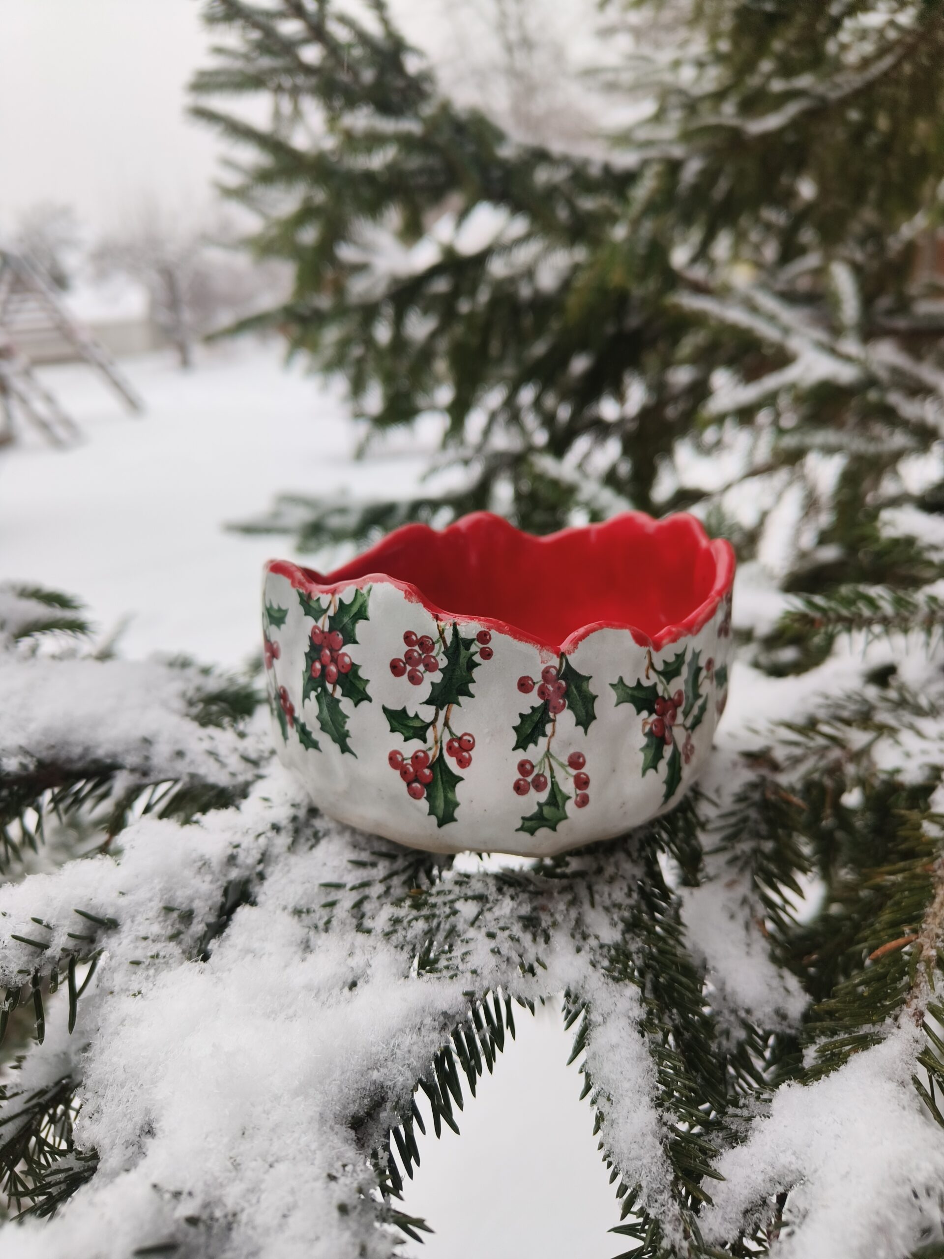 Kõrgkuumus käsitöökeraamika. Klassikalistes jõuluvärvides ja iileksioksa mustriga kaunistatud seest punane kauss. Taotluslikult ebaühtlane ülaäär. Kauss mahutab 300 ml. Läbimõõt 11 cm, kõrgus 6 cm. Läikiva glasuuriga. Võib pesta nõudepesumasinas. Rohkem jõuluteemalisi tooteid leiab SIIT.