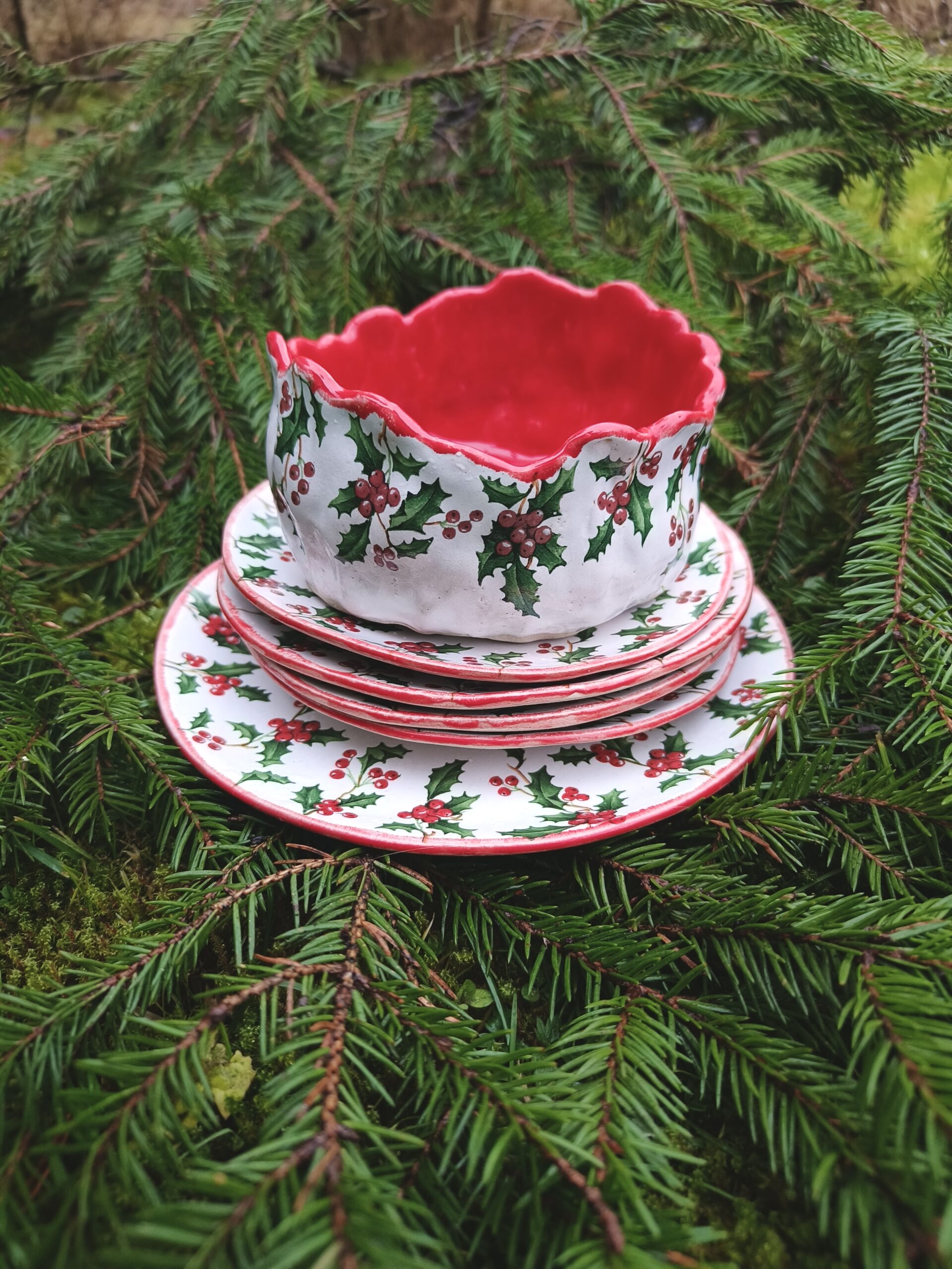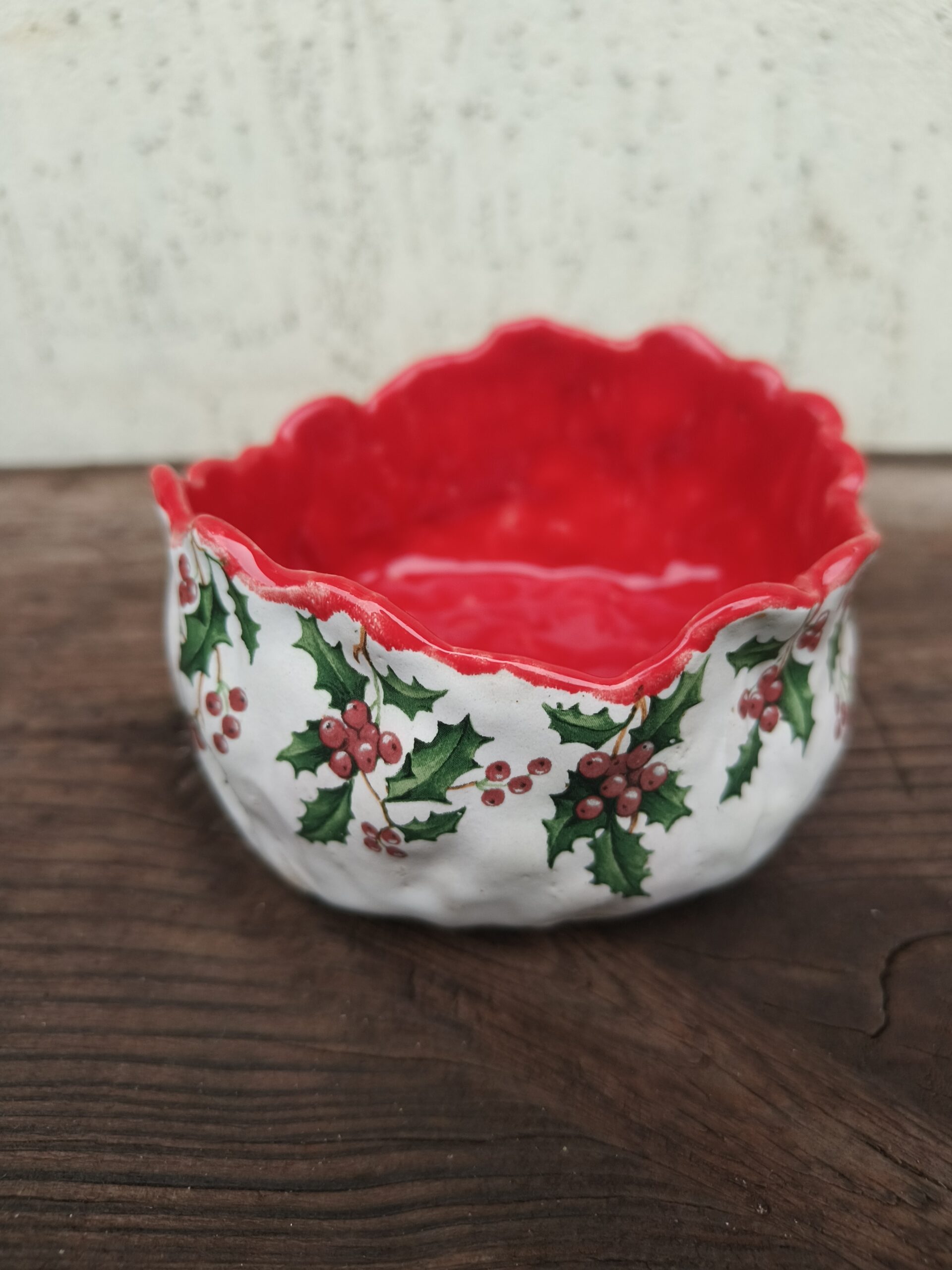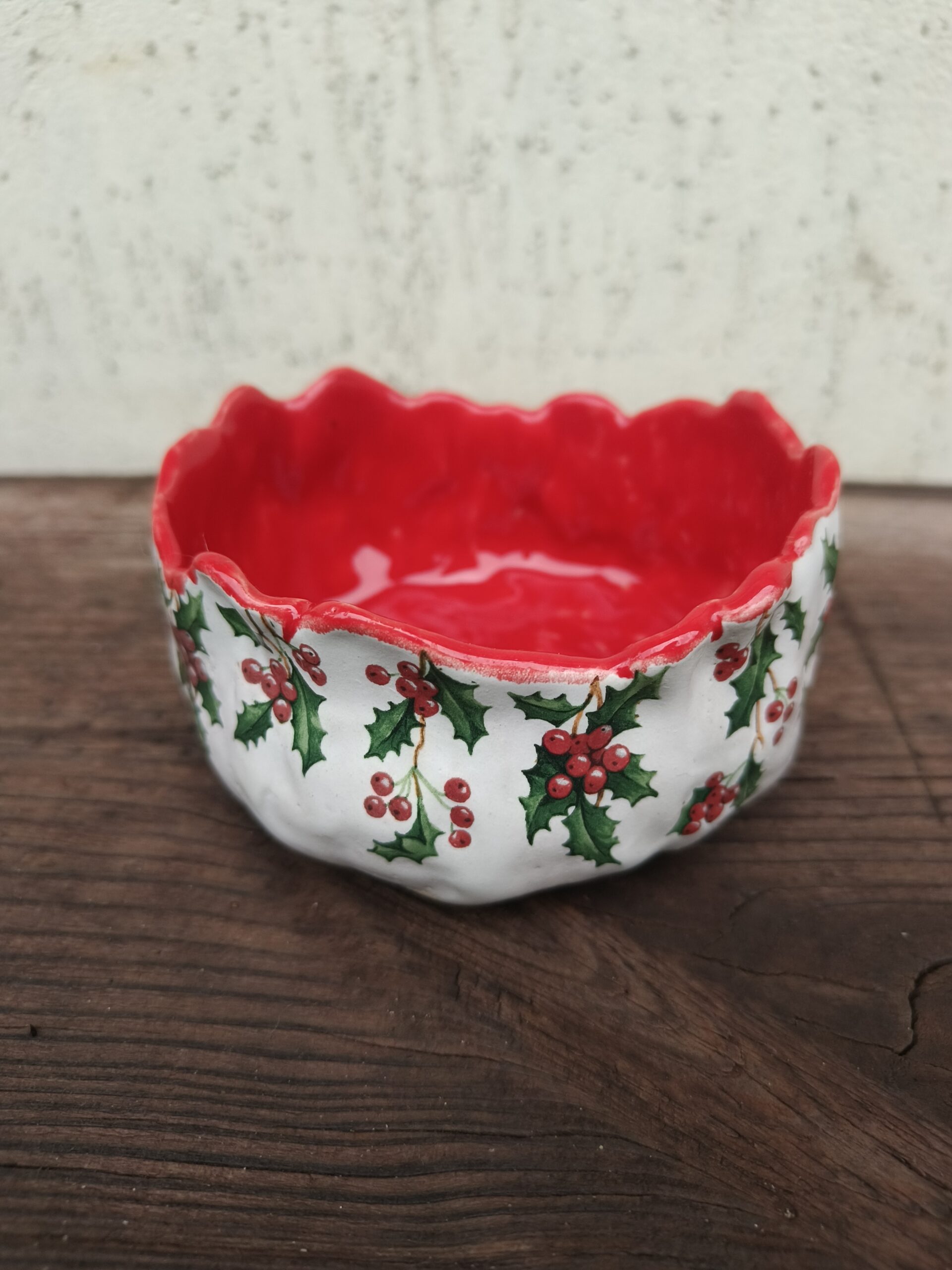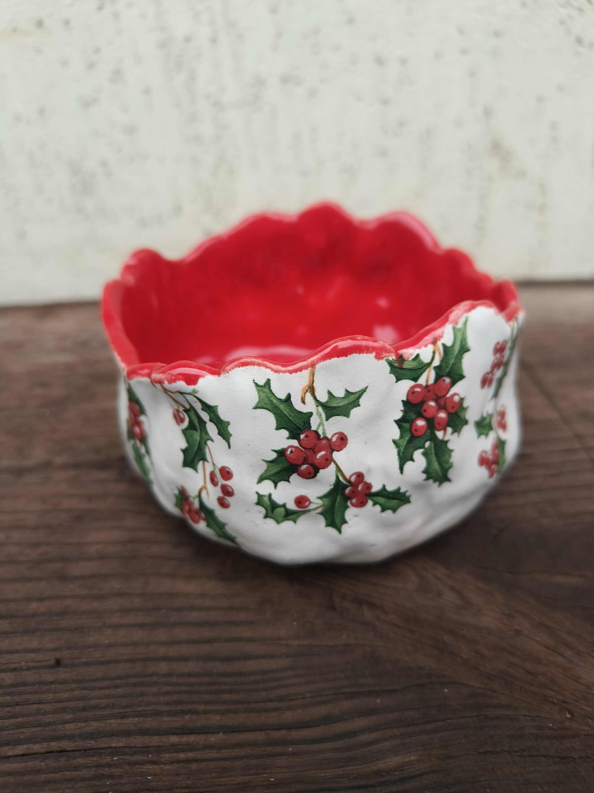 Kõrgkuumus käsitöökeraamika. Klassikalistes jõuluvärvides ja iileksioksa mustriga kaunistatud seest punane kauss. Taotluslikult ebaühtlane ülaäär. Kauss mahutab 300 ml. Läbimõõt 11 cm, kõrgus 6 cm. Läikiva glasuuriga. Võib pesta nõudepesumasinas. Rohkem jõuluteemalisi tooteid leiab SIIT.