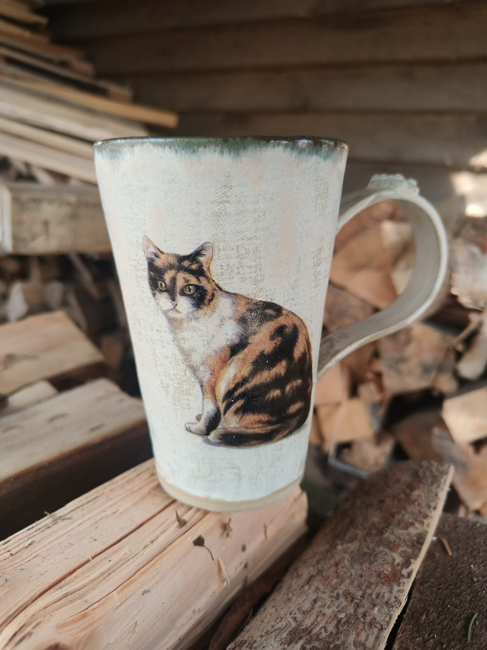Kõrgkuumus käsitöökeraamika. Tassi mahutavus keskmiselt 450 ml. Kõrgus 13-13,5 cm, läbimõõt ülevalt 9-9,5 cm ja alt 6,5 cm. Pealt mati, seest läikiva glasuuriga. Võib pesta nõudepesumasinas. Sobiva alustaldriku leiab SIIT. Valida on, kas kahe või nelja käpajäljega taldrik. Sobivad mõlemad.