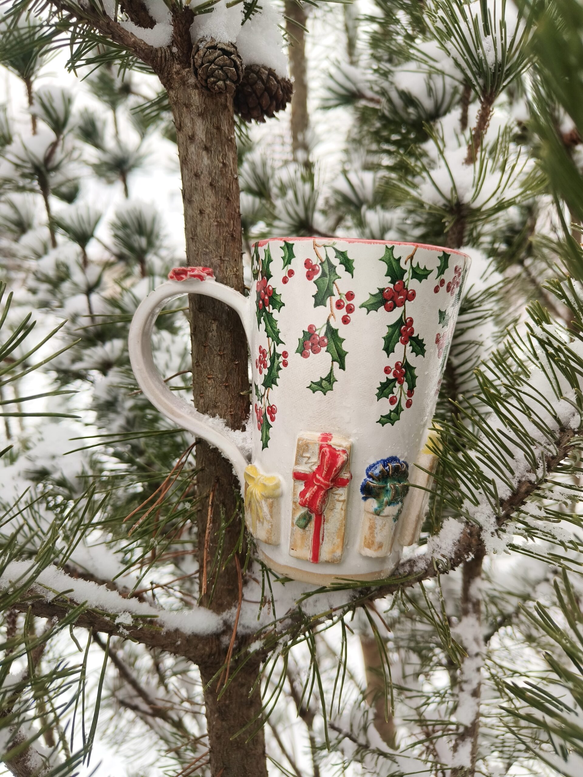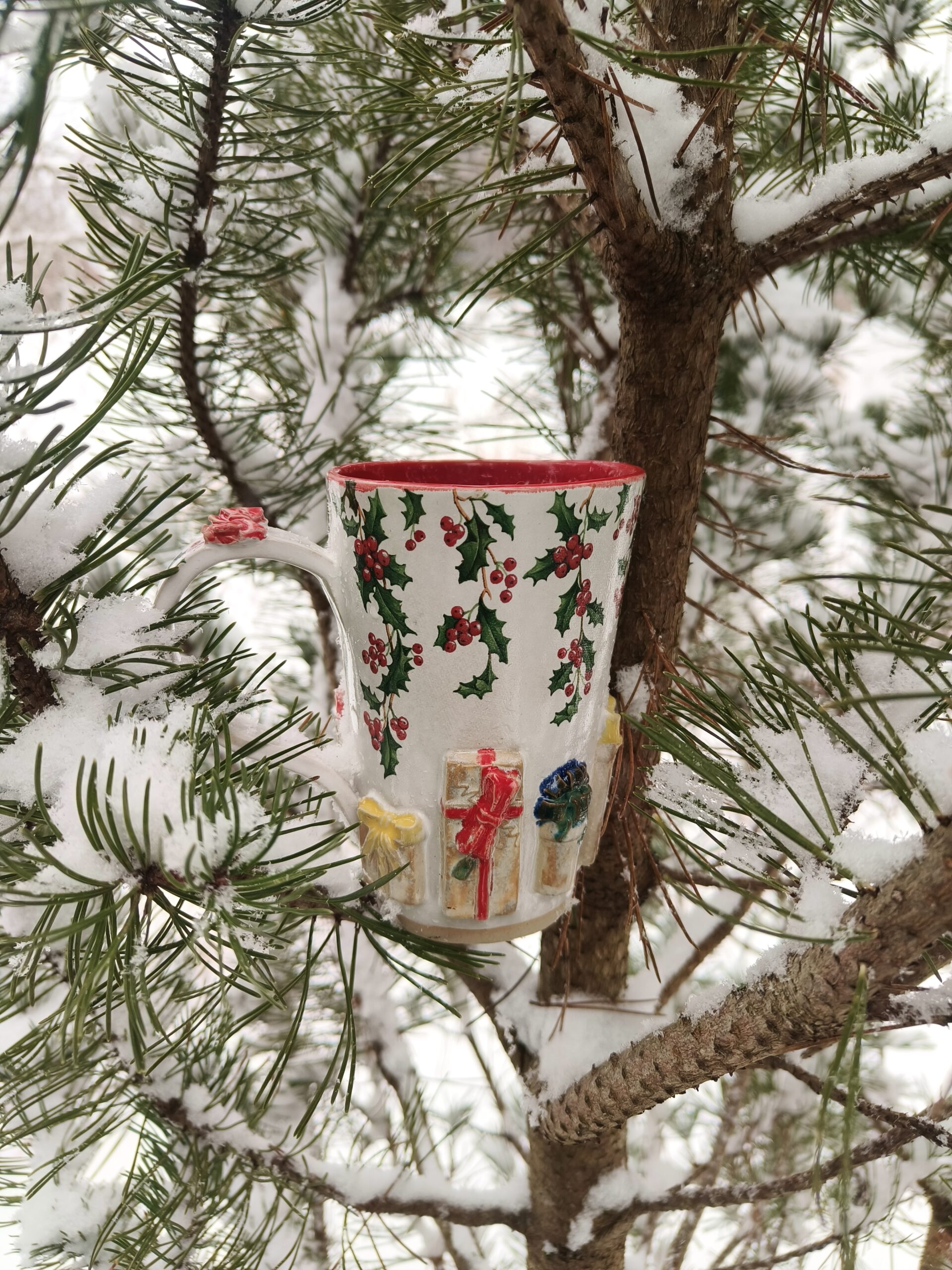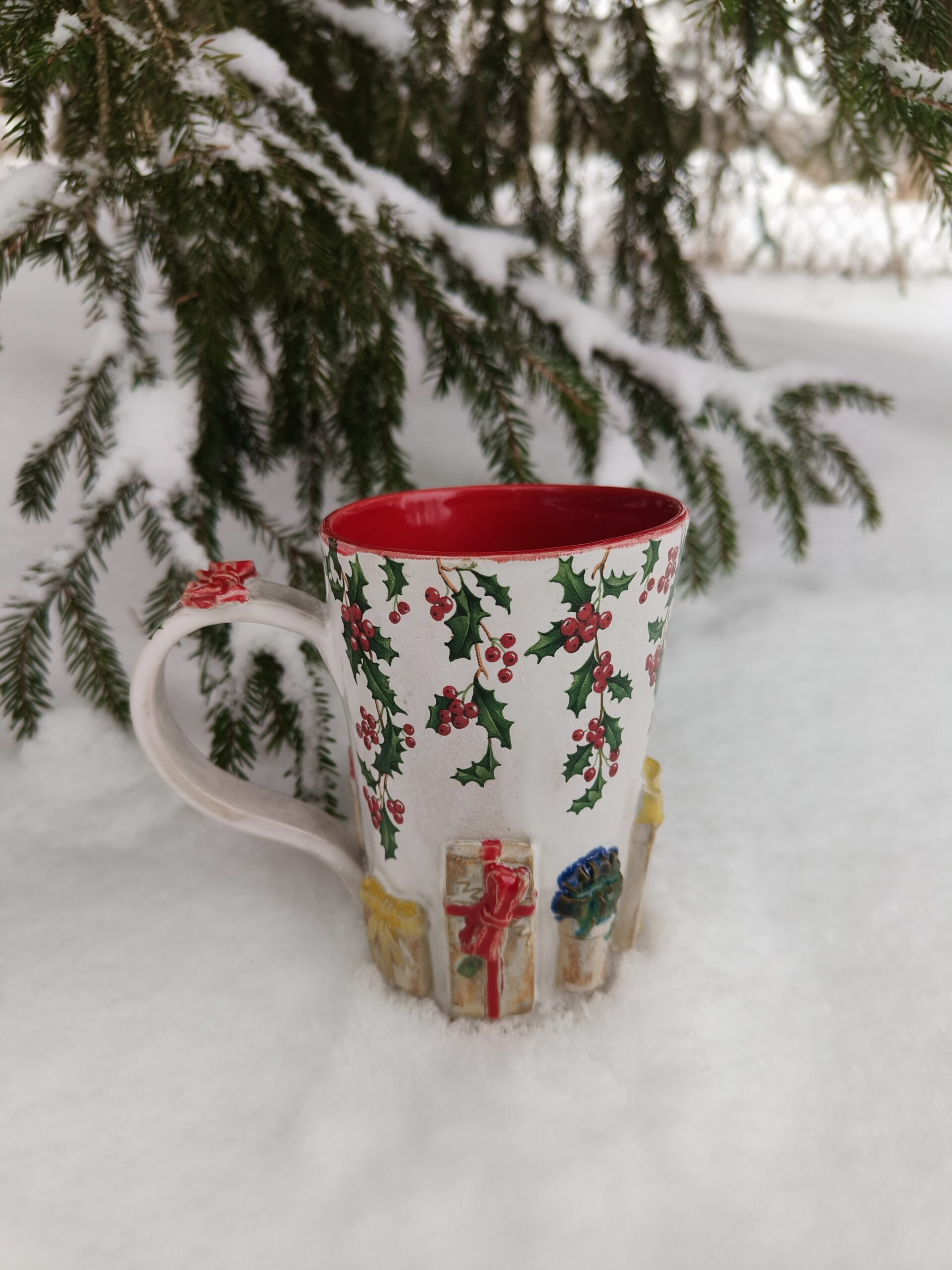 Kõrgkuumus käsitöökeraamika. Klassikalistes jõuluvärvides seest punane tass, mille alläärt ümbritsevad reljeefsed kingipakid ja ülaäärt kaunistavad iileksiokste pildid. Tass mahutab 475 ml. Läbimõõt ülevalt 9,5 cm ja alt 6,5 cm. Kõrgus 13 cm. Läikiva glasuuriga. Võib pesta nõudepesumasinas. Sobiva alustaldriku leiab SIIT.