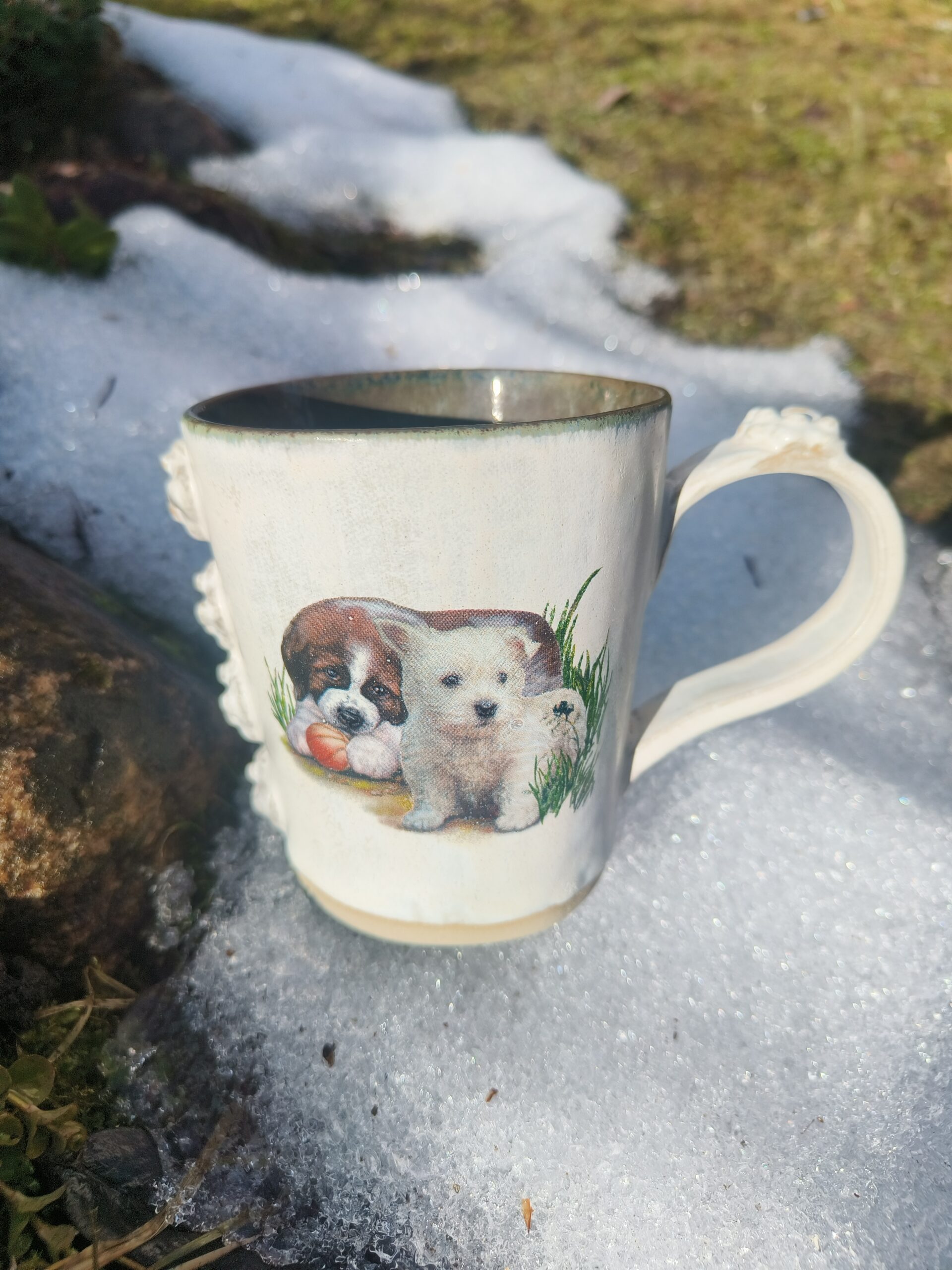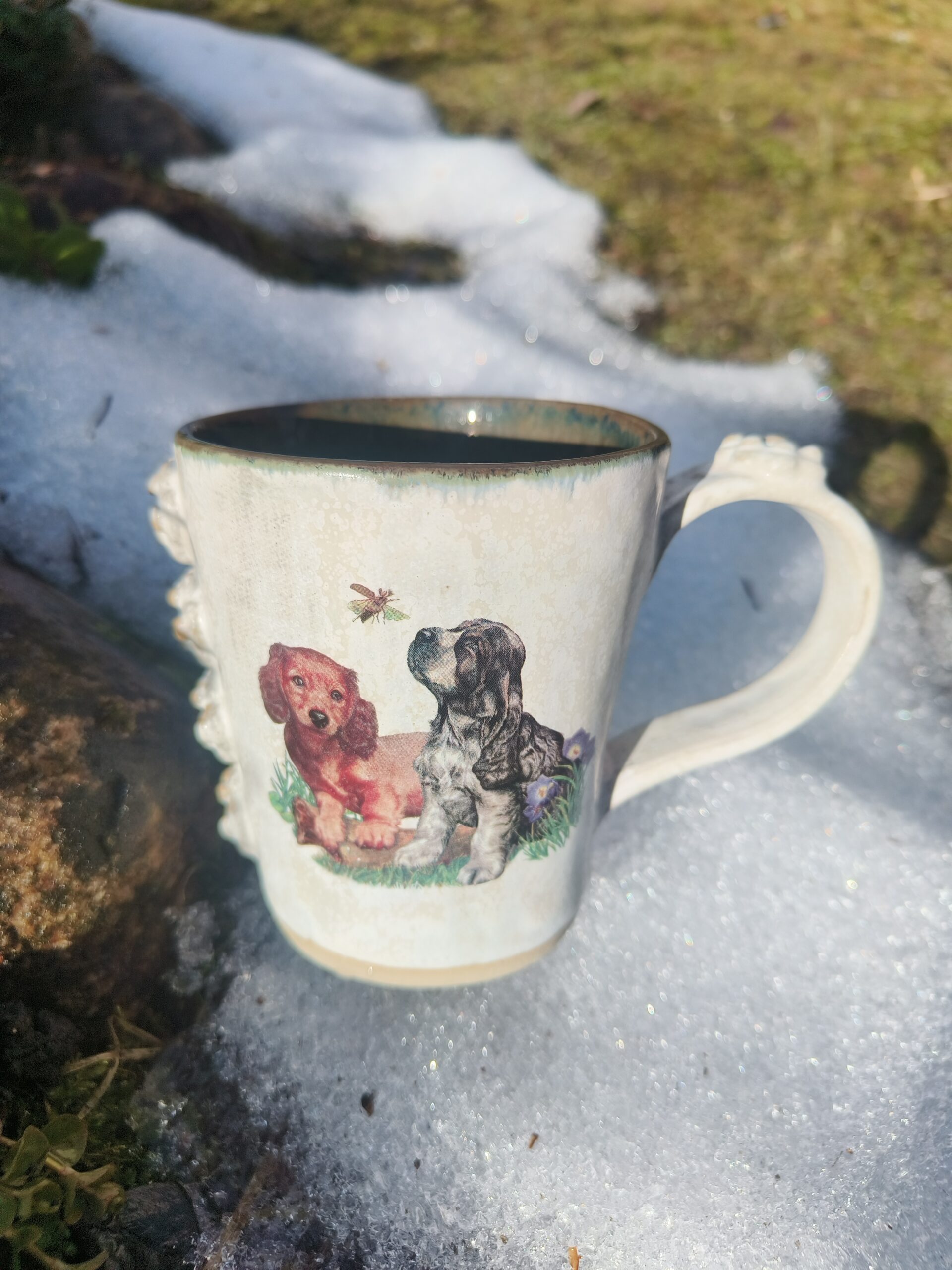 Kõrgkuumus käsitöökeraamika. Kolm erinevat kujundust. Sama pilt mõlemal tassi küljel. Reljeefsete käpajälje kujutised. Tassi mahutavus keskmiselt 320 ml. Kõrgus 10 cm, läbimõõt ülevalt 8,5 cm ja alt 6,5-7 cm. Pealt mati, seest läikiva glasuuriga. Võib pesta nõudepesumasinas. Sobiva alustaldriku leiab SIIT.