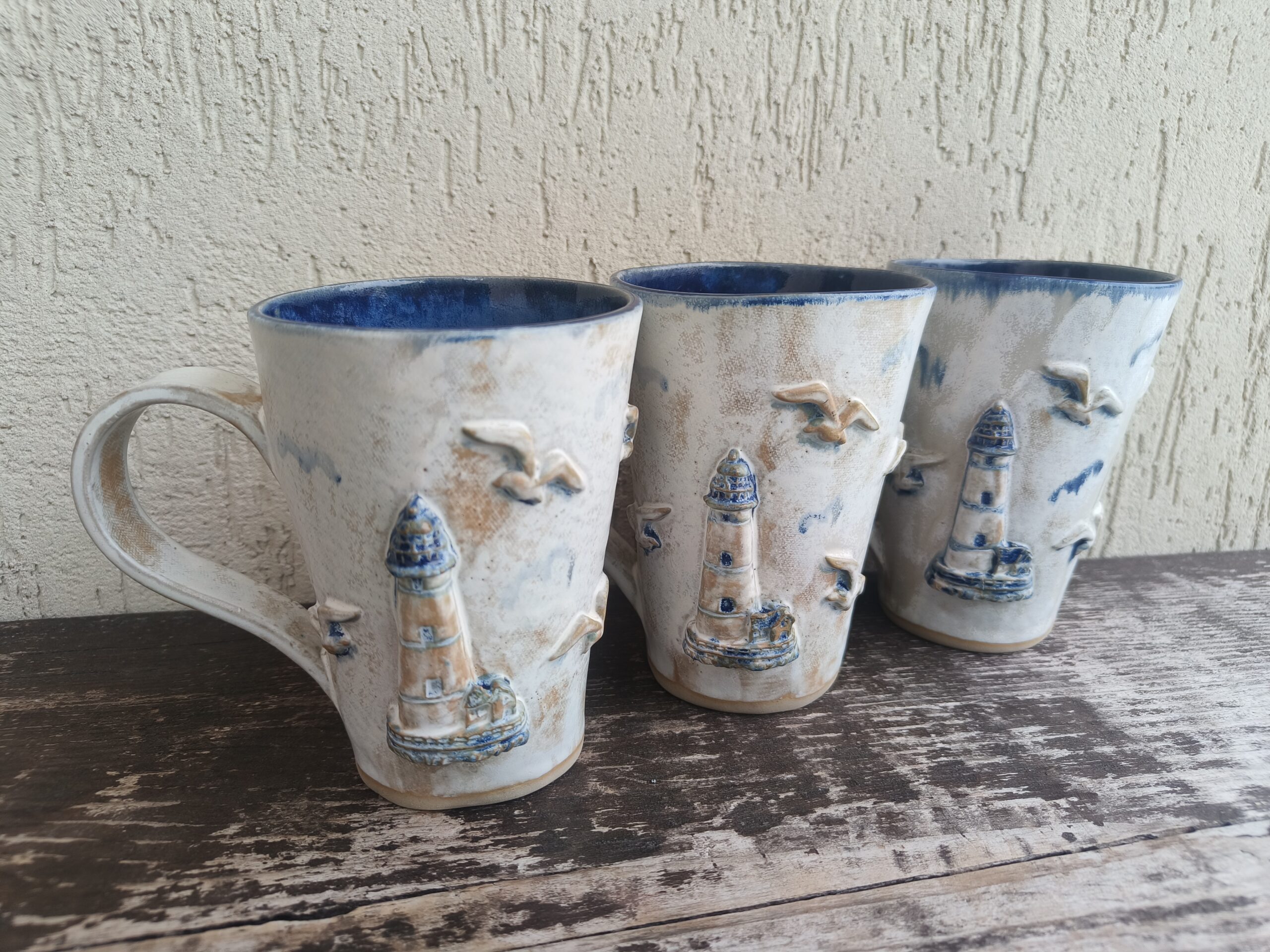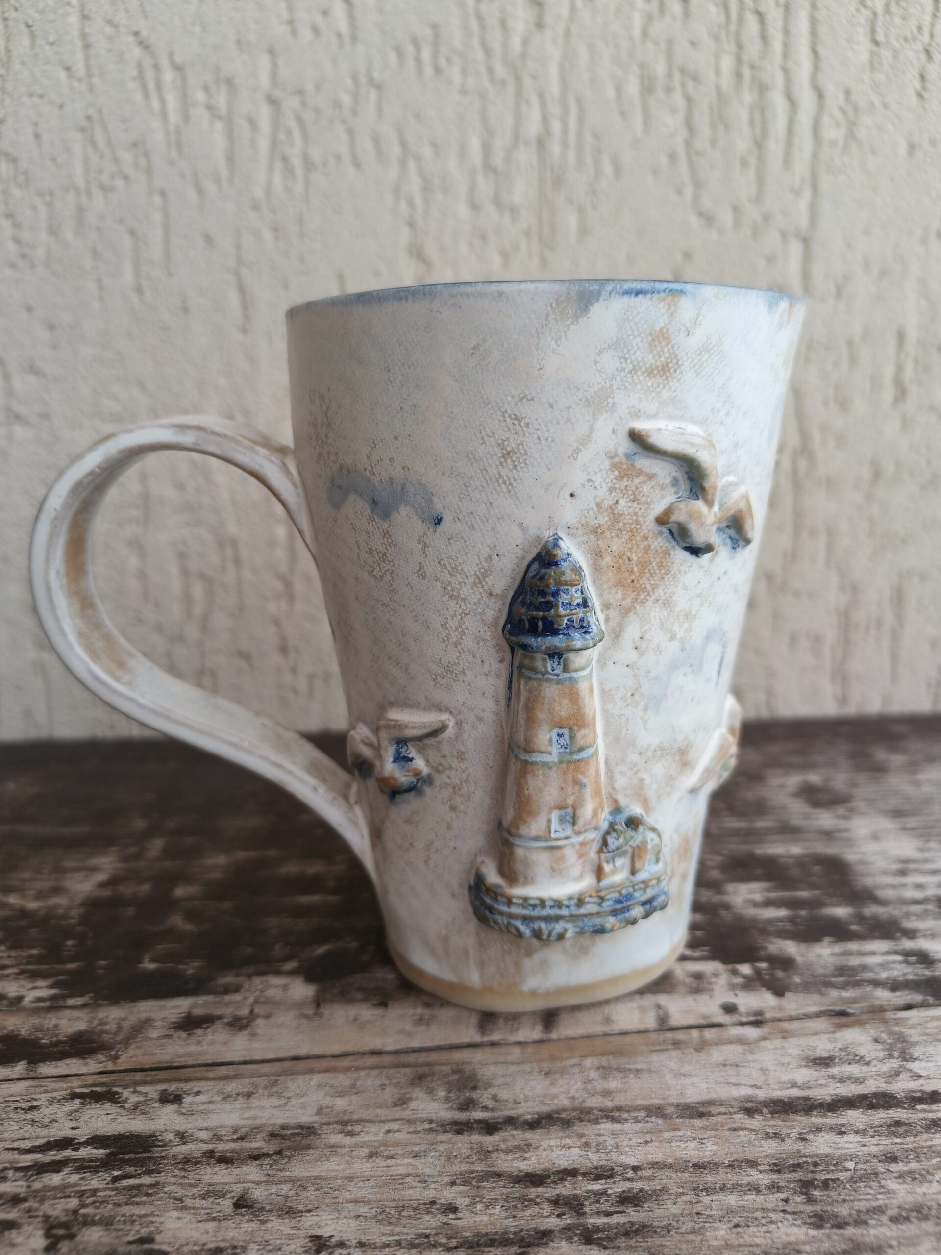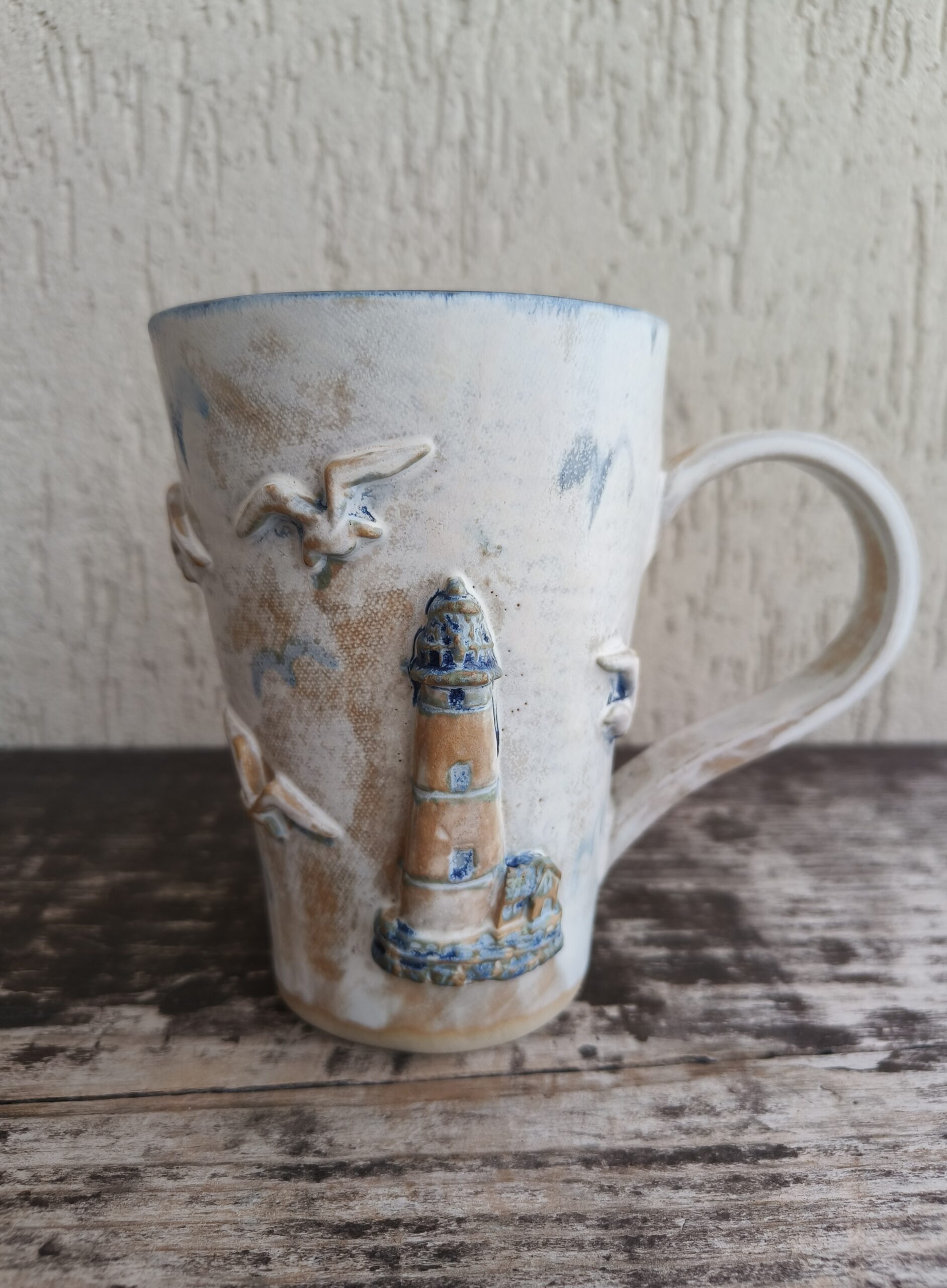 Kõrgkuumus käsitöökeraamika. Tassi mõlemal küljel on reljeefsed majaka ja kajakate kujutised. Tass mahutab 475 ml. Läbimõõt ülevalt 9-9,5 cm ja alt 6-6,5 cm. Kõrgus 13 cm. Pealt mati, seest läikiva glasuuriga. Võib pesta nõudepesumasinas. Komplekti sobivad alustaldrikud leiab SIIT.