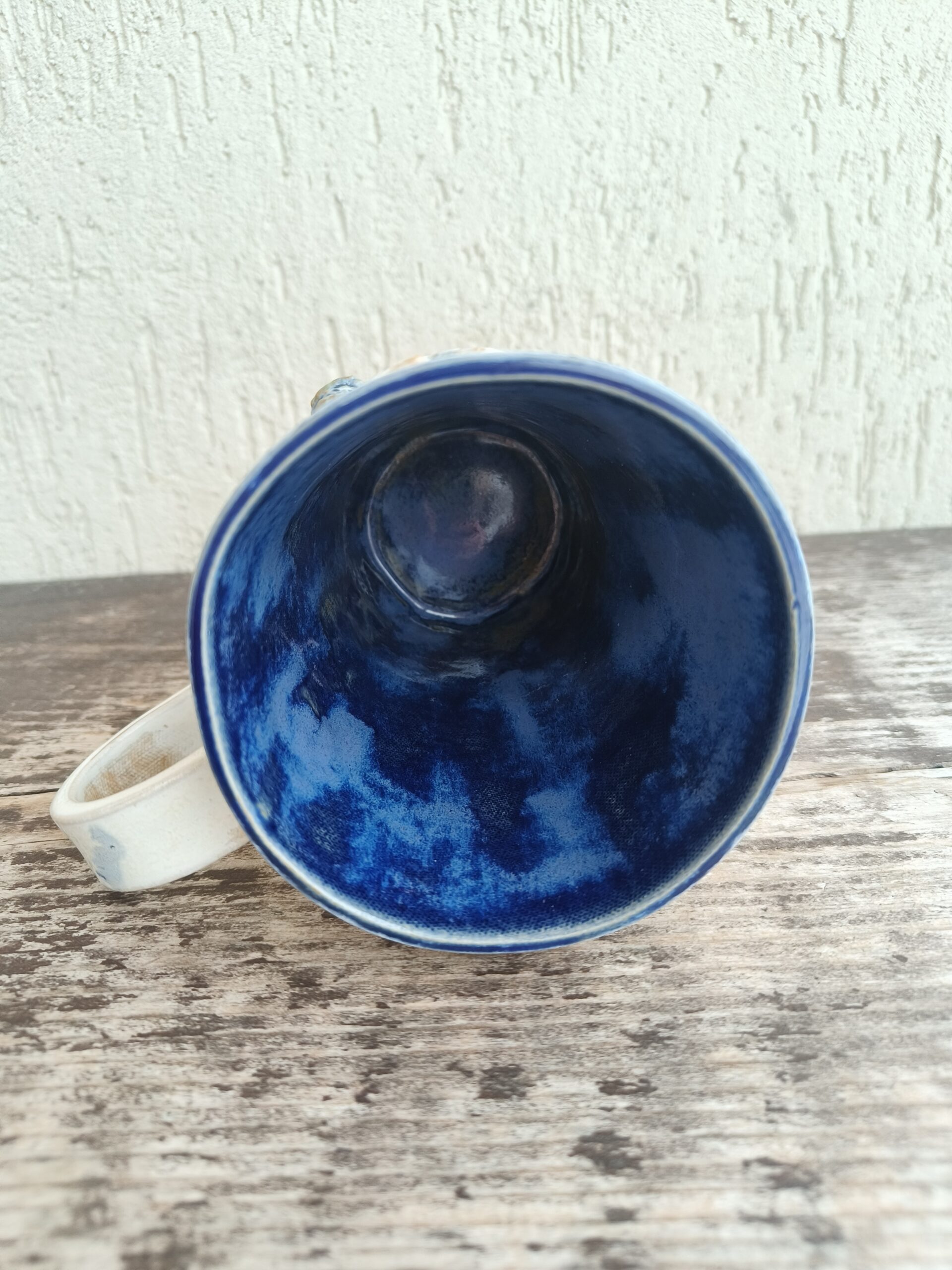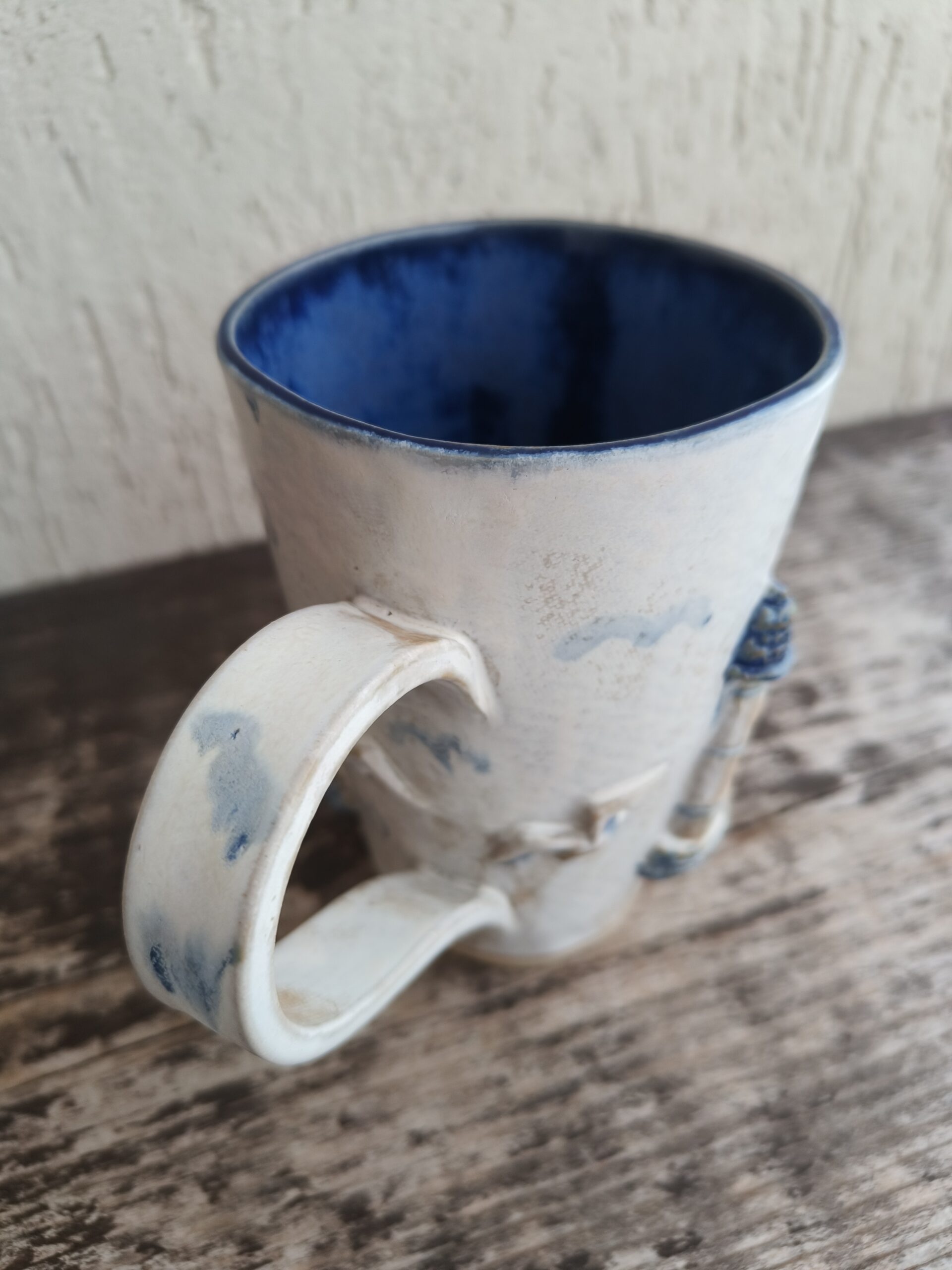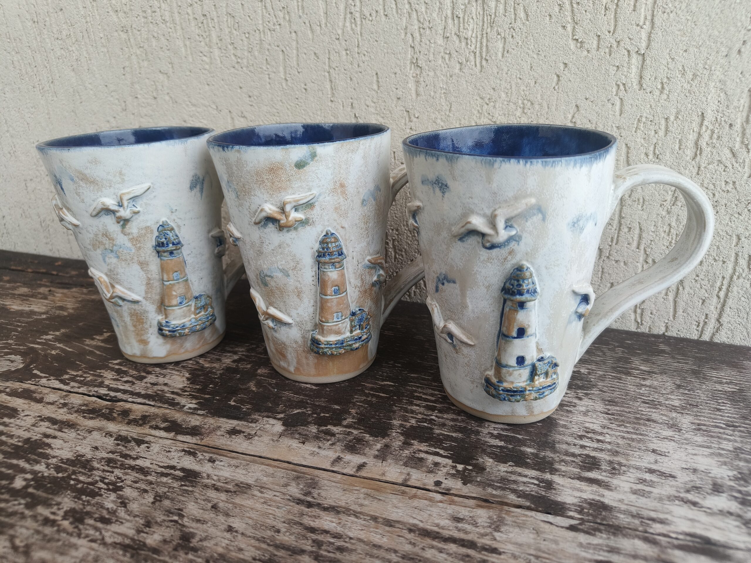Kõrgkuumus käsitöökeraamika. Tassi mõlemal küljel on reljeefsed majaka ja kajakate kujutised. Tass mahutab 475 ml. Läbimõõt ülevalt 9-9,5 cm ja alt 6-6,5 cm. Kõrgus 13 cm. Pealt mati, seest läikiva glasuuriga. Võib pesta nõudepesumasinas. Komplekti sobivad alustaldrikud leiab SIIT.
