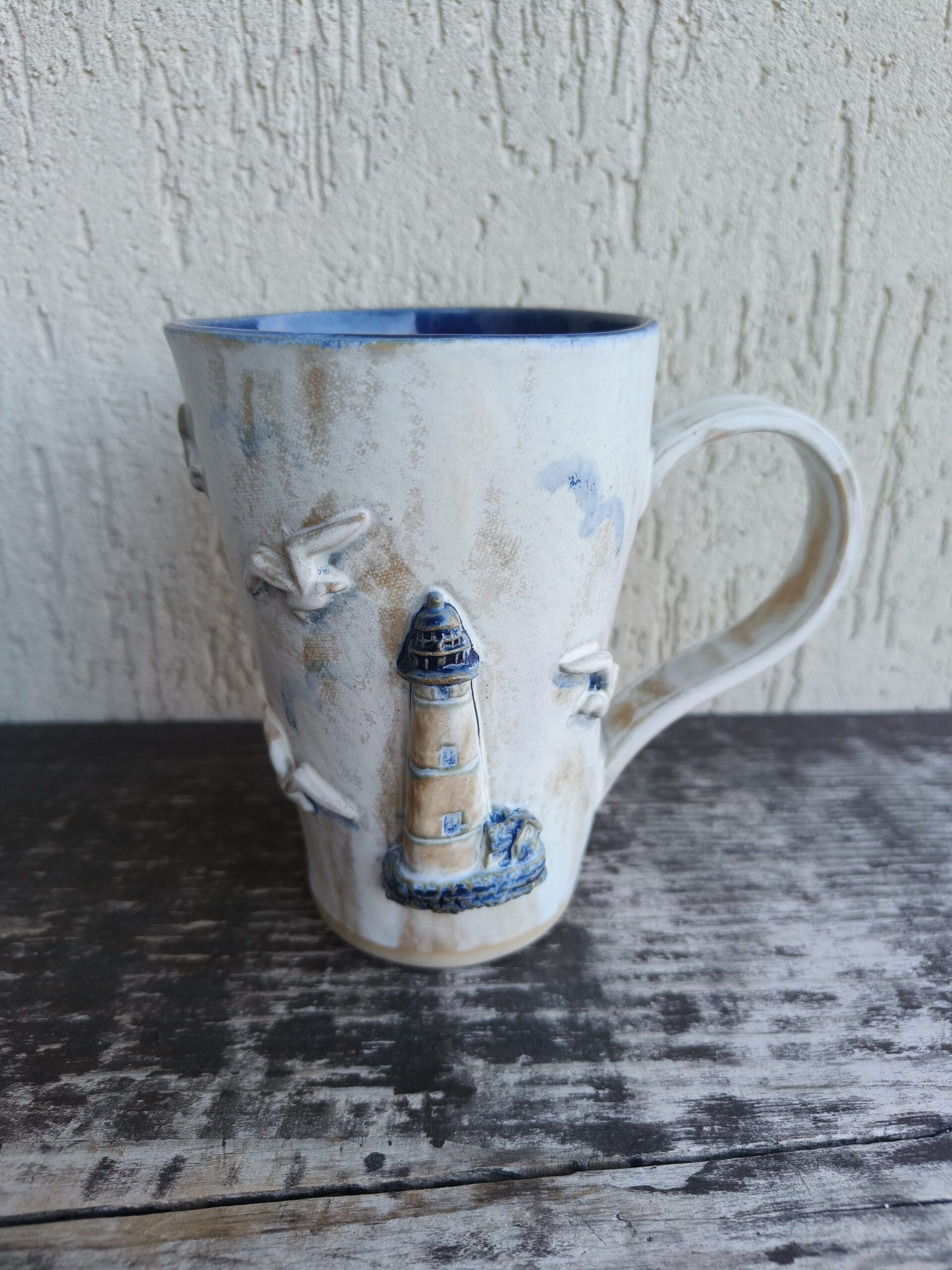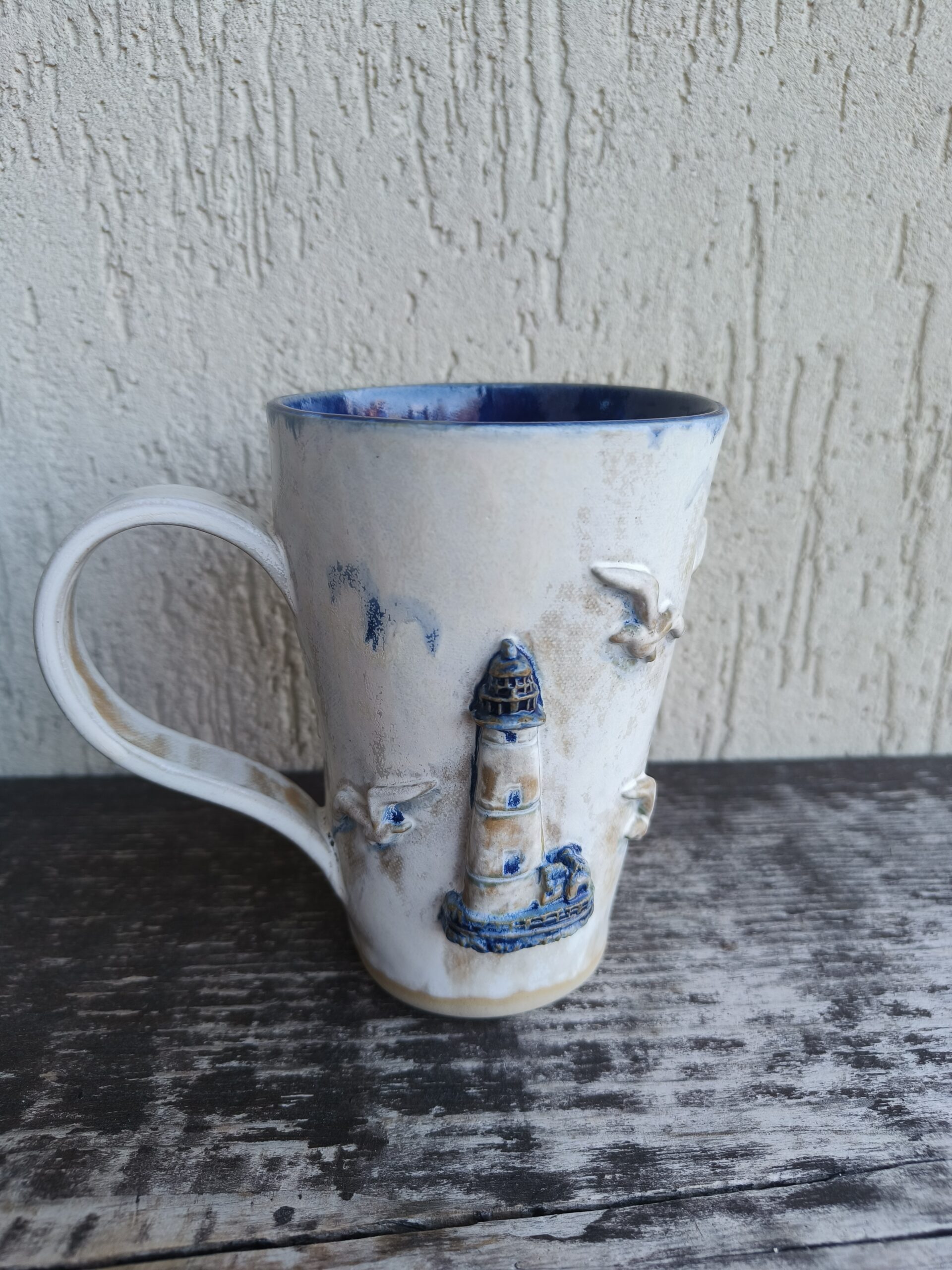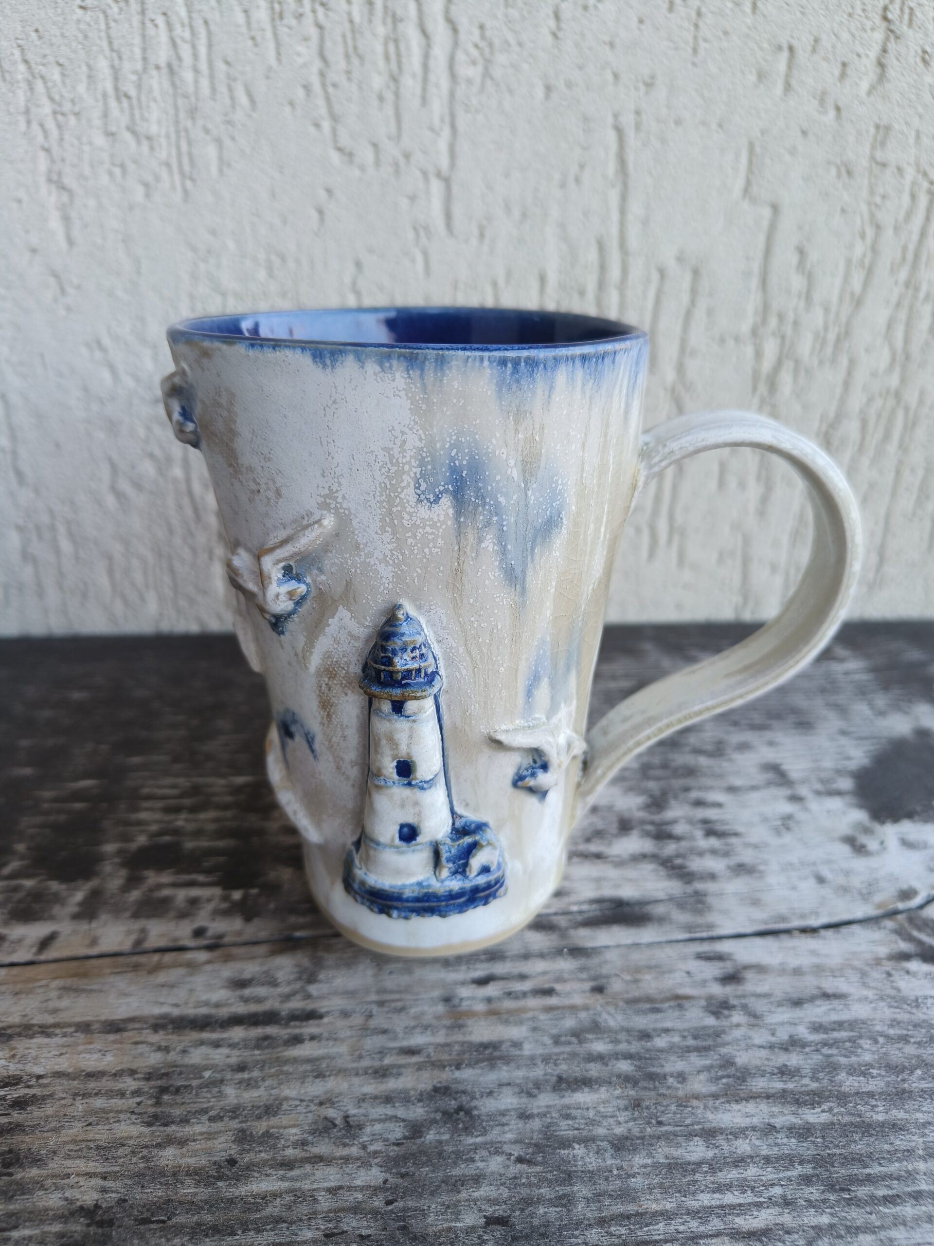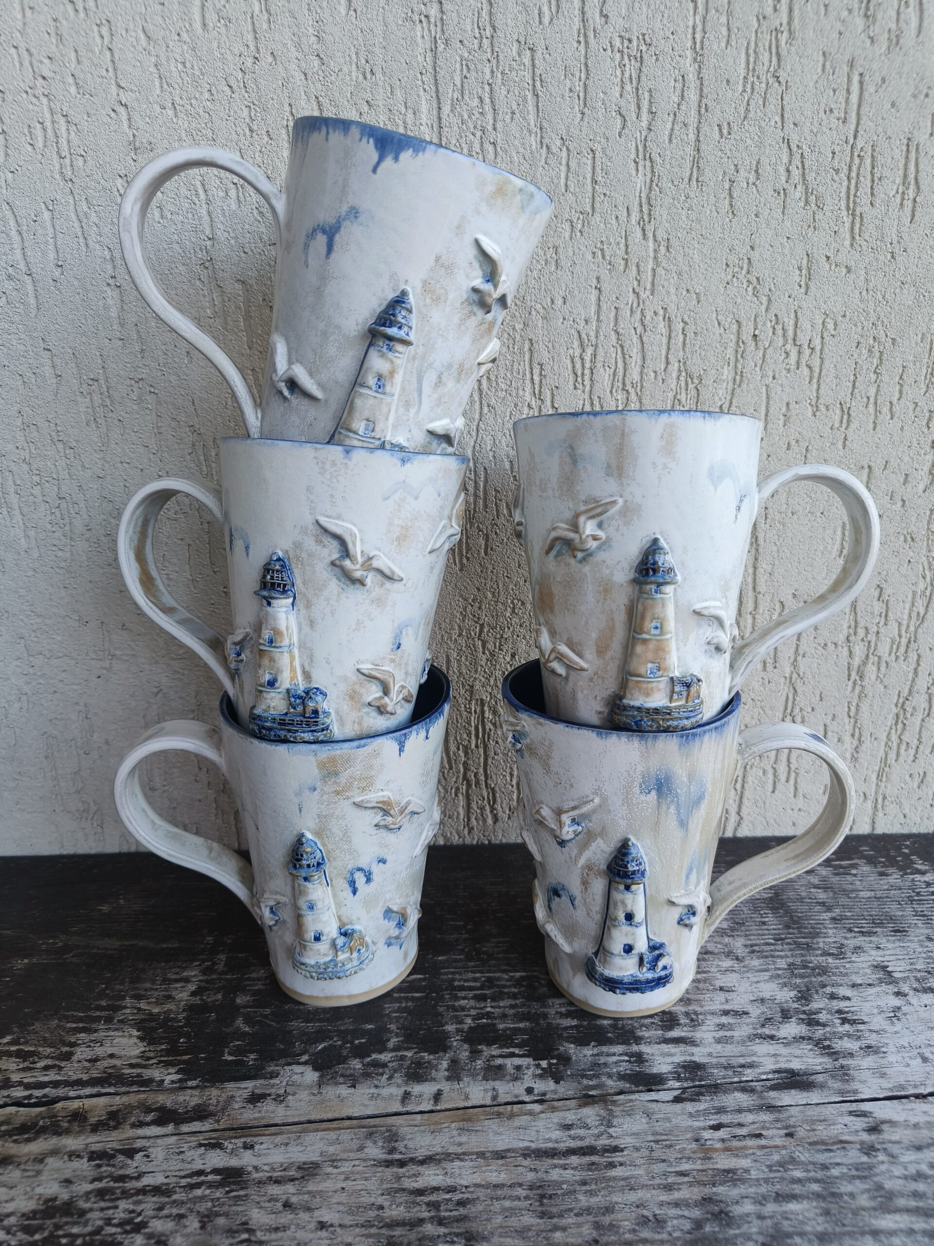 Kõrgkuumus käsitöökeraamika. Tassi mõlemal küljel on reljeefsed majaka ja kajakate kujutised. Tass mahutab 460 ml. Läbimõõt ülevalt 9-9,5 cm ja alt 6-6,5 cm. Kõrgus 13 cm. Pealt mati, seest läikiva glasuuriga. Võib pesta nõudepesumasinas. Komplekti sobivad alustaldrikud leiab SIIT. Kohtades, kus glasuuri on paksult, esineb pragulisust (kraklee) ja kollakas läikiv kiht. Tegemist ei ole defektiga, vaid selle glasuuri eripäraga. Vaata viimaseid pilte.