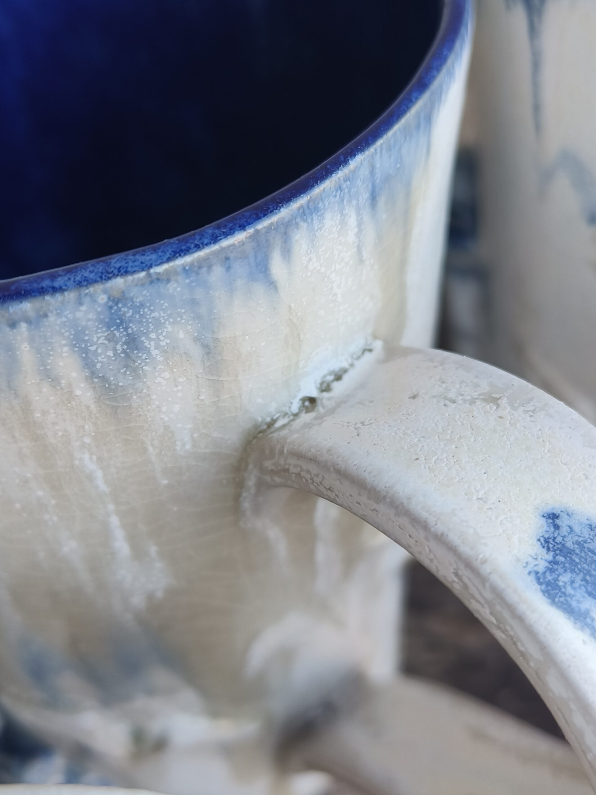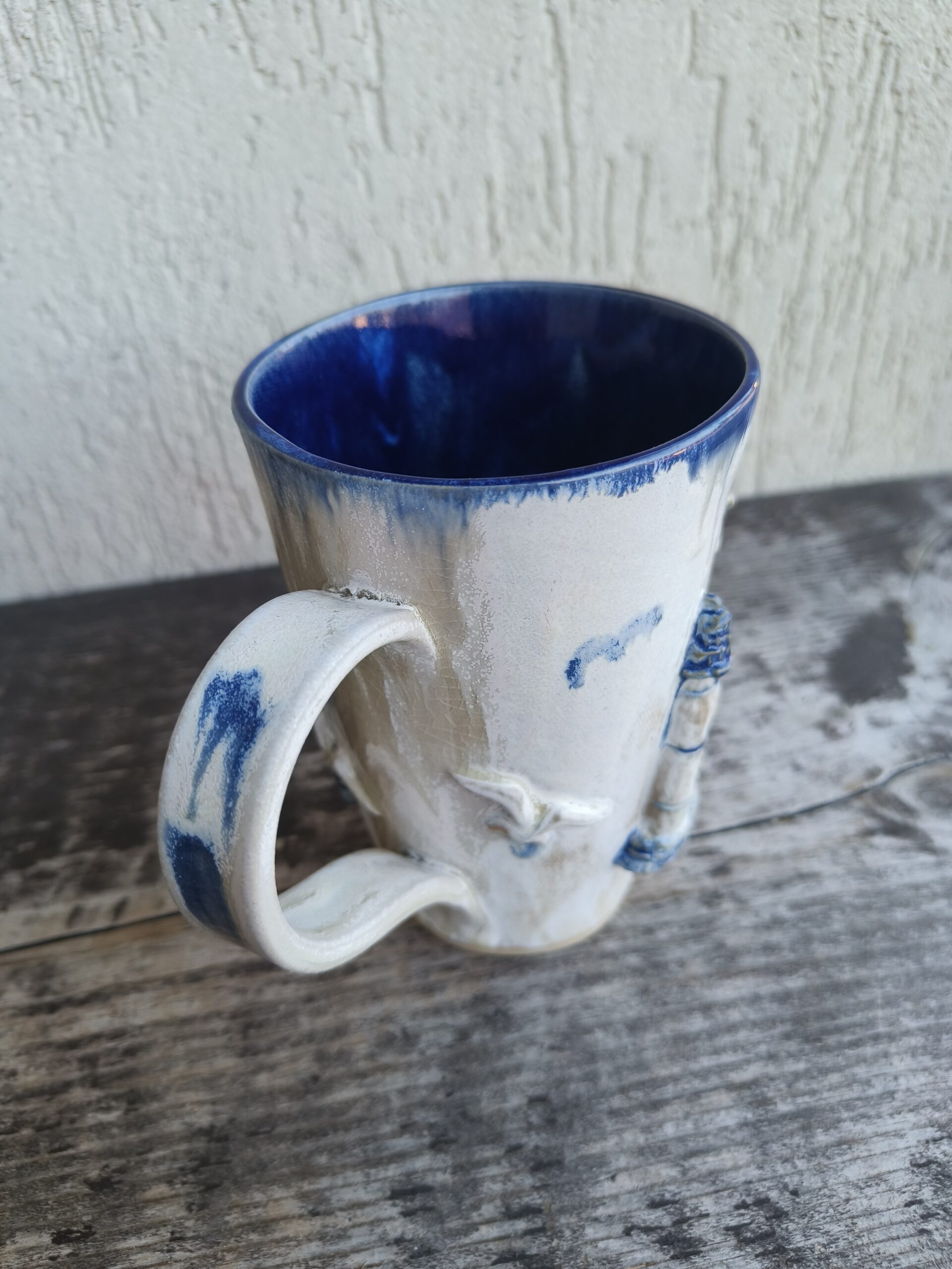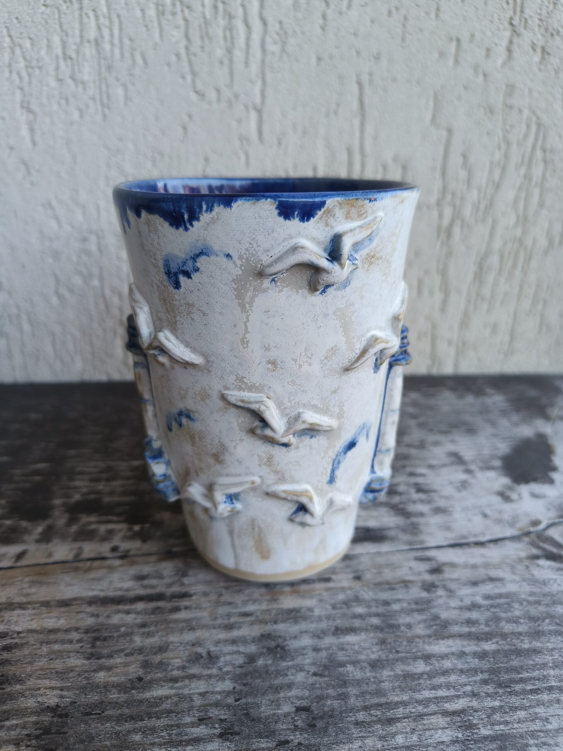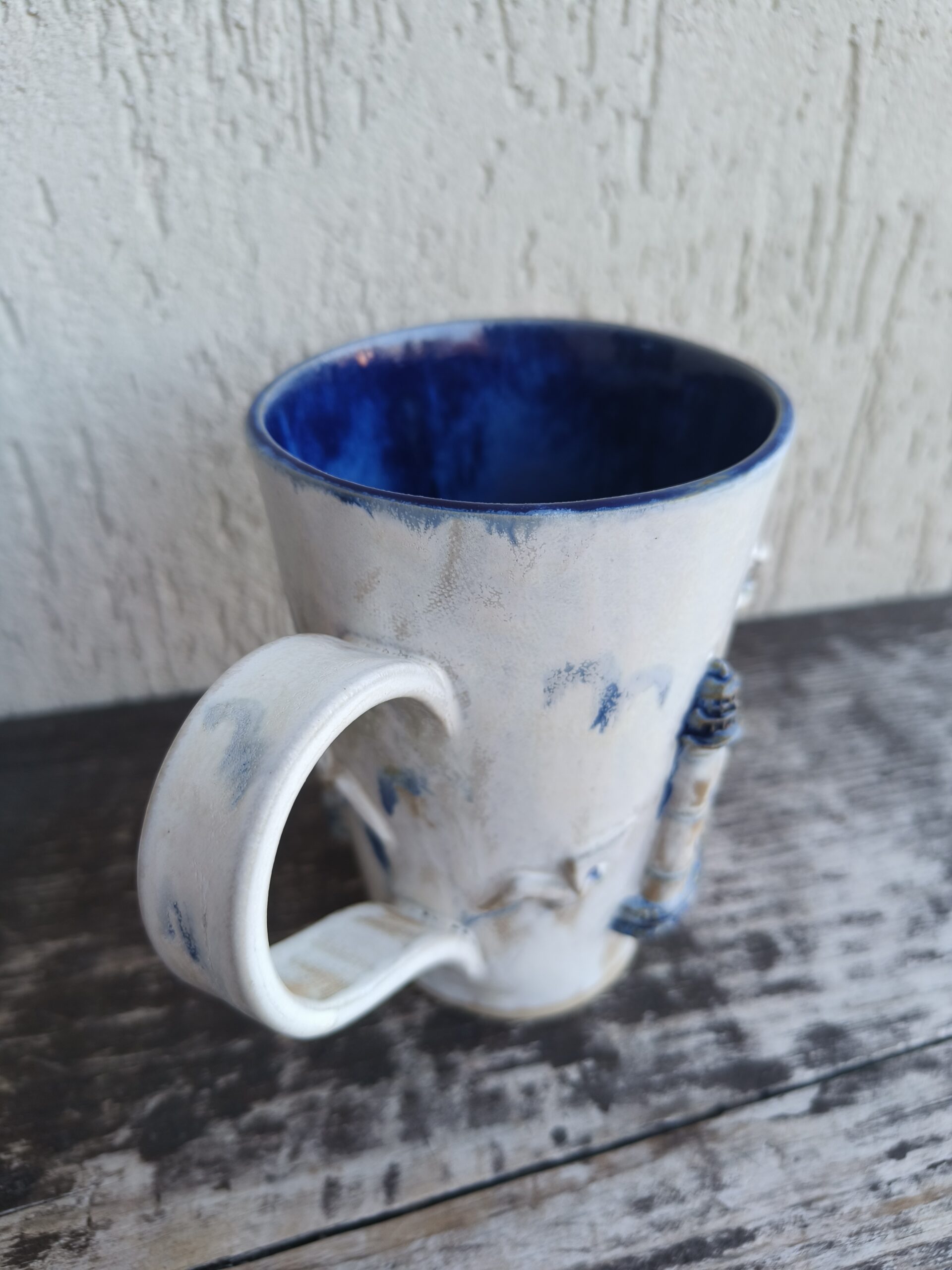 Kõrgkuumus käsitöökeraamika. Tassi mõlemal küljel on reljeefsed majaka ja kajakate kujutised. Tass mahutab 460 ml. Läbimõõt ülevalt 9-9,5 cm ja alt 6-6,5 cm. Kõrgus 13 cm. Pealt mati, seest läikiva glasuuriga. Võib pesta nõudepesumasinas. Komplekti sobivad alustaldrikud leiab SIIT. Kohtades, kus glasuuri on paksult, esineb pragulisust (kraklee) ja kollakas läikiv kiht. Tegemist ei ole defektiga, vaid selle glasuuri eripäraga. Vaata viimaseid pilte.