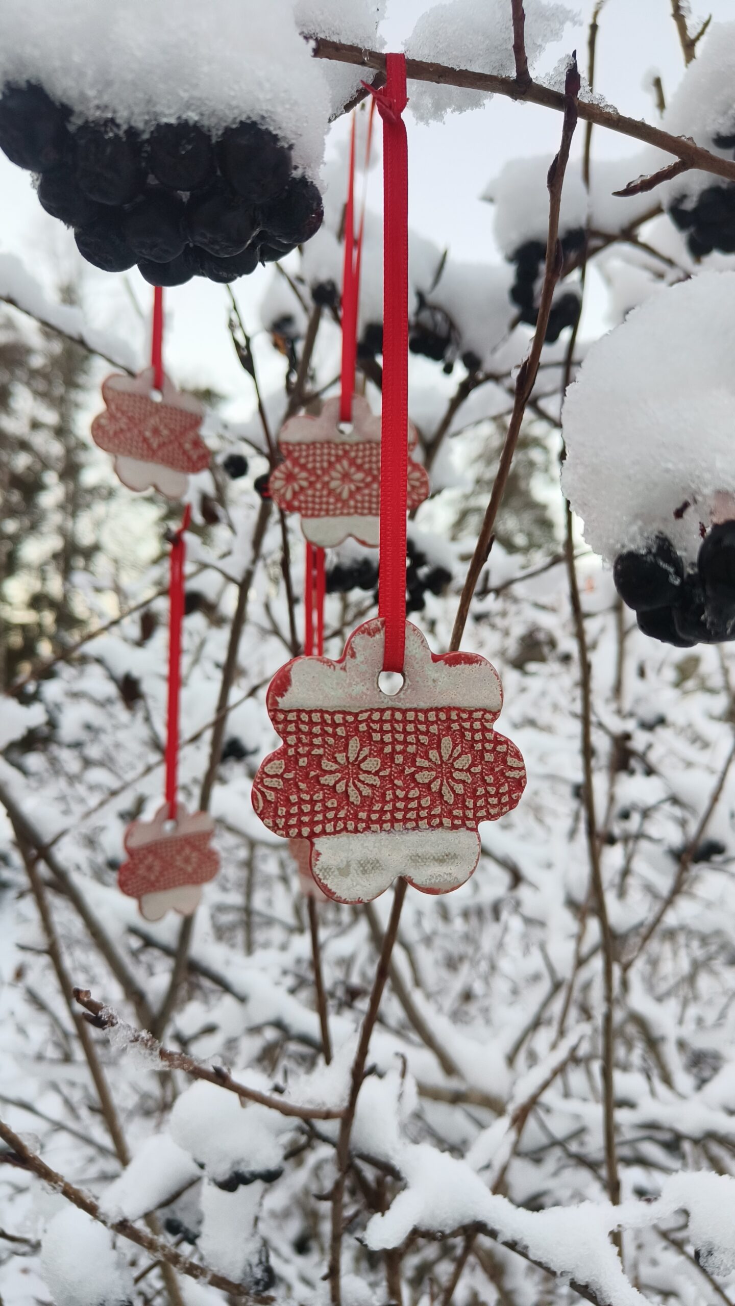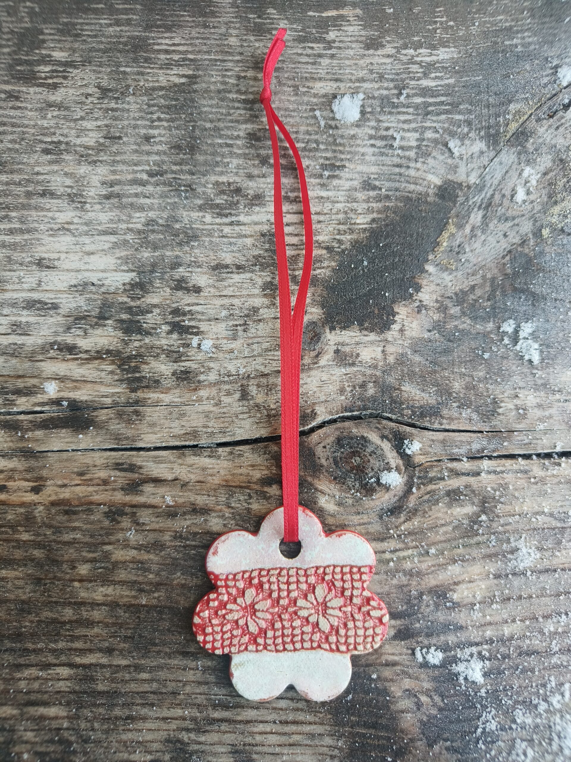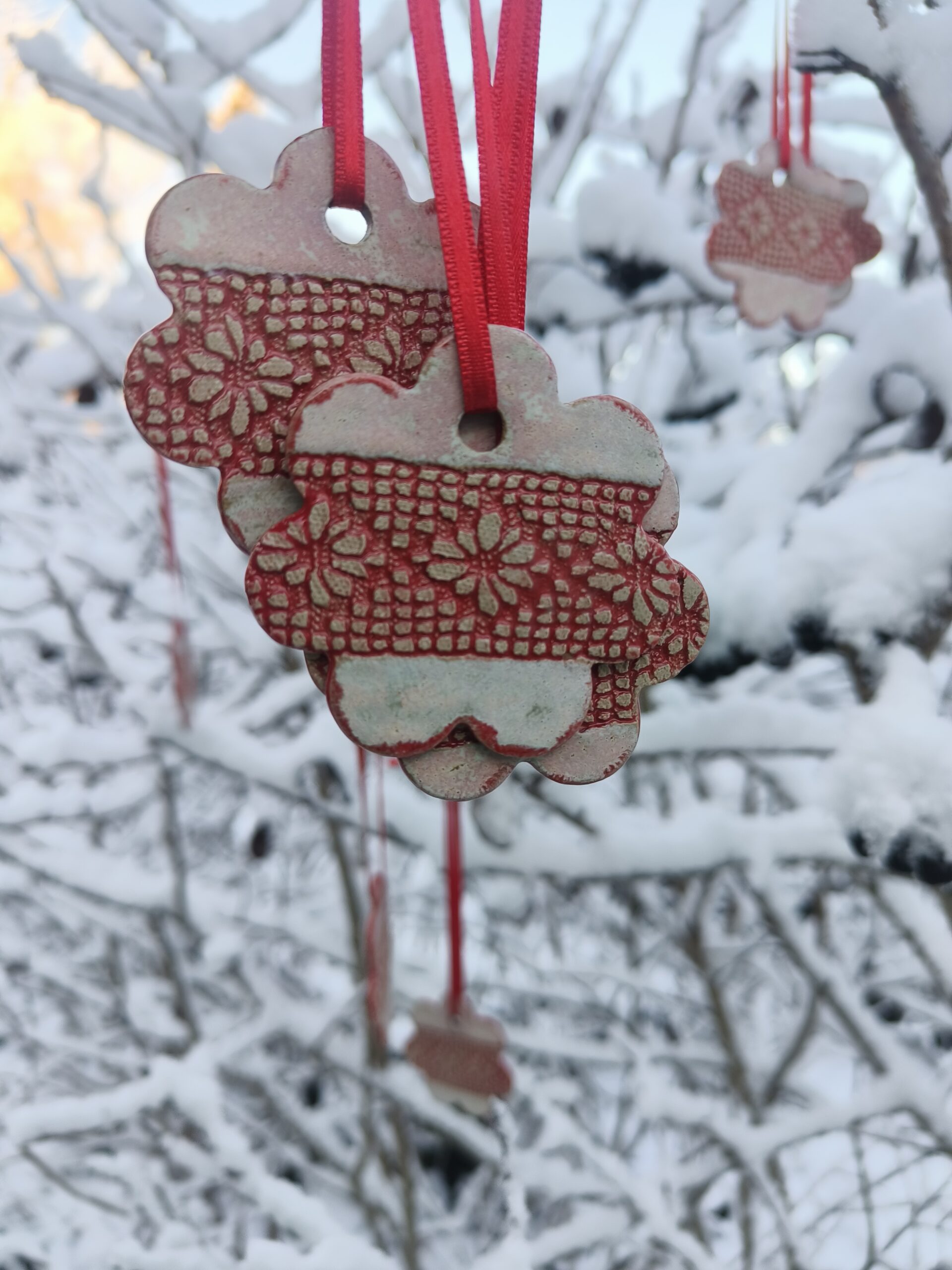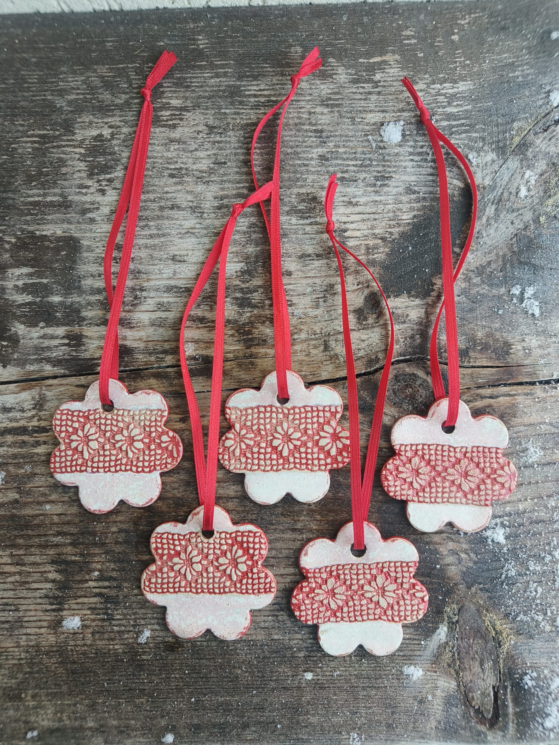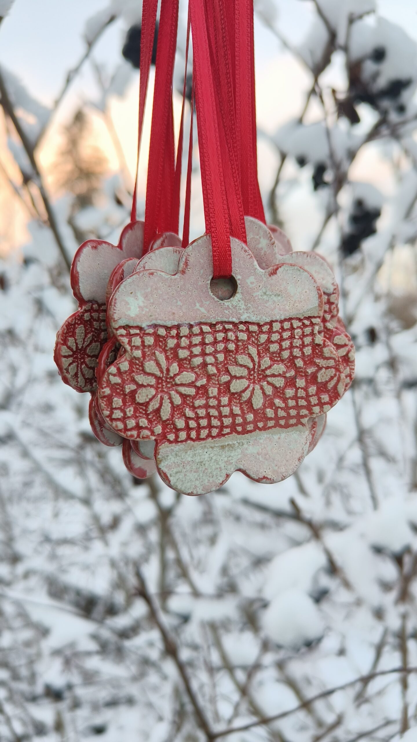 Kõrgkuumus käsitöökeraamika. Lillekujulised keraamilised jõuluehted. Mõlemalt poolt glasuuritud ja punase pitsimustriga kaunistatud. Riputamiseks punane atlaspael. Kuuseehete keraamilise osa läbimõõt 6 cm, kaal keskmiselt 15 g. Kuuseehtele sobiva kinkekarbi leiad SIIT.