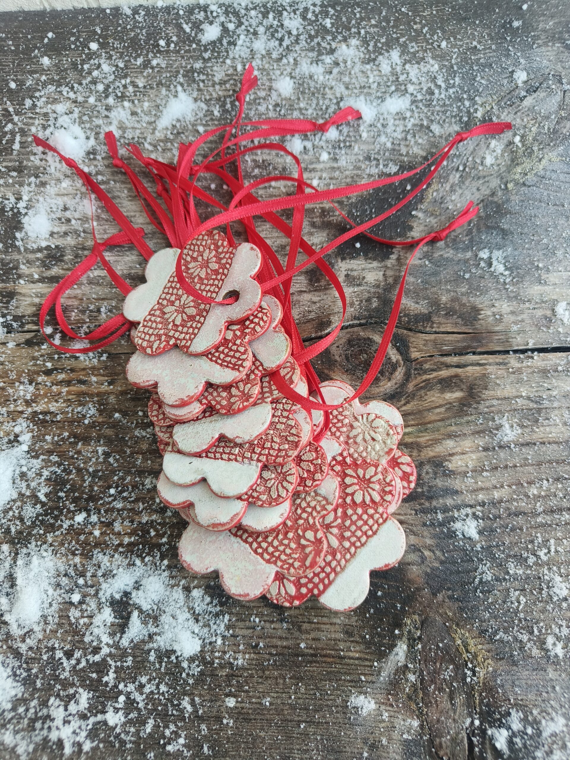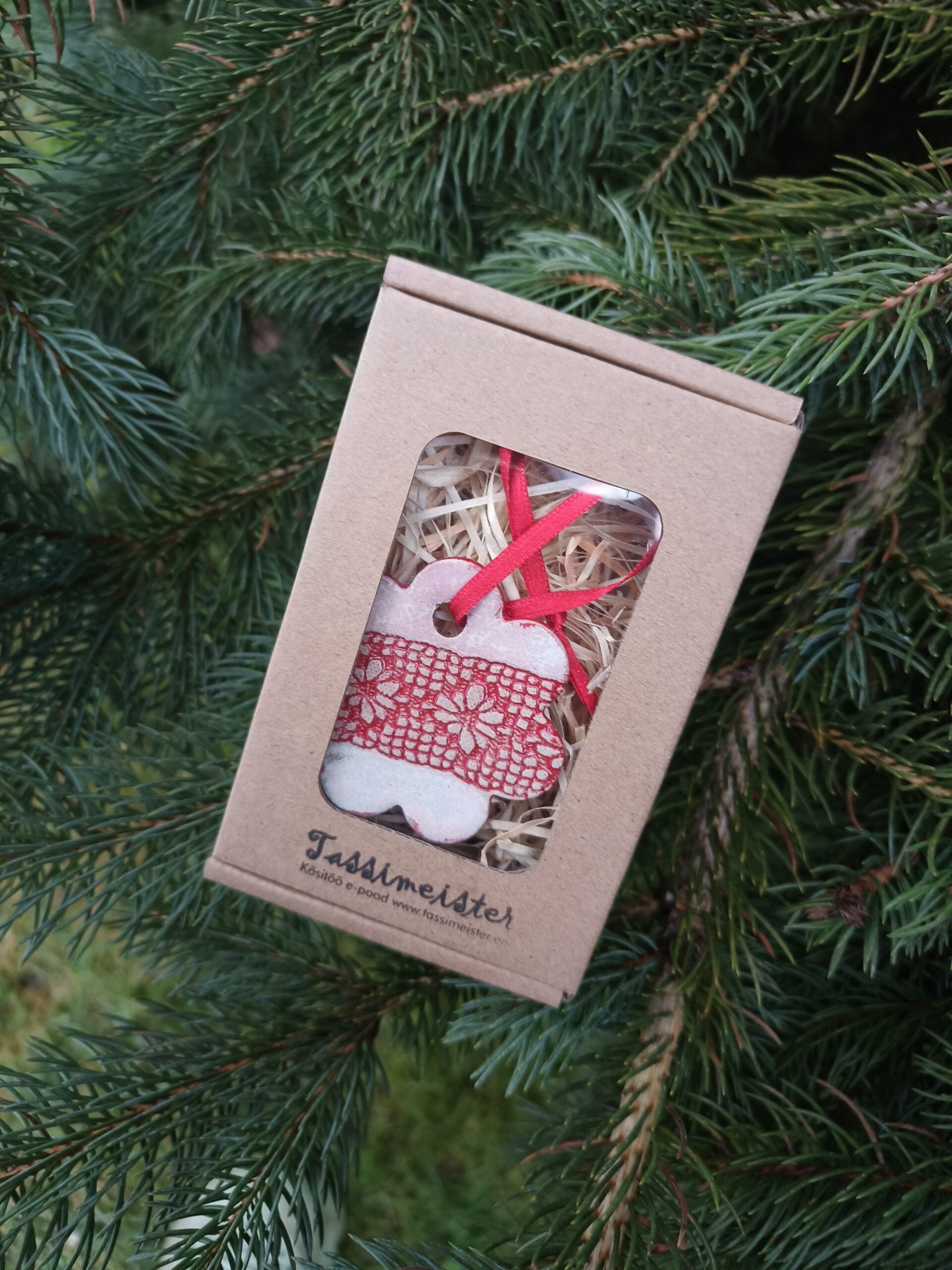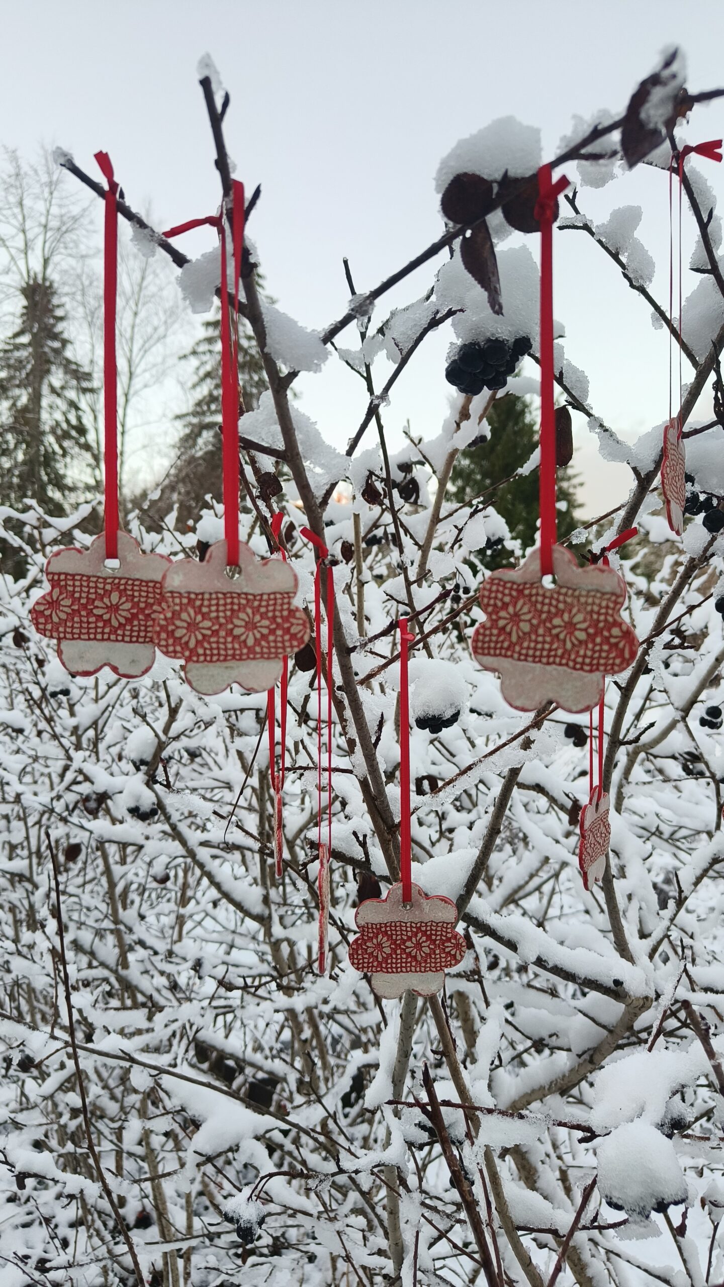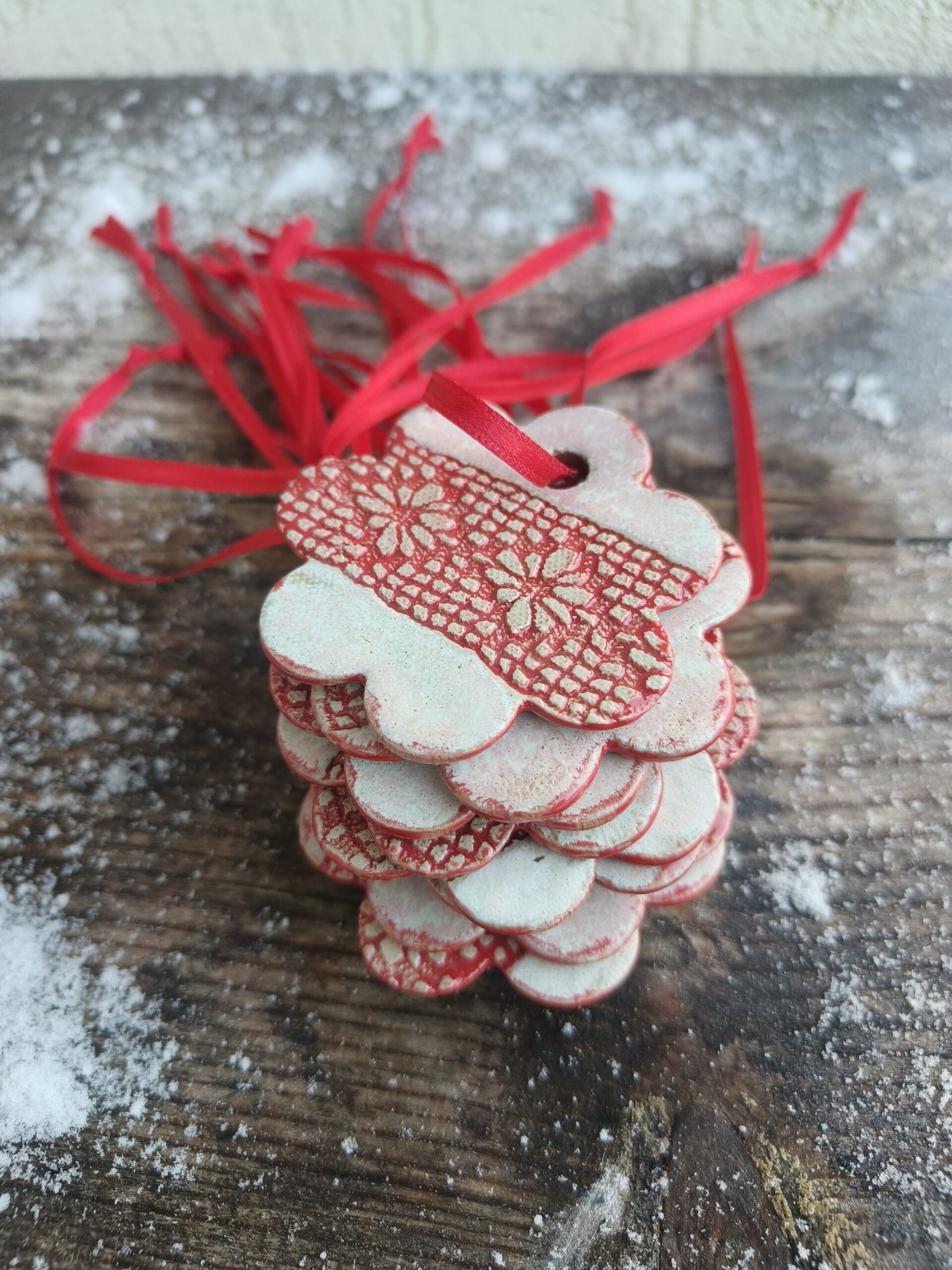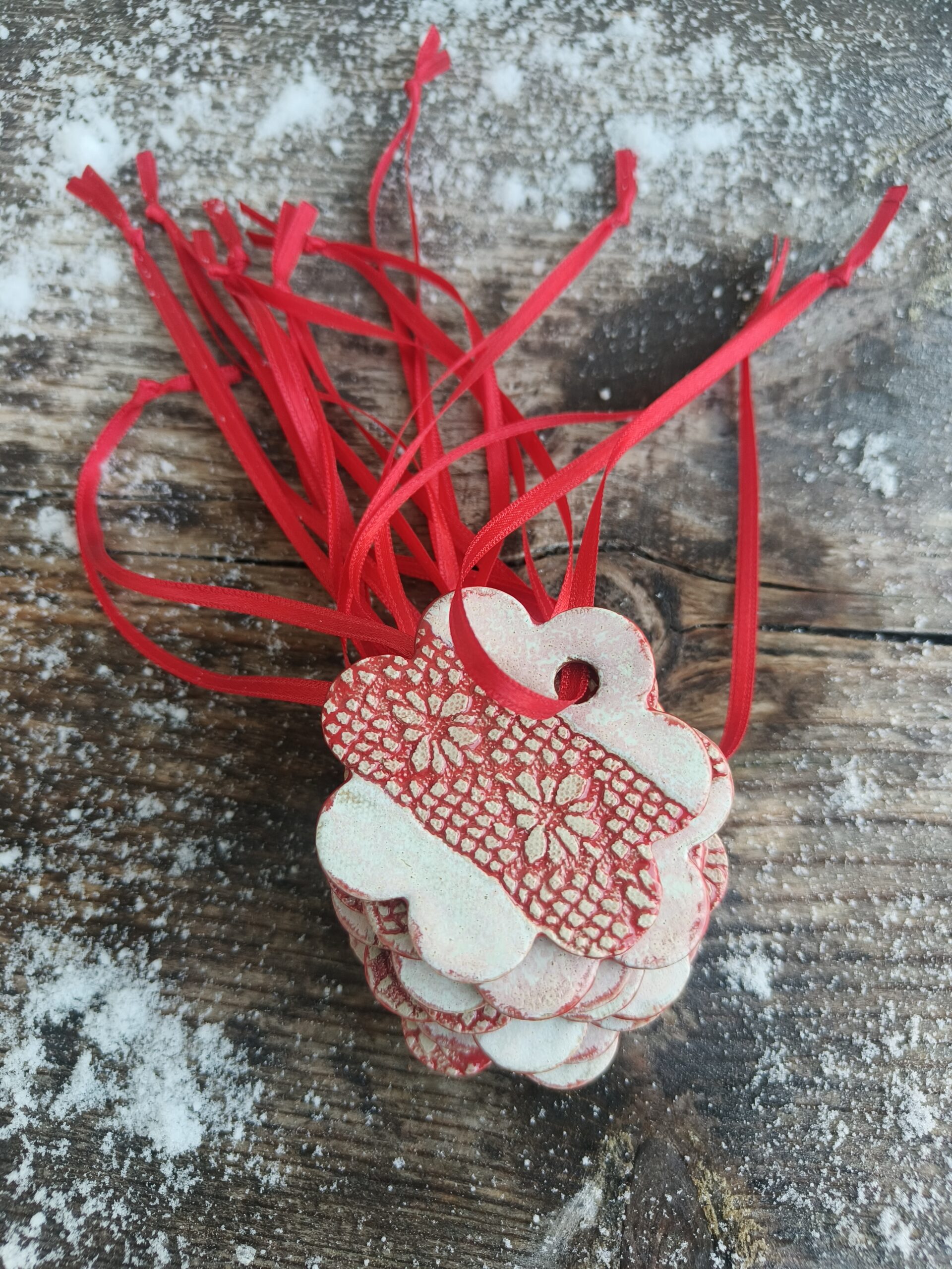 Kõrgkuumus käsitöökeraamika. Lillekujulised keraamilised jõuluehted. Mõlemalt poolt glasuuritud ja punase pitsimustriga kaunistatud. Riputamiseks punane atlaspael. Kuuseehete keraamilise osa läbimõõt 6 cm, kaal keskmiselt 15 g. Kuuseehtele sobiva kinkekarbi leiad SIIT.