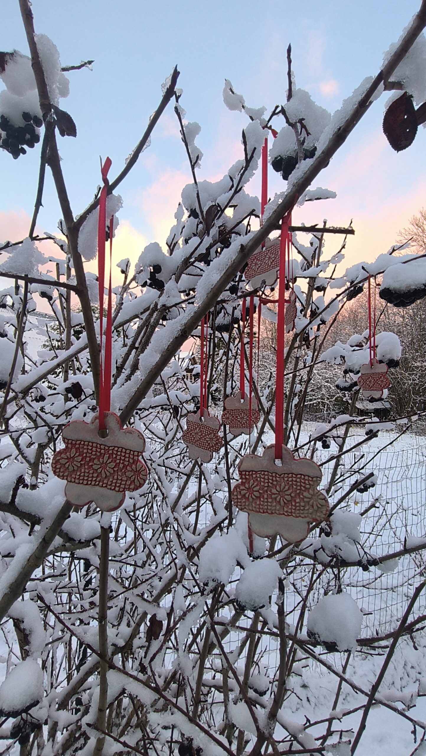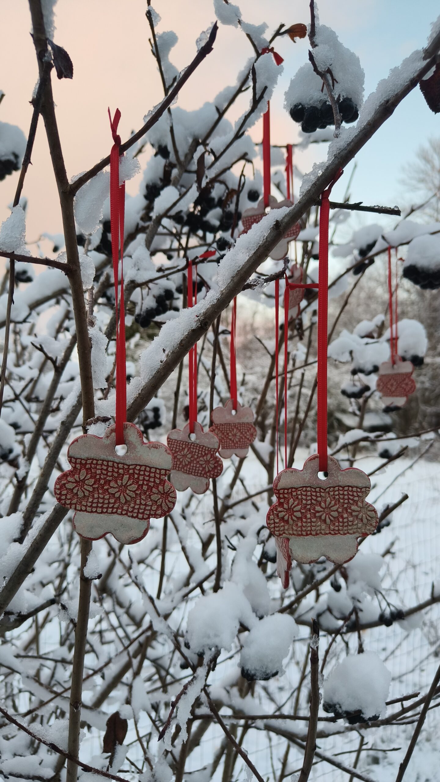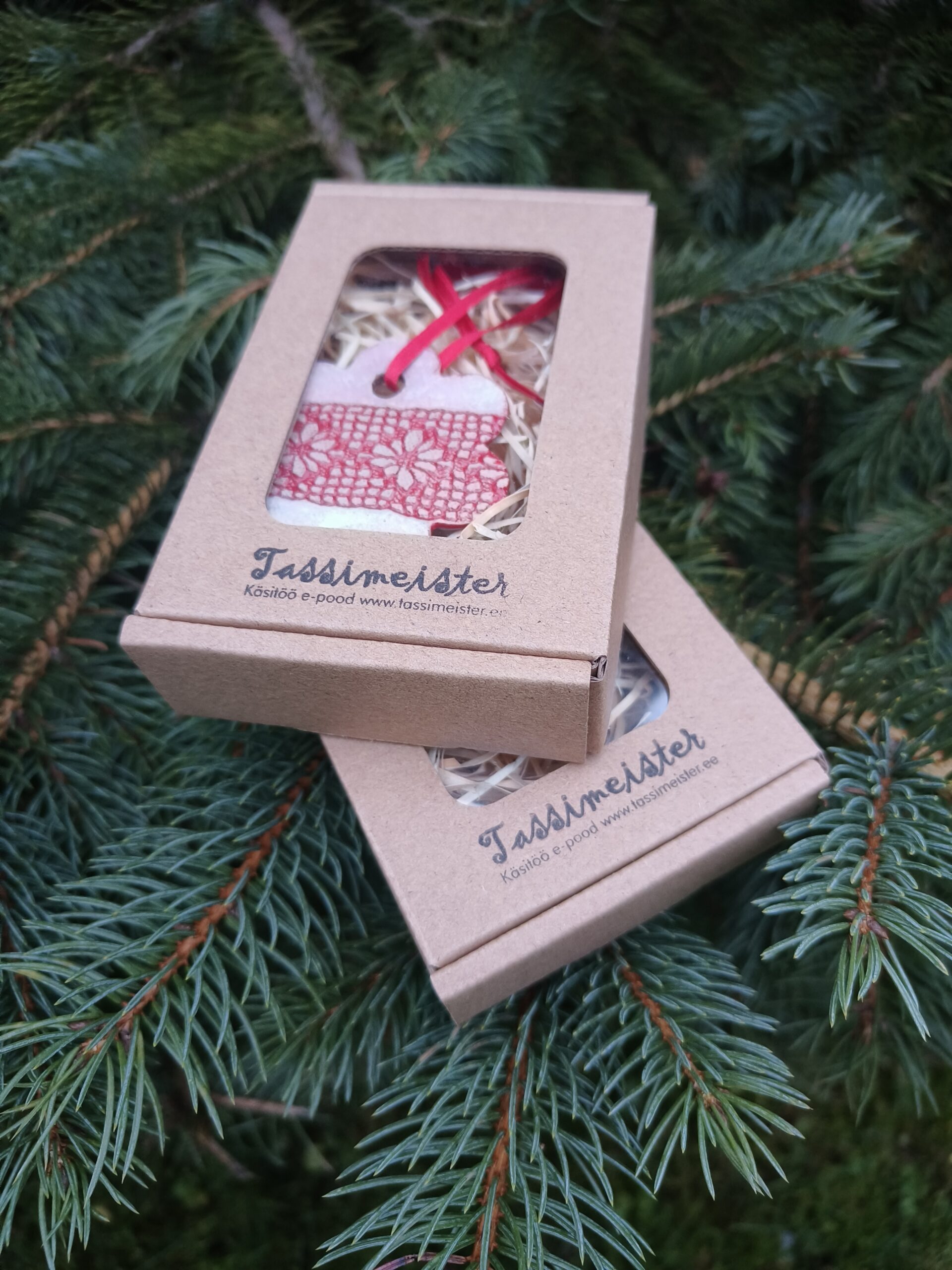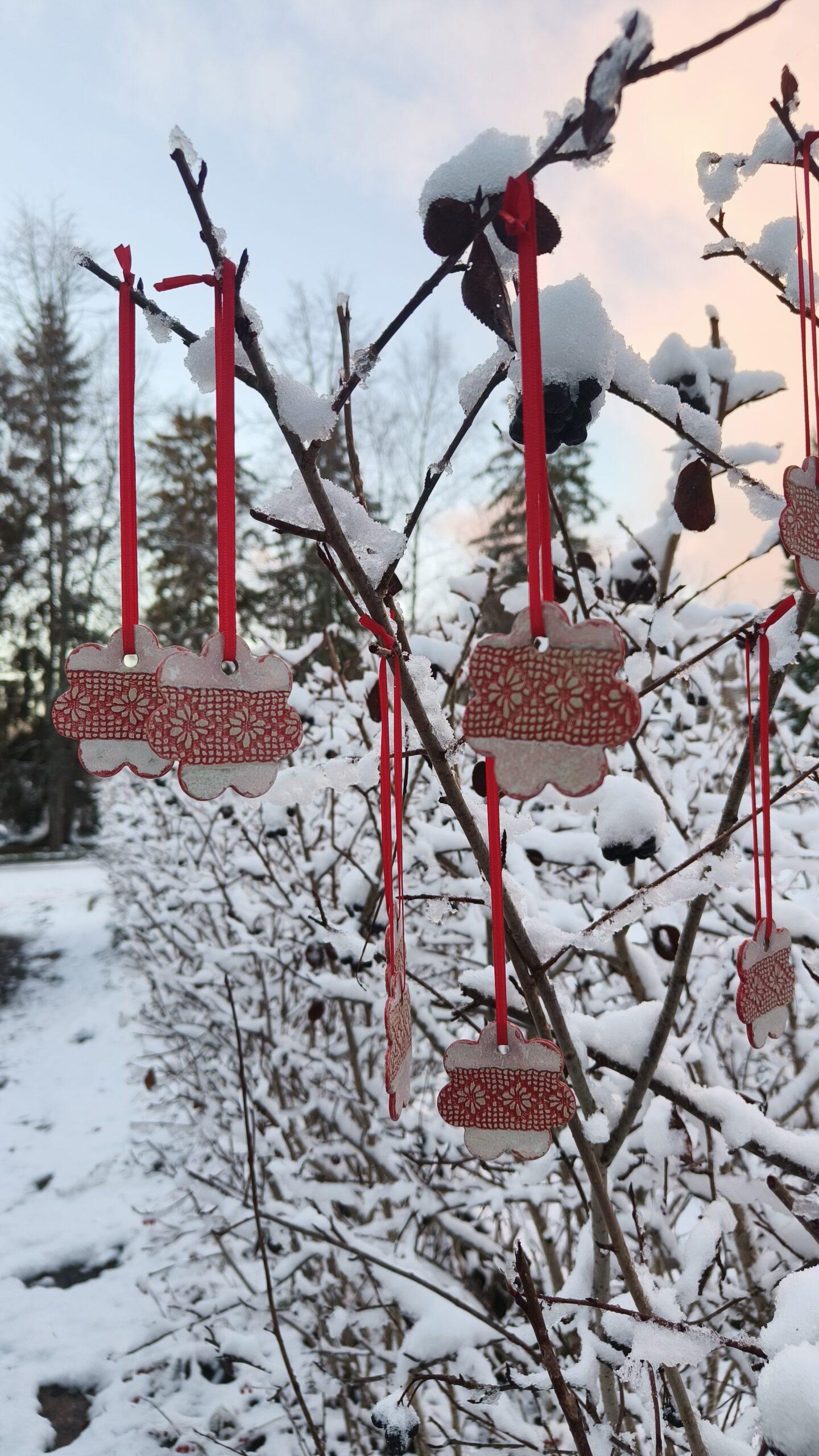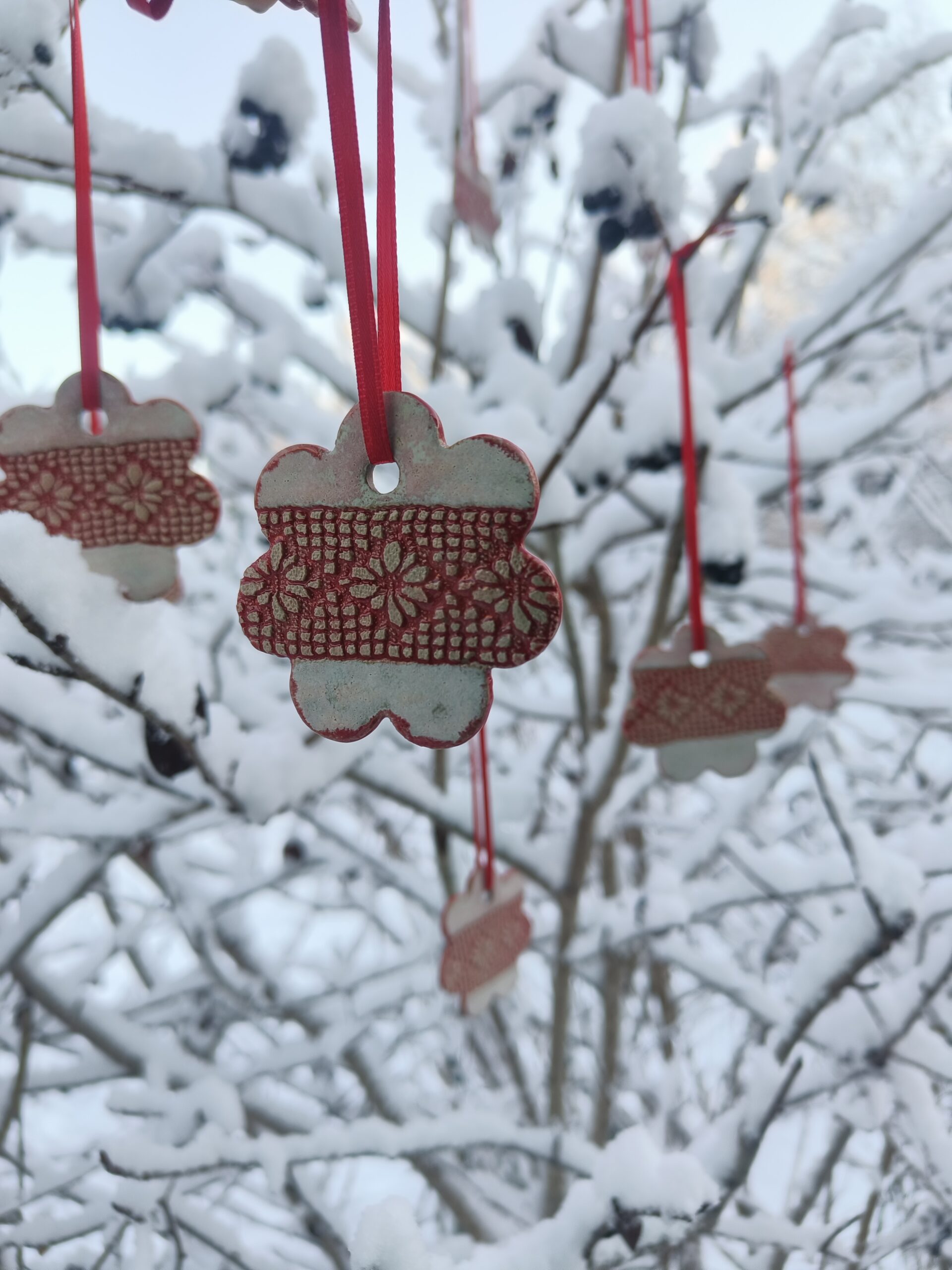 Kõrgkuumus käsitöökeraamika. Lillekujulised keraamilised jõuluehted. Mõlemalt poolt glasuuritud ja punase pitsimustriga kaunistatud. Riputamiseks punane atlaspael. Kuuseehete keraamilise osa läbimõõt 6 cm, kaal keskmiselt 15 g. Kuuseehtele sobiva kinkekarbi leiad SIIT.