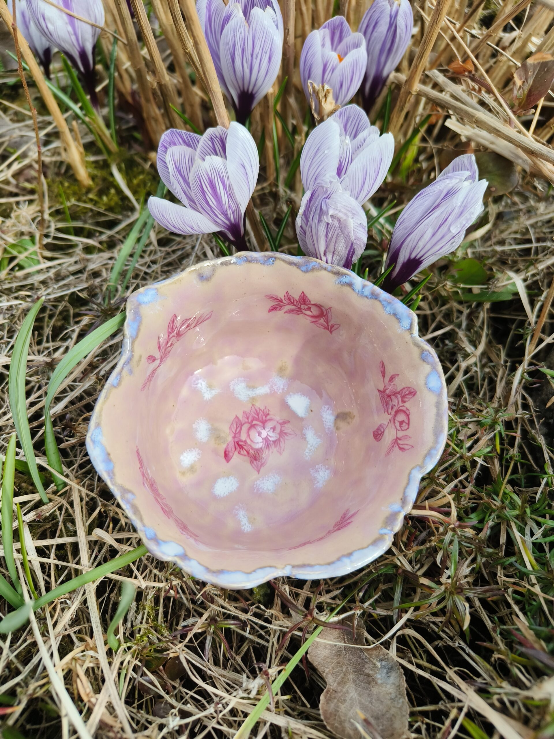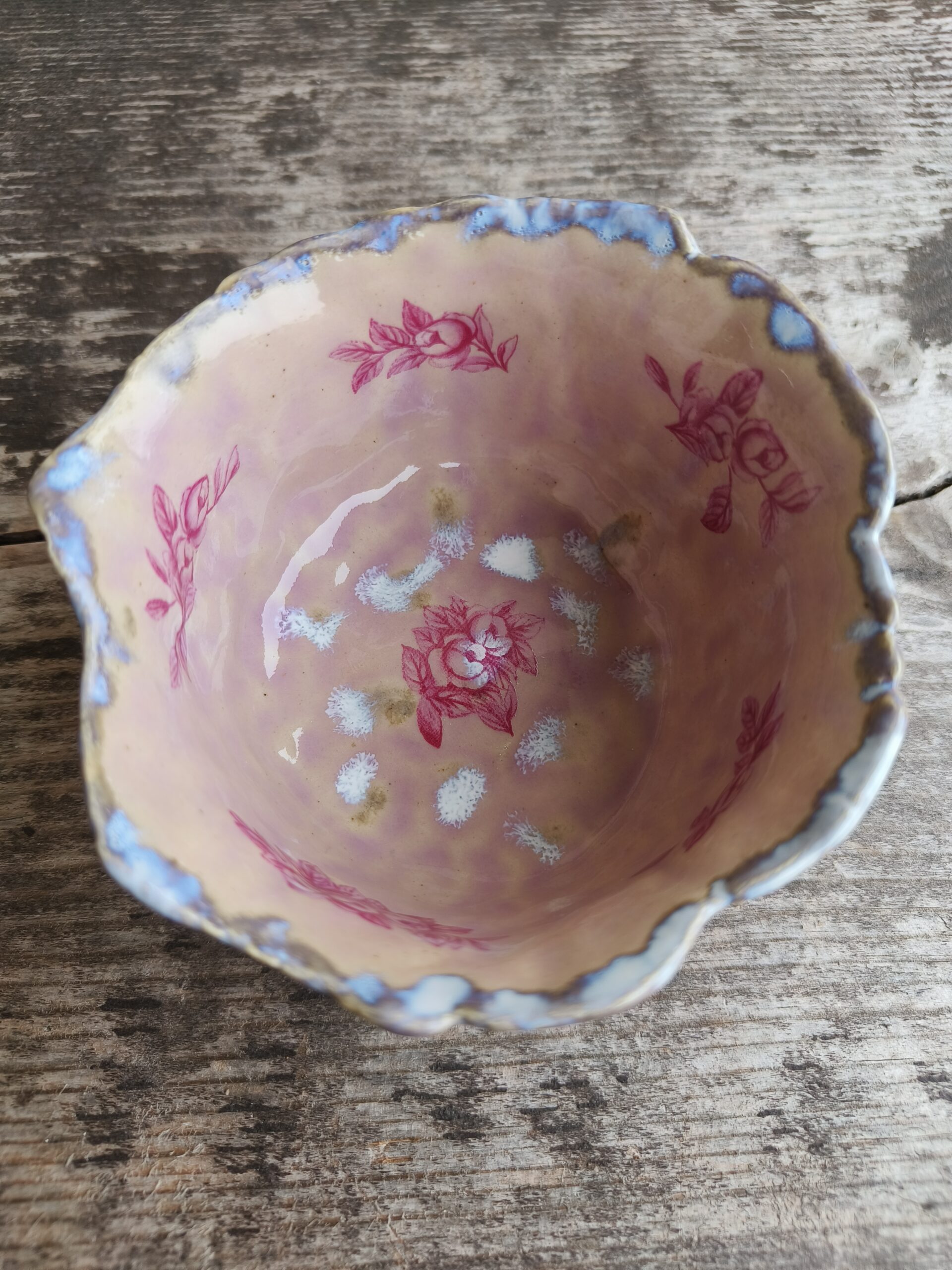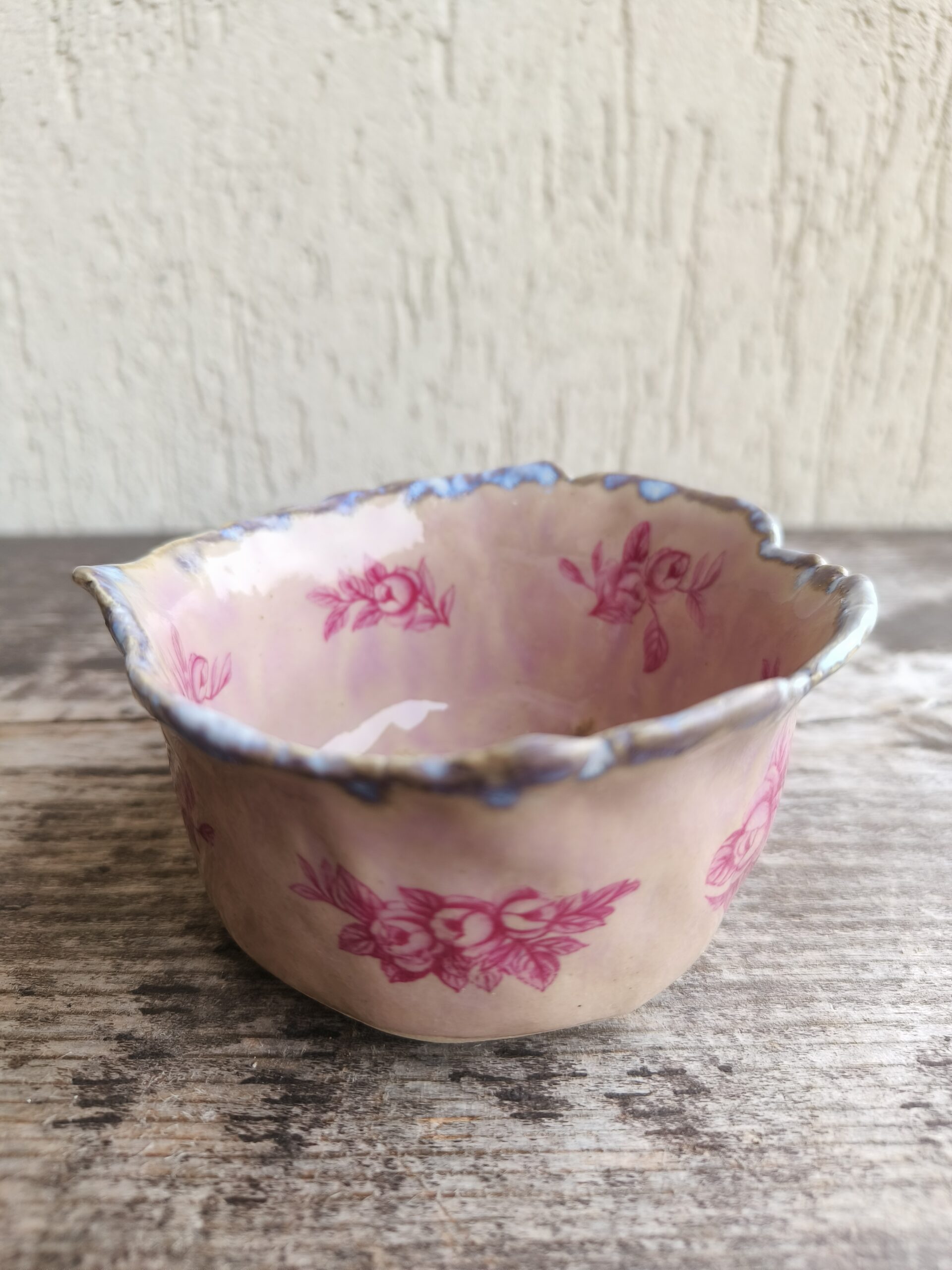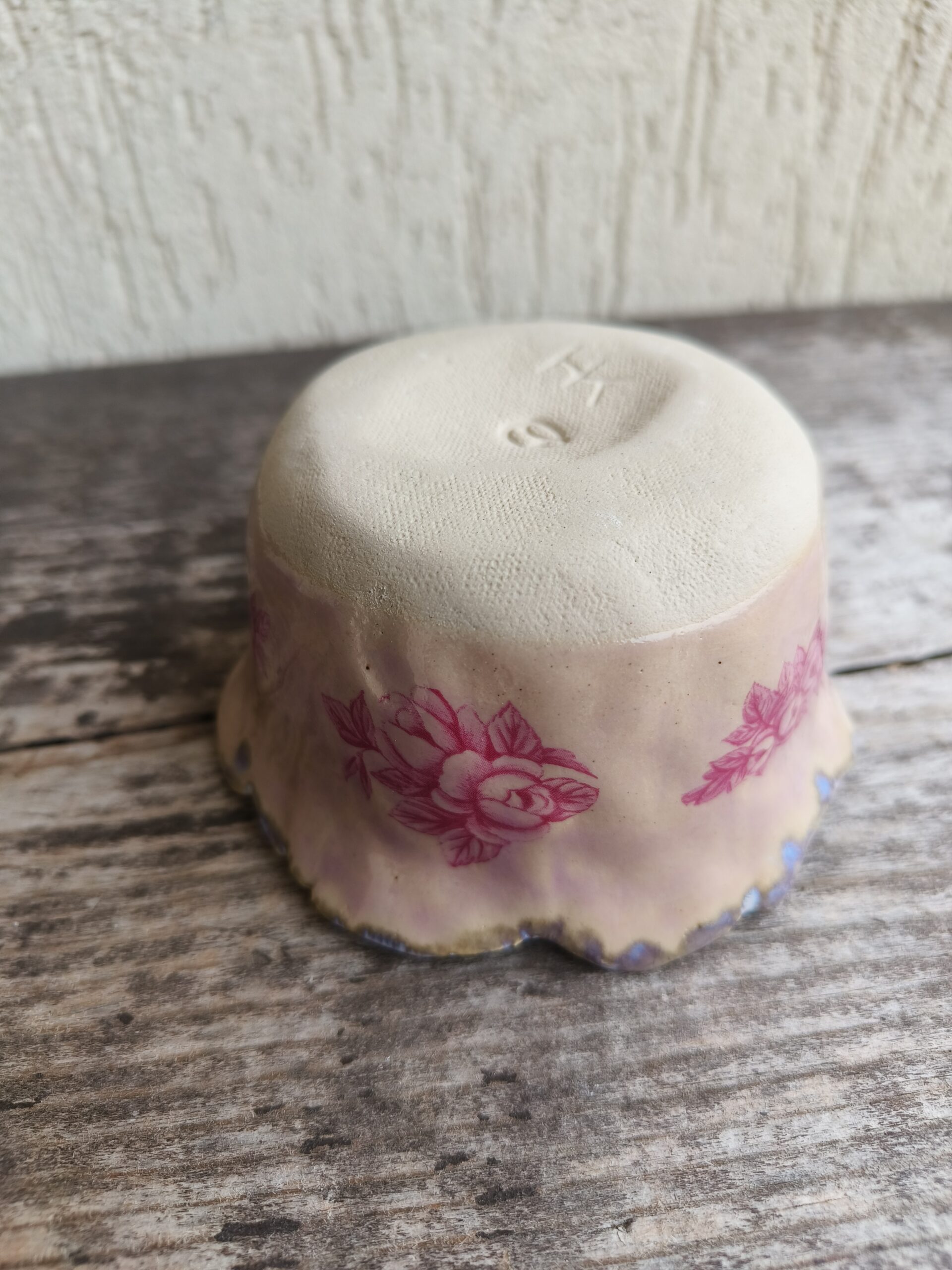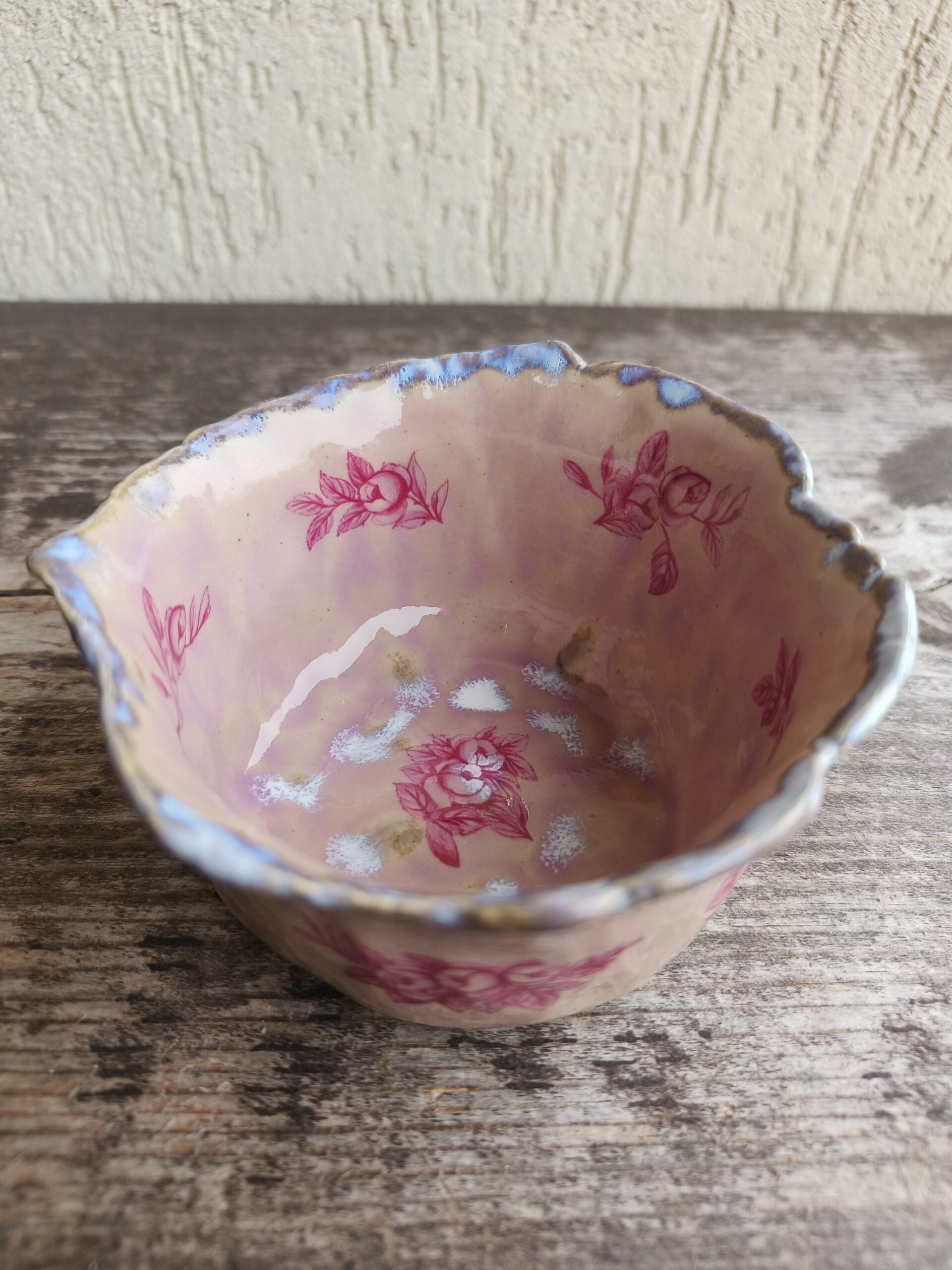 Ülalt laieneva äärega õrnroosa kauss, mida kaunistavad nii seest kui väljast tumeroosad roosipildid ja ülaääres ning põhjas valkjad-hallikad glasuuriefektid. Kausi ülaääre läbimõõt 10,5 cm, põhja läbimõõt 8 cm, kõrgus 5,5 cm. Läikiv glasuur. Võib pesta nõudepesumasinas. 👉 Kausse üksteise sees hoiustades pane nende vahele salvrätt või linik, et vältida piltide maha kulumist. Kõrgkuumus käsitöökeraamika.