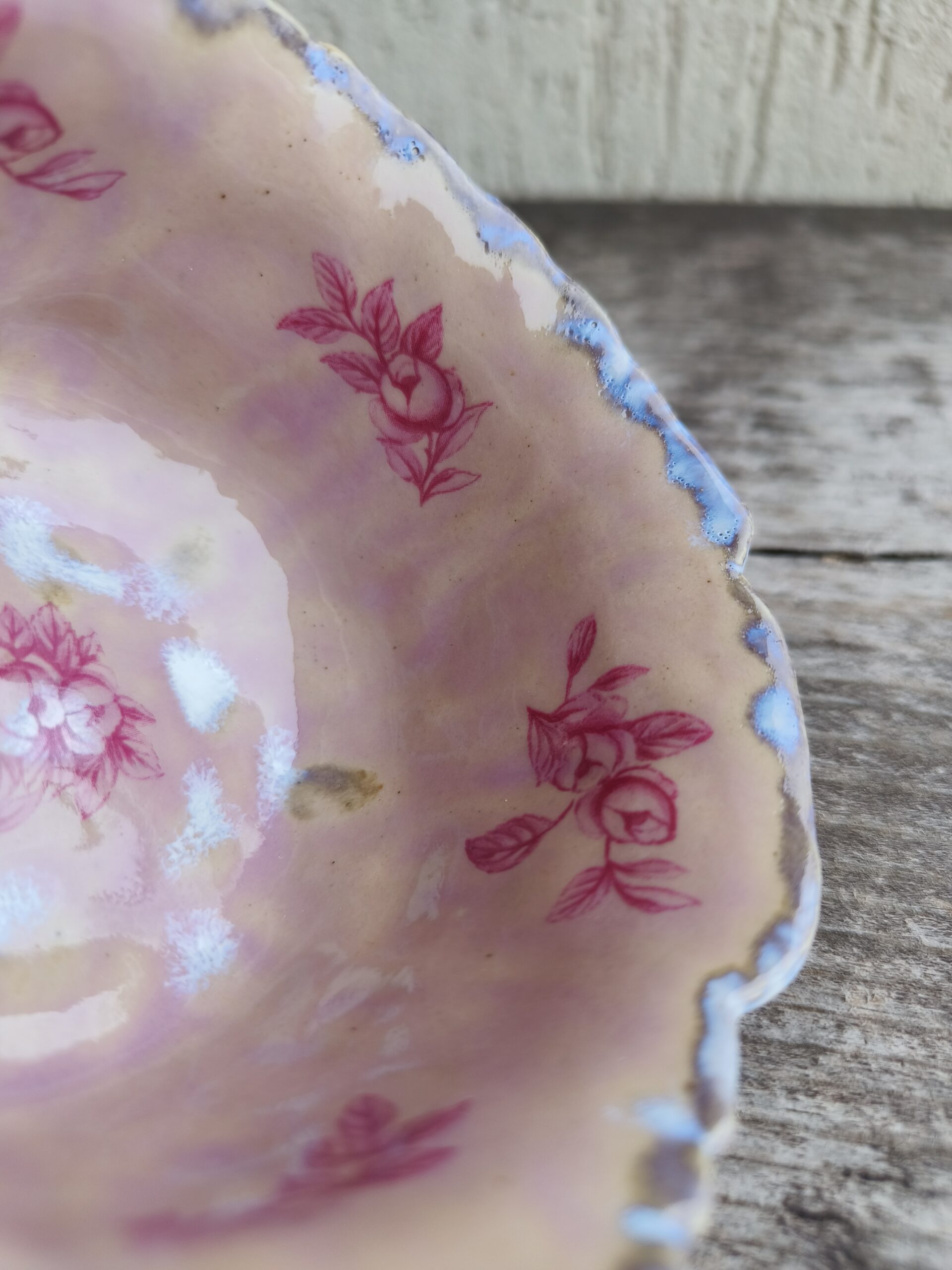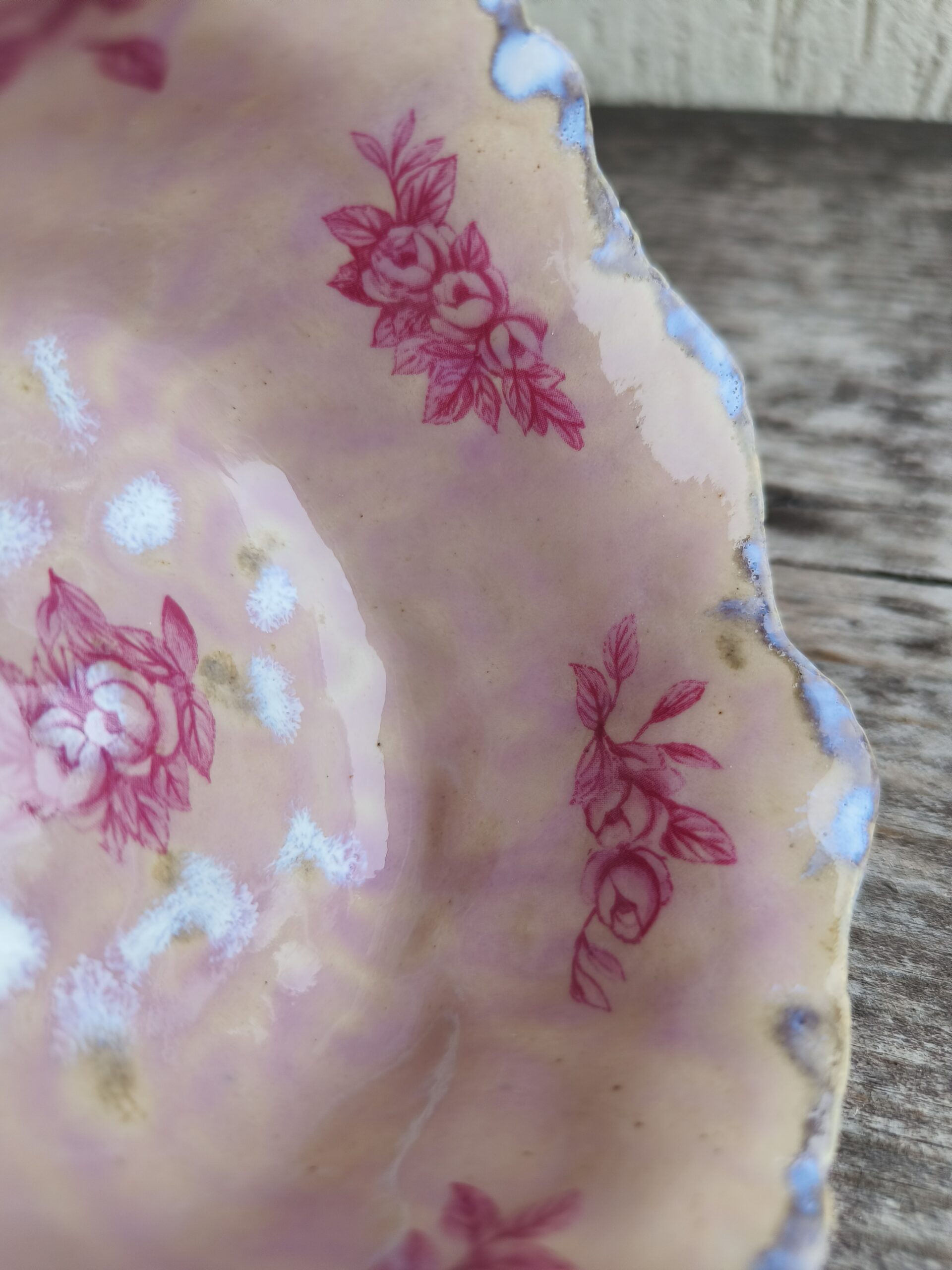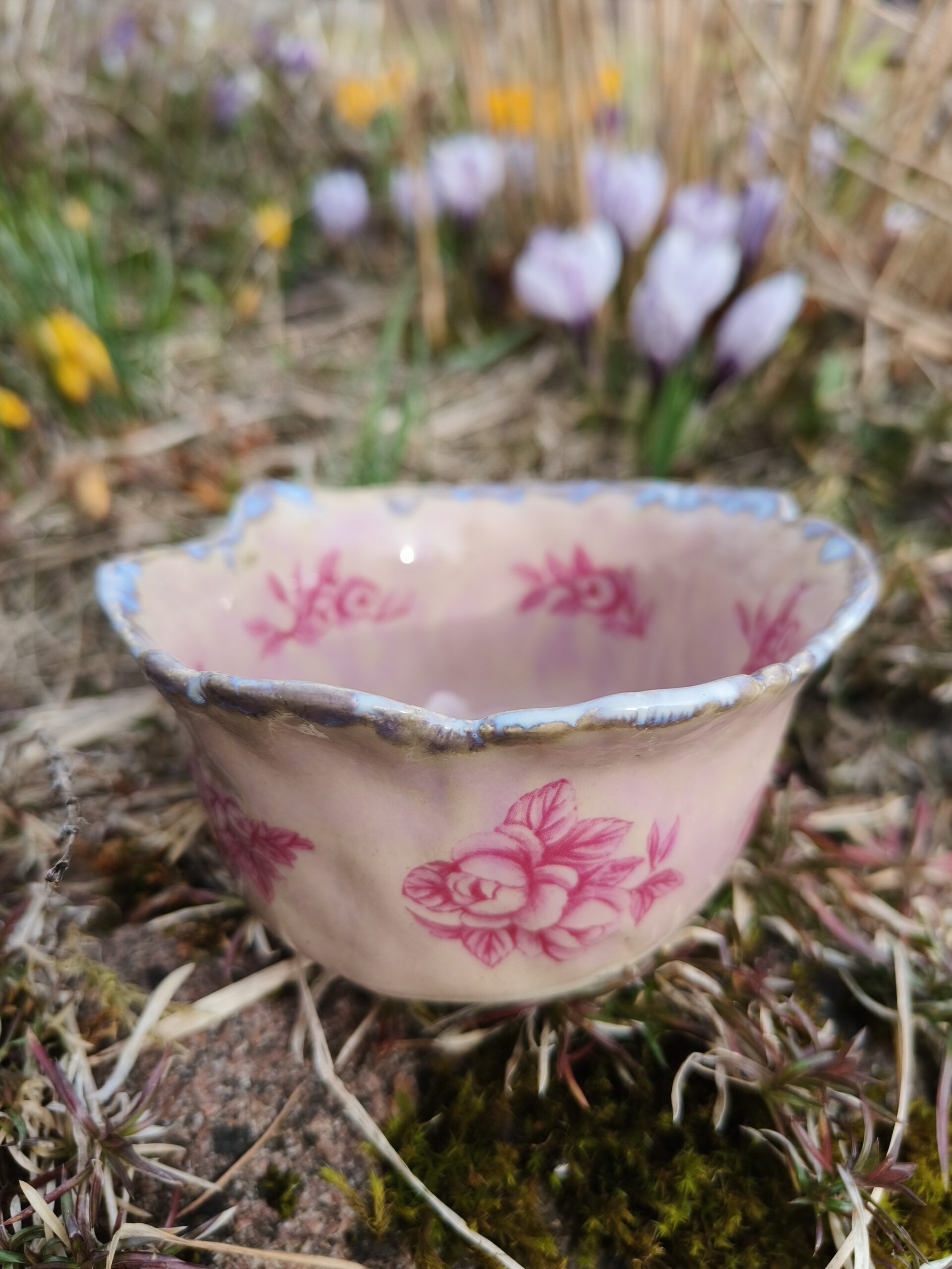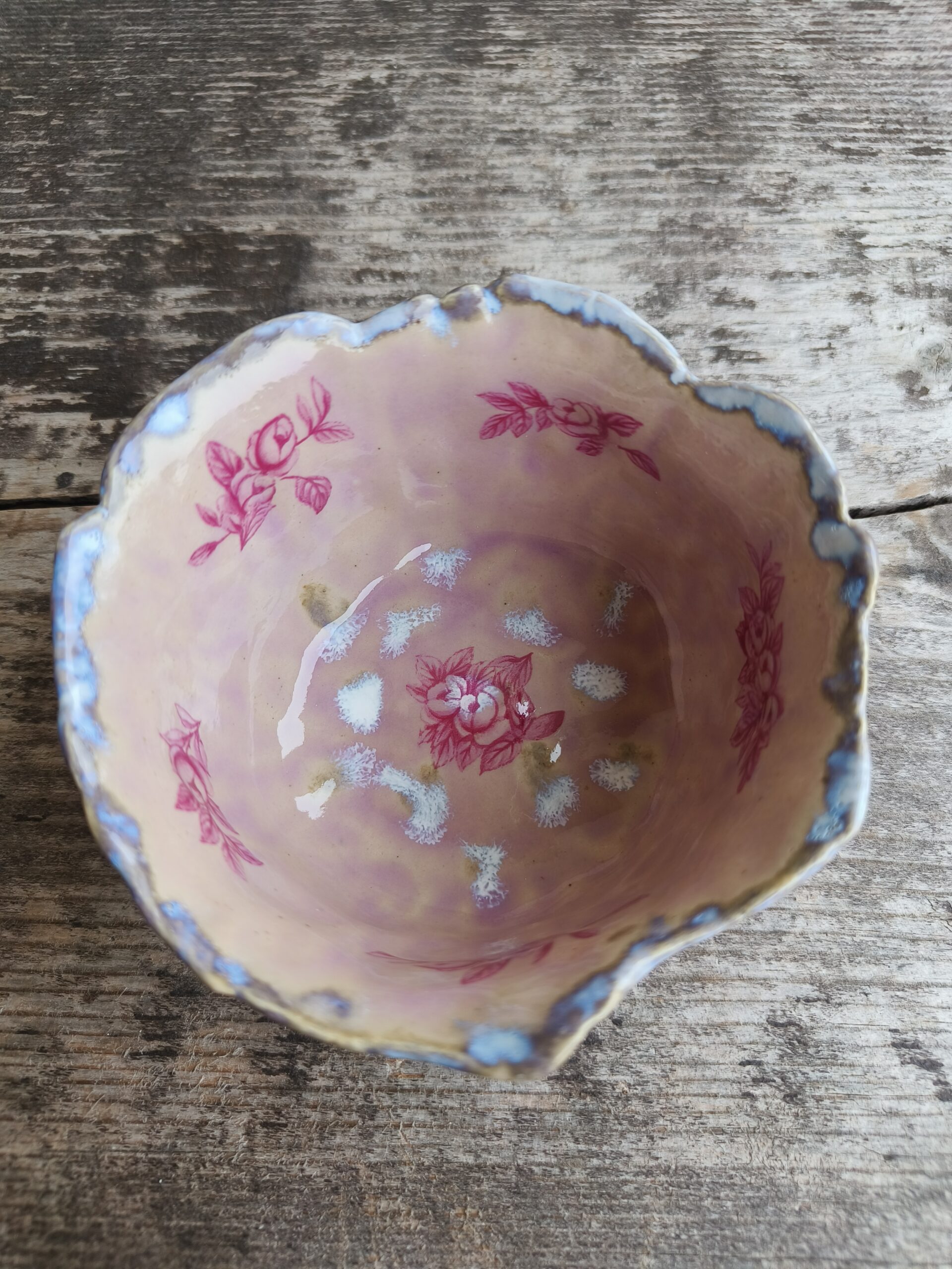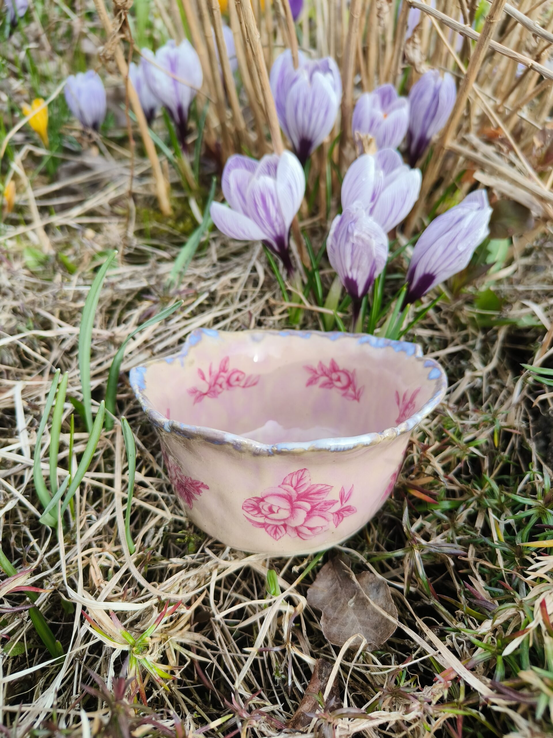Ülalt laieneva äärega õrnroosa kauss, mida kaunistavad nii seest kui väljast tumeroosad roosipildid ja ülaääres ning põhjas valkjad-hallikad glasuuriefektid. Kausi ülaääre läbimõõt 10,5 cm, põhja läbimõõt 8 cm, kõrgus 5,5 cm. Läikiv glasuur. Võib pesta nõudepesumasinas. 👉 Kausse üksteise sees hoiustades pane nende vahele salvrätt või linik, et vältida piltide maha kulumist. Kõrgkuumus käsitöökeraamika.