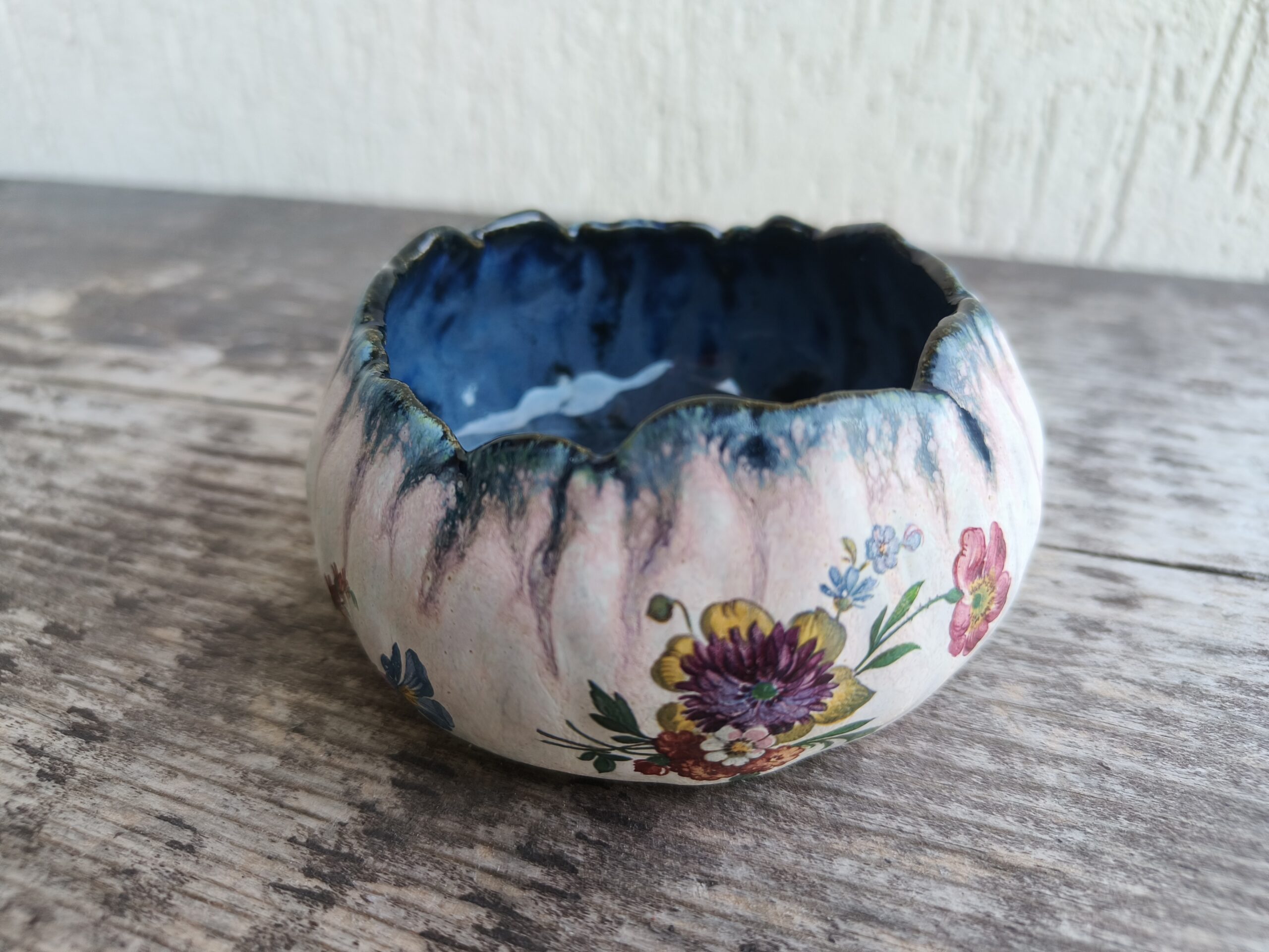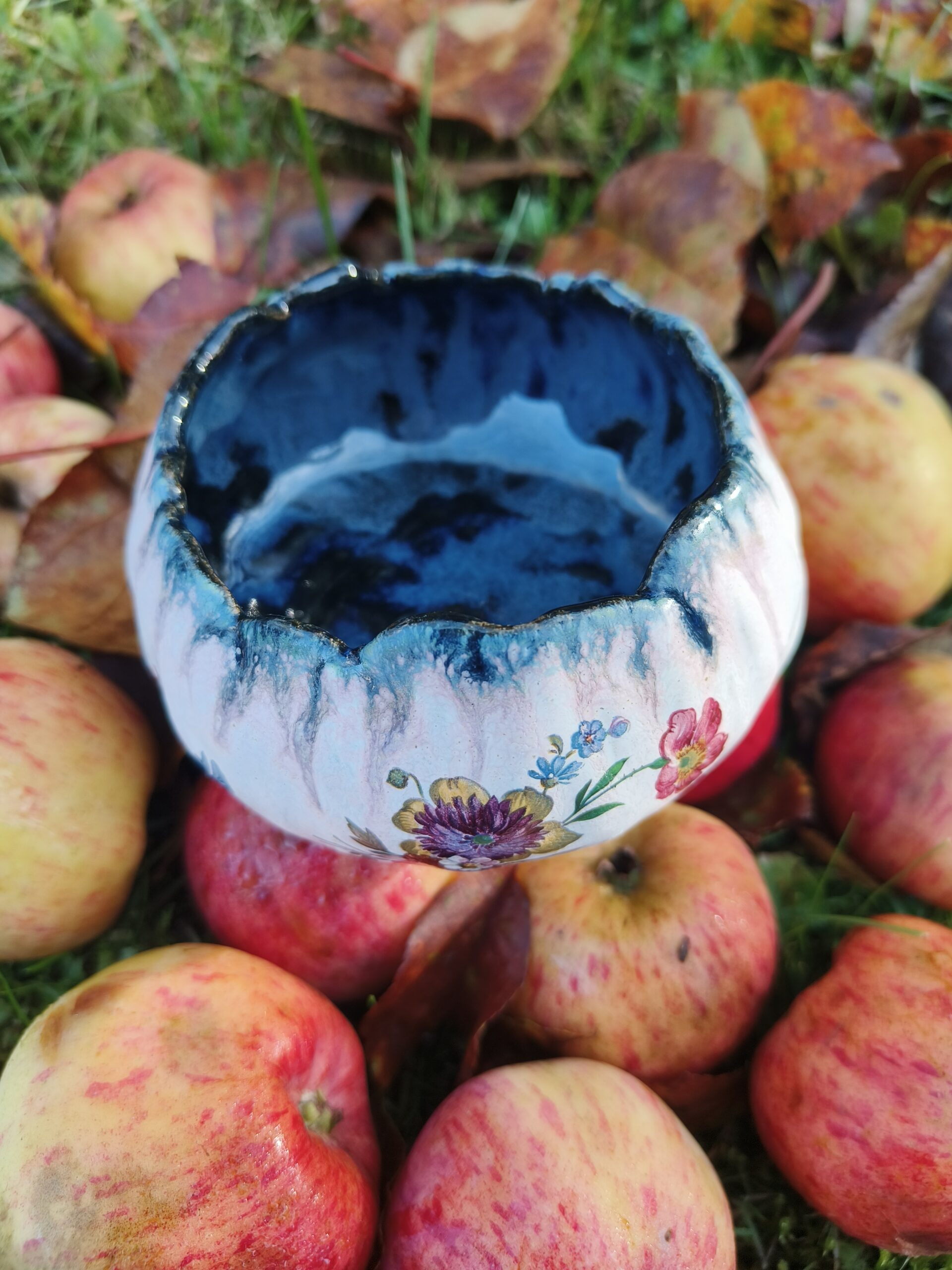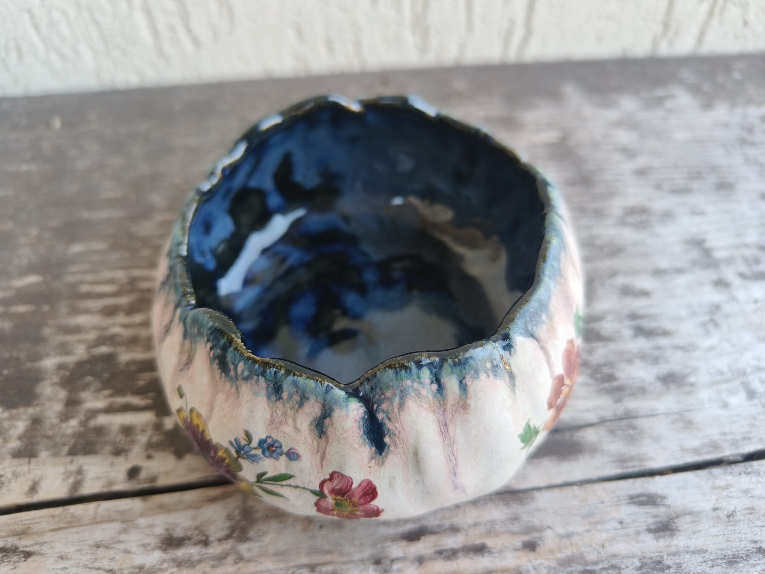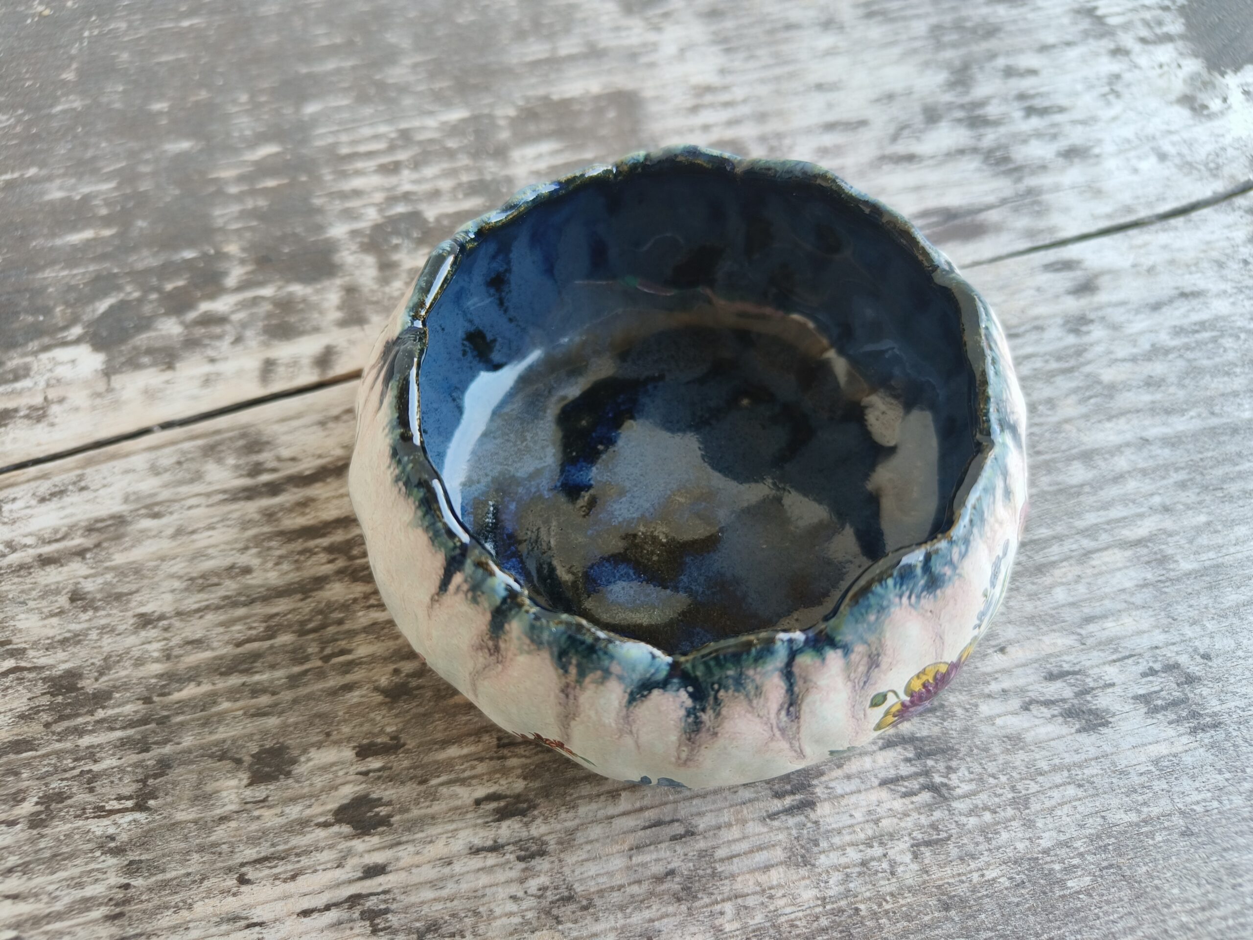 Kõrgkuumus käsitöökeraamika. Seest tumesinine ja pealt valge ning lillepiltidega kaunistatud kausike. Sakiline ja voolavate glasuuriefektidega ülaäär. Kausikese läbimõõt ülaservast 8 cm, keskelt 10 cm. Kõrgus 5 cm. Võib pesta nõudepesumasinas. Komplekti sobivad seest sinised lilletassid leiab SIIT ja sinised lillevaagnad leiab SIIT.