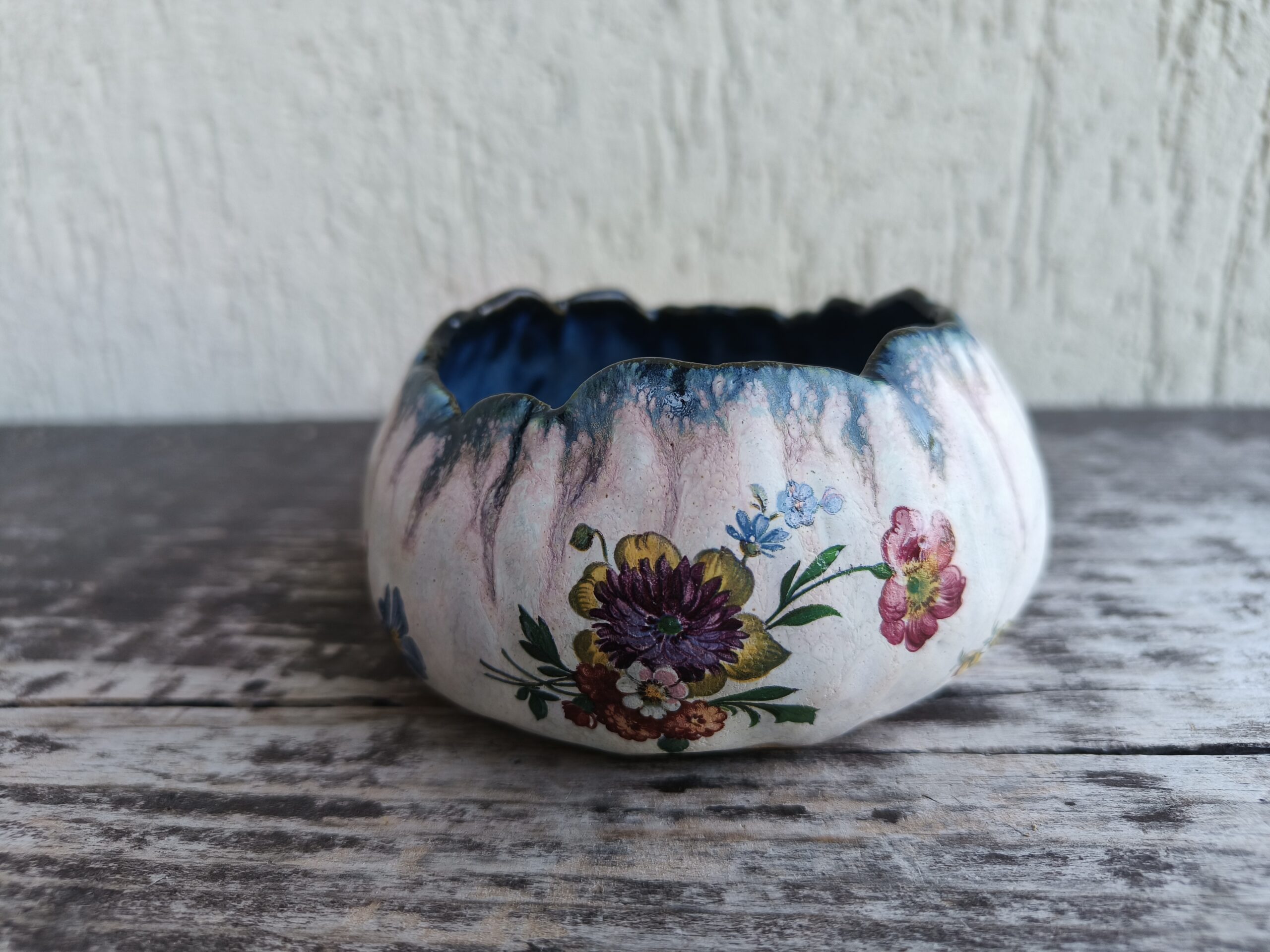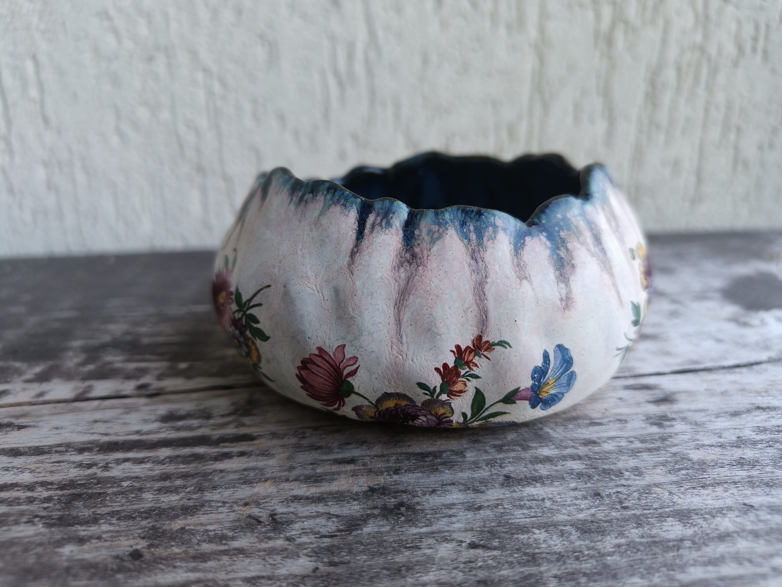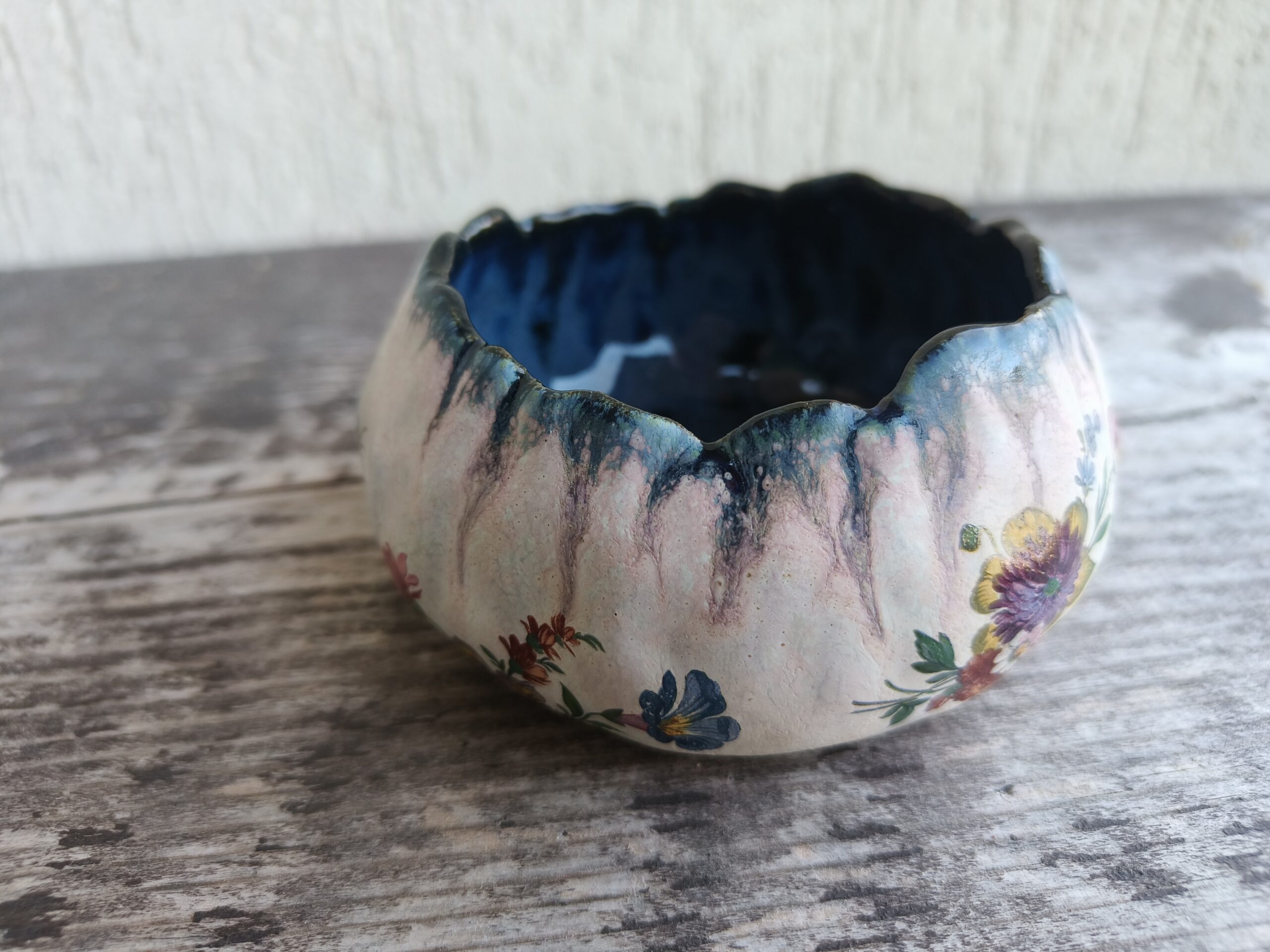 Kõrgkuumus käsitöökeraamika. Seest tumesinine ja pealt valge ning lillepiltidega kaunistatud kausike. Sakiline ja voolavate glasuuriefektidega ülaäär. Kausikese läbimõõt ülaservast 8 cm, keskelt 10 cm. Kõrgus 5 cm. Võib pesta nõudepesumasinas. Komplekti sobivad seest sinised lilletassid leiab SIIT ja sinised lillevaagnad leiab SIIT.