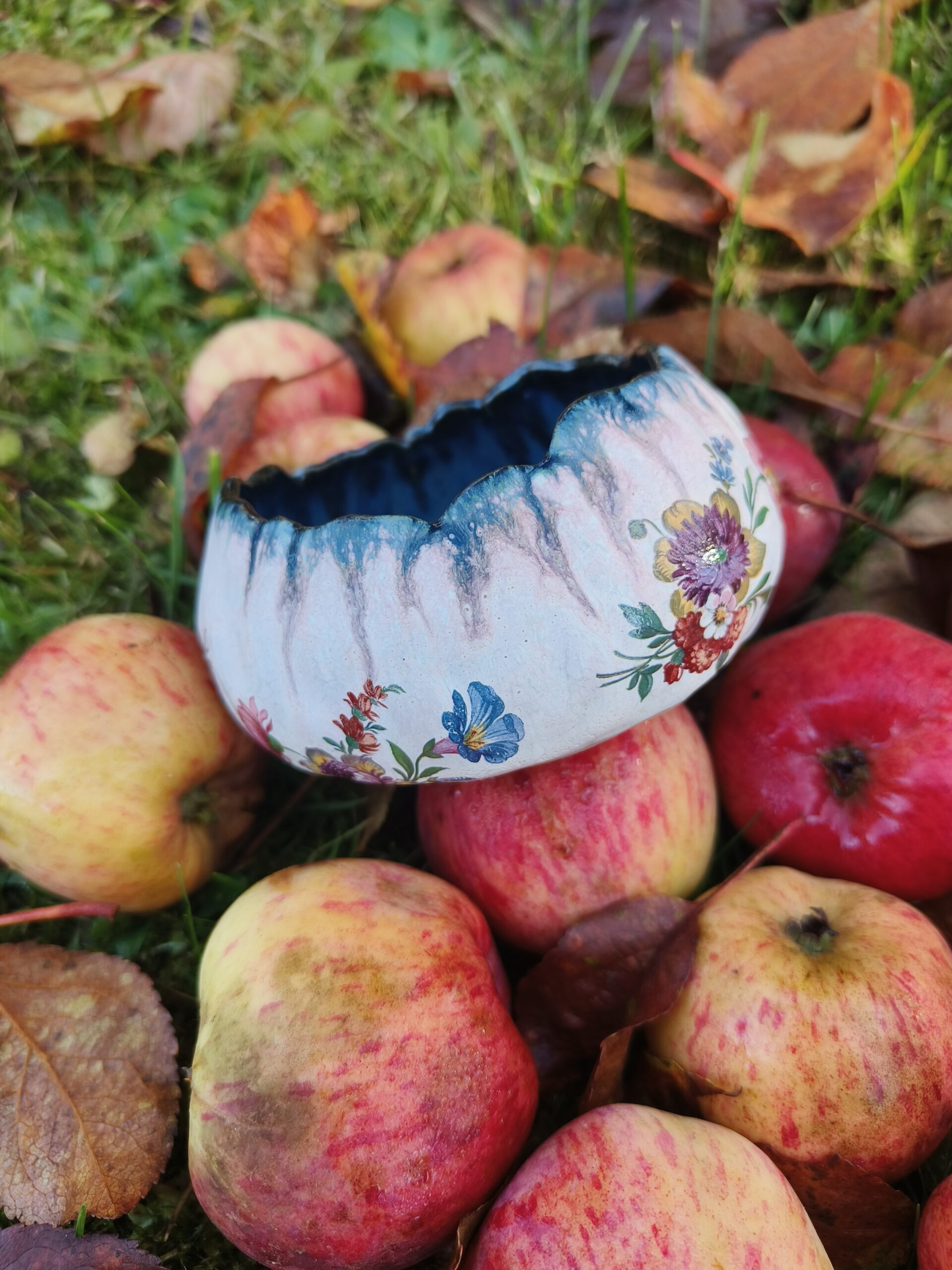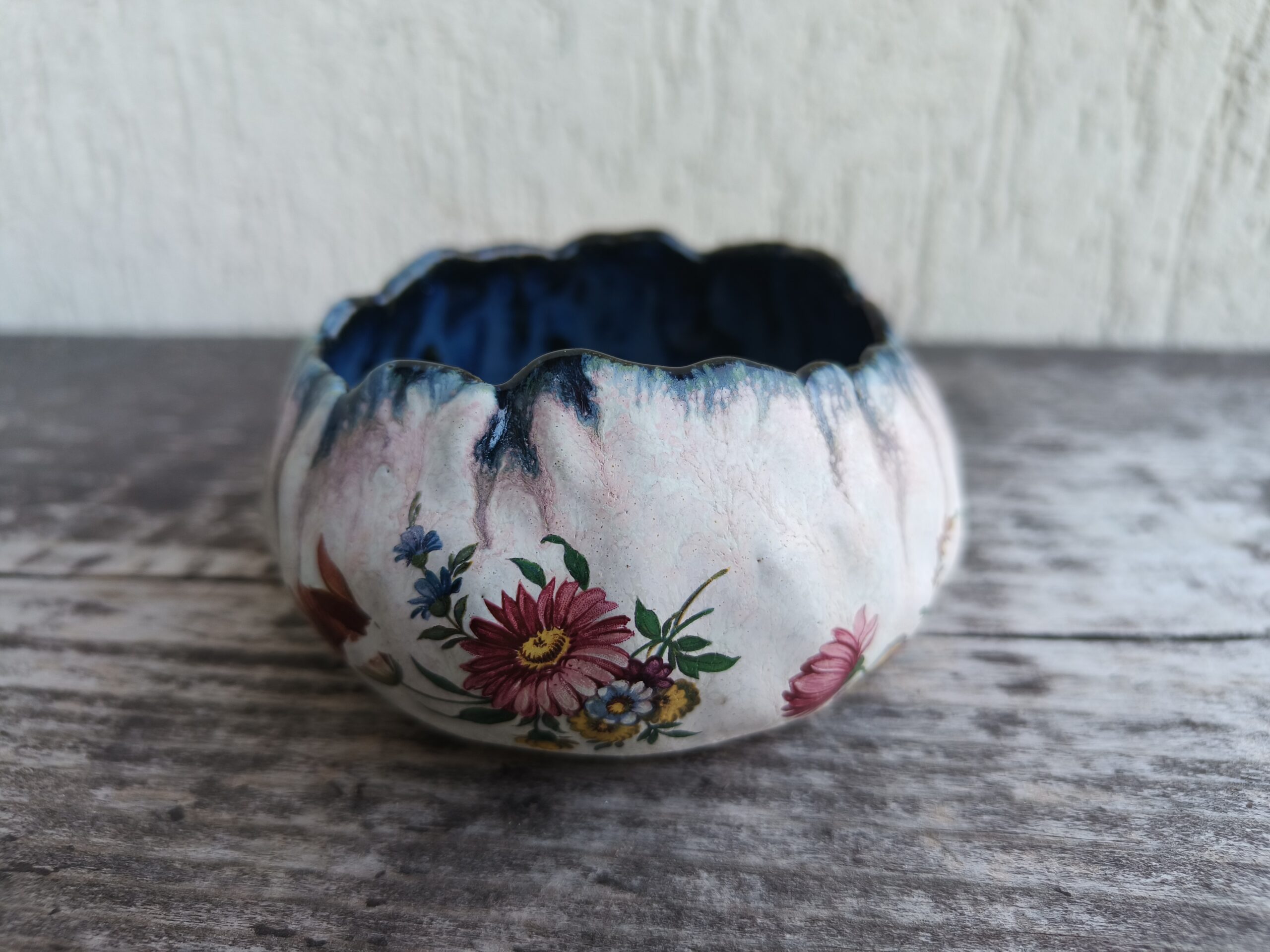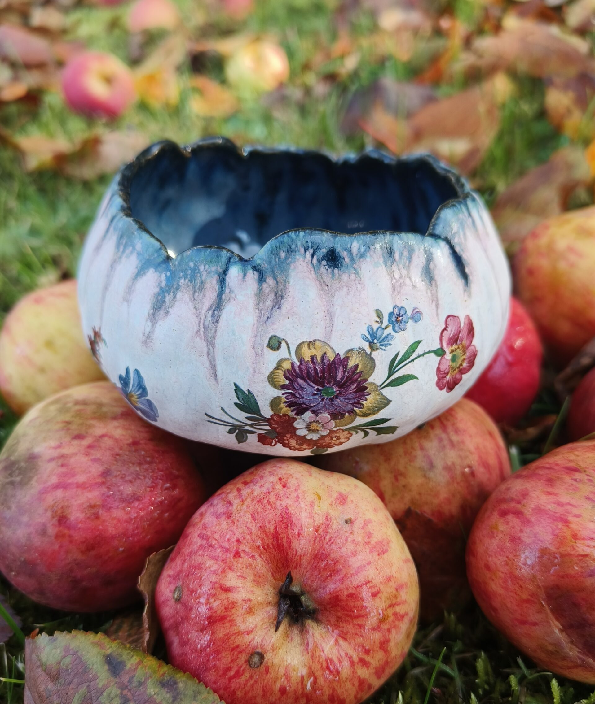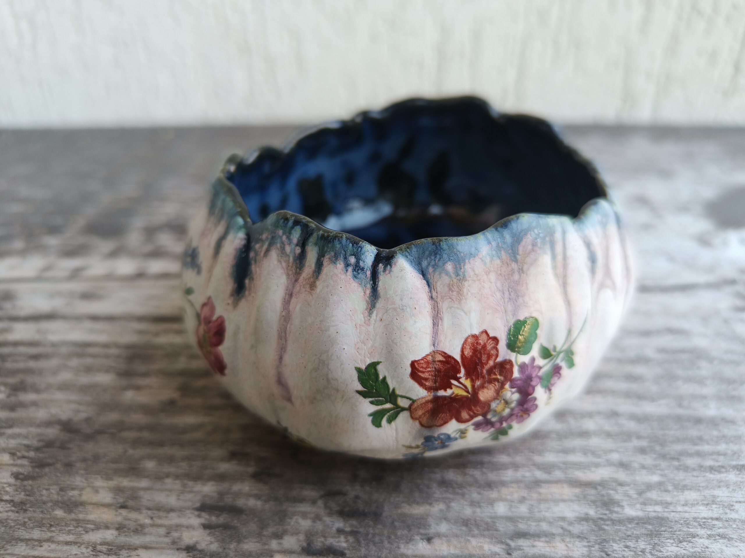 Kõrgkuumus käsitöökeraamika. Seest tumesinine ja pealt valge ning lillepiltidega kaunistatud kausike. Sakiline ja voolavate glasuuriefektidega ülaäär. Kausikese läbimõõt ülaservast 8 cm, keskelt 10 cm. Kõrgus 5 cm. Võib pesta nõudepesumasinas. Komplekti sobivad seest sinised lilletassid leiab SIIT ja sinised lillevaagnad leiab SIIT.