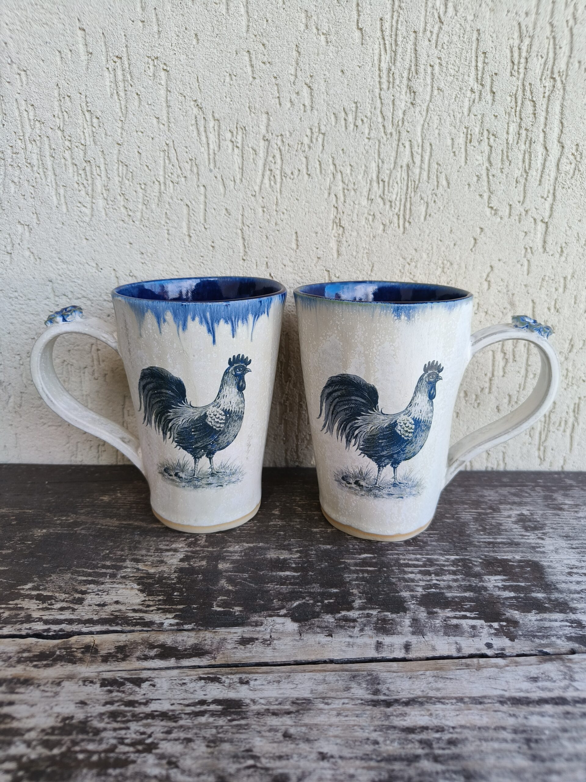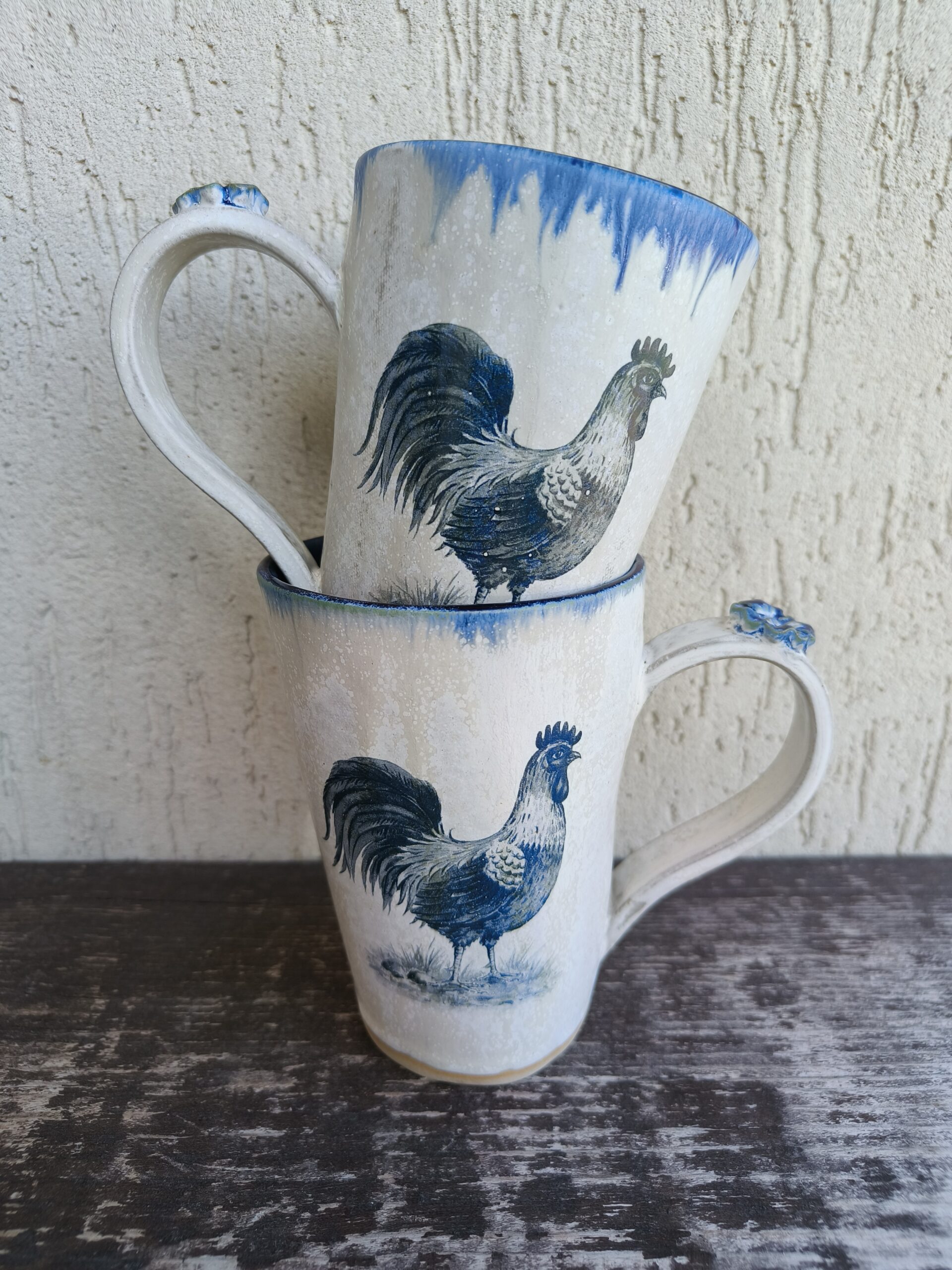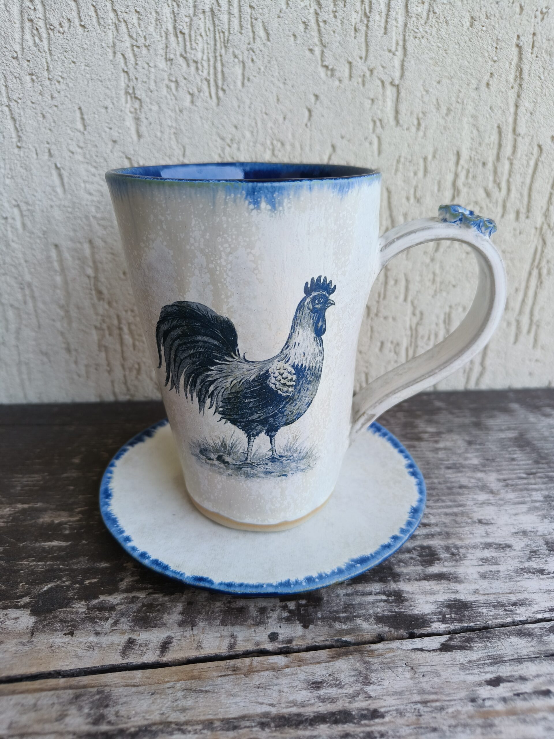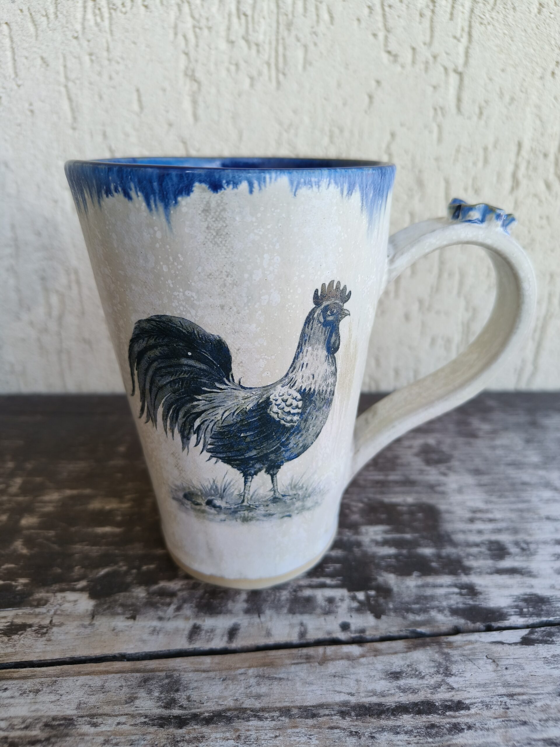 Seest tumesinine ja pealt valge suur tass, mille külgedel on sinised kukepildid. Tass mahutab 500 ml. Läbimõõt ülevalt 9,5 cm ja alt 6,5 cm. Kõrgus 13 cm. Pealt mati, seest läikiva glasuuriga. Võib pesta nõudepesumasinas. Komplekti sobivad alustaldrikud leiab SIIT. Kõrgkuumus käsitöökeraamika.