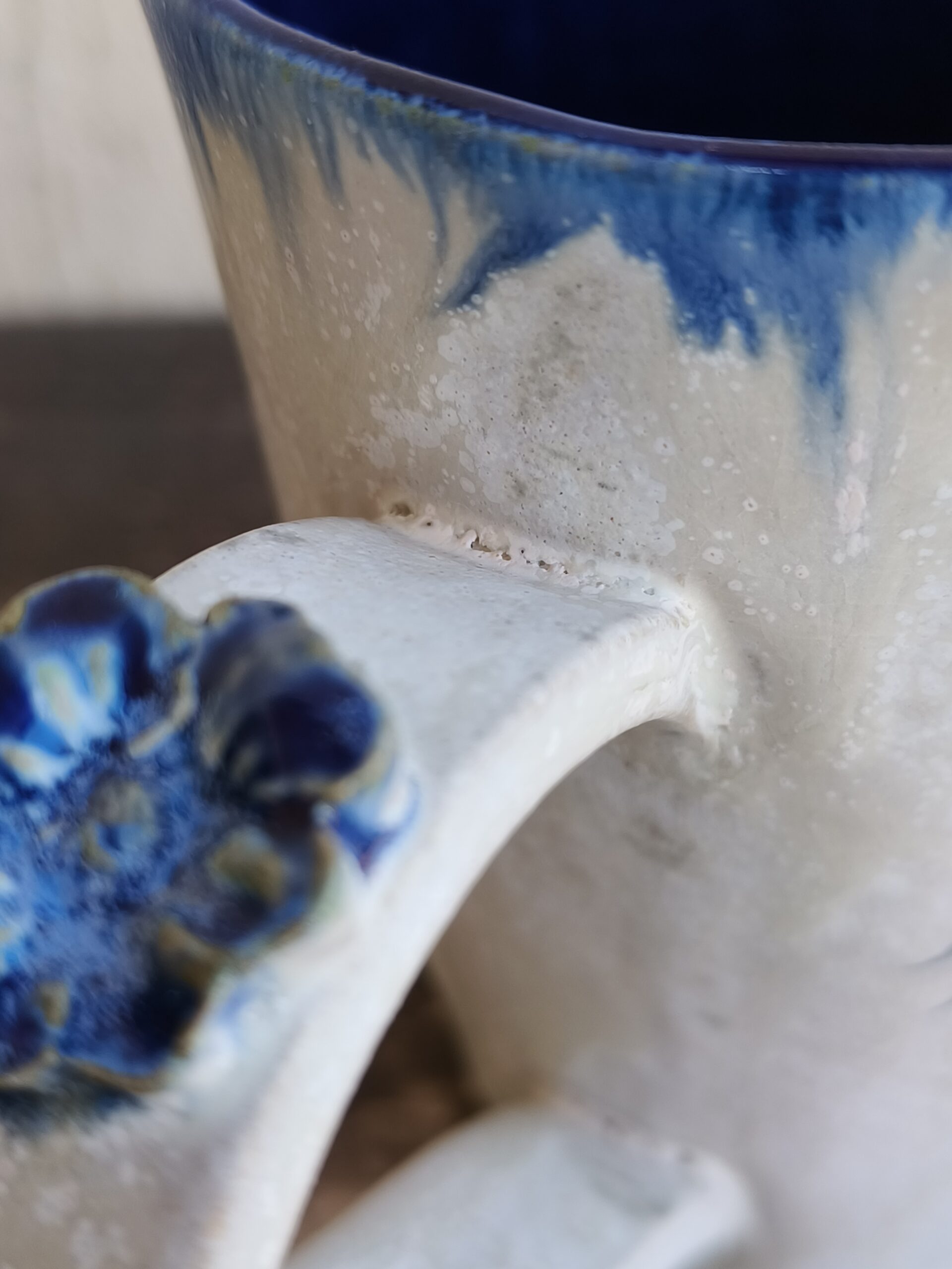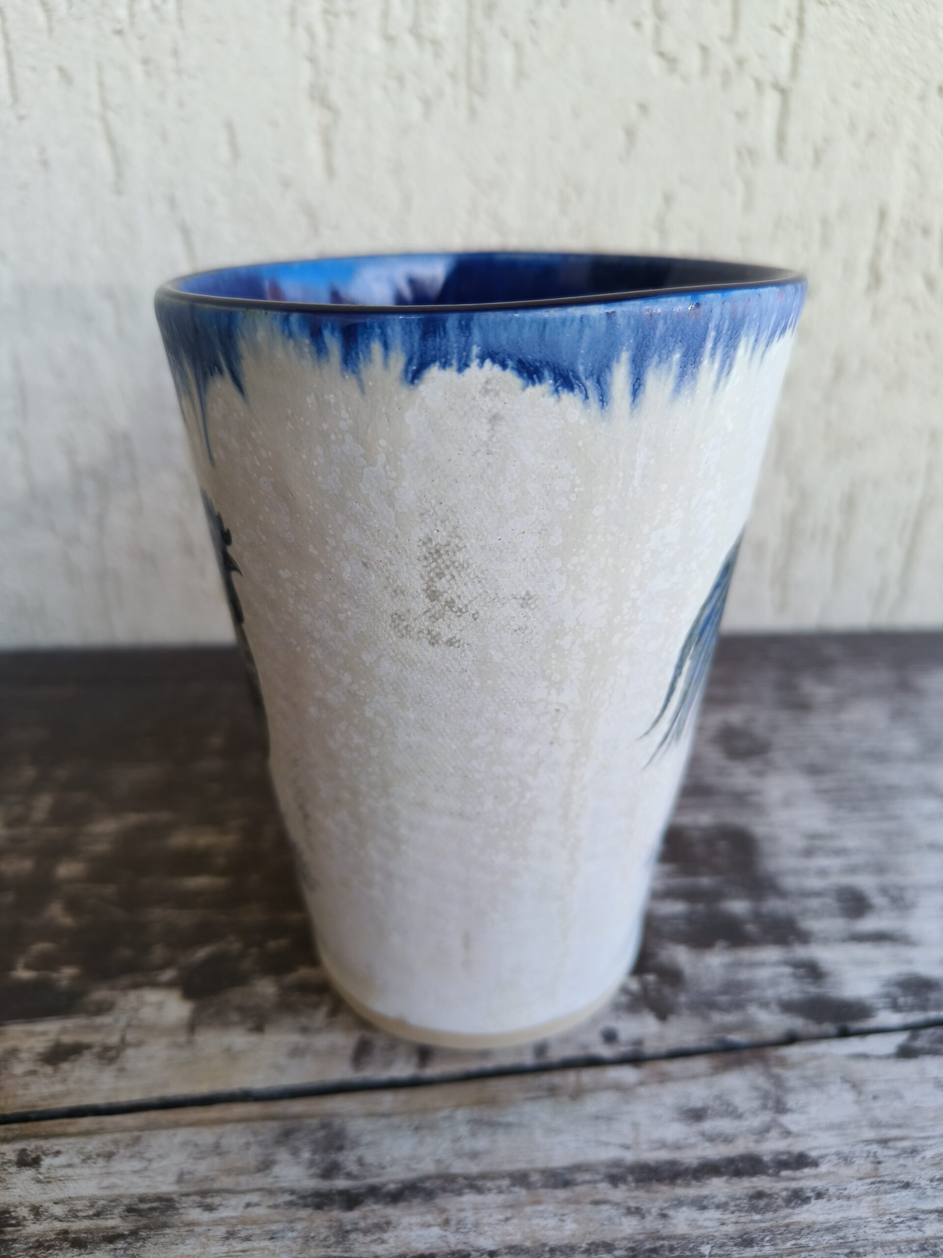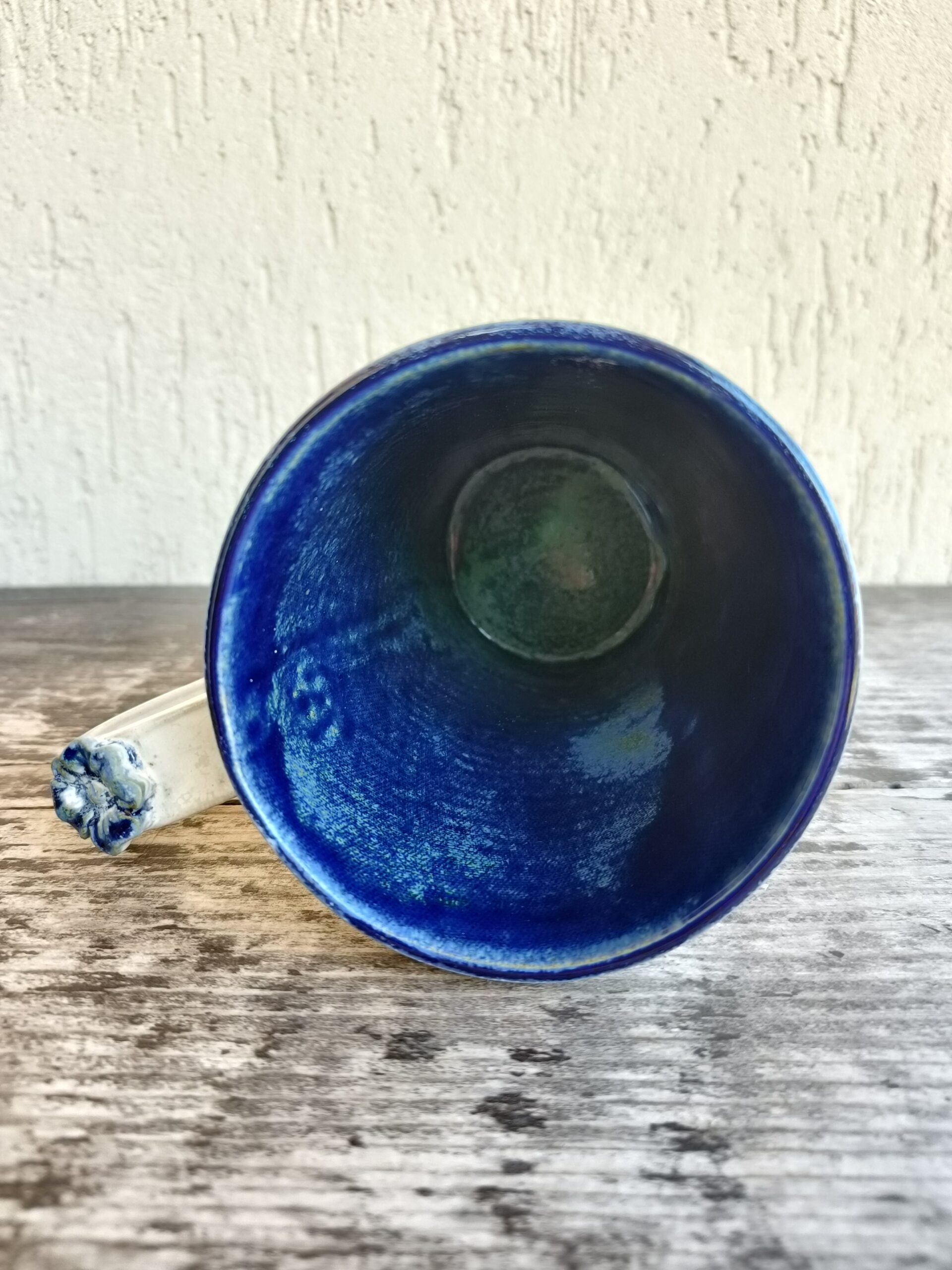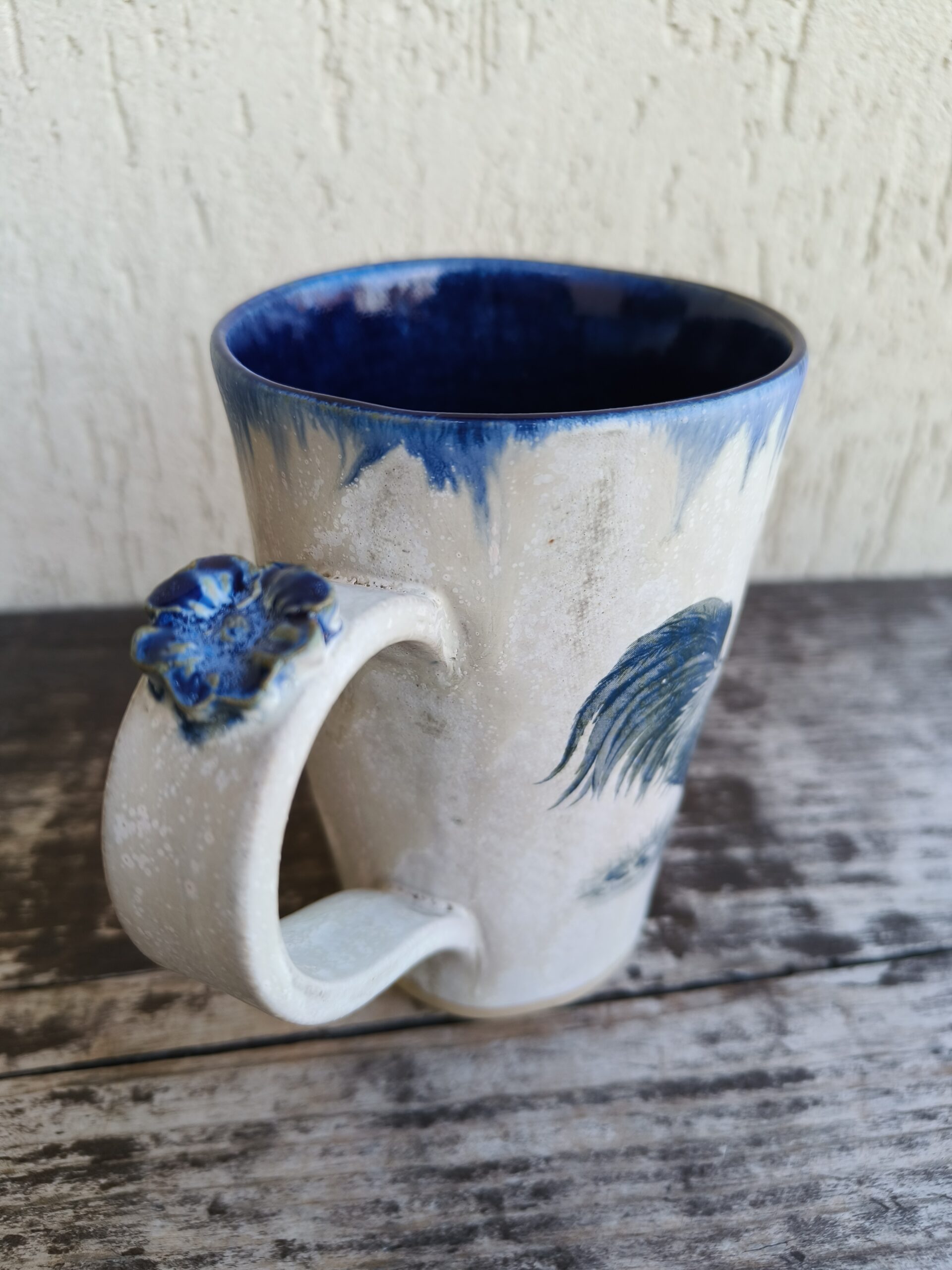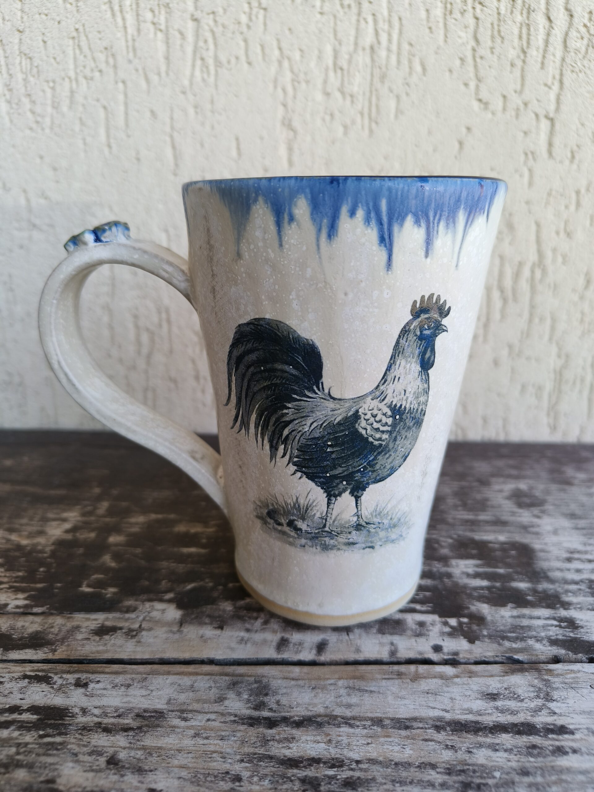 Seest tumesinine ja pealt valge suur tass, mille külgedel on sinised kukepildid. Tass mahutab 500 ml. Läbimõõt ülevalt 9,5 cm ja alt 6,5 cm. Kõrgus 13 cm. Pealt mati, seest läikiva glasuuriga. Võib pesta nõudepesumasinas. Komplekti sobivad alustaldrikud leiab SIIT. Kõrgkuumus käsitöökeraamika.