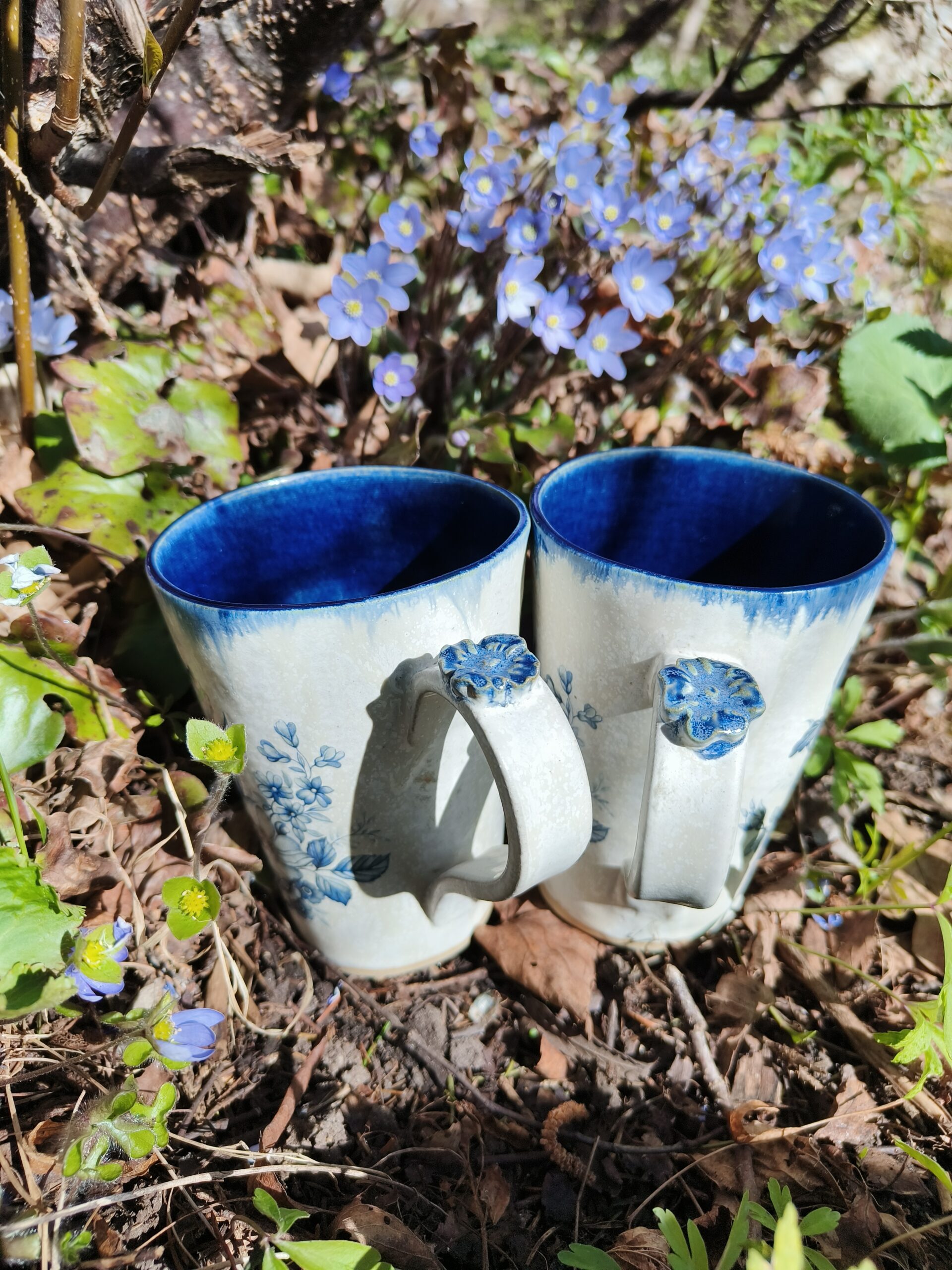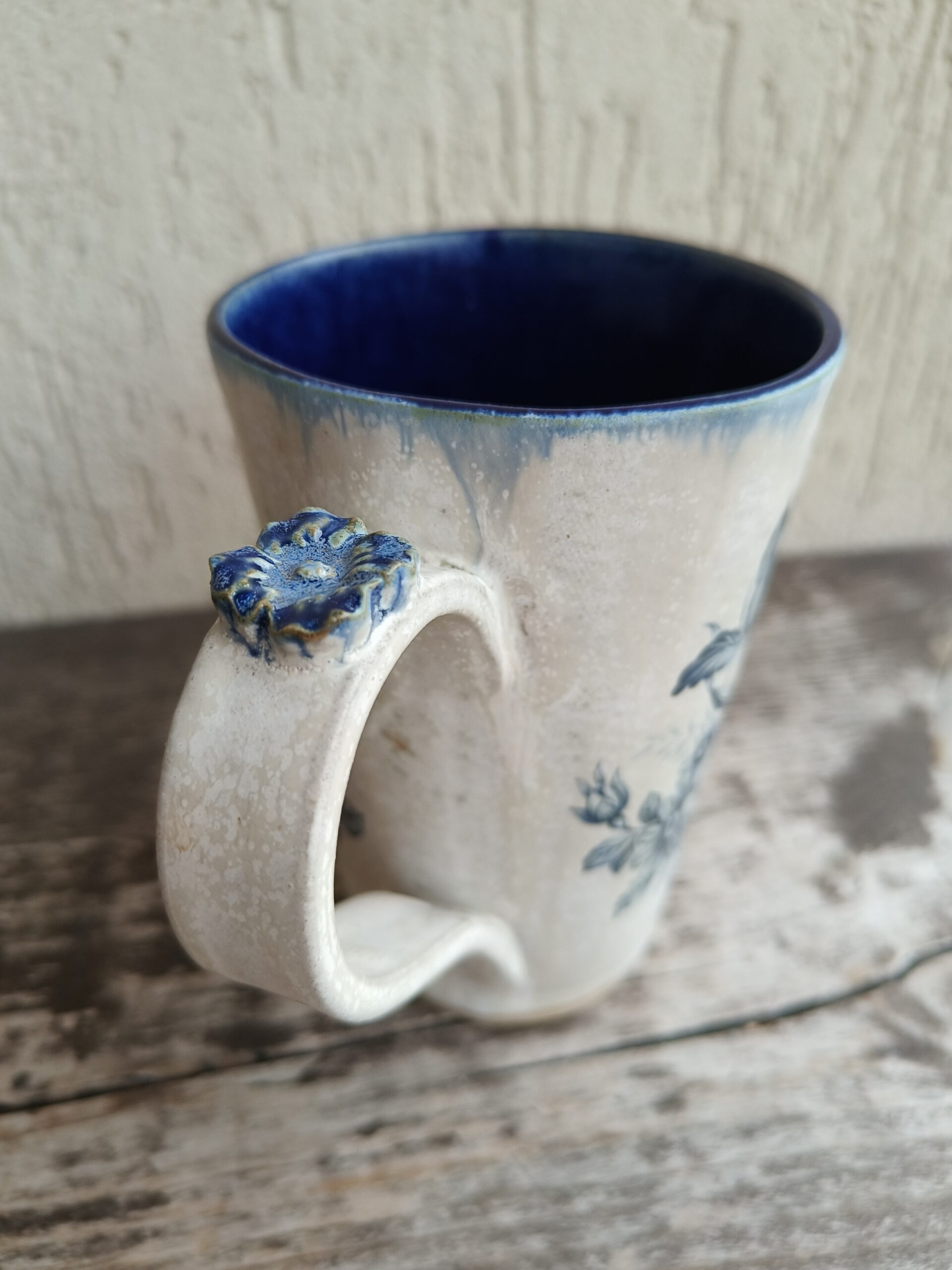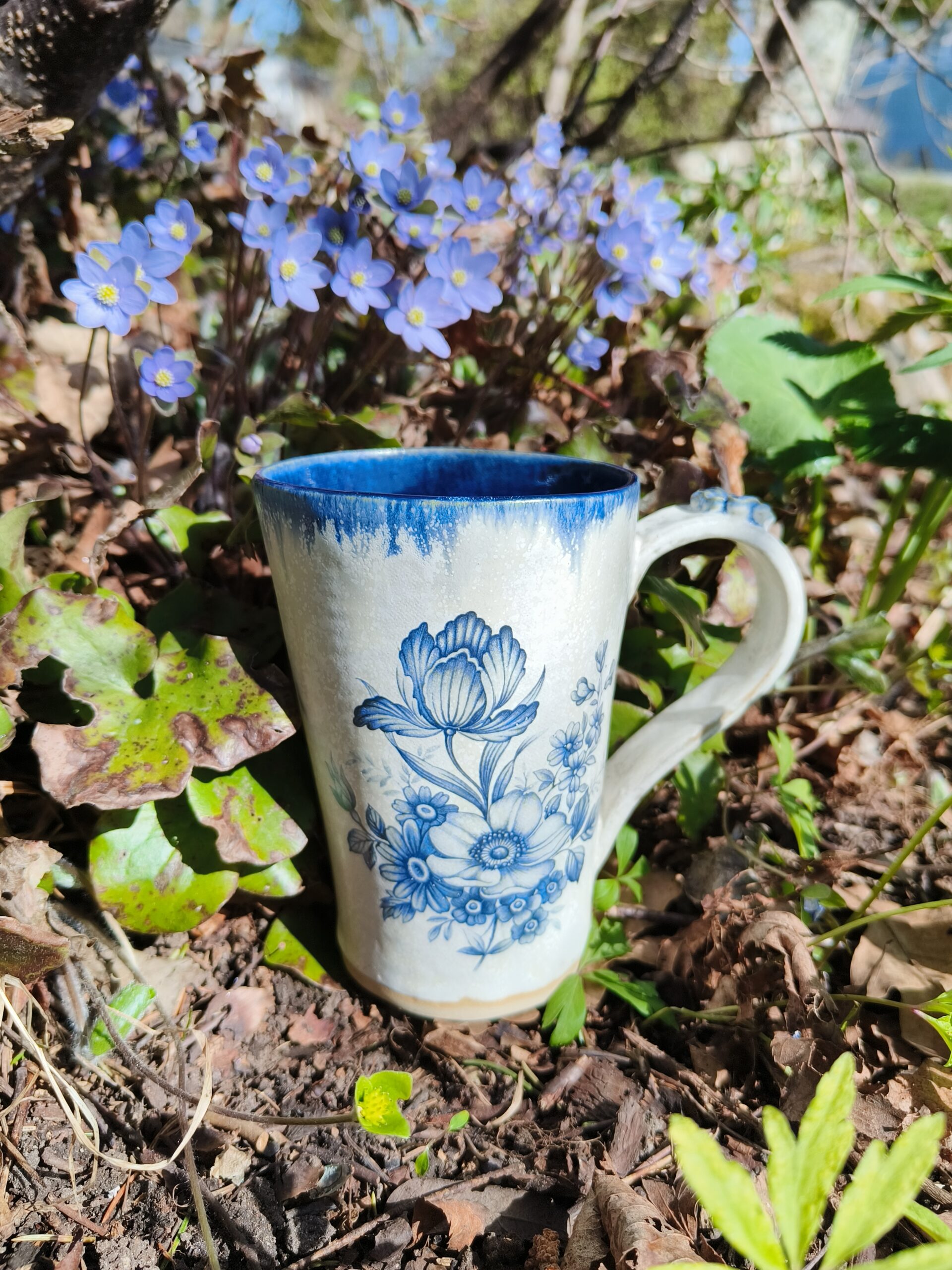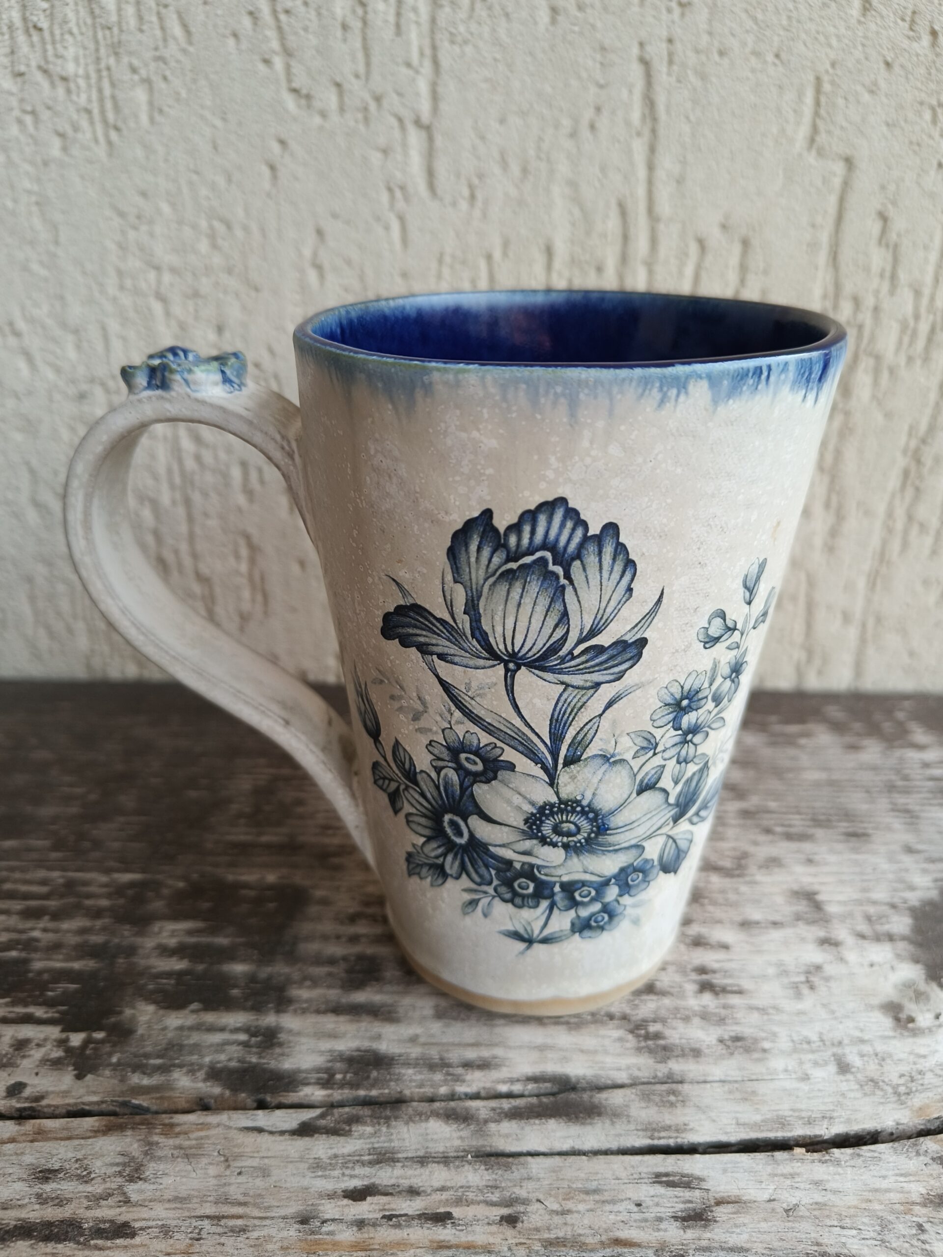 Seest tumesinine ja pealt valge suur tass, mille külgedel on sinised lillepildid. Tass mahutab 475 ml. Läbimõõt ülevalt 9,5 cm ja alt 6,5 cm. Kõrgus 13 cm. Pealt mati, seest läikiva glasuuriga. Võib pesta nõudepesumasinas. Komplekti sobivad alustaldrikud leiab SIIT. Kõrgkuumus käsitöökeraamika. 🧐 Tassid on pealtvaates pisut lapergused.