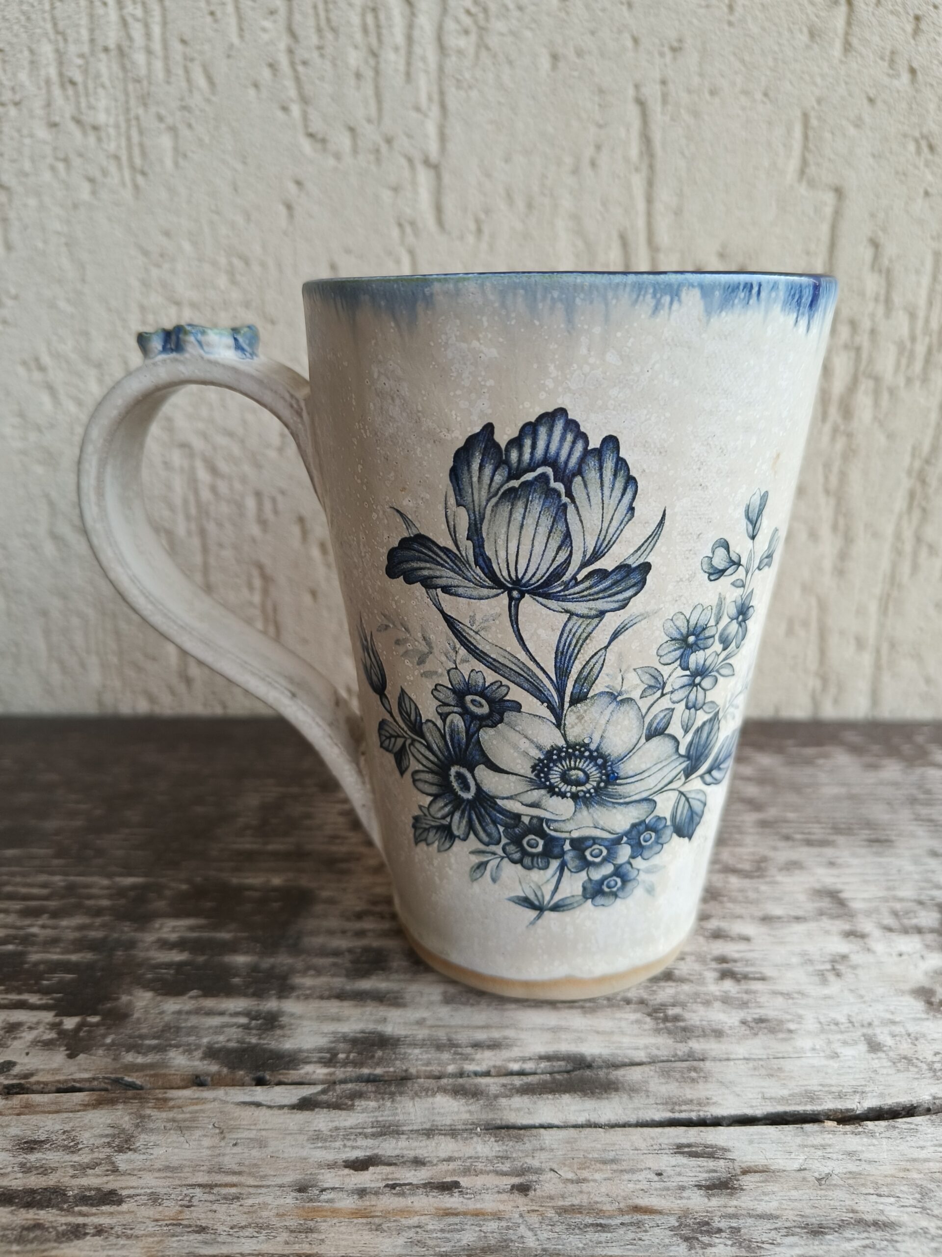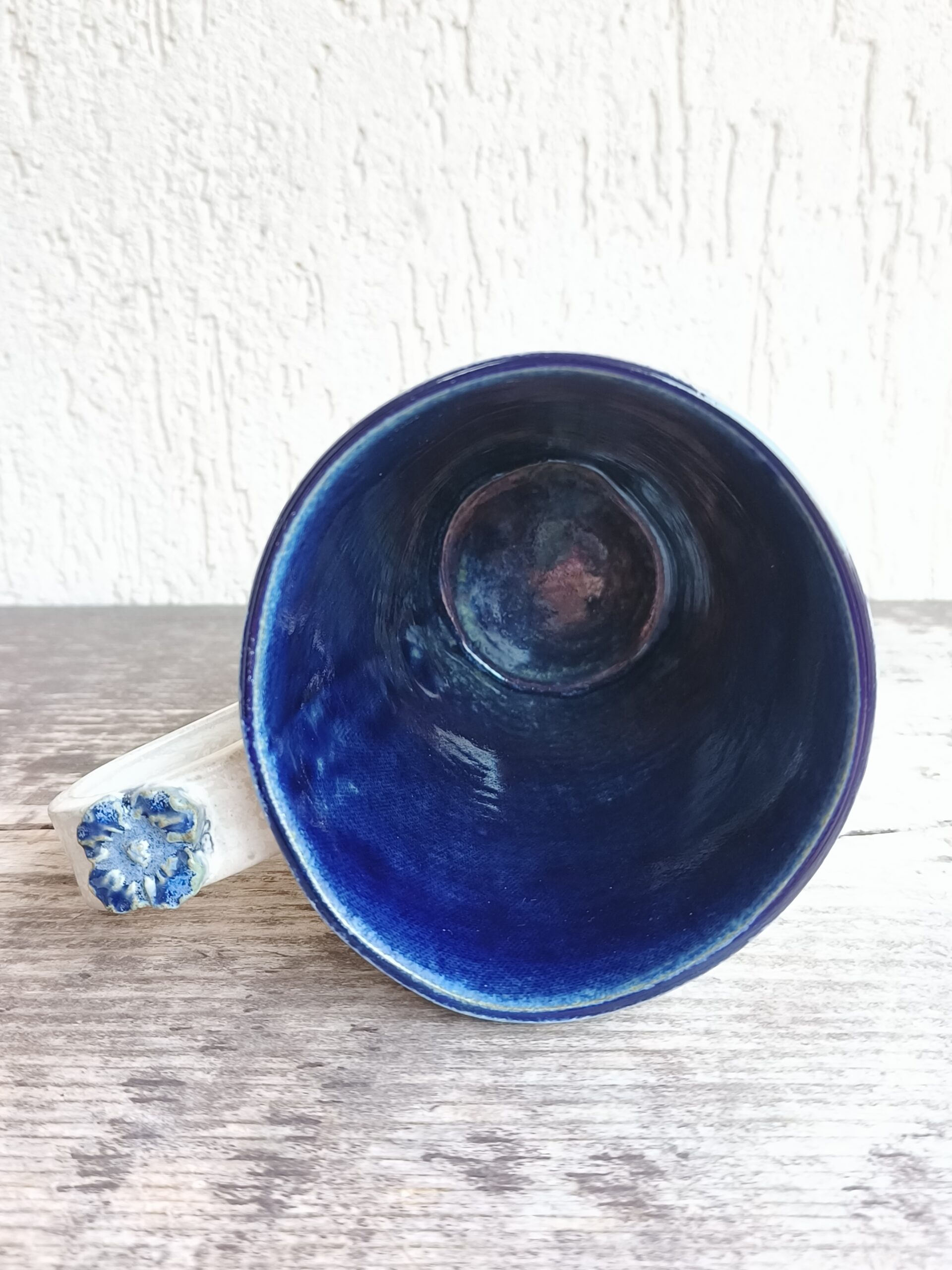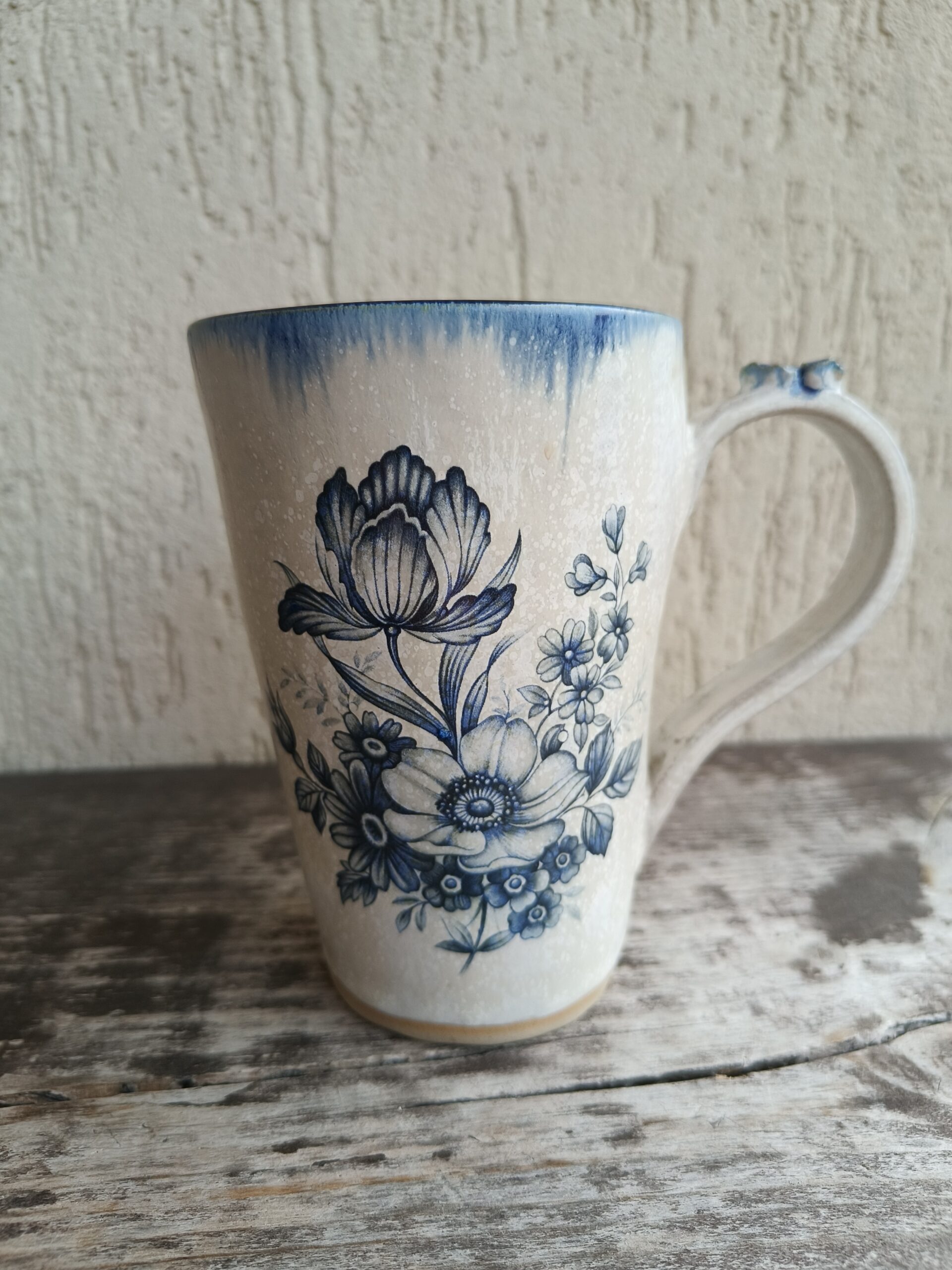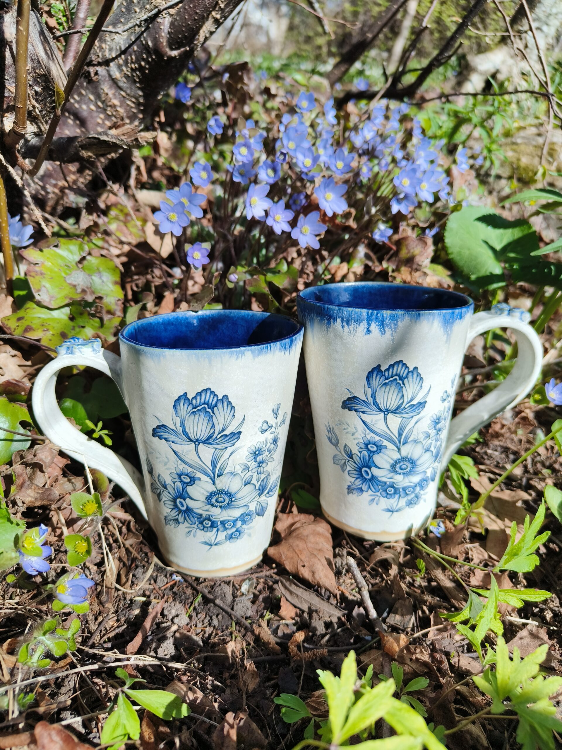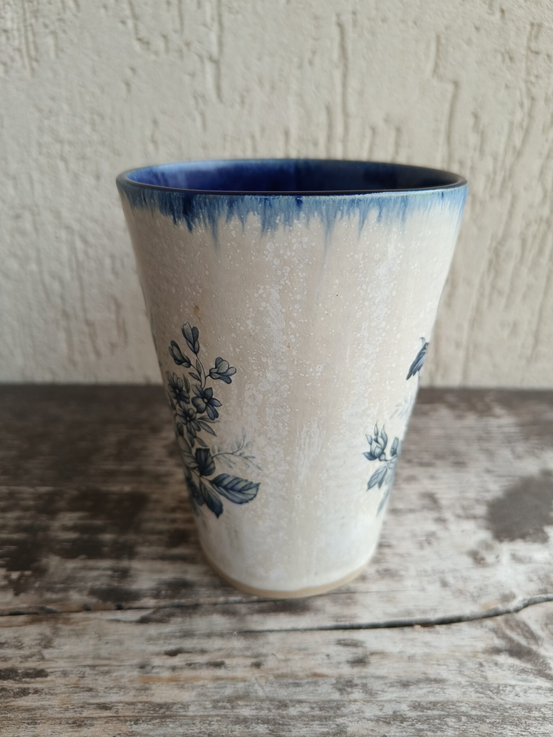 Seest tumesinine ja pealt valge suur tass, mille külgedel on sinised lillepildid. Tass mahutab 475 ml. Läbimõõt ülevalt 9,5 cm ja alt 6,5 cm. Kõrgus 13 cm. Pealt mati, seest läikiva glasuuriga. Võib pesta nõudepesumasinas. Komplekti sobivad alustaldrikud leiab SIIT. Kõrgkuumus käsitöökeraamika. 🧐 Tassid on pealtvaates pisut lapergused.