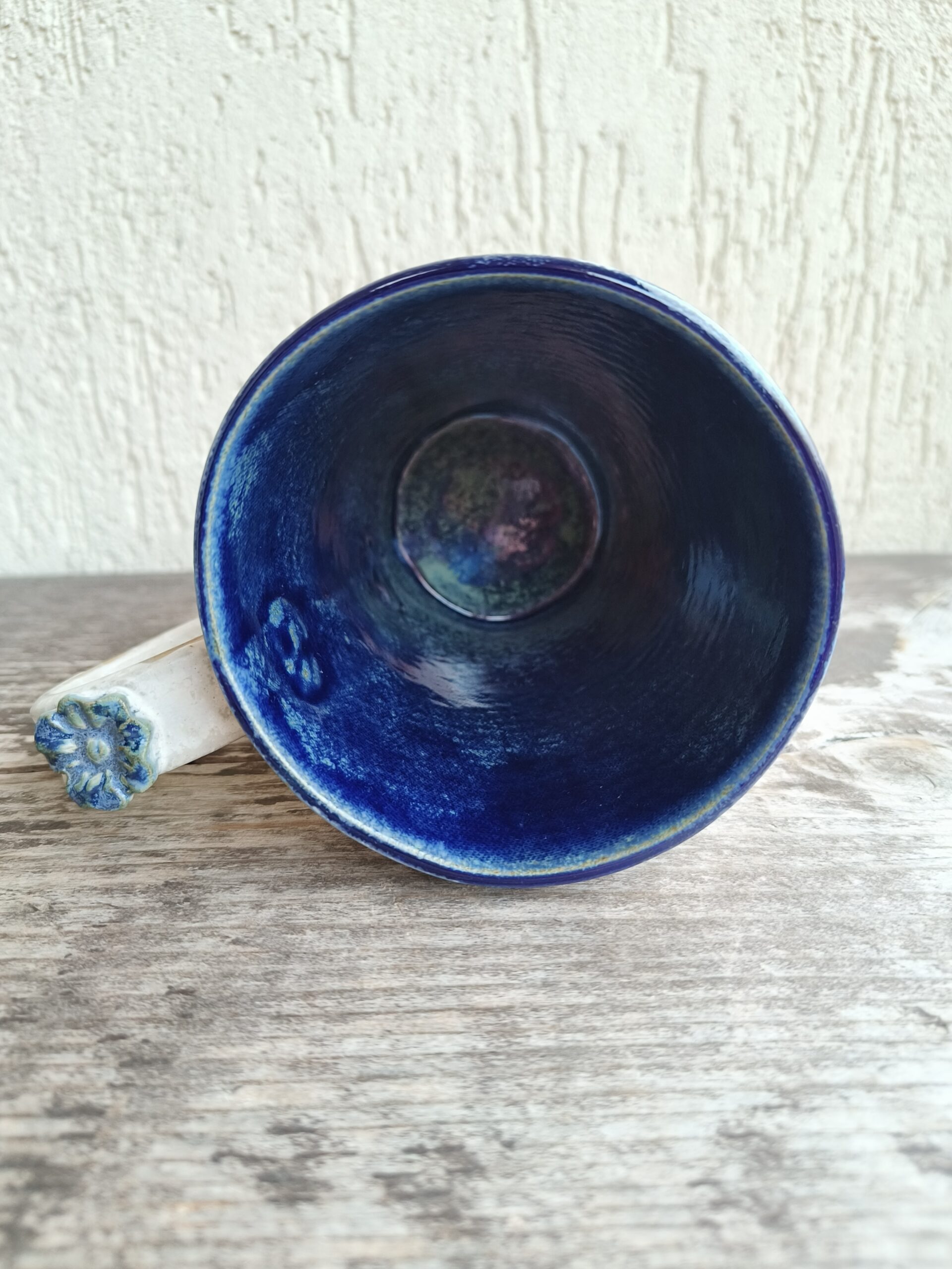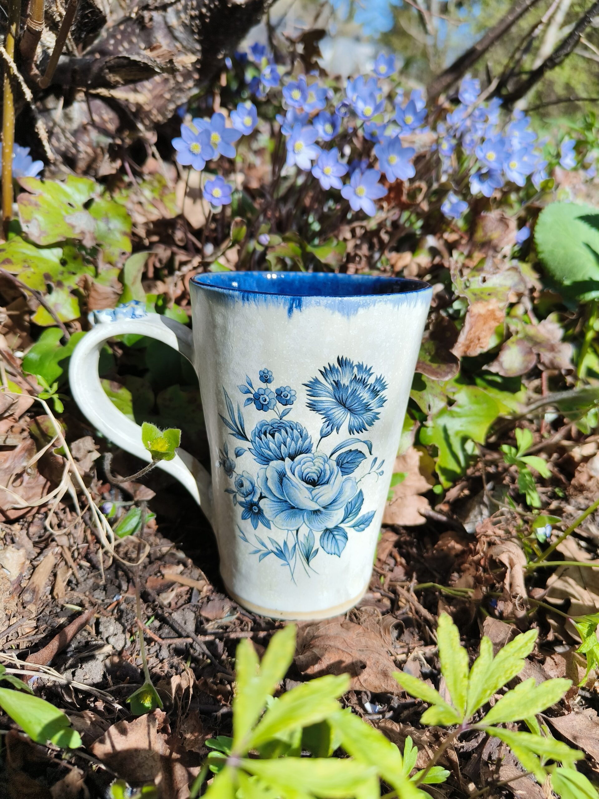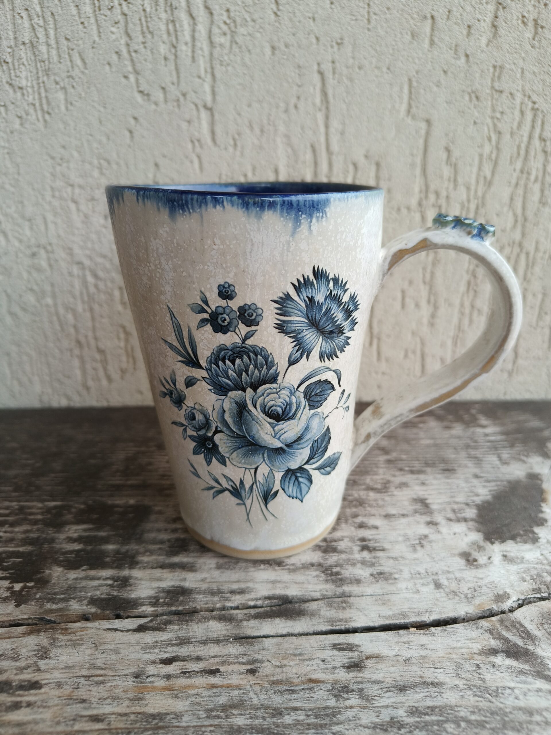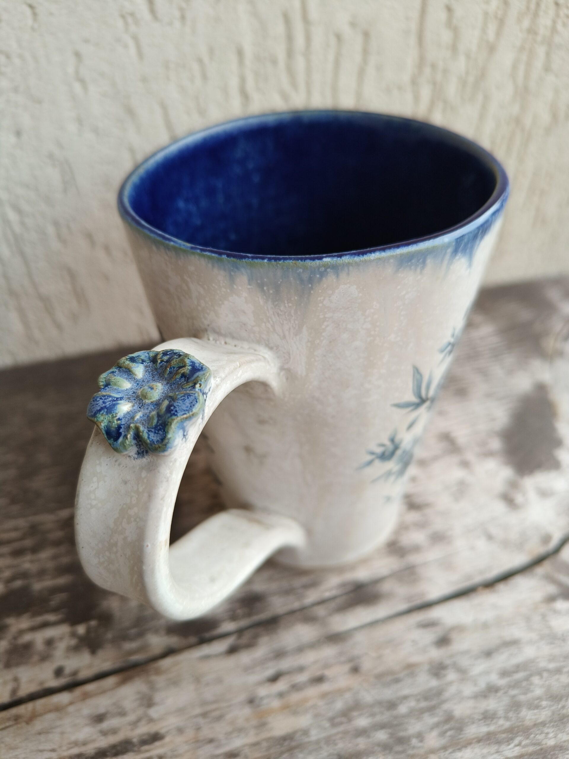Seest tumesinine ja pealt valge suur tass, mille külgedel on sinised lillepildid. Tass mahutab 480 ml. Läbimõõt ülevalt 9,5 cm ja alt 6,5 cm. Kõrgus 13 cm. Pealt mati, seest läikiva glasuuriga. Võib pesta nõudepesumasinas. Komplekti sobivad alustaldrikud leiab SIIT. Kõrgkuumus käsitöökeraamika.