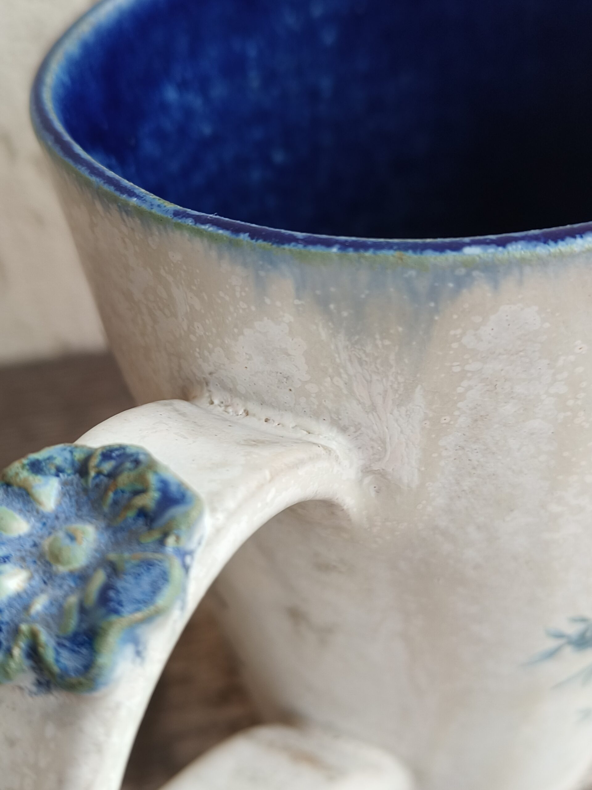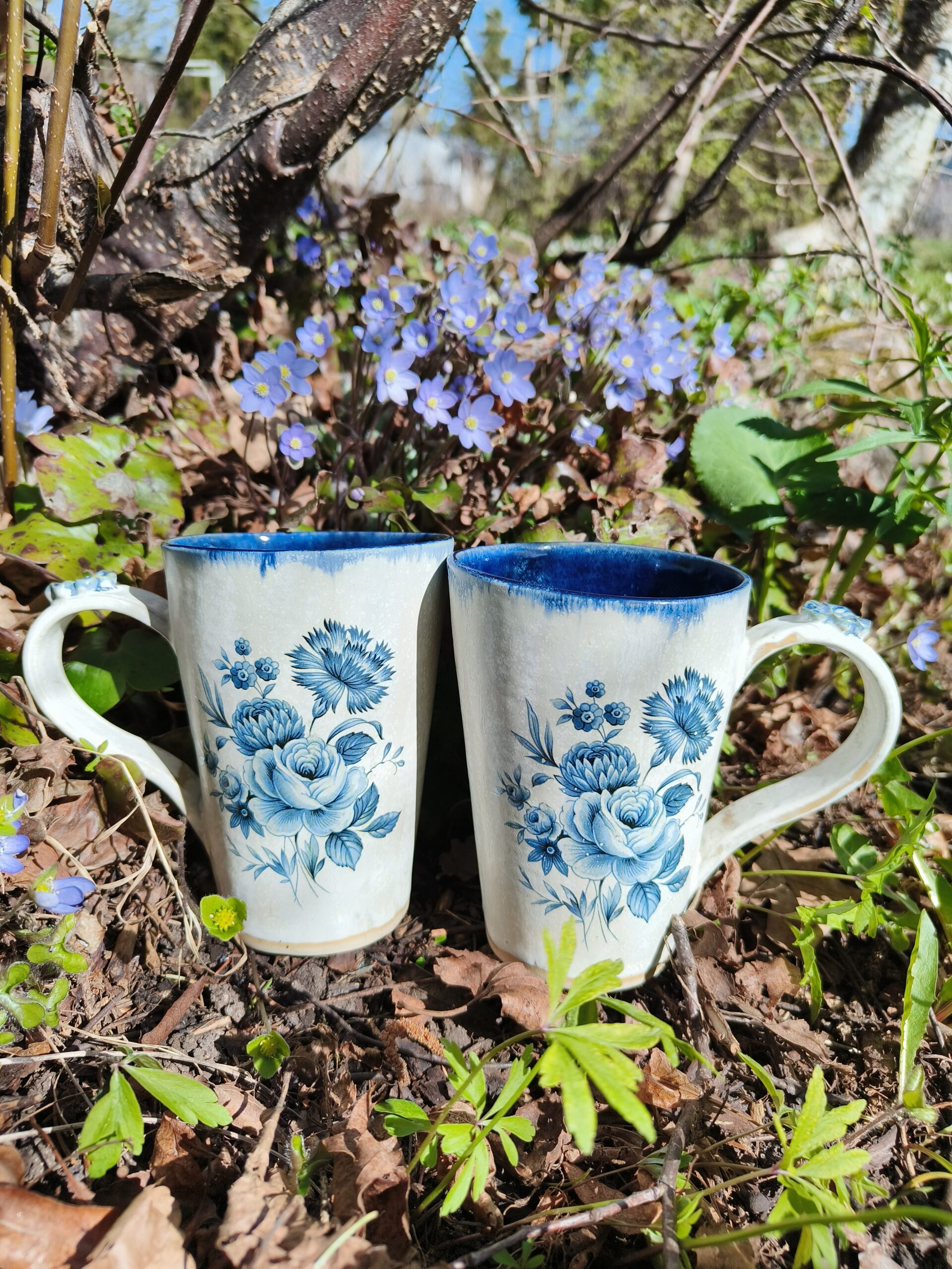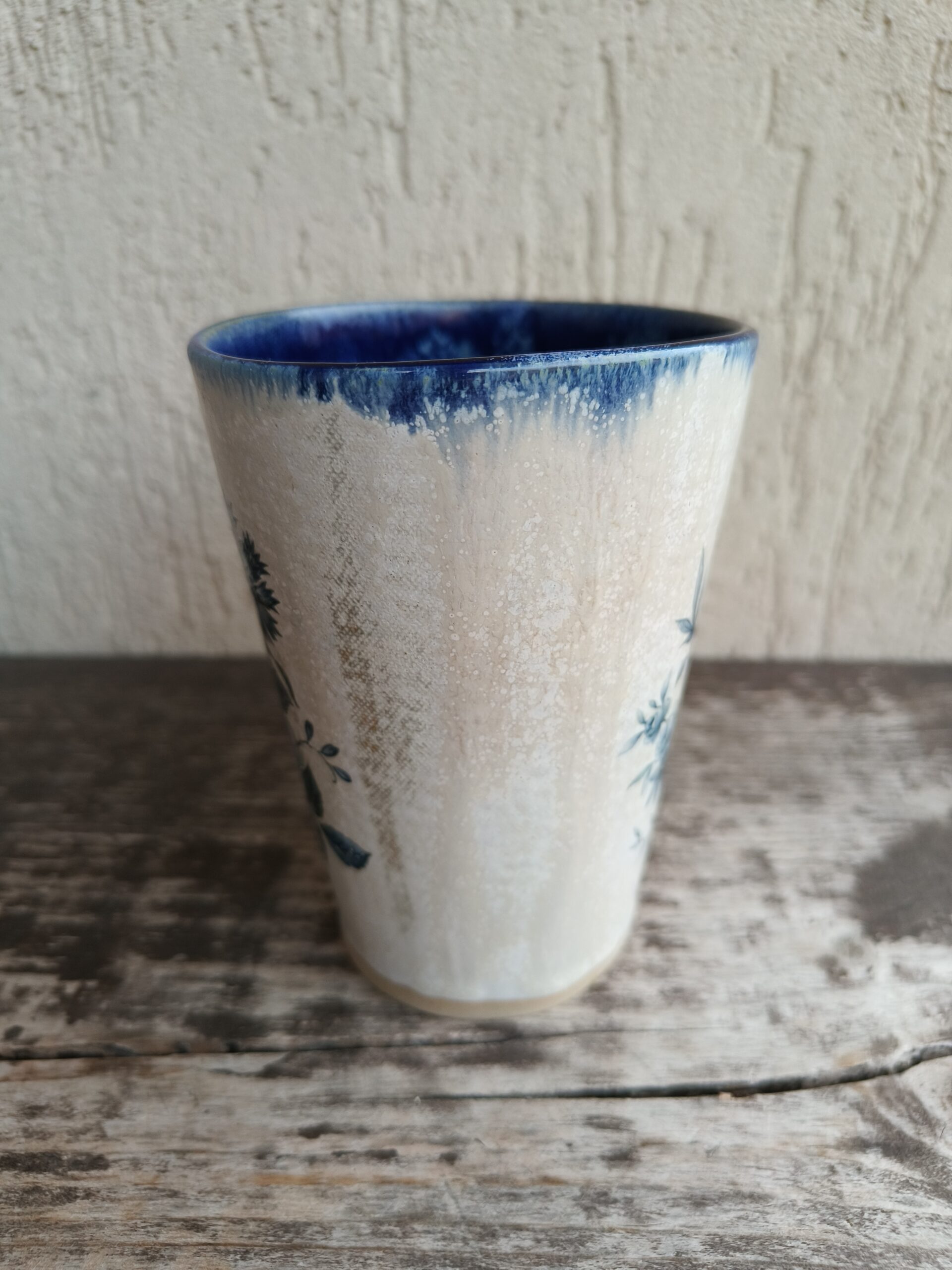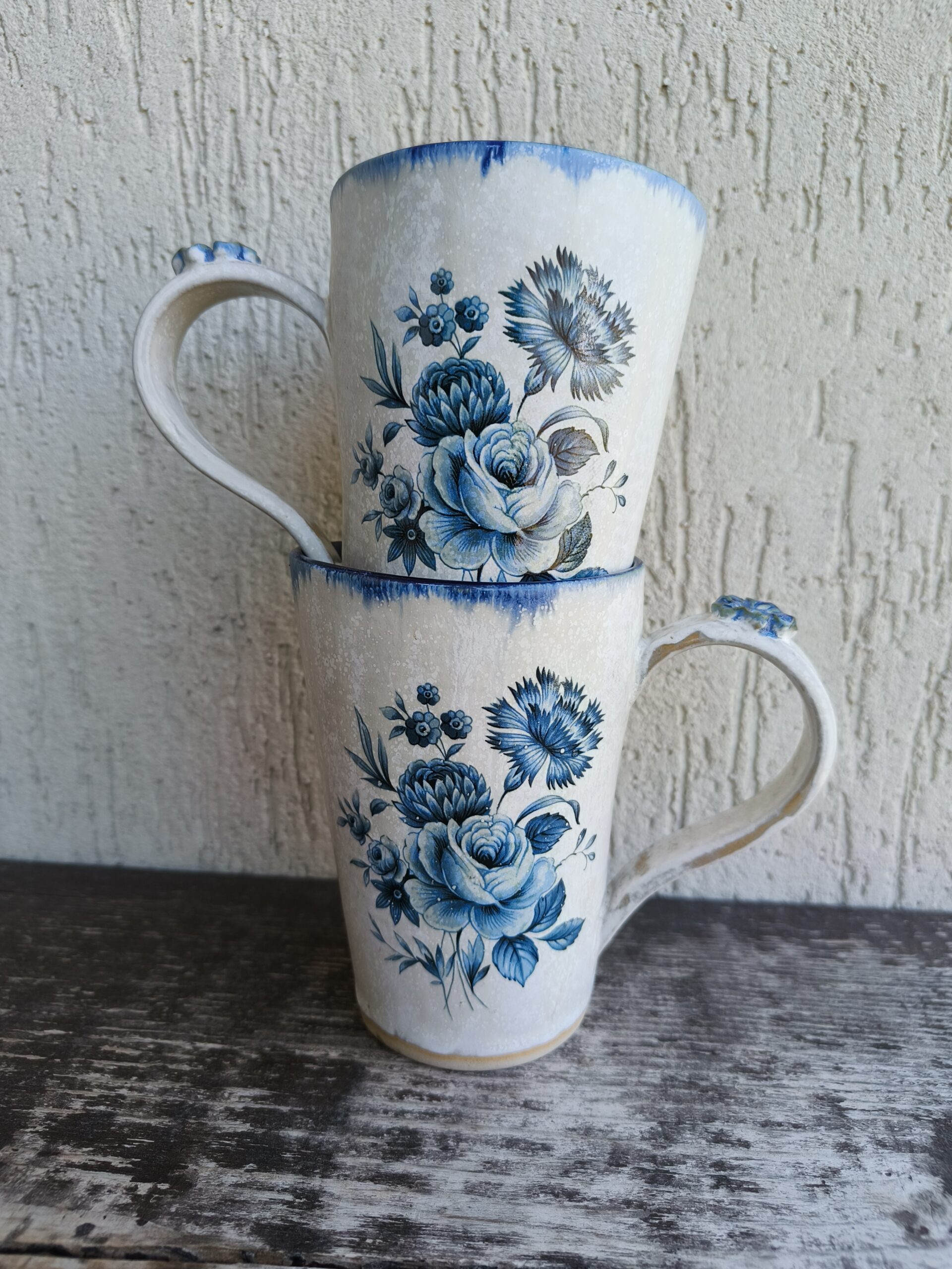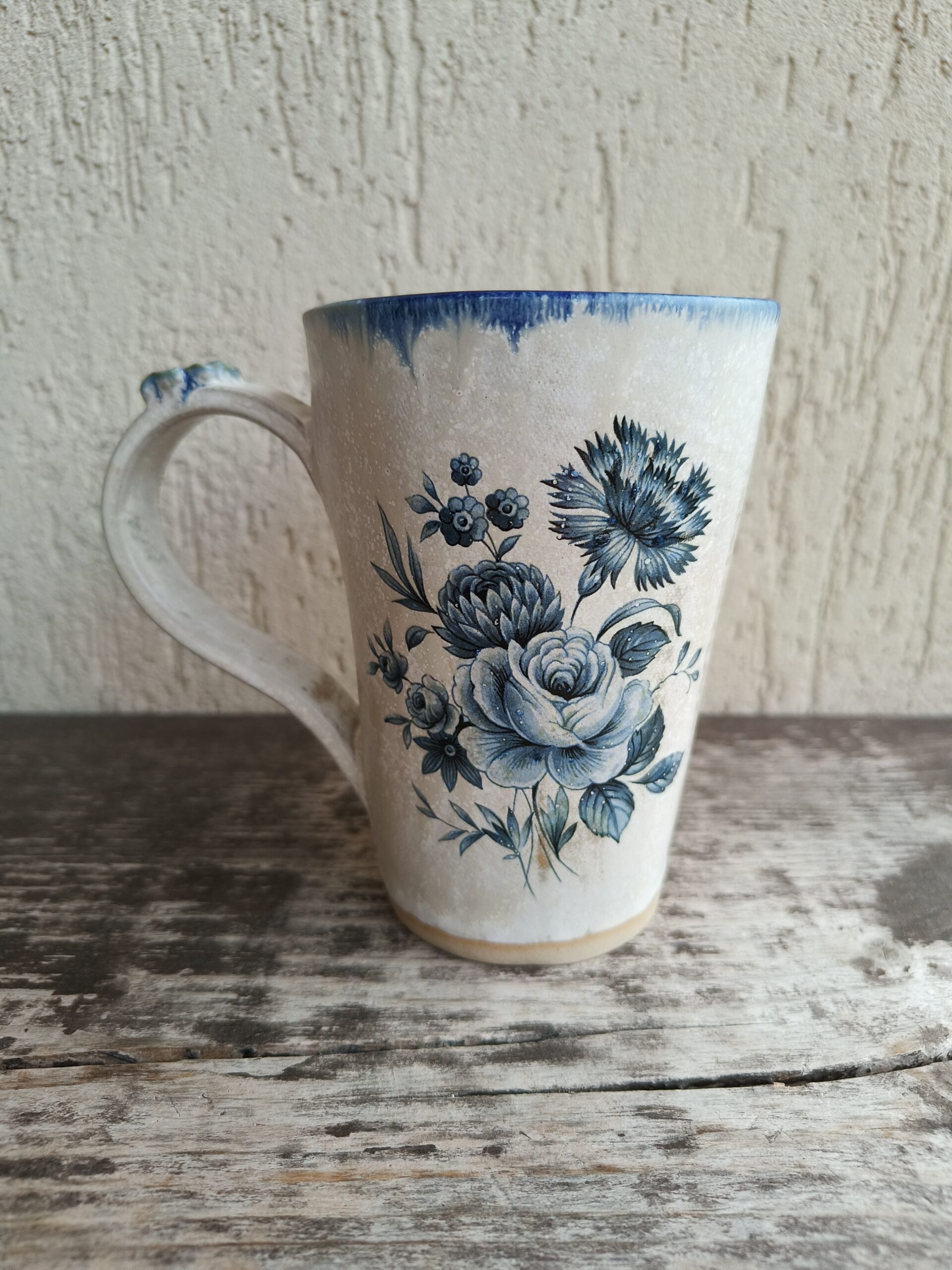 Seest tumesinine ja pealt valge suur tass, mille külgedel on sinised lillepildid. Tass mahutab 480 ml. Läbimõõt ülevalt 9,5 cm ja alt 6,5 cm. Kõrgus 13 cm. Pealt mati, seest läikiva glasuuriga. Võib pesta nõudepesumasinas. Komplekti sobivad alustaldrikud leiab SIIT. Kõrgkuumus käsitöökeraamika.