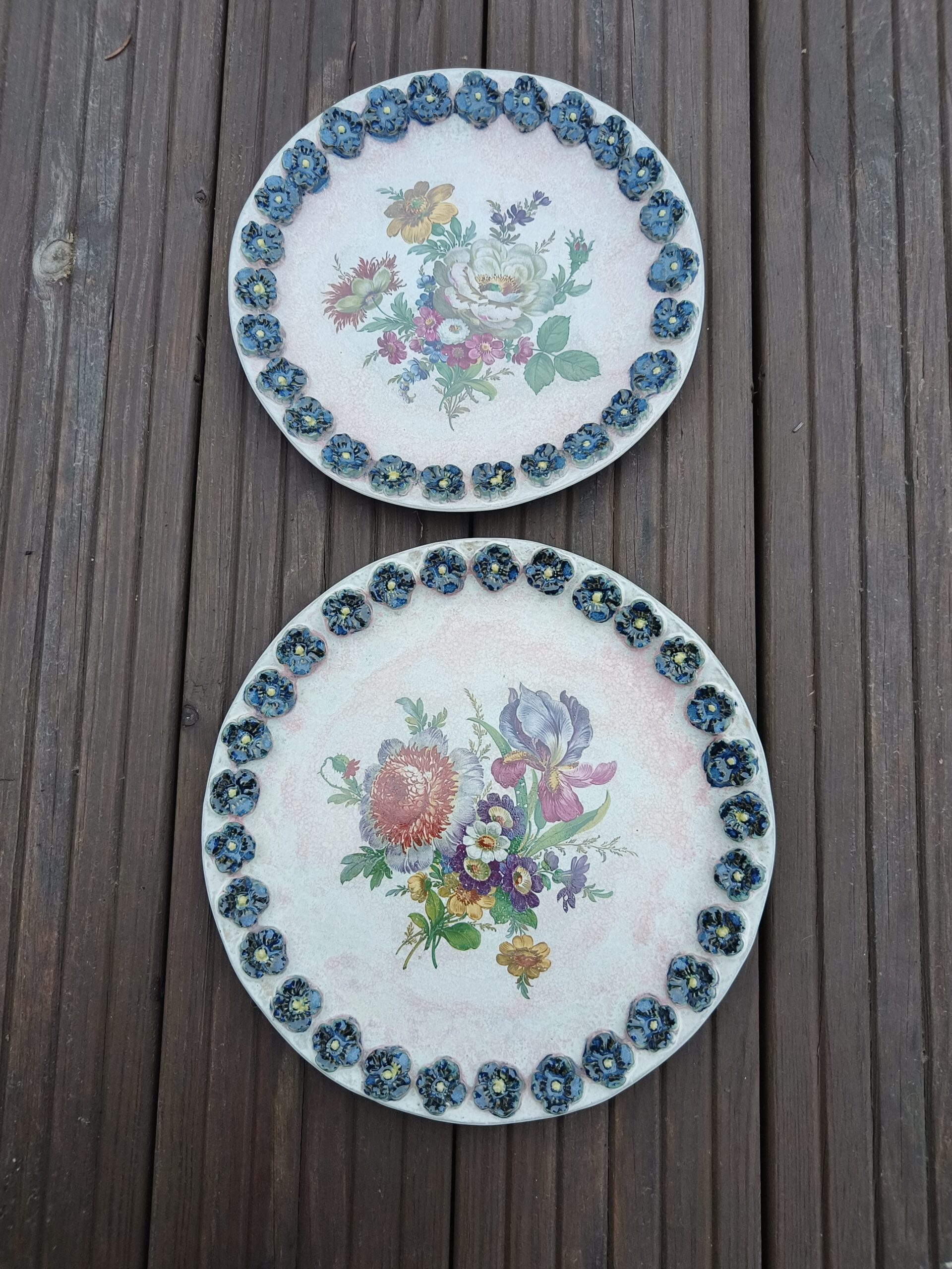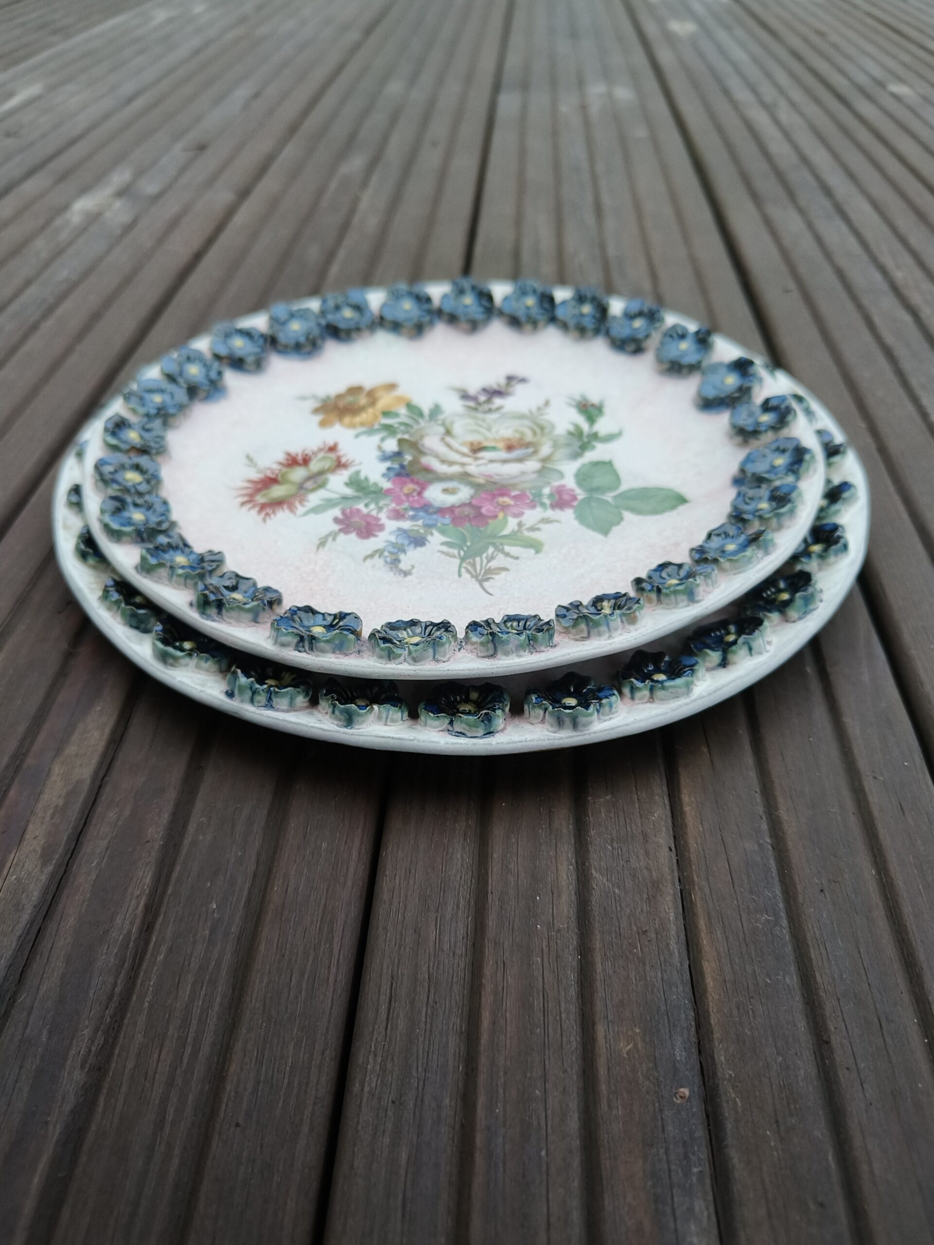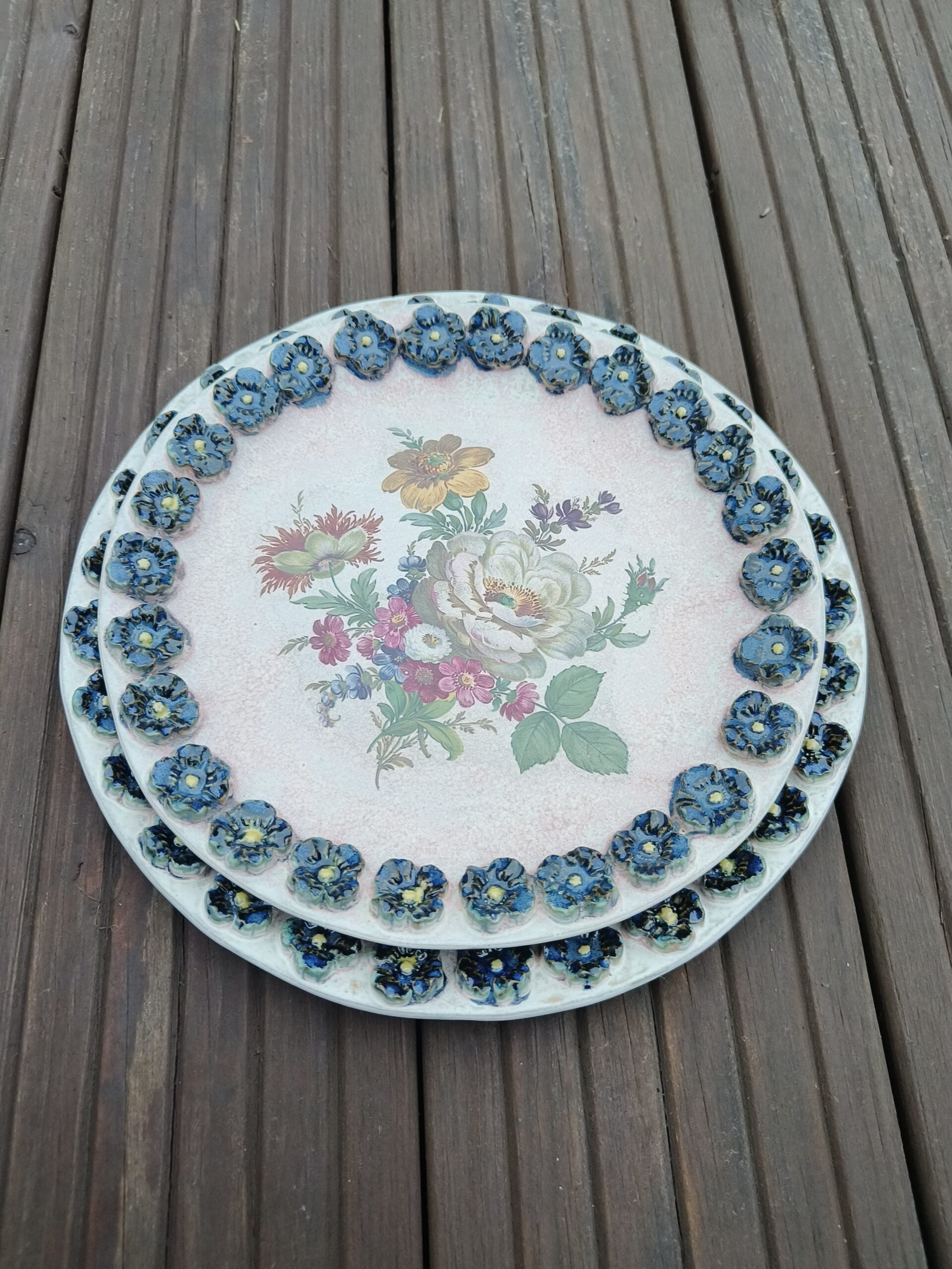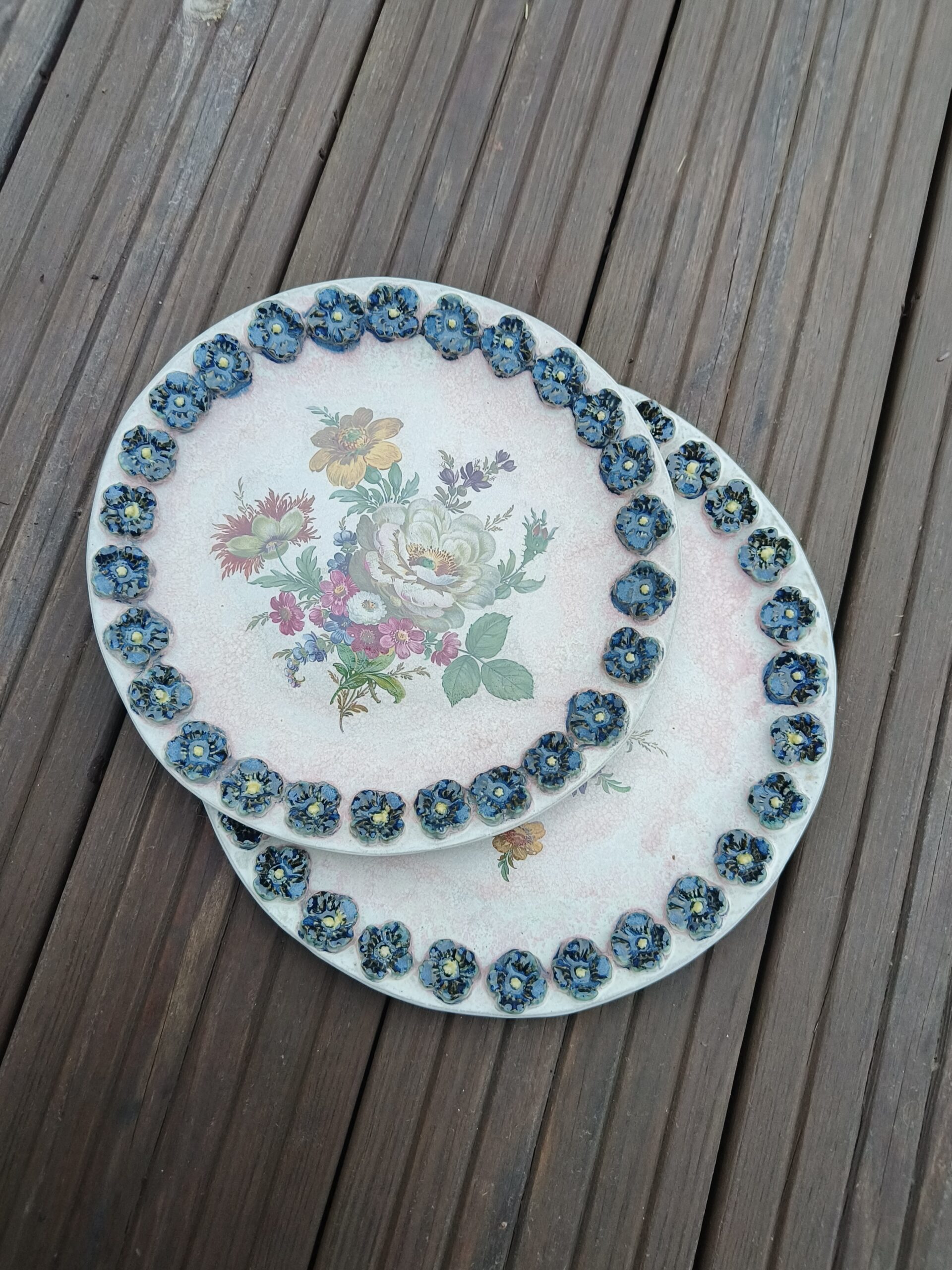 Kõrgkuumus käsitöökeraamika. Kahes mõõdus suured taldrikud /serveerimisvaagnad, mille välisääres on reljeefsetest tumesinistest lilledest pärg ja keskel lopsakas lillkimbu motiiv. Mati glasuuriga. Võib pesta nõudepesumasinas. Väiksema vaagna läbimõõt 20,5 cm. Kõrgus 2 cm. Suurema vaagna läbimõõt 23 cm. Kõrgus 2 cm.
