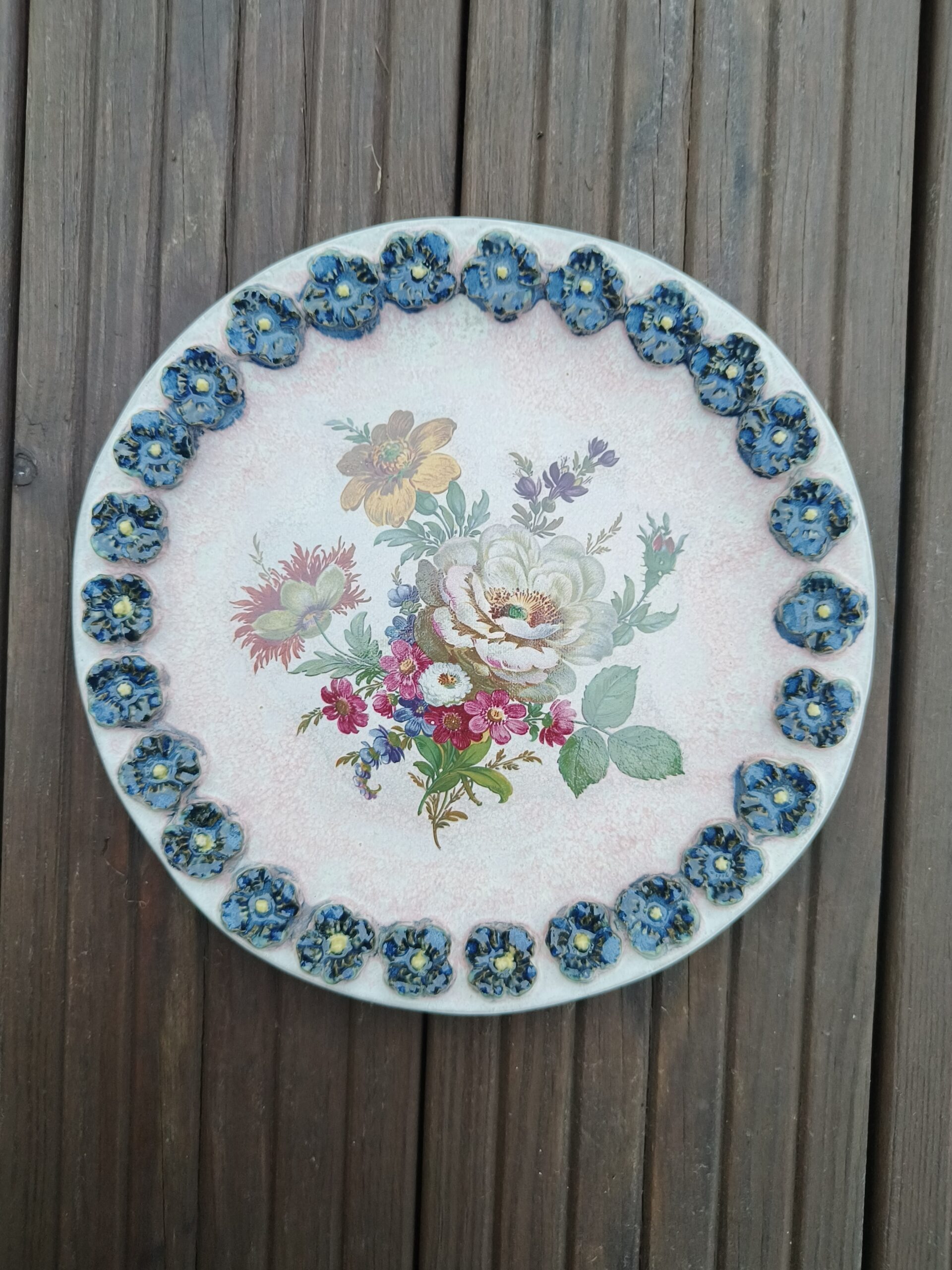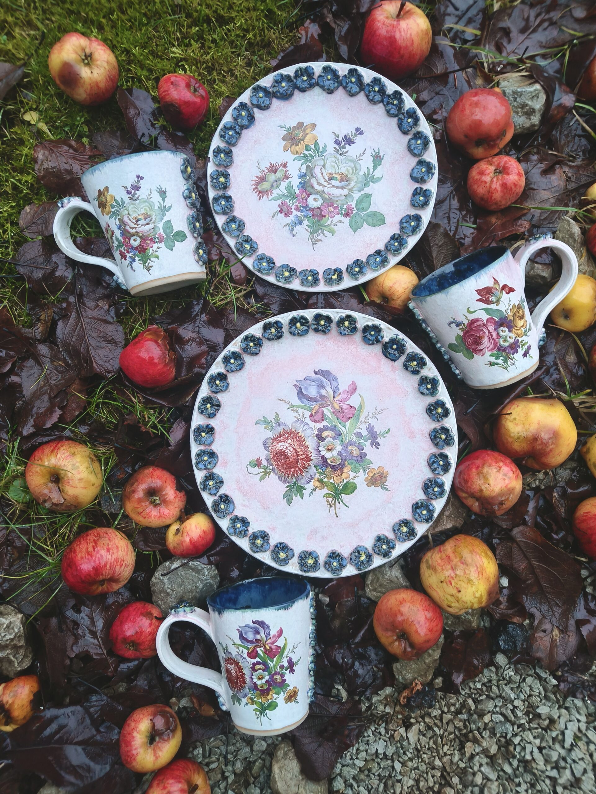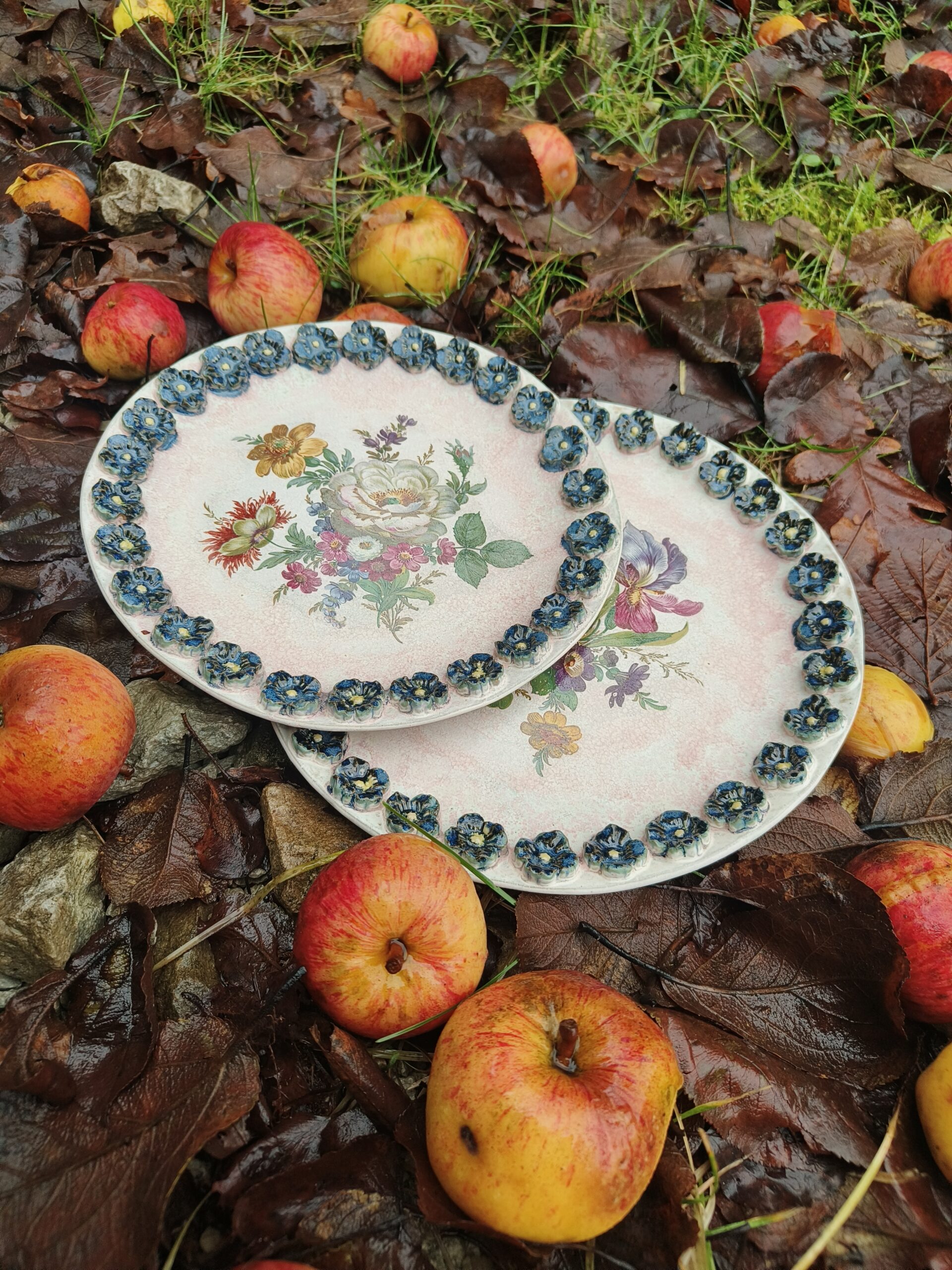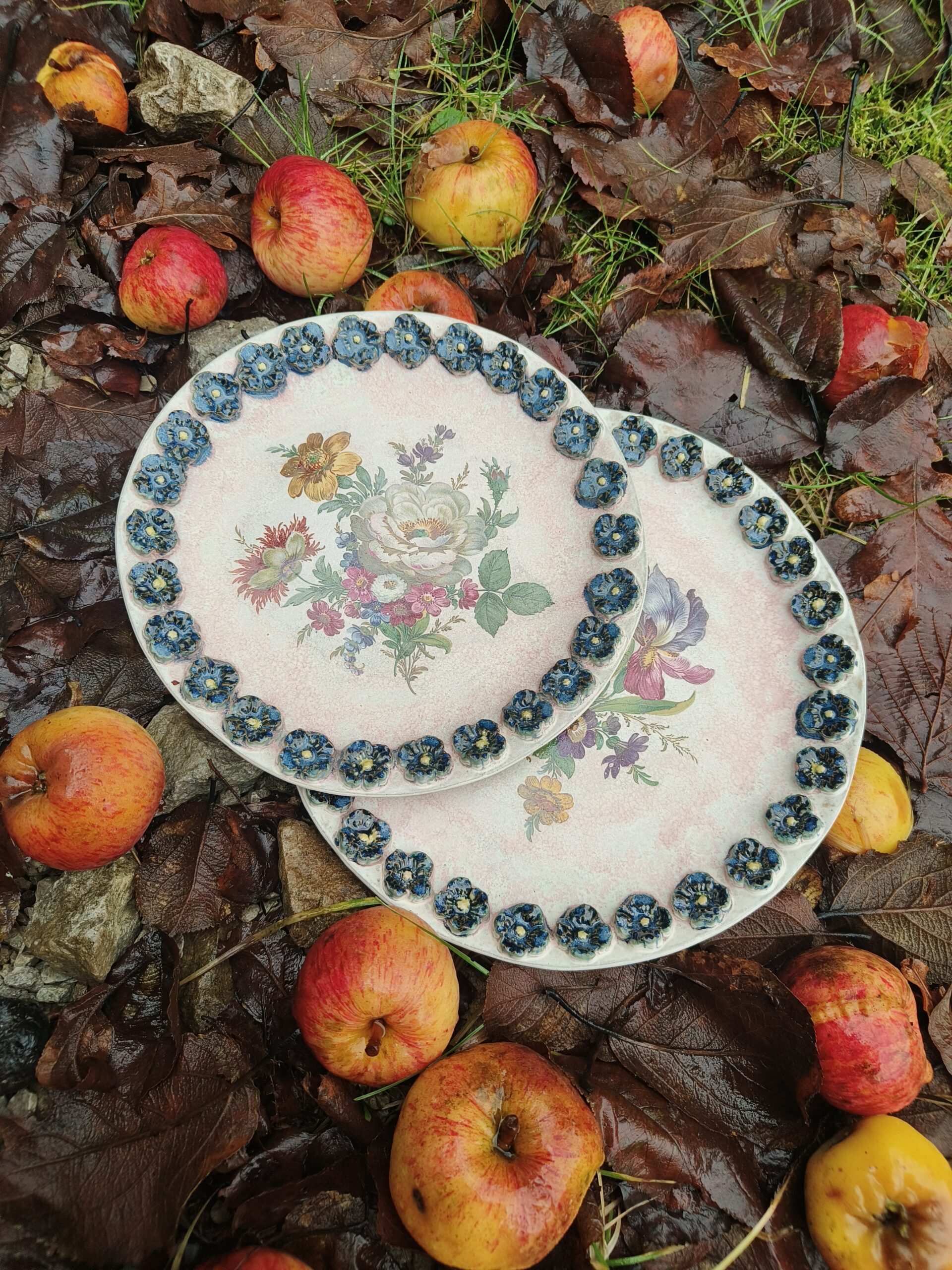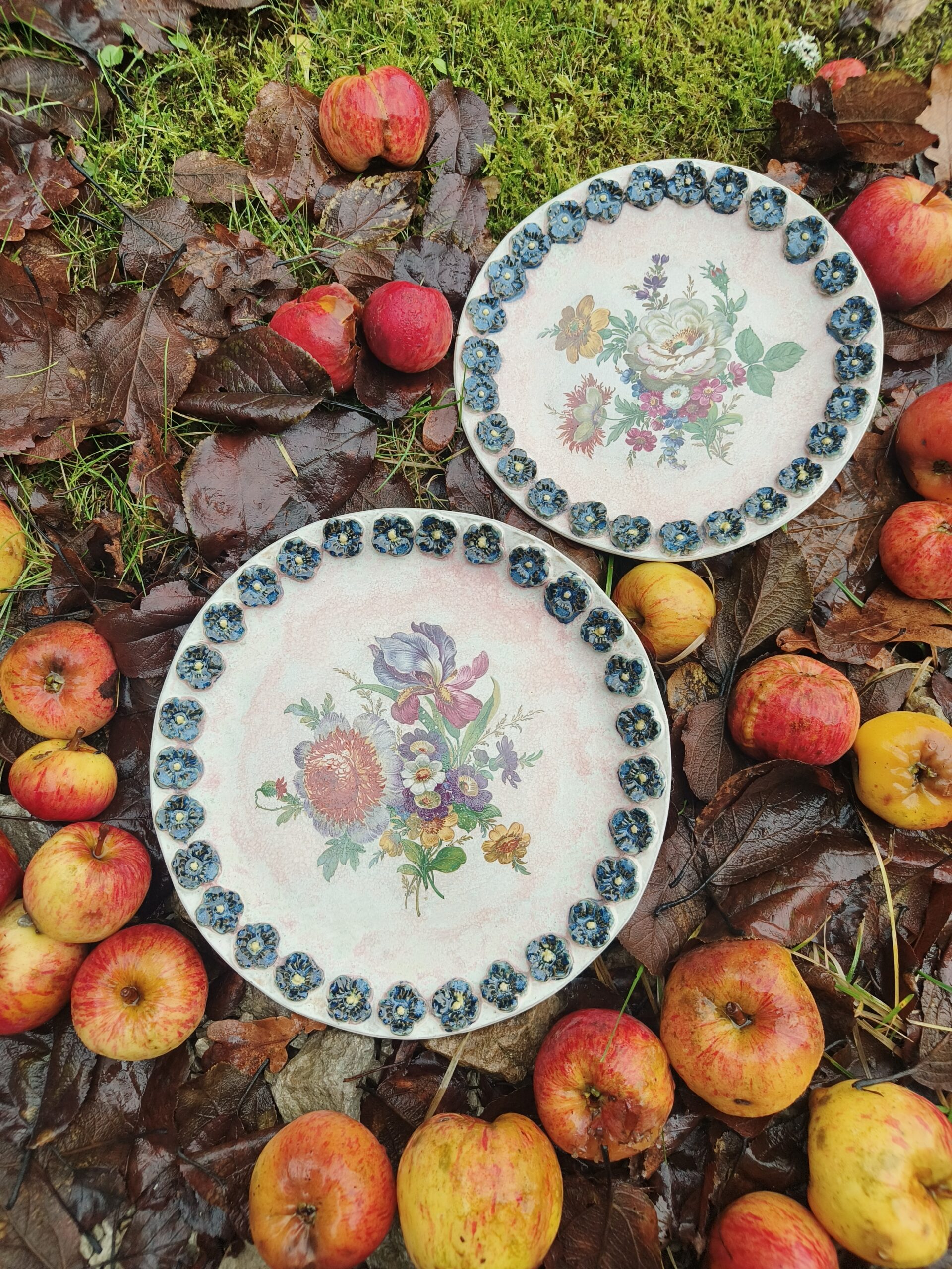 Kõrgkuumus käsitöökeraamika. Kahes mõõdus suured taldrikud /serveerimisvaagnad, mille välisääres on reljeefsetest tumesinistest lilledest pärg ja keskel lopsakas lillkimbu motiiv. Mati glasuuriga. Võib pesta nõudepesumasinas. Väiksema vaagna läbimõõt 20,5 cm. Kõrgus 2 cm. Suurema vaagna läbimõõt 23 cm. Kõrgus 2 cm.