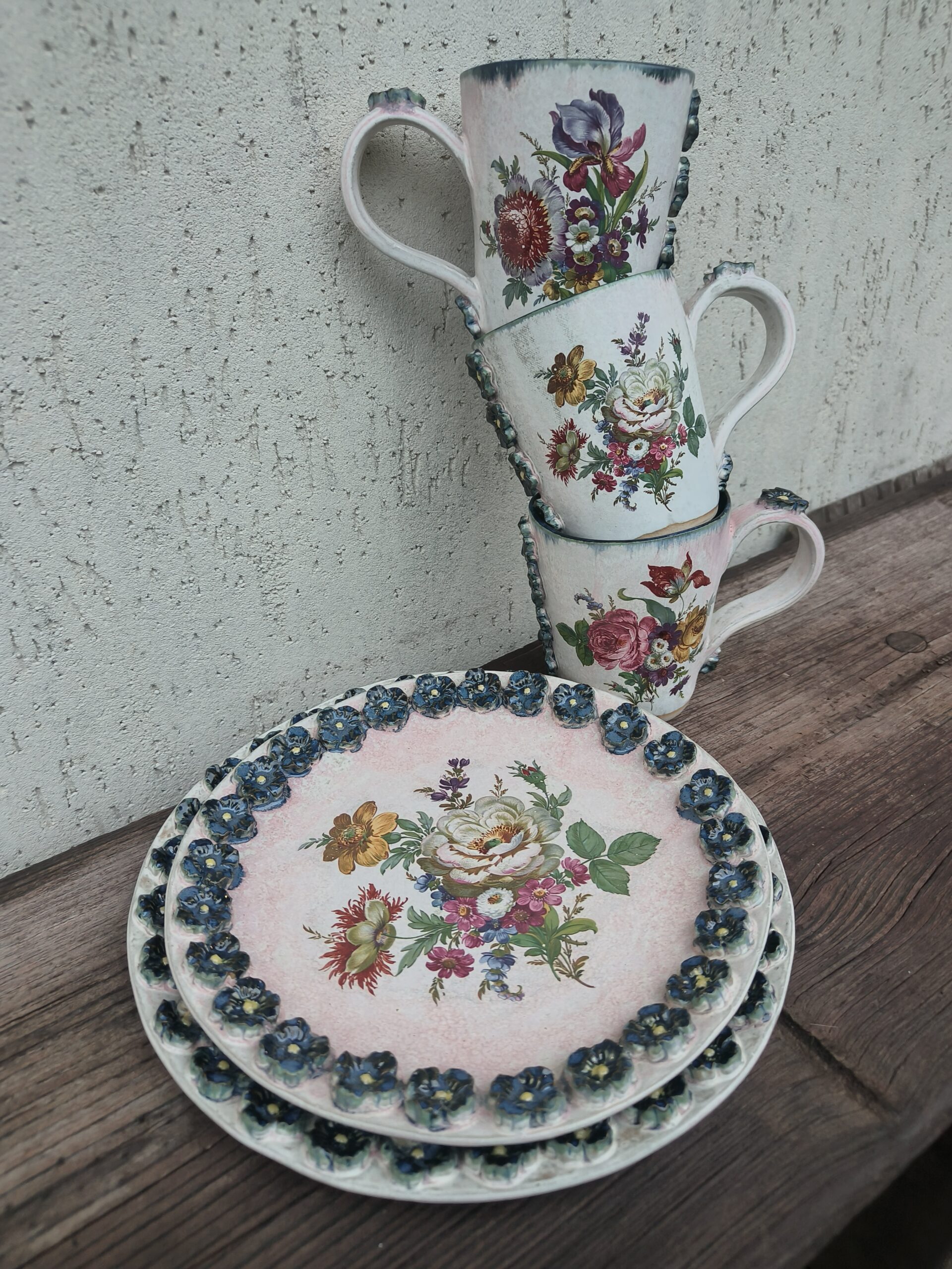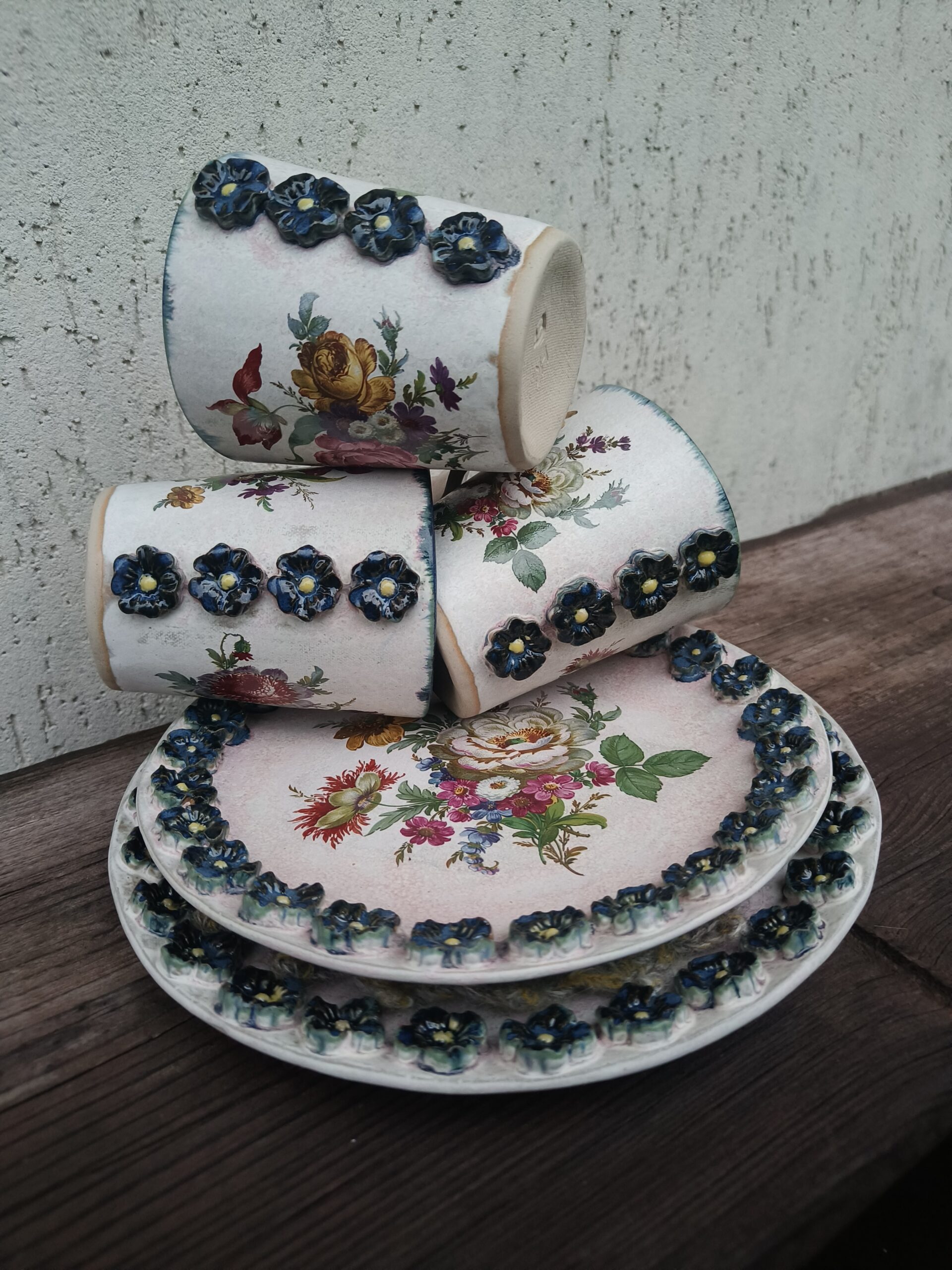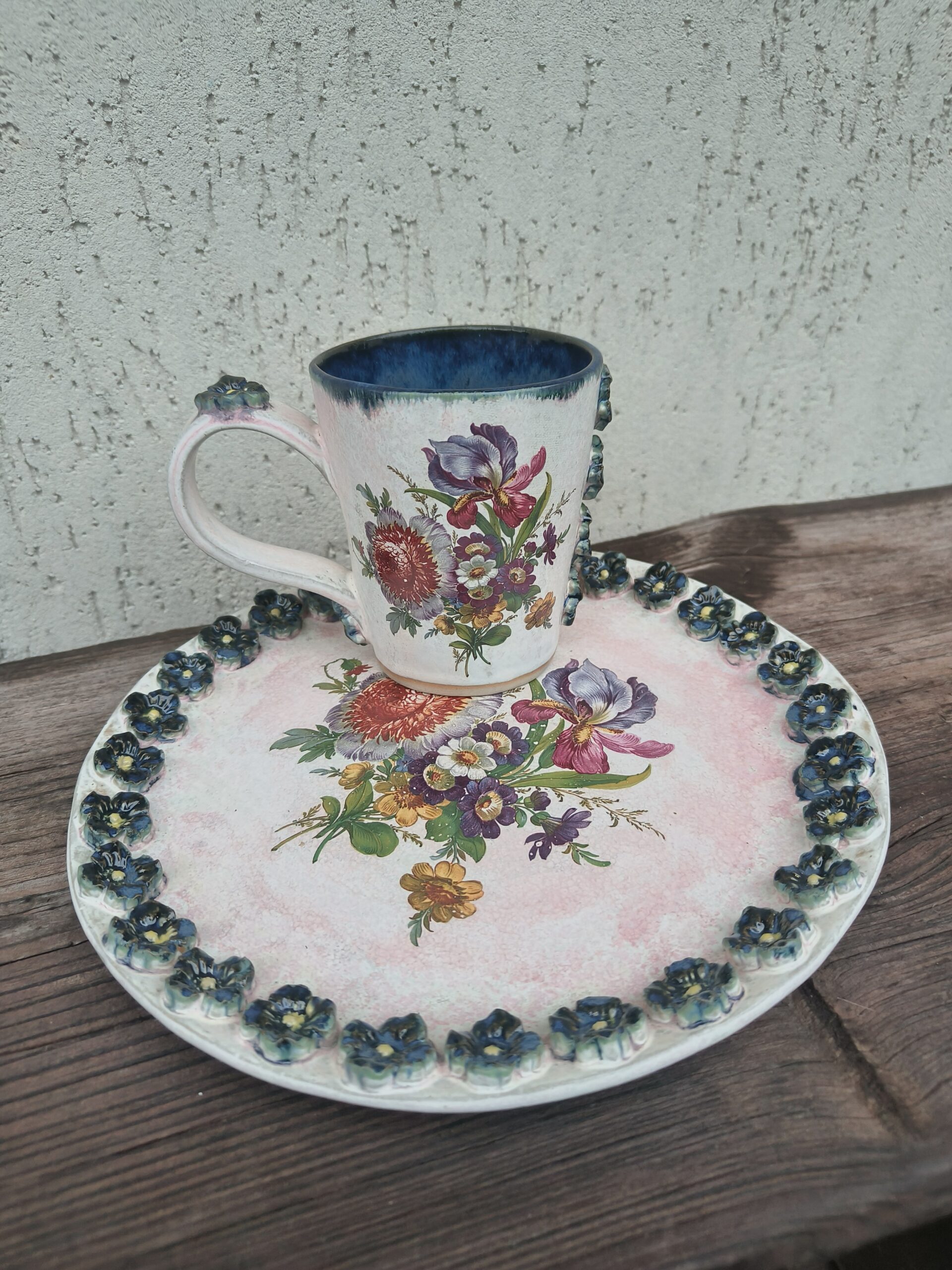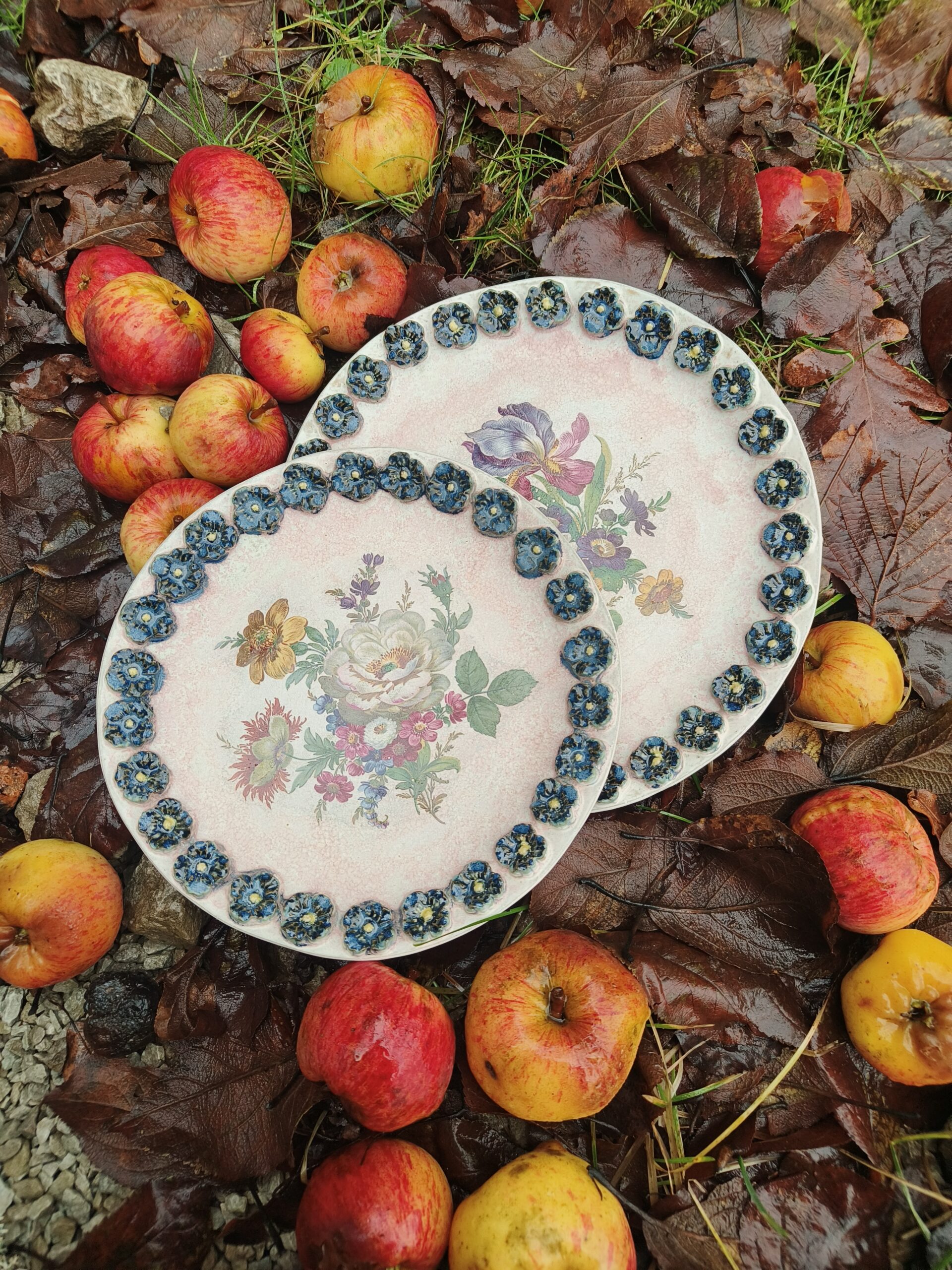 Kõrgkuumus käsitöökeraamika. Kahes mõõdus suured taldrikud /serveerimisvaagnad, mille välisääres on reljeefsetest tumesinistest lilledest pärg ja keskel lopsakas lillkimbu motiiv. Mati glasuuriga. Võib pesta nõudepesumasinas. Väiksema vaagna läbimõõt 20,5 cm. Kõrgus 2 cm. Suurema vaagna läbimõõt 23 cm. Kõrgus 2 cm.