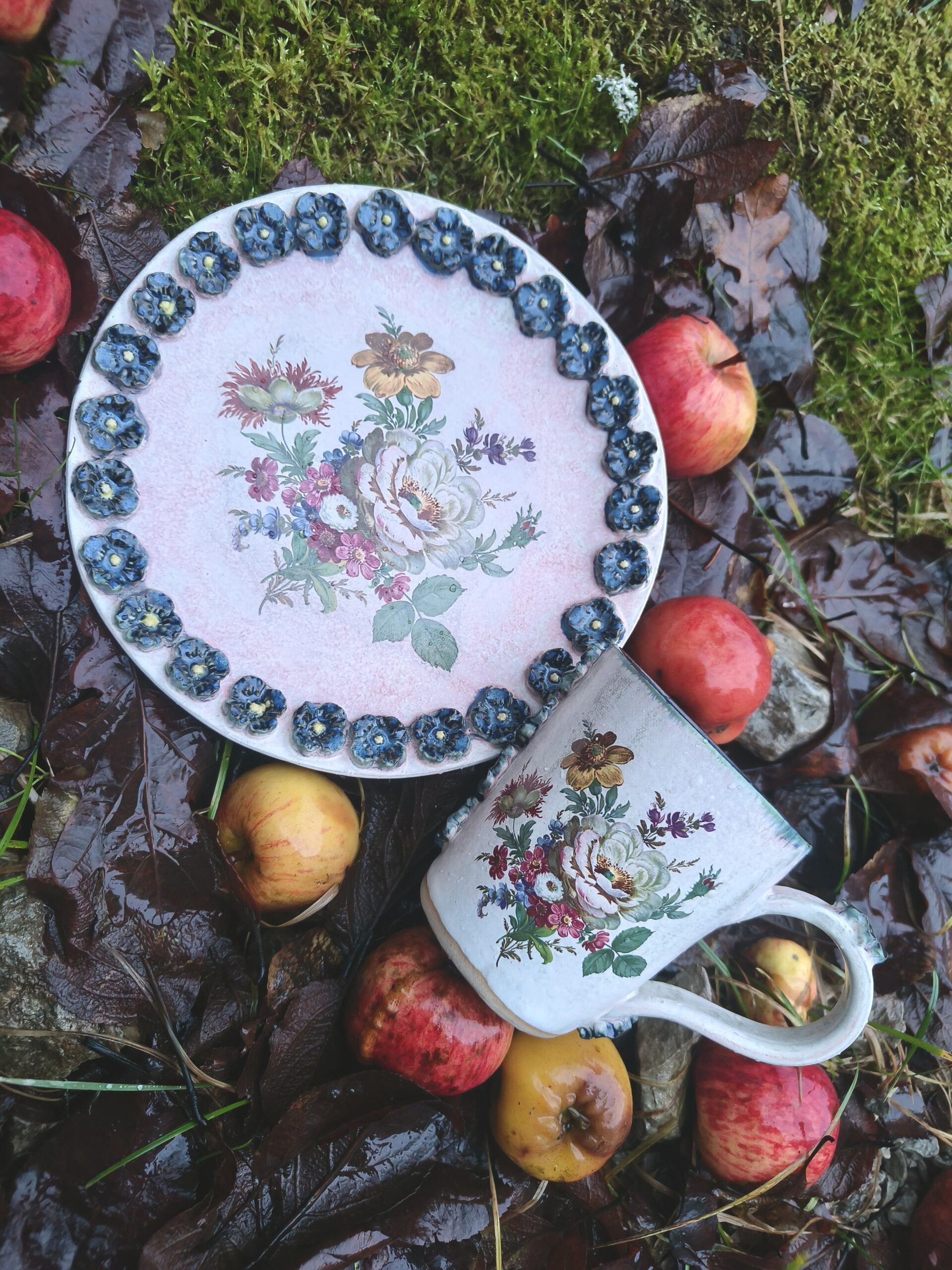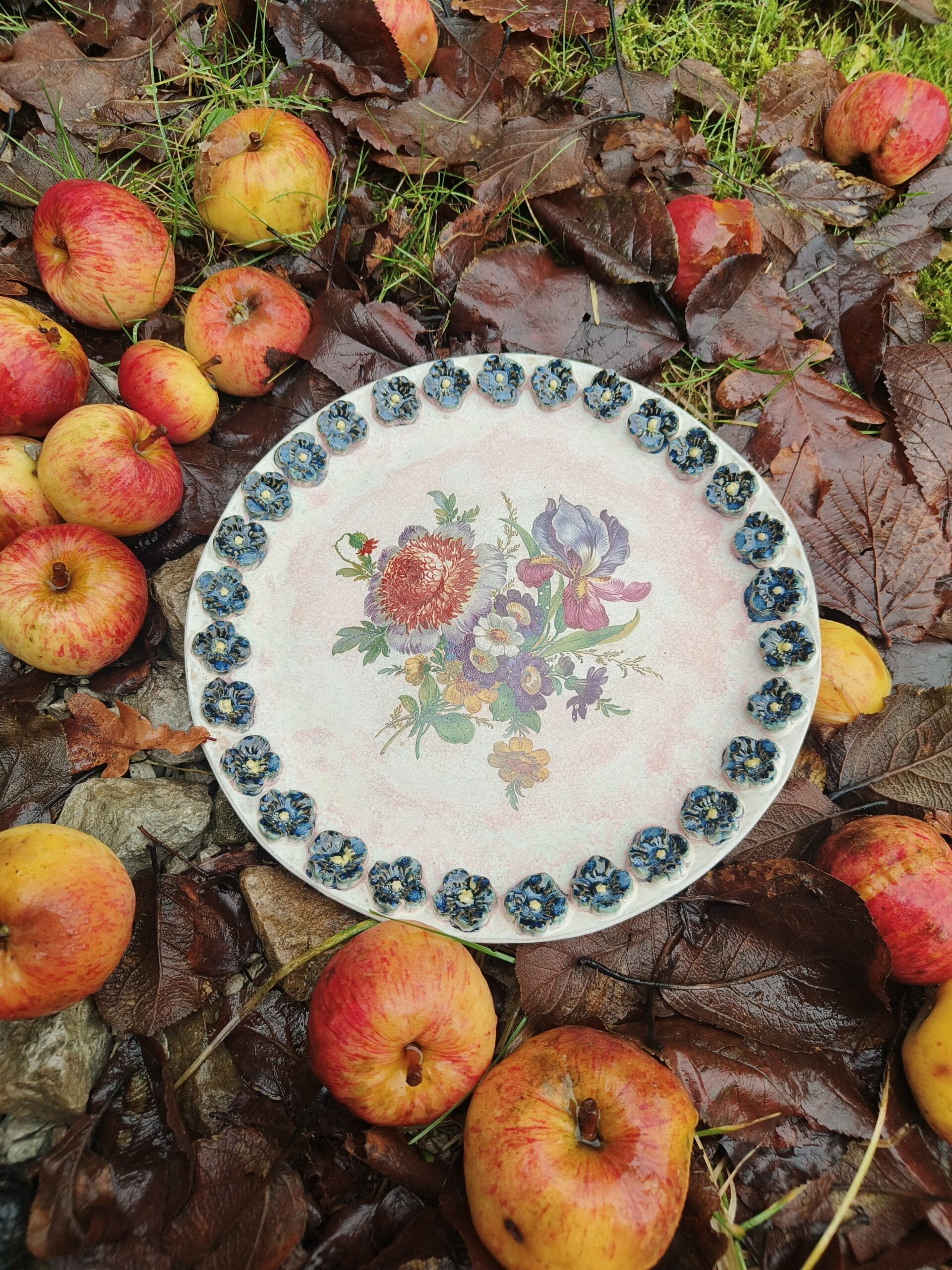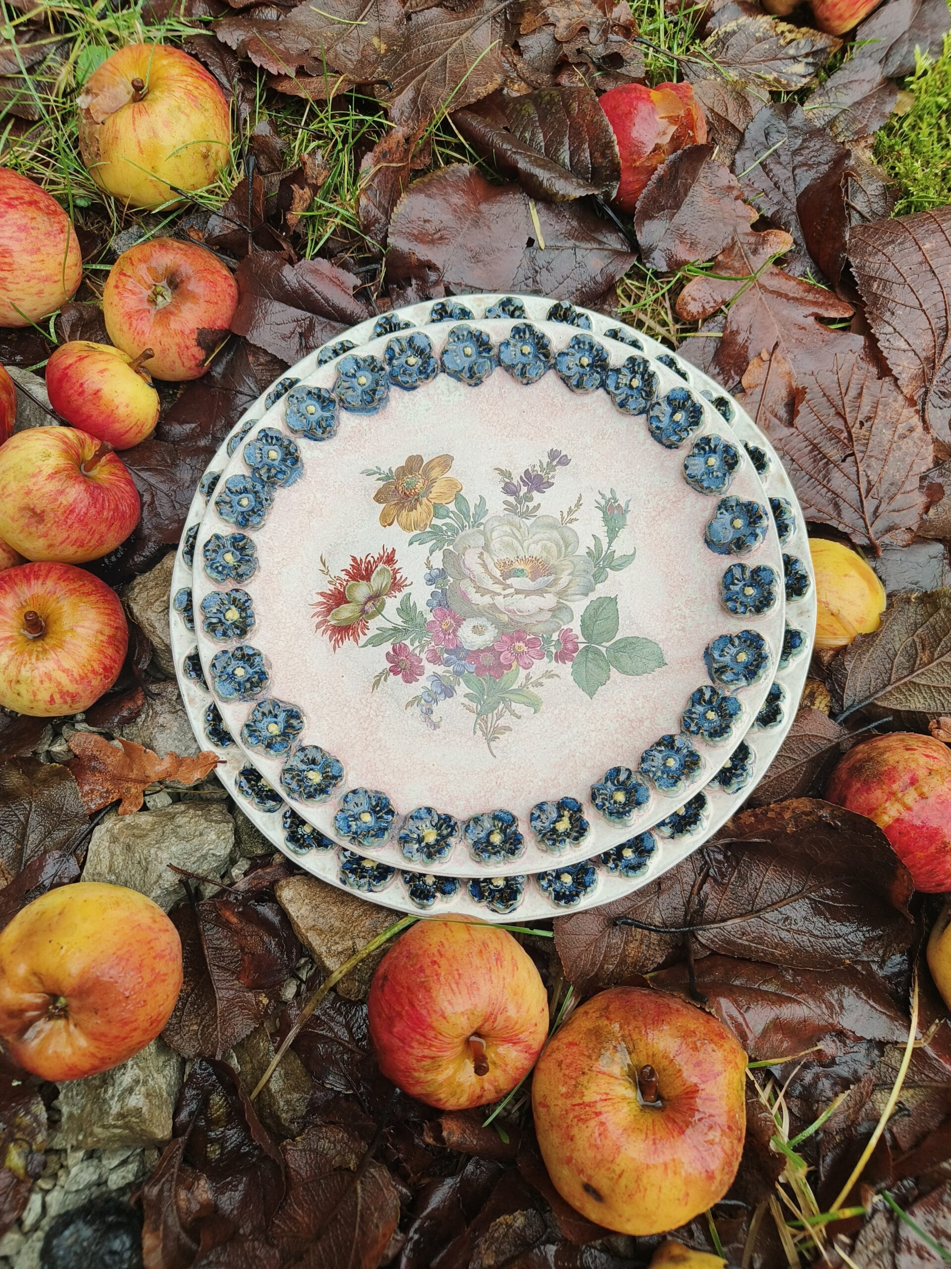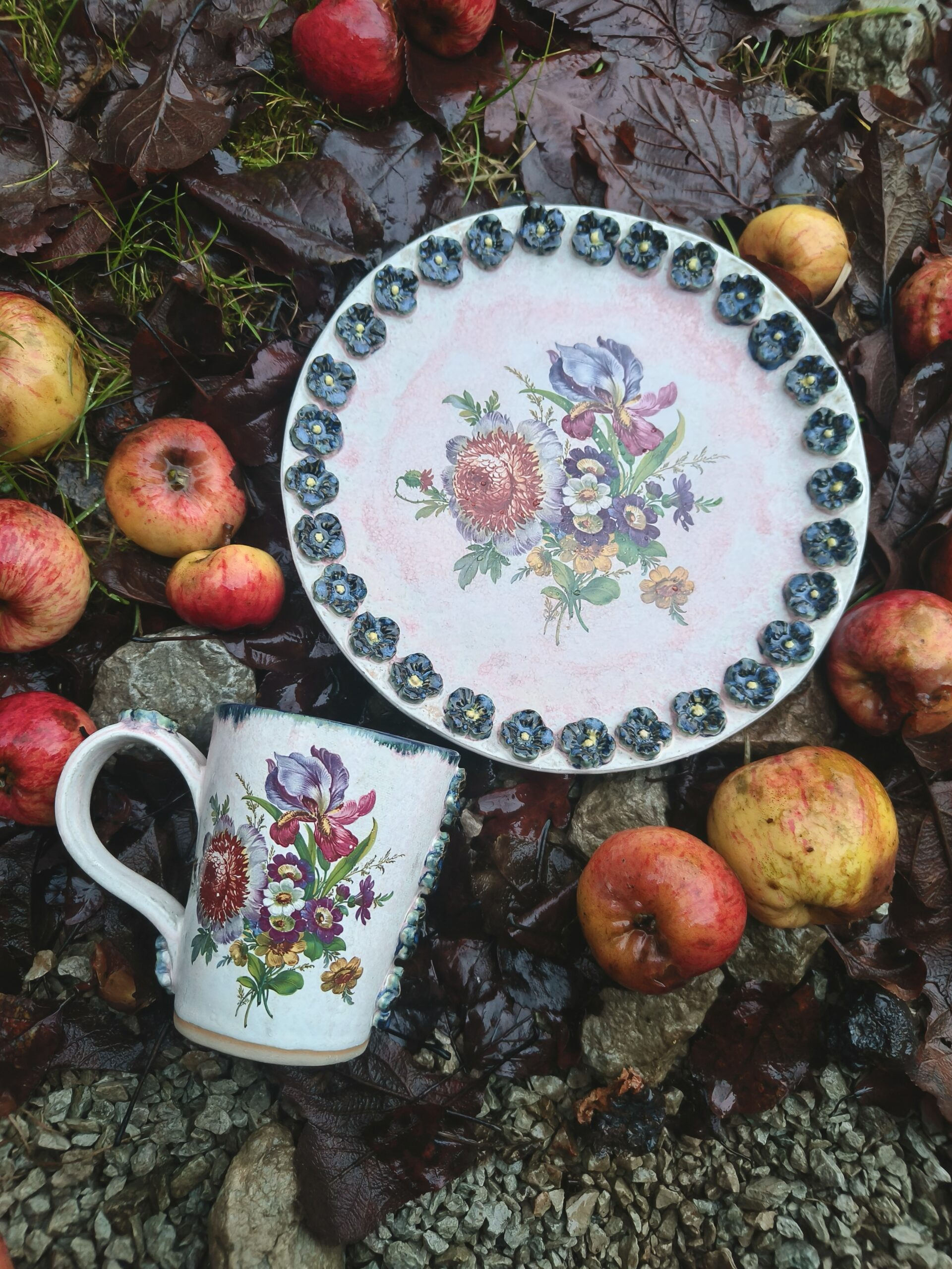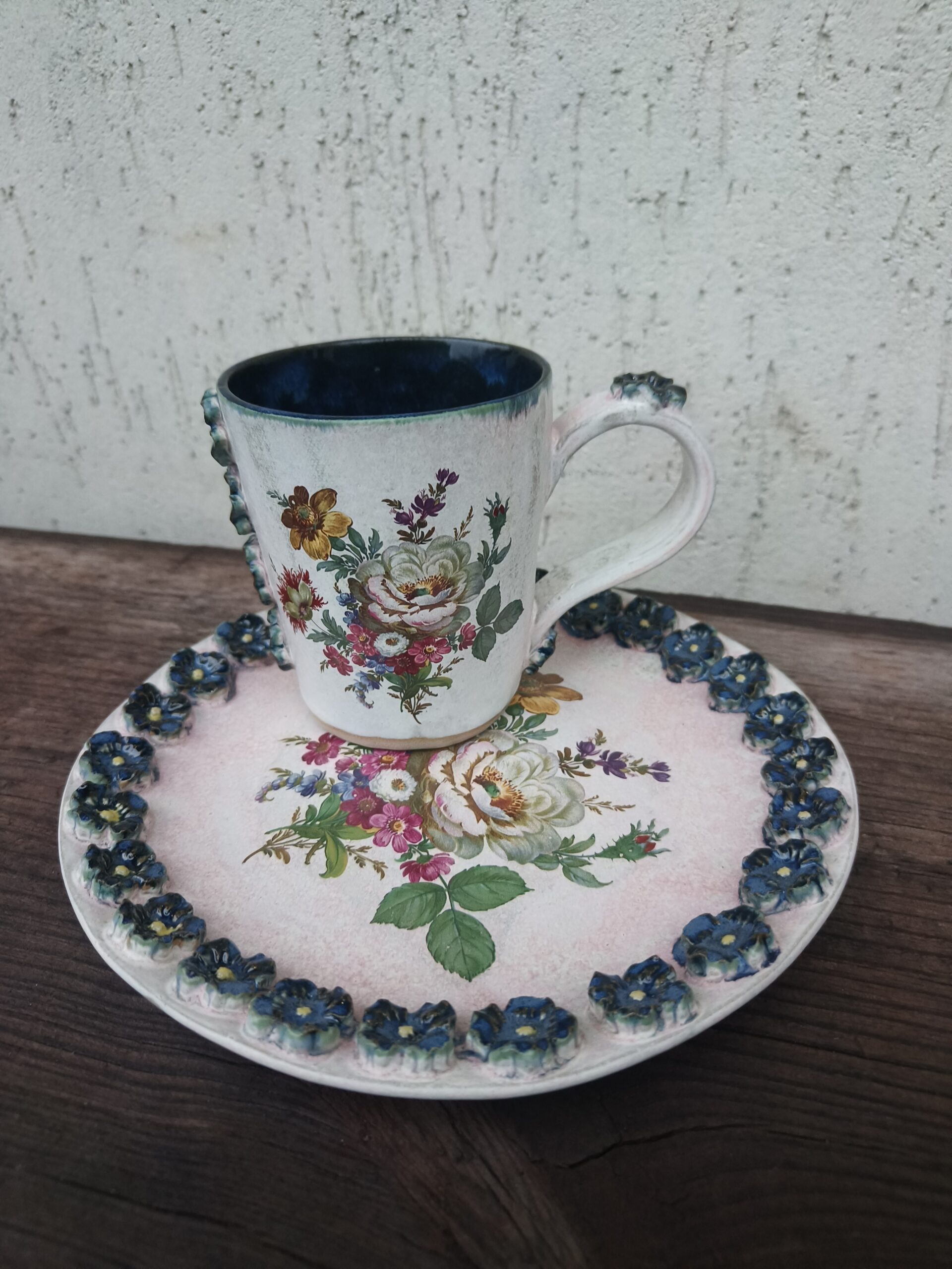 Kõrgkuumus käsitöökeraamika. Kahes mõõdus suured taldrikud /serveerimisvaagnad, mille välisääres on reljeefsetest tumesinistest lilledest pärg ja keskel lopsakas lillkimbu motiiv. Mati glasuuriga. Võib pesta nõudepesumasinas. Väiksema vaagna läbimõõt 20,5 cm. Kõrgus 2 cm. Suurema vaagna läbimõõt 23 cm. Kõrgus 2 cm.