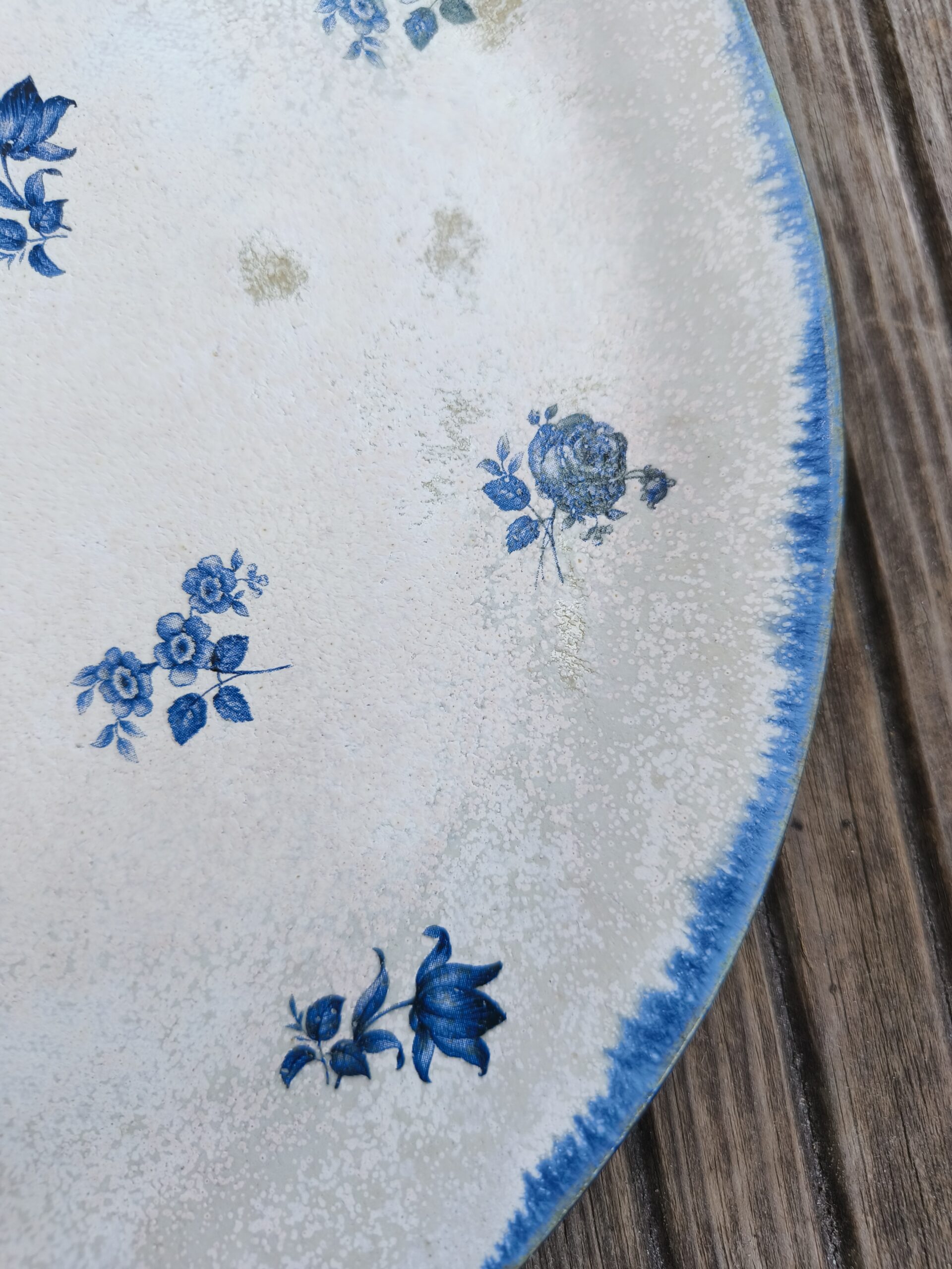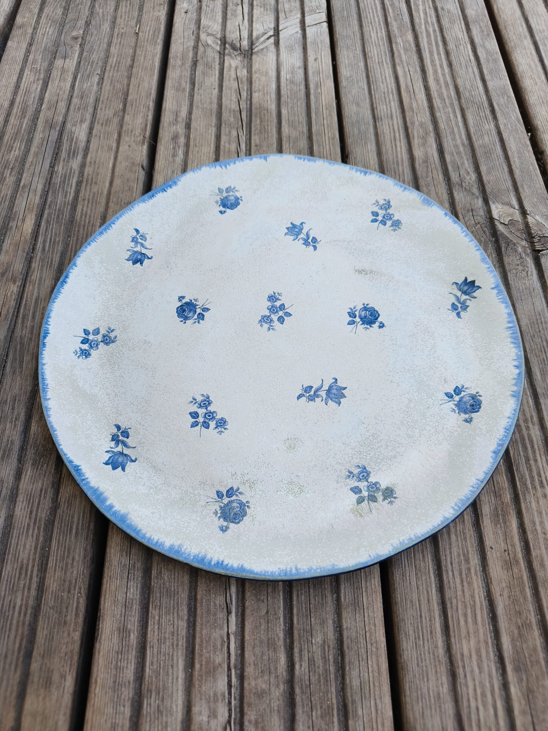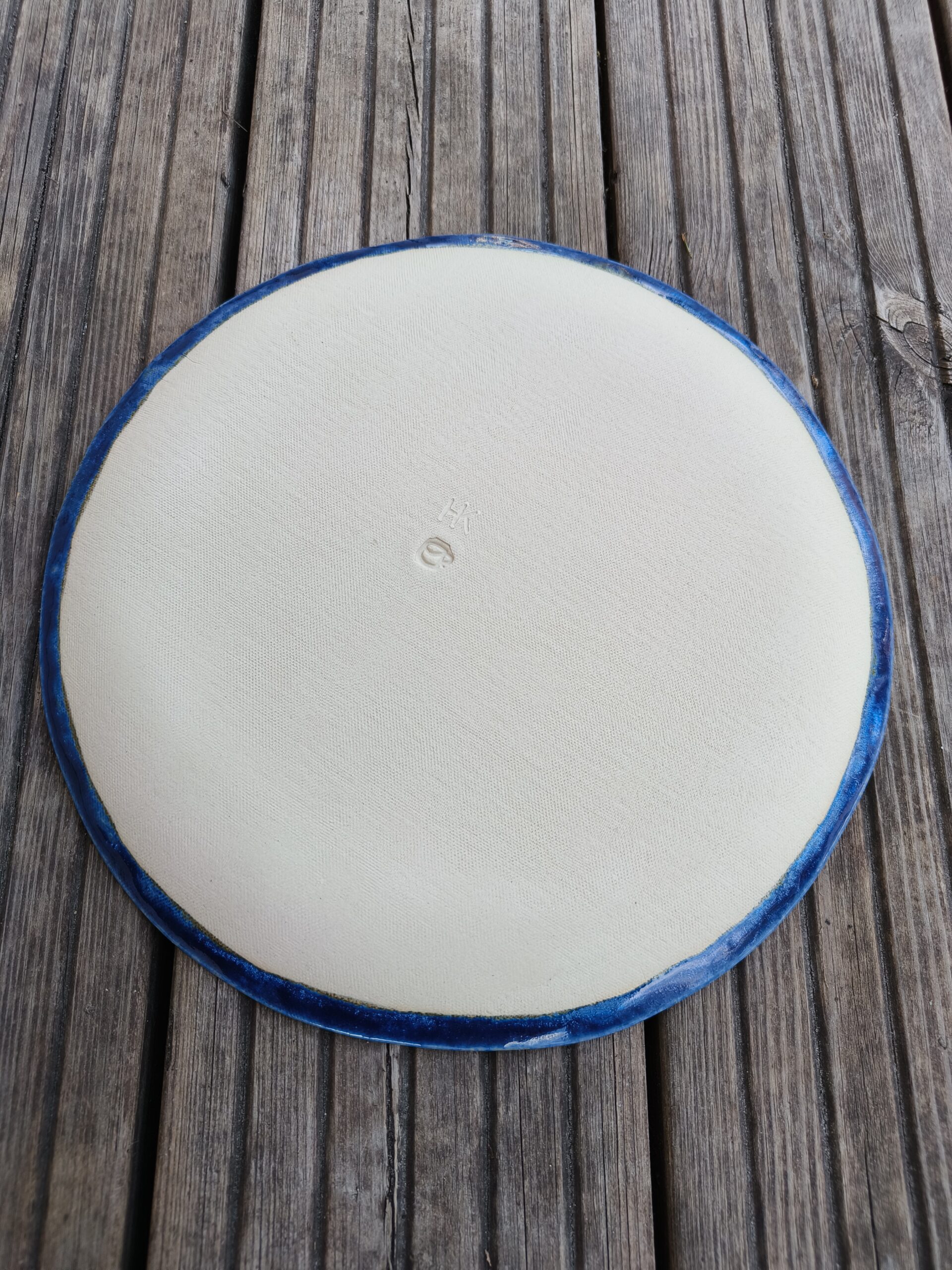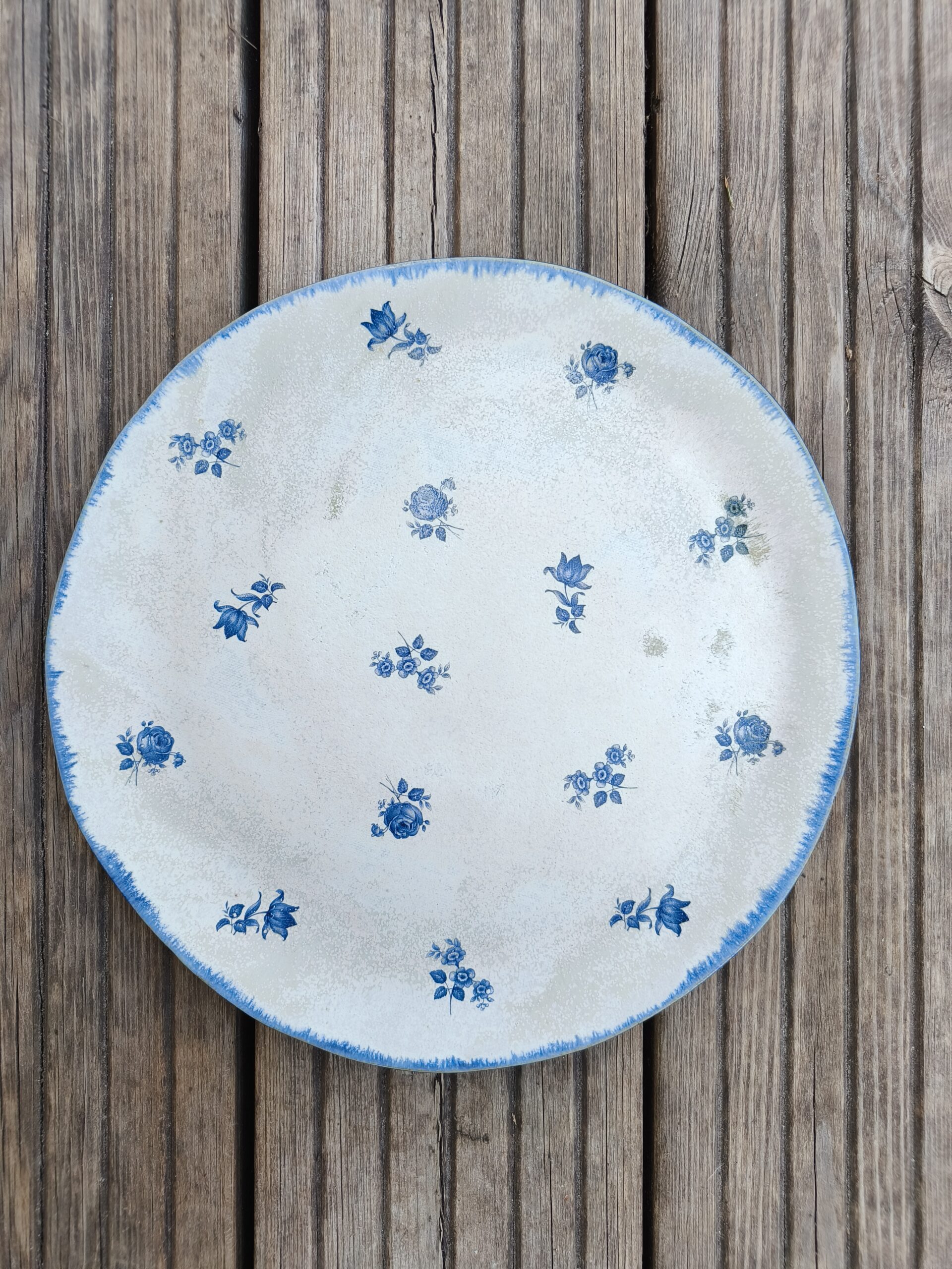 Tumesinise äärega suur taldrik / vaagen, mis on kaunistatud väikeste siniste lillekestega. Läbimõõt 24 cm, kõrgus 1 cm. Võib pesta nõudepesumasinas. Teisi komplekti sobivad sarnases stiilis siniseid tooteid leiab SIIT. Kõrgkuumus käsitöökeraamika.