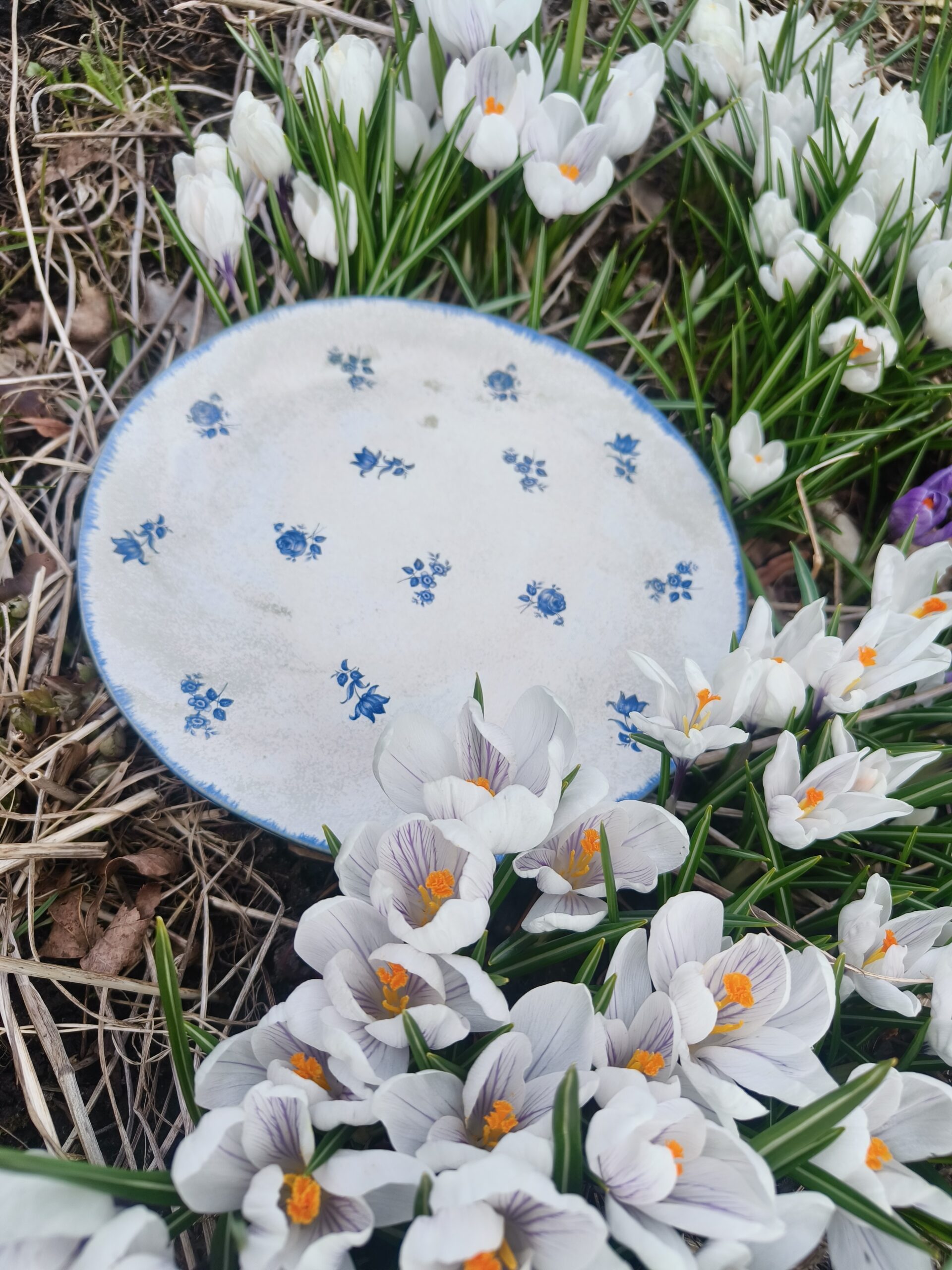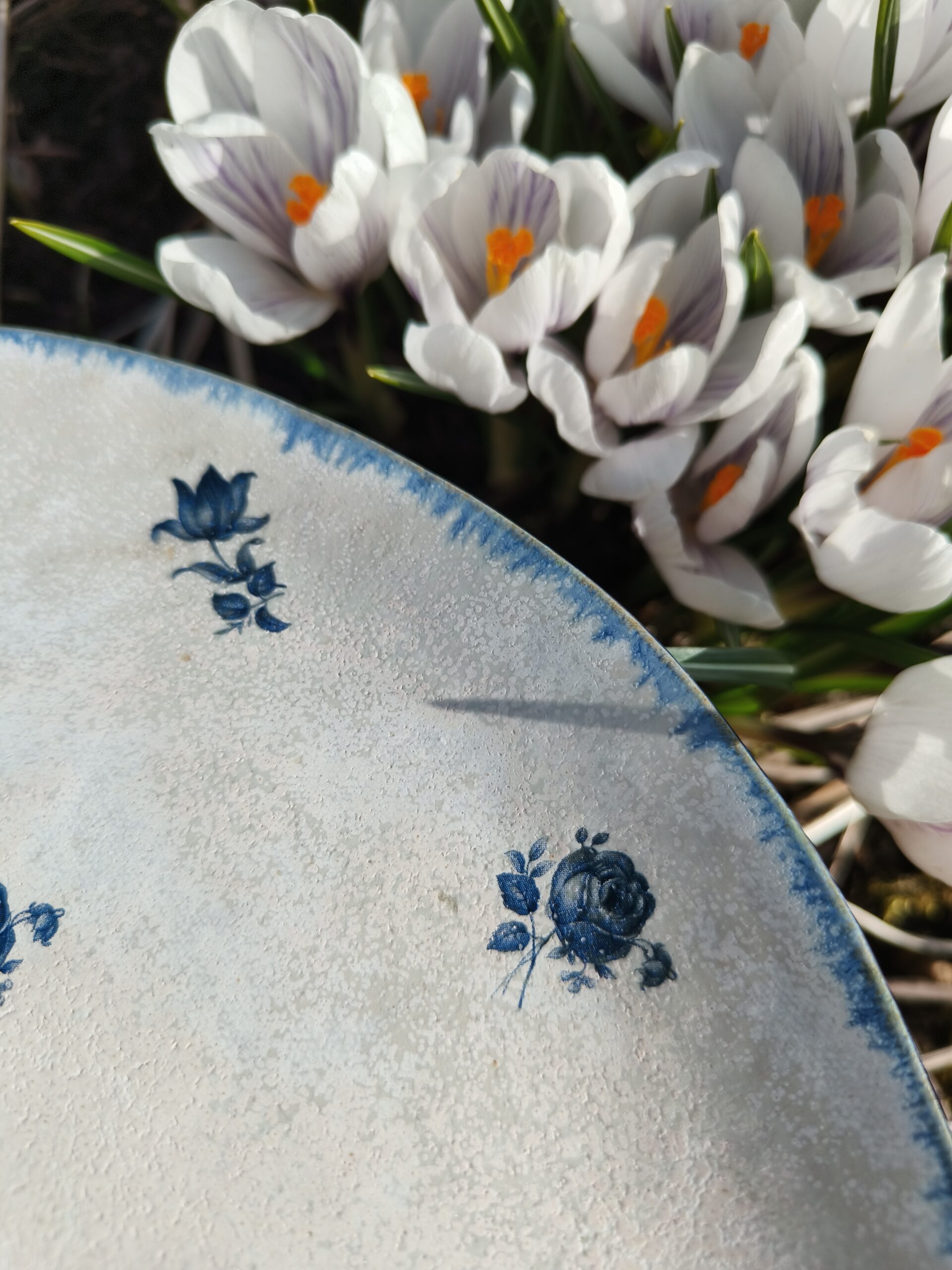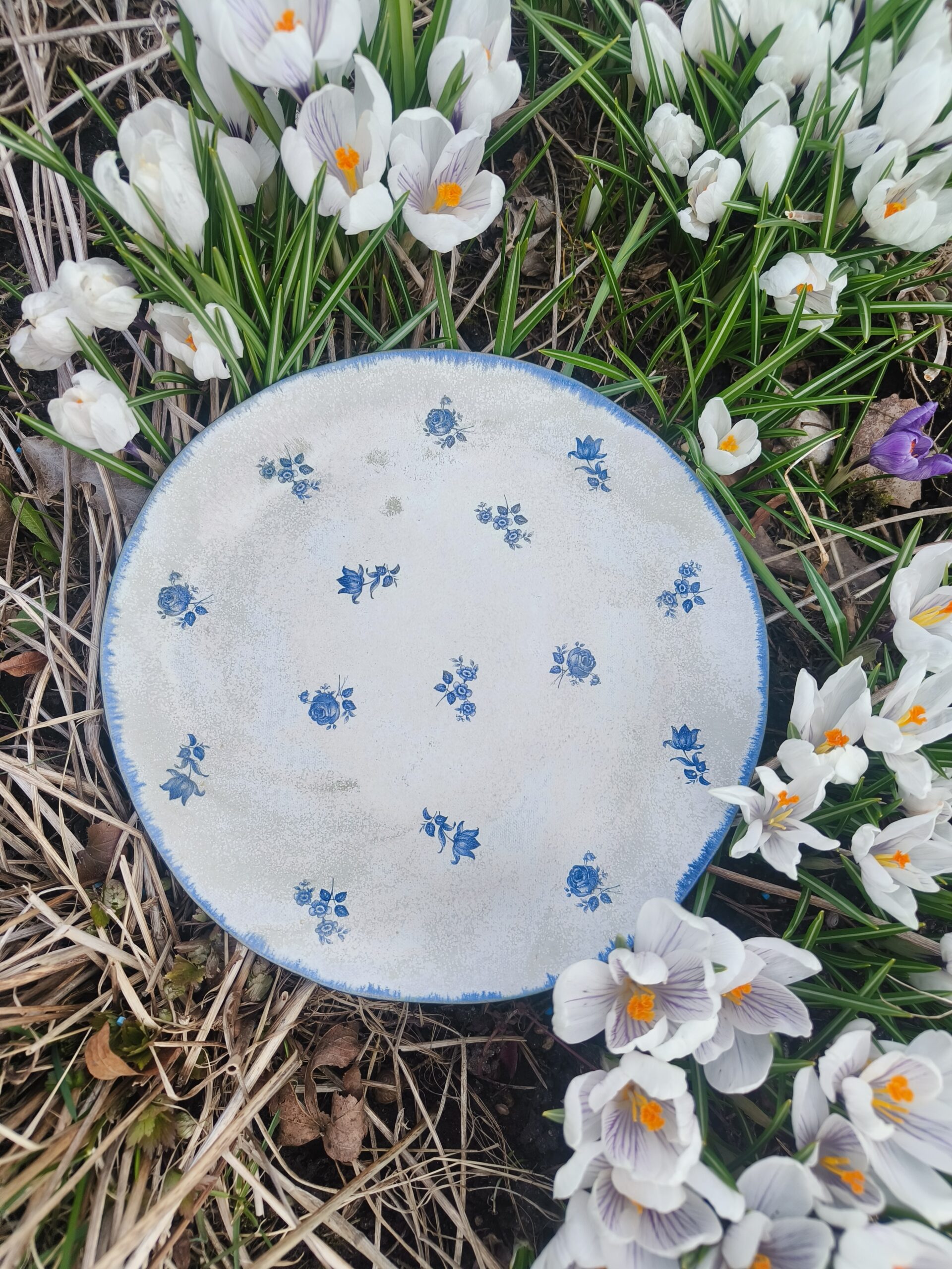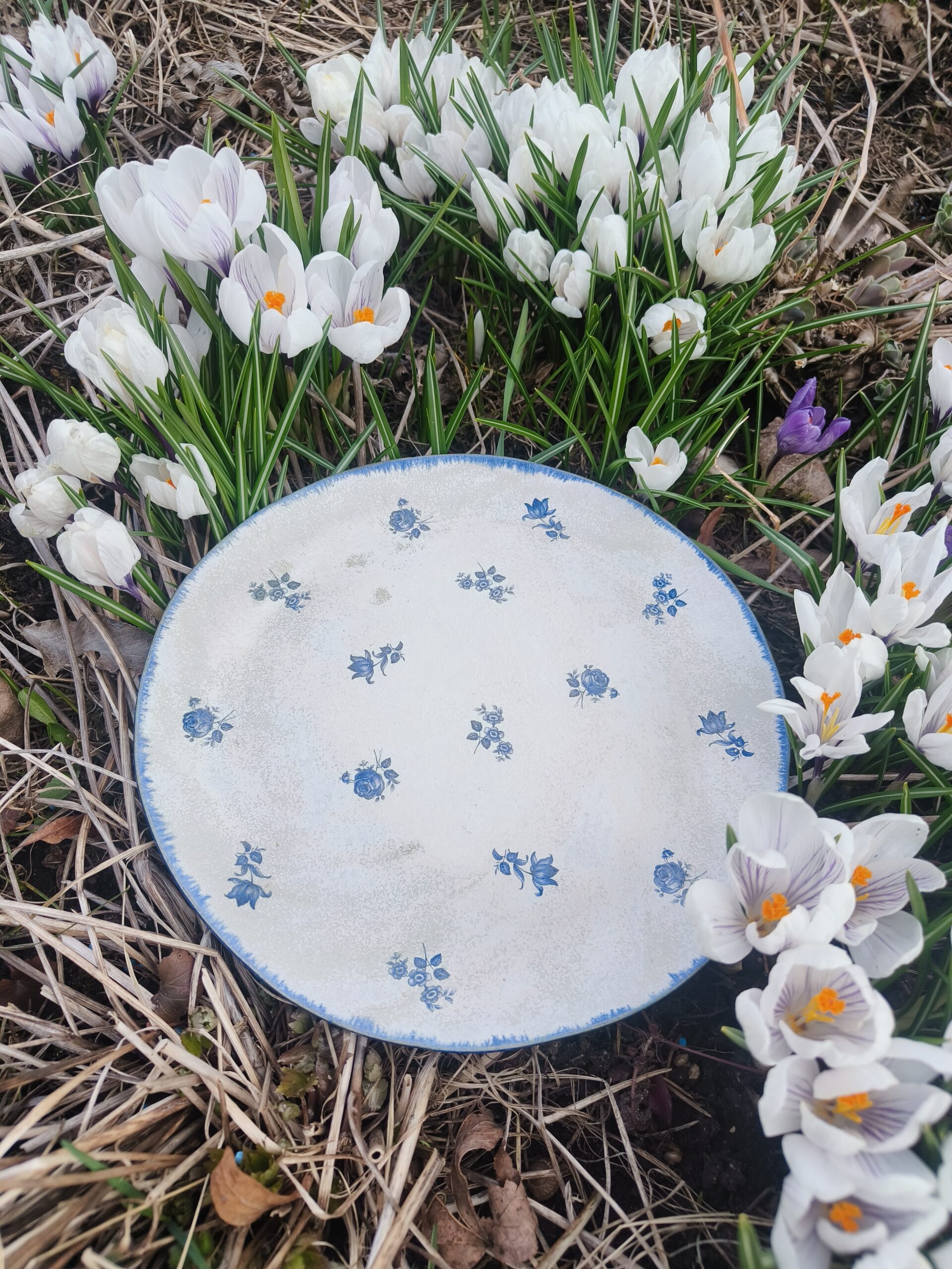 Tumesinise äärega suur taldrik / vaagen, mis on kaunistatud väikeste siniste lillekestega. Läbimõõt 24 cm, kõrgus 1 cm. Võib pesta nõudepesumasinas. Teisi komplekti sobivad sarnases stiilis siniseid tooteid leiab SIIT. Kõrgkuumus käsitöökeraamika.