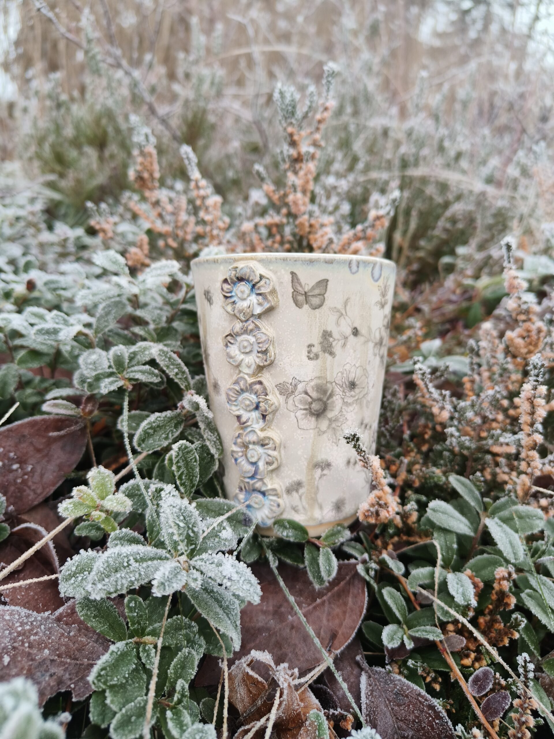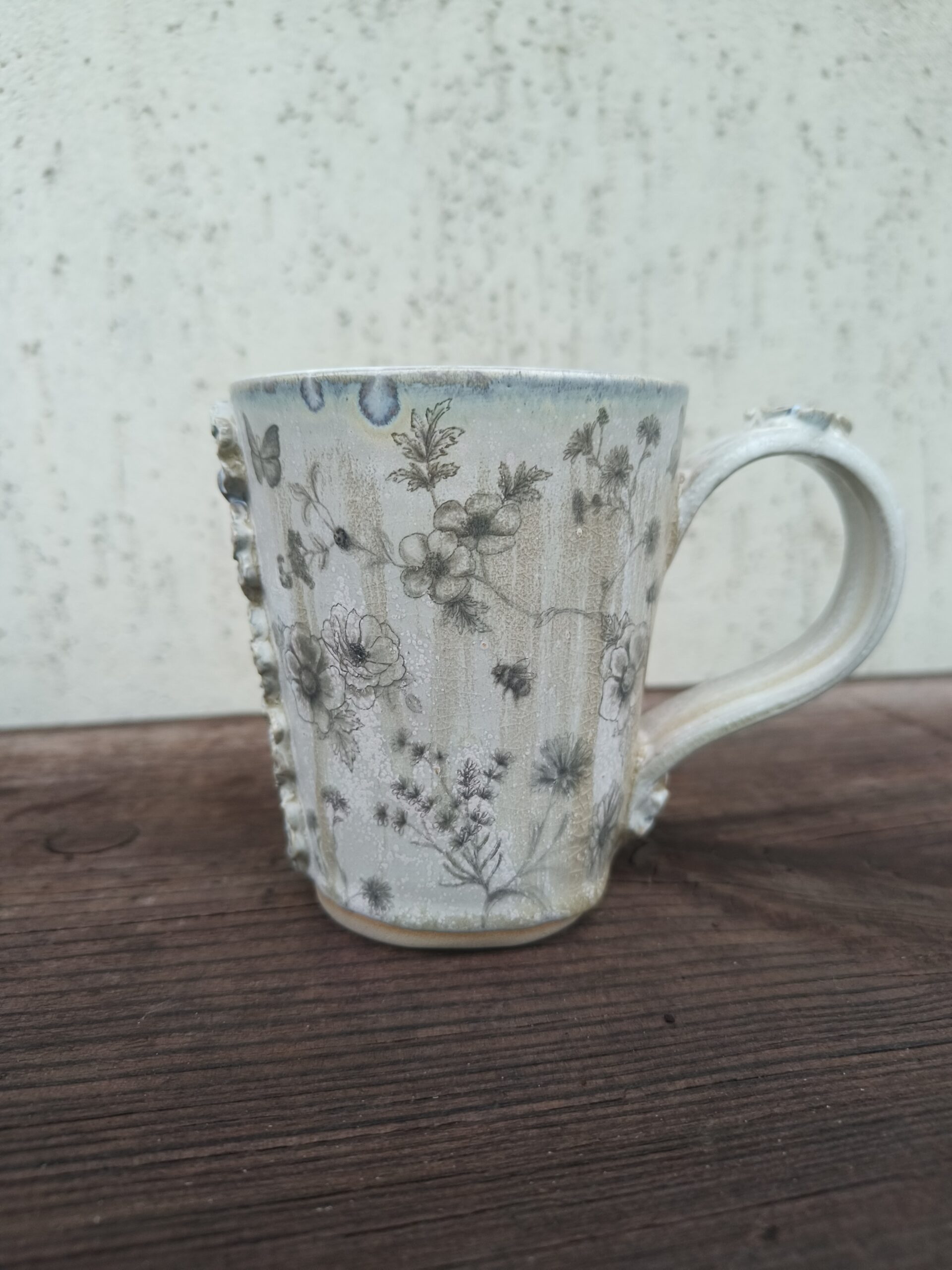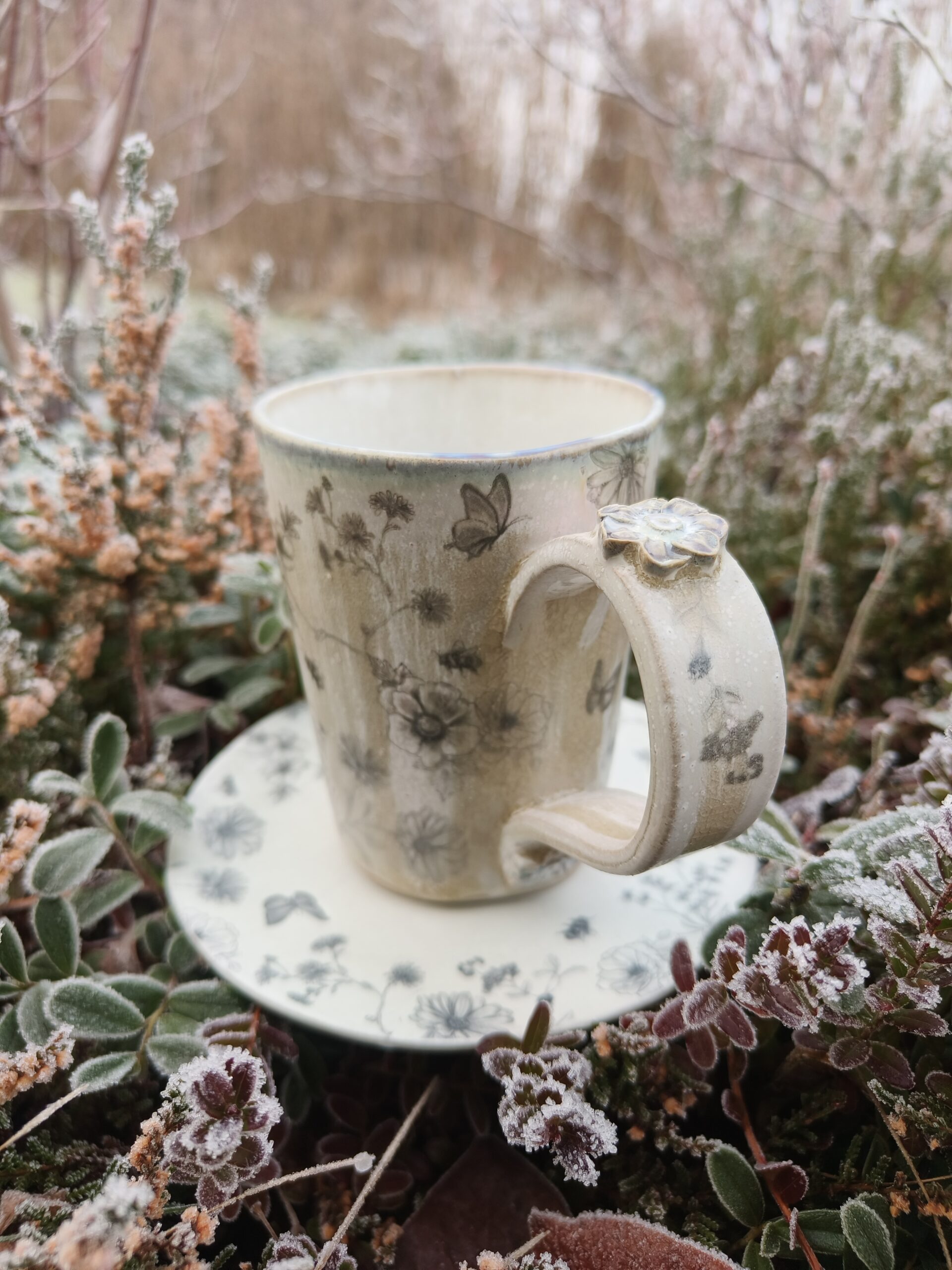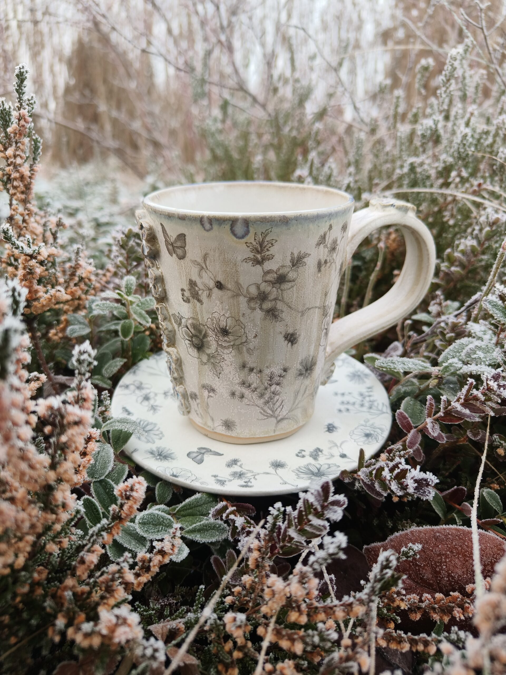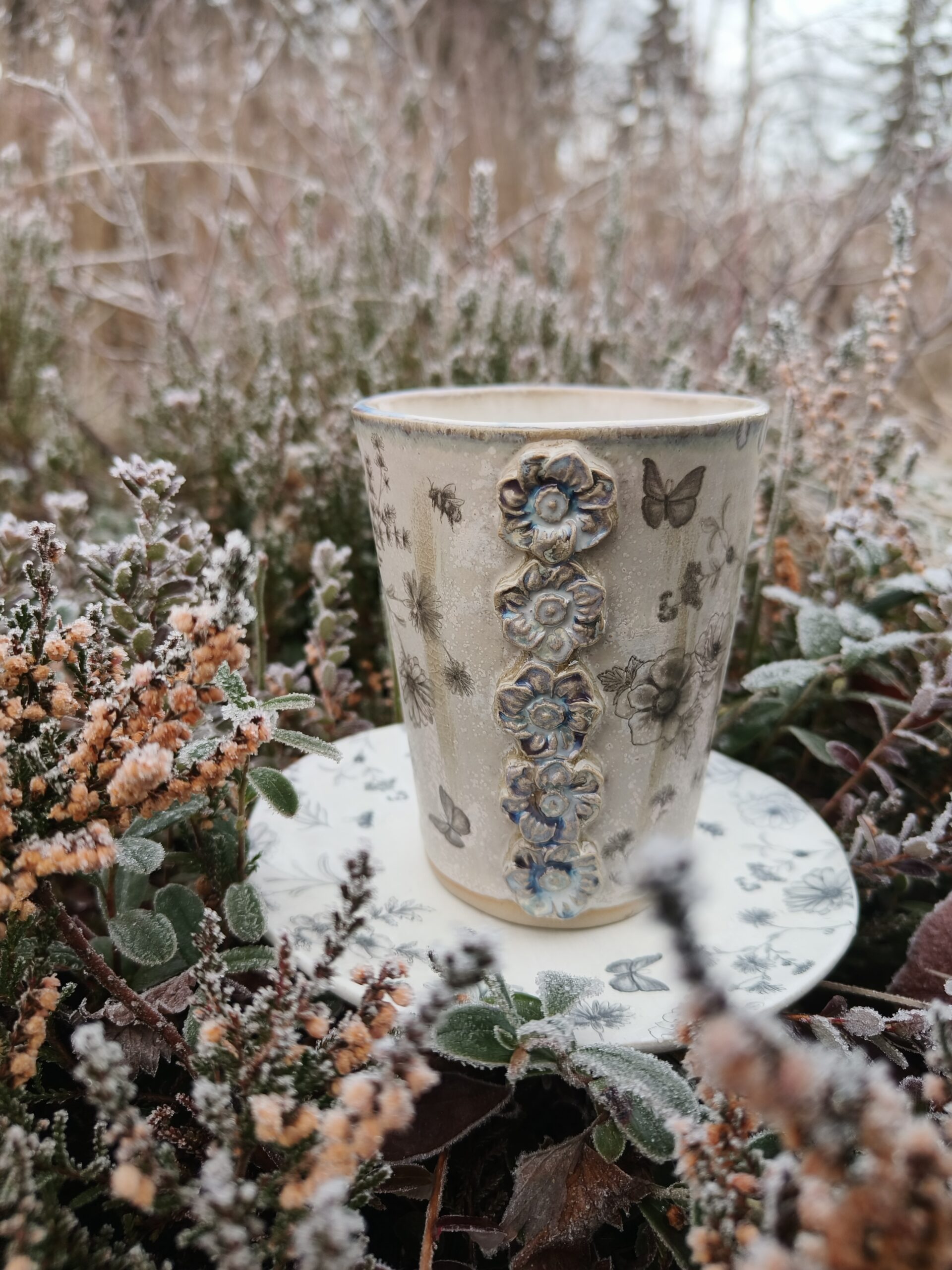 Kõrgkuumus käsitöökeraamika. Kaunite glasuuriefektidega ja tagasihoidliku võluaeda meenutava must-valge taimemustriga kaunistatud tass. Pealt mati, seest läikiva glasuuriga. Tass mahutab 300 ml. Läbimõõt ülevalt 8,5 cm ja alt 6 cm. Kõrgus 10,5 cm. Võib pesta nõudepesumasinas. Komplekti sobiva alustaldriku leiab SIIT. Kohtades, kus glasuuri on paksult, esineb pragulisust (kraklee) ja kollakas läikiv kiht. Tegemist ei ole defektiga, vaid selle glasuuri eripäraga. Vaata viimaseid pilte.