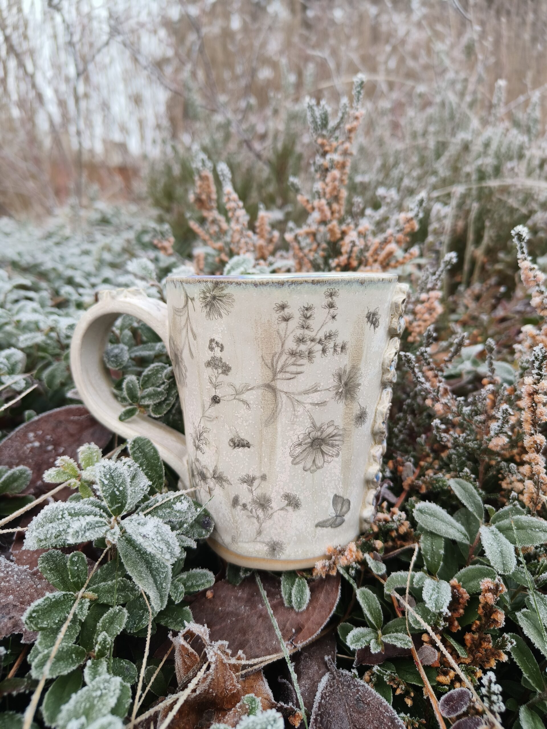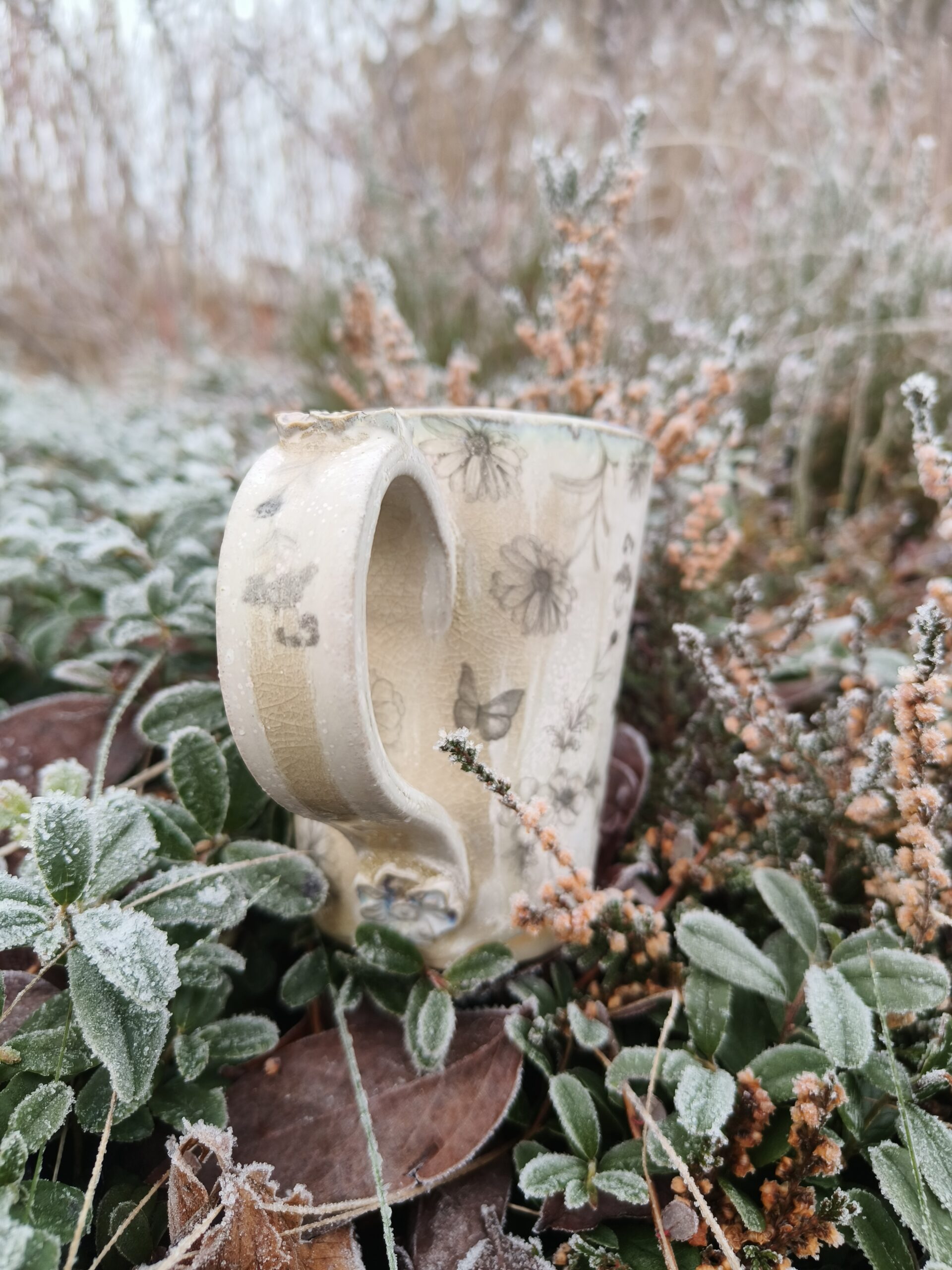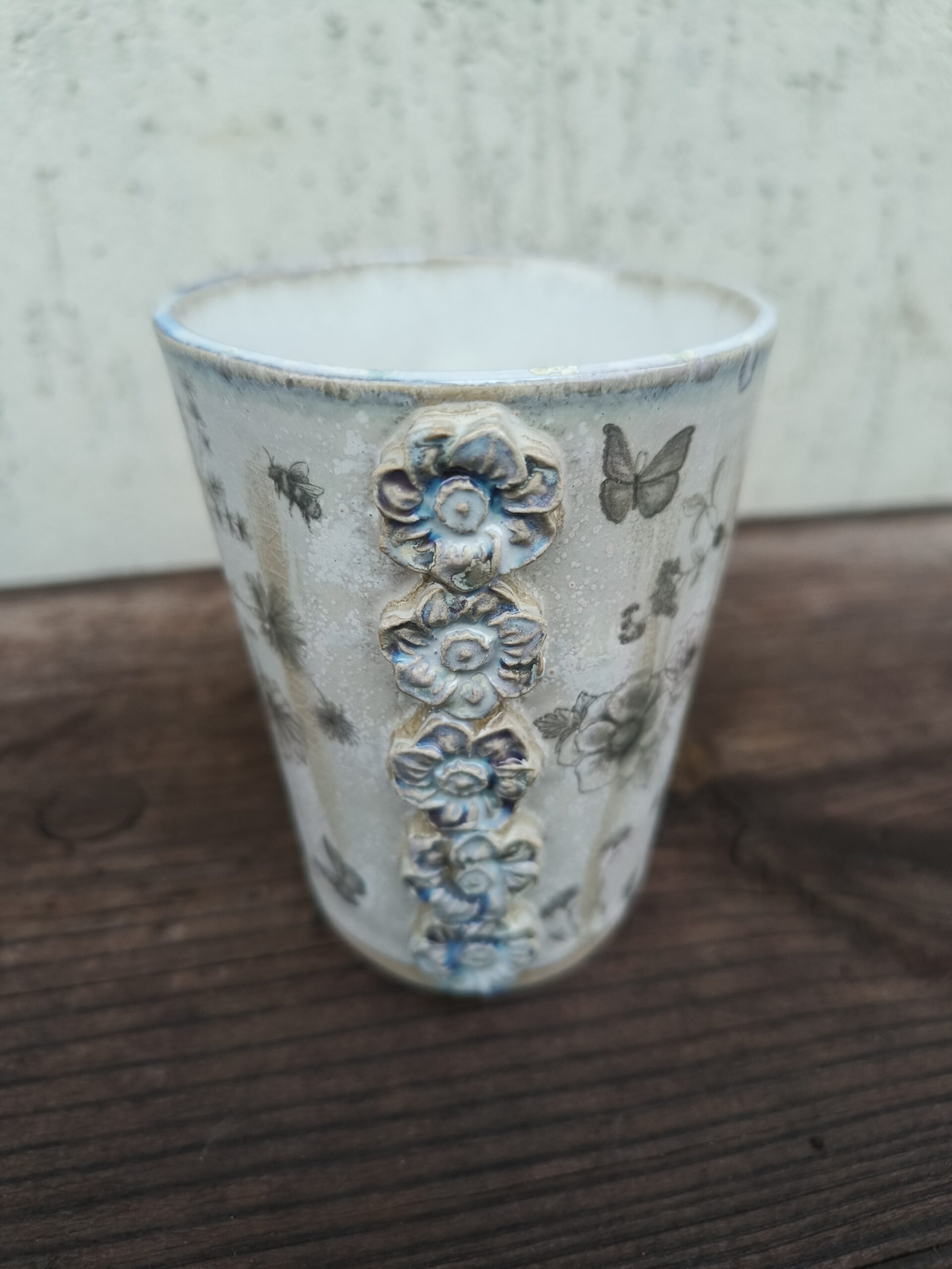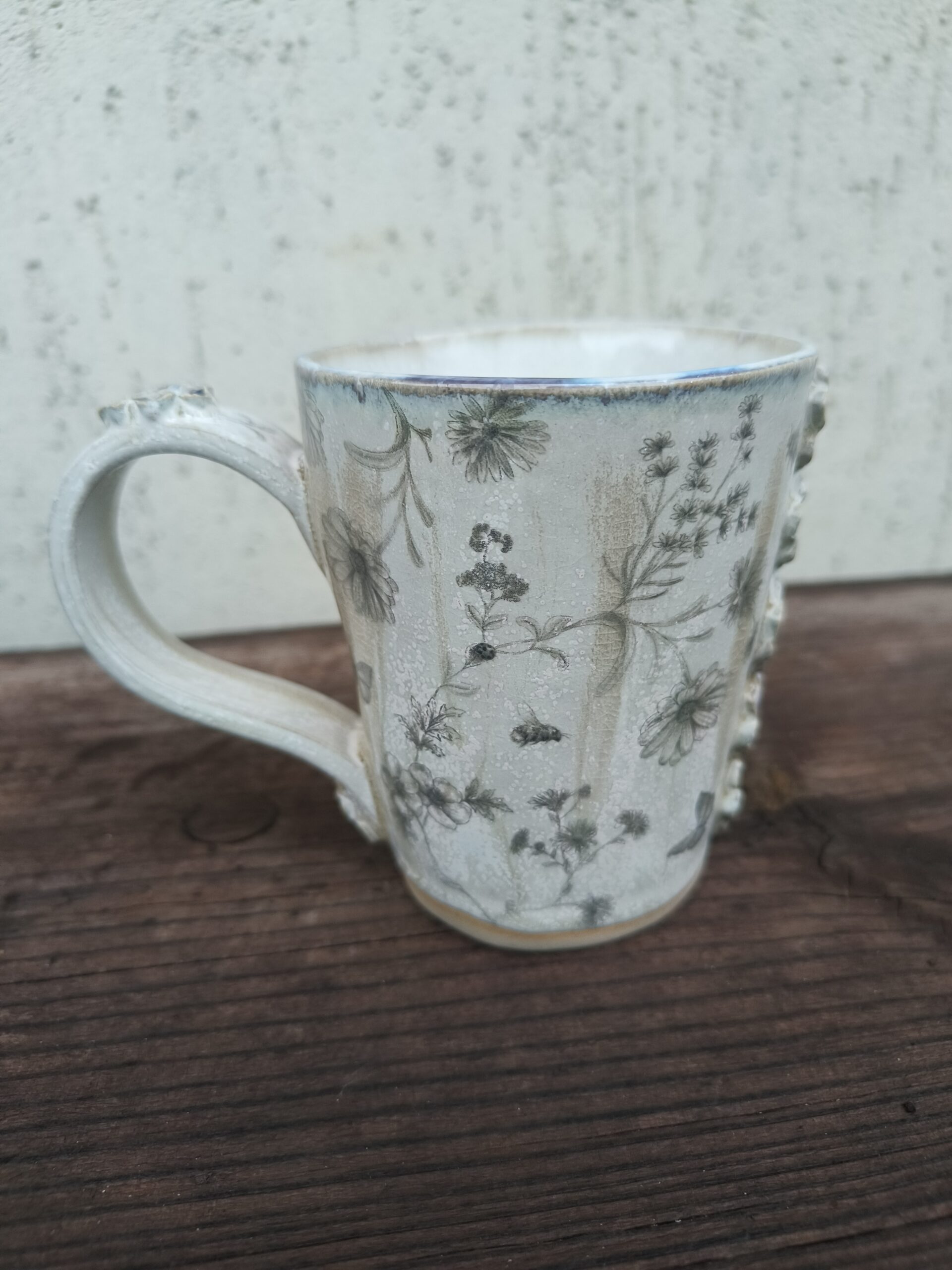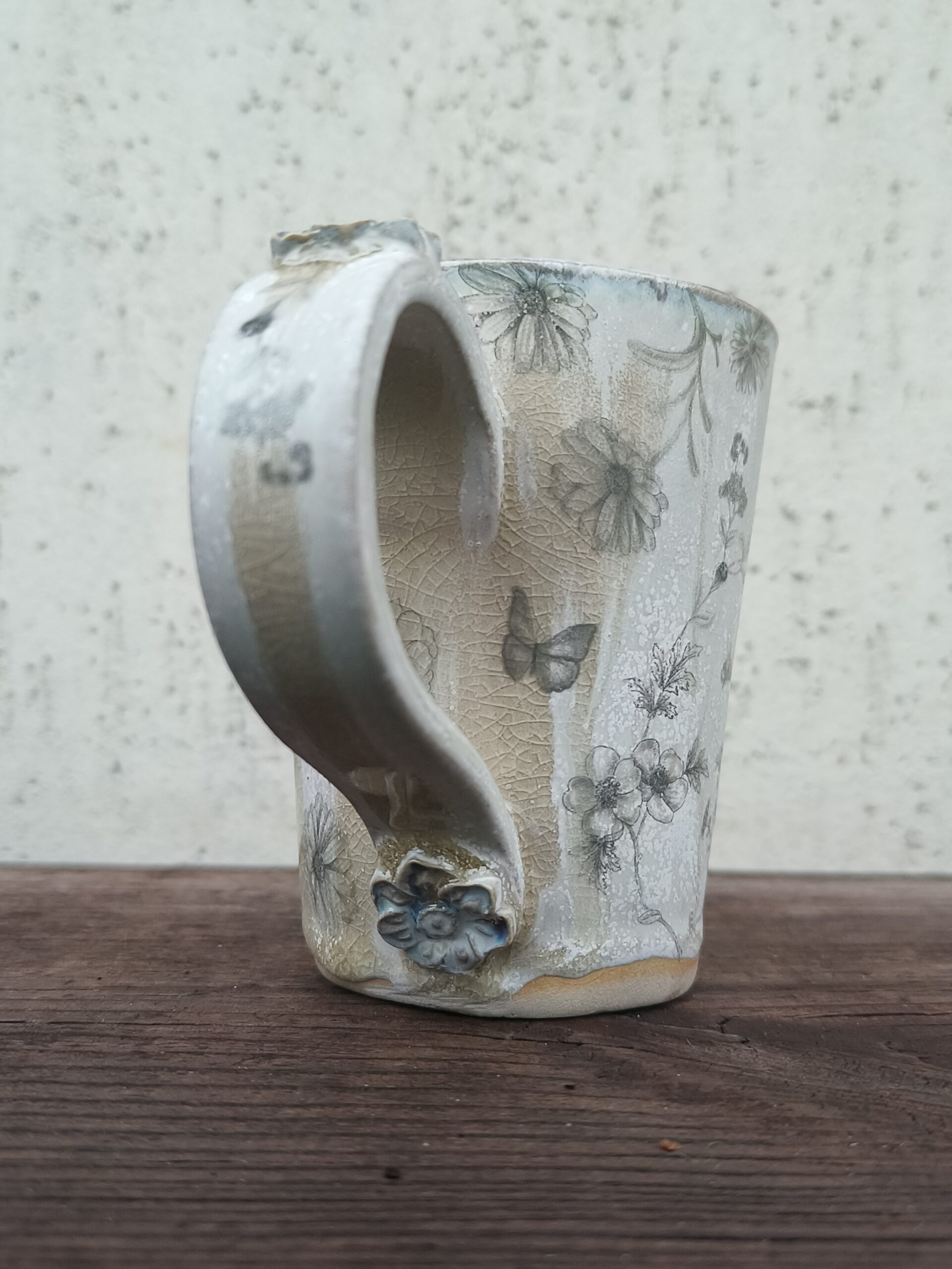 Kõrgkuumus käsitöökeraamika. Kaunite glasuuriefektidega ja tagasihoidliku võluaeda meenutava must-valge taimemustriga kaunistatud tass. Pealt mati, seest läikiva glasuuriga. Tass mahutab 300 ml. Läbimõõt ülevalt 8,5 cm ja alt 6 cm. Kõrgus 10,5 cm. Võib pesta nõudepesumasinas. Komplekti sobiva alustaldriku leiab SIIT. Kohtades, kus glasuuri on paksult, esineb pragulisust (kraklee) ja kollakas läikiv kiht. Tegemist ei ole defektiga, vaid selle glasuuri eripäraga. Vaata viimaseid pilte.