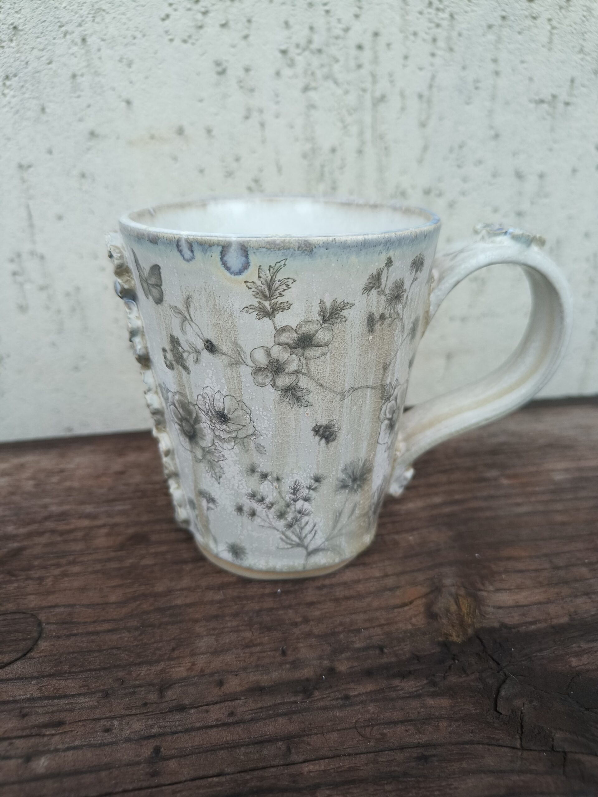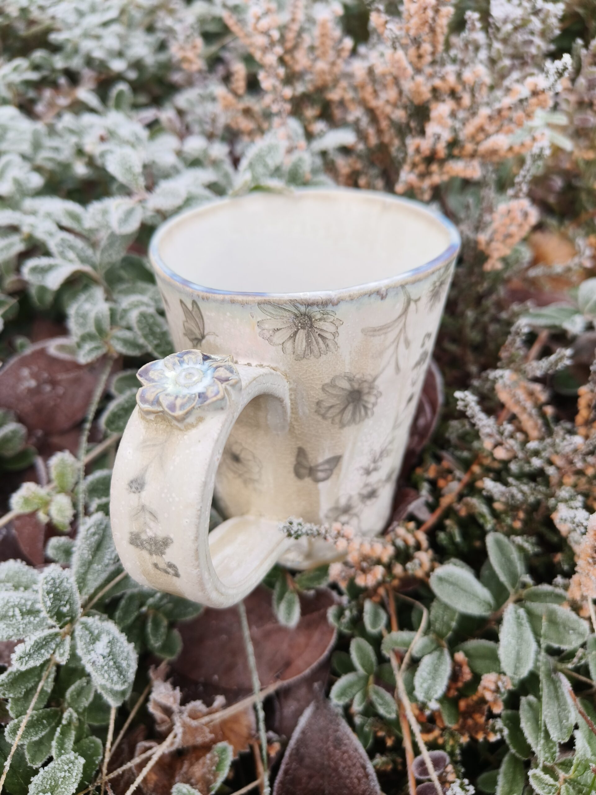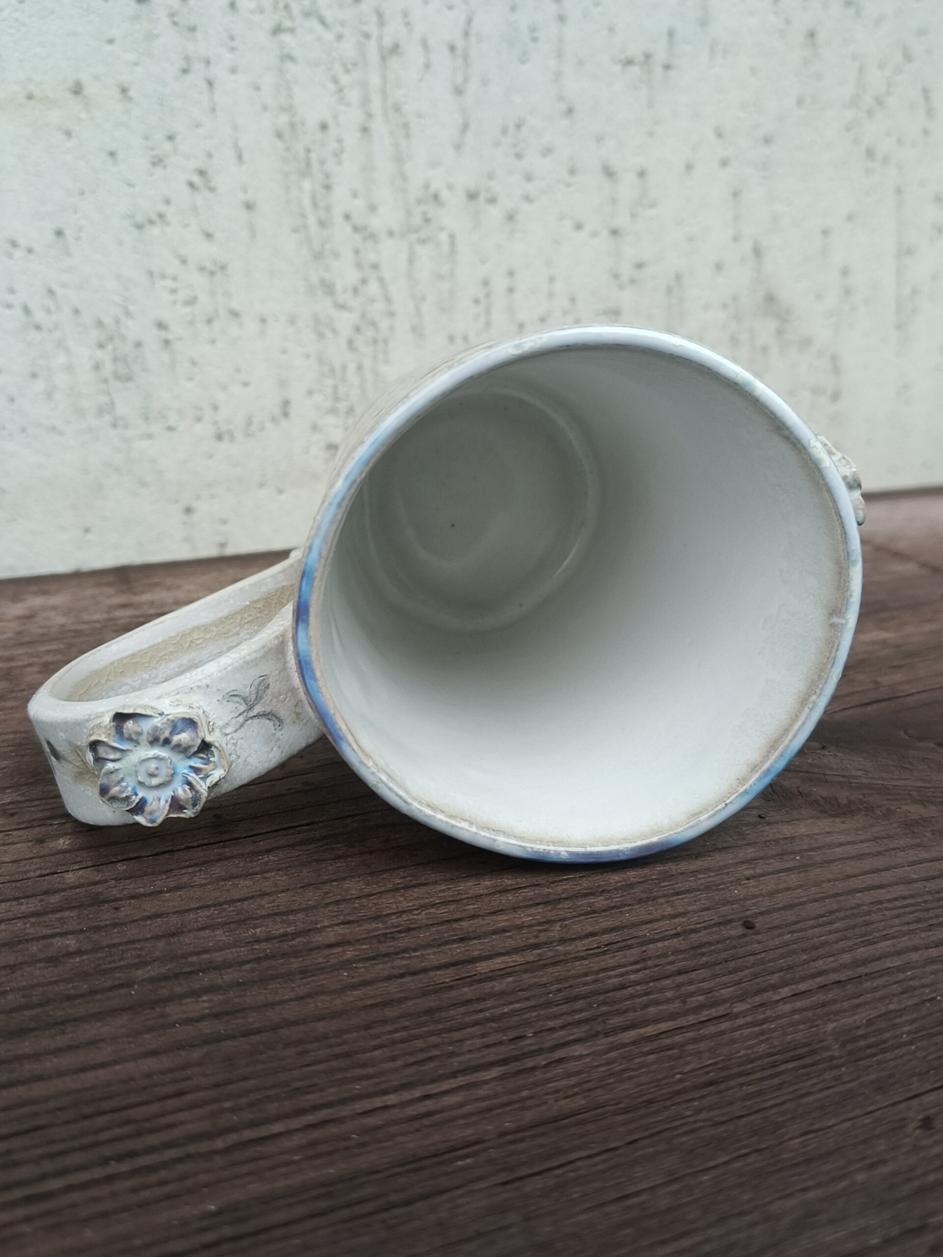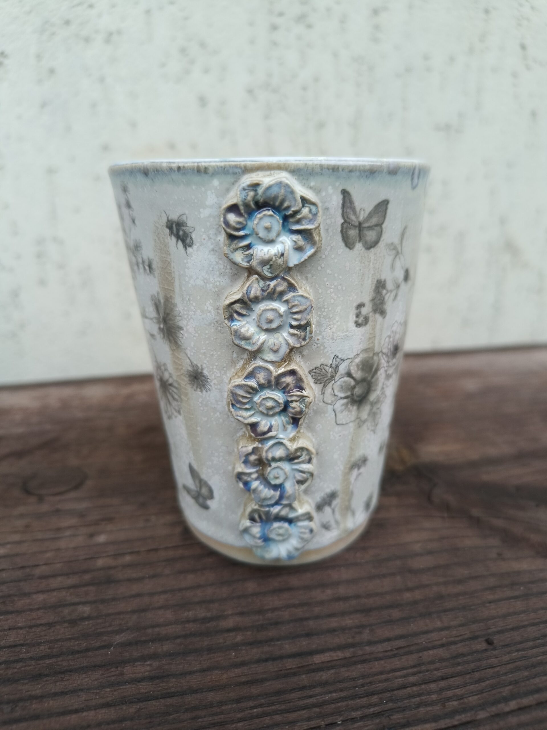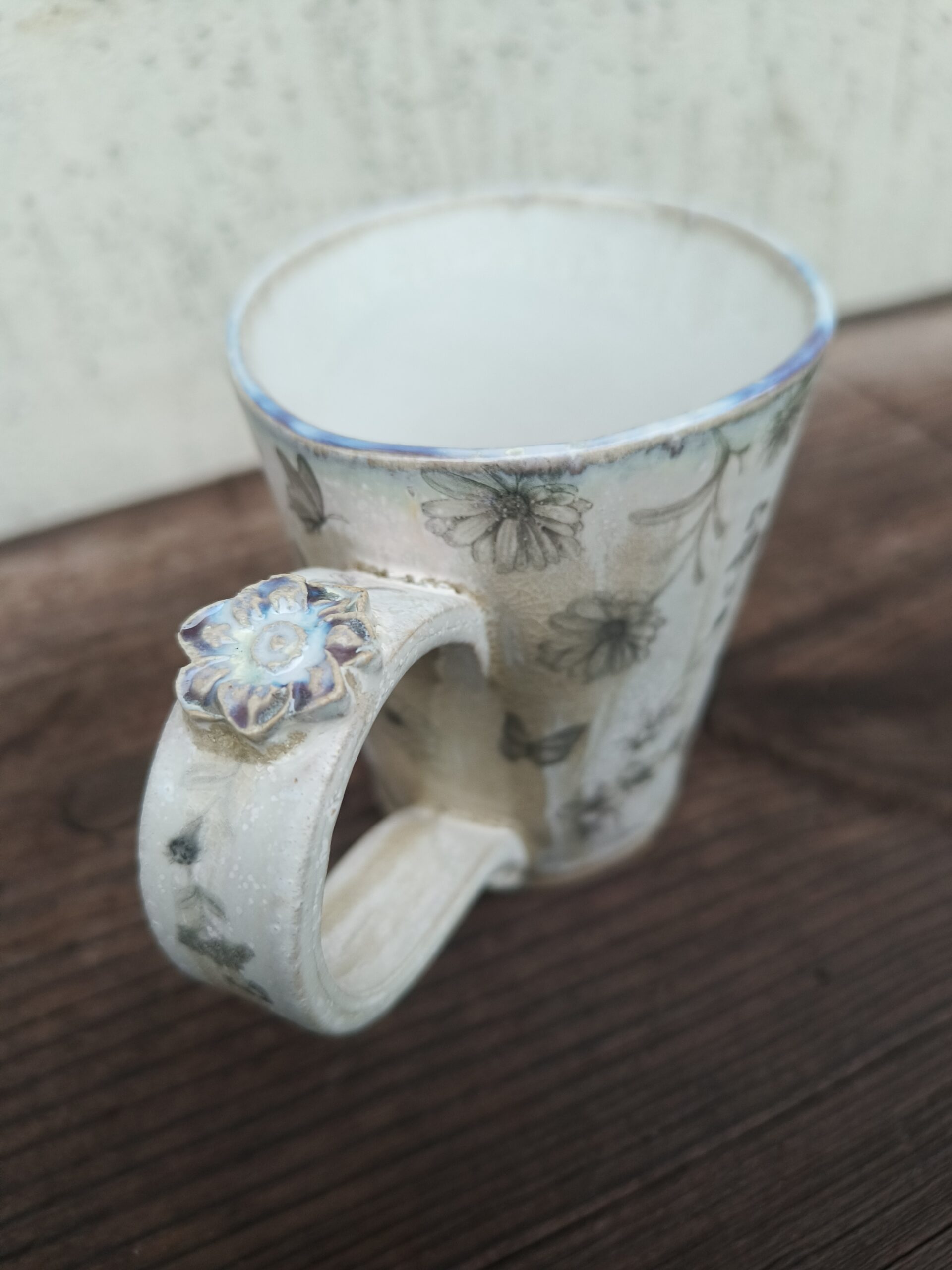 Kõrgkuumus käsitöökeraamika. Kaunite glasuuriefektidega ja tagasihoidliku võluaeda meenutava must-valge taimemustriga kaunistatud tass. Pealt mati, seest läikiva glasuuriga. Tass mahutab 300 ml. Läbimõõt ülevalt 8,5 cm ja alt 6 cm. Kõrgus 10,5 cm. Võib pesta nõudepesumasinas. Komplekti sobiva alustaldriku leiab SIIT. Kohtades, kus glasuuri on paksult, esineb pragulisust (kraklee) ja kollakas läikiv kiht. Tegemist ei ole defektiga, vaid selle glasuuri eripäraga. Vaata viimaseid pilte.