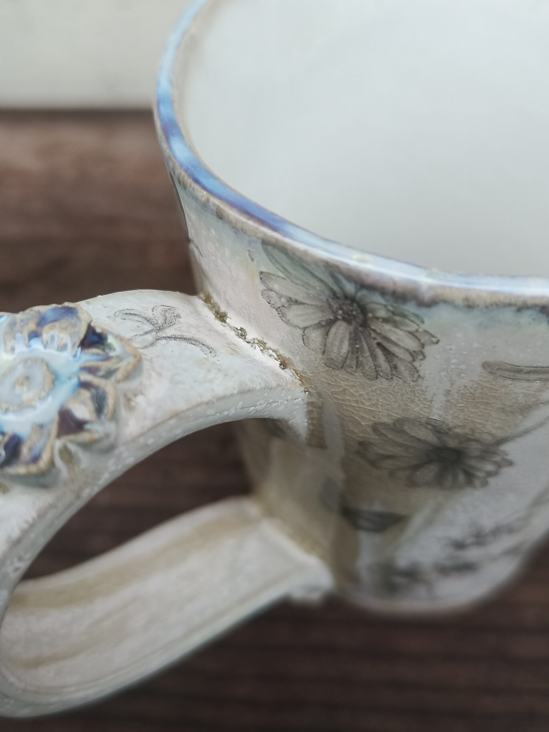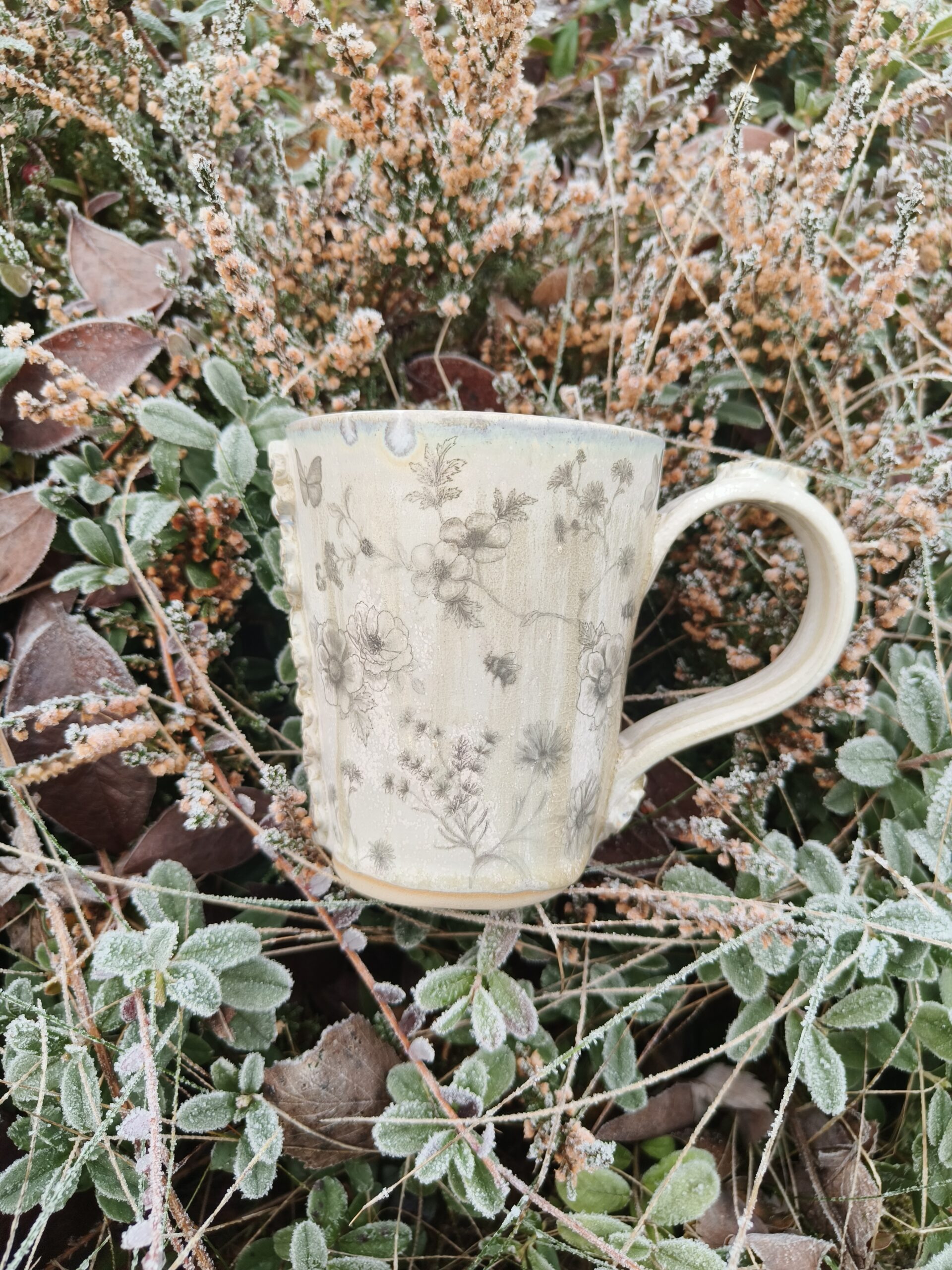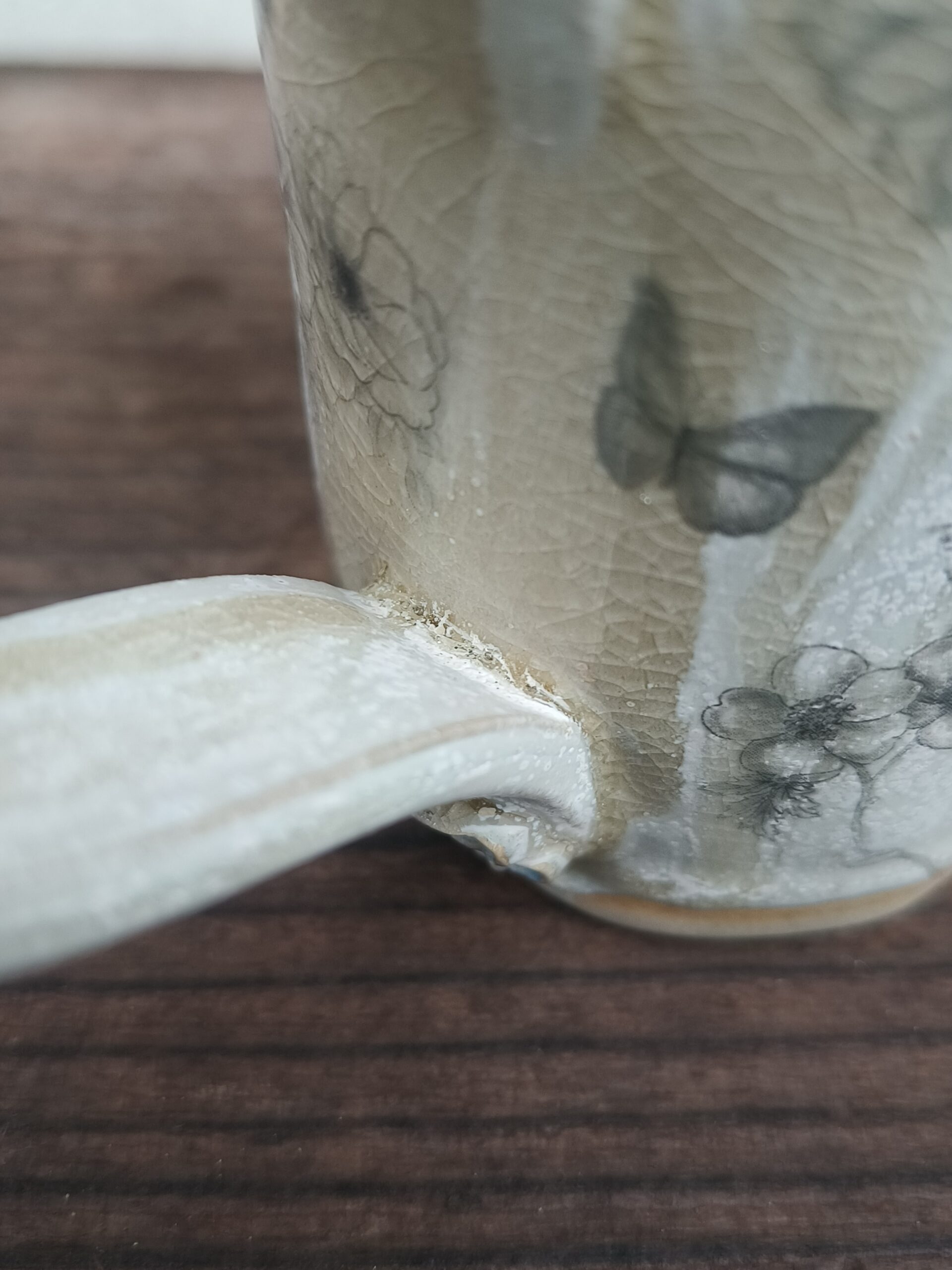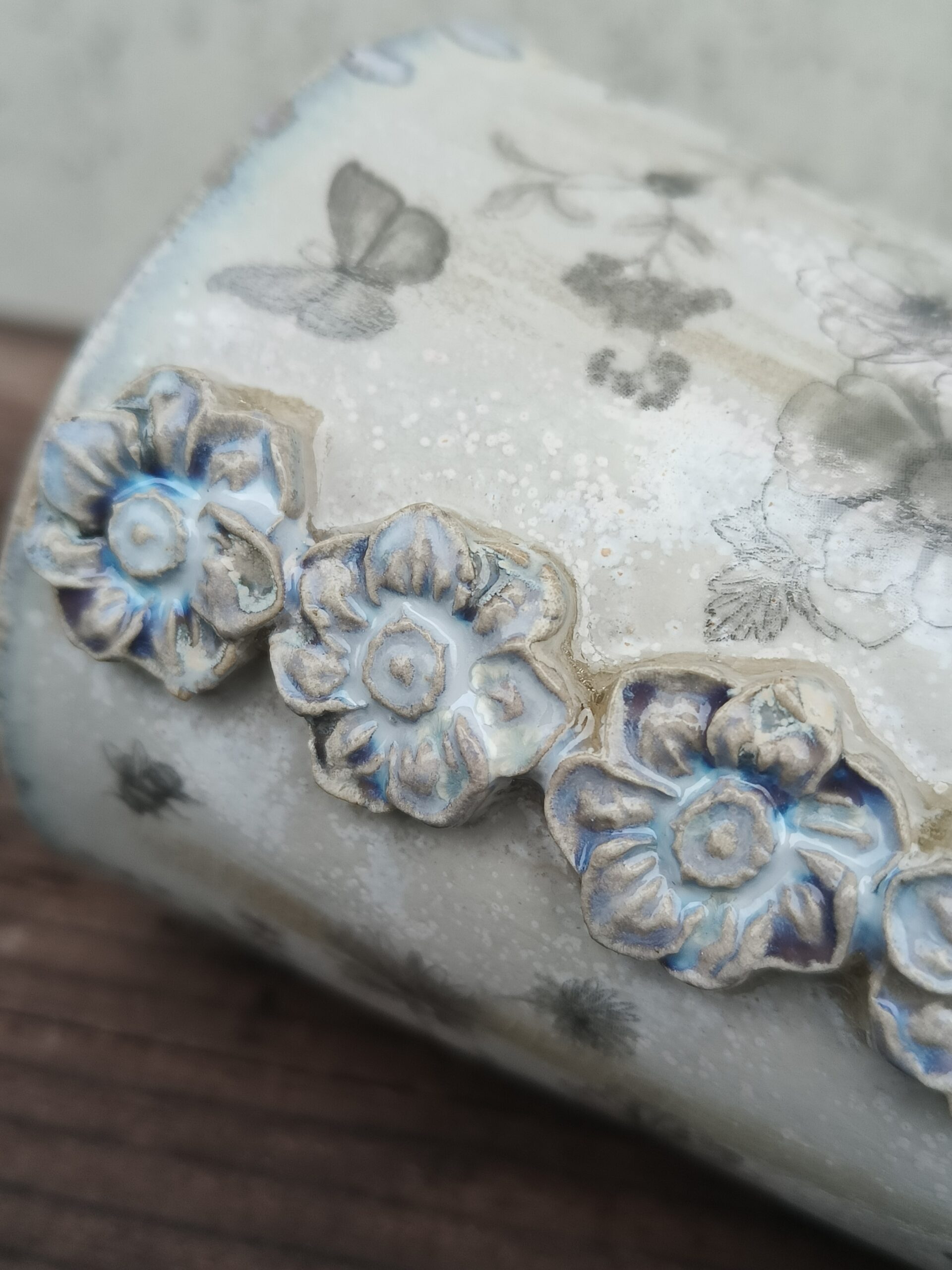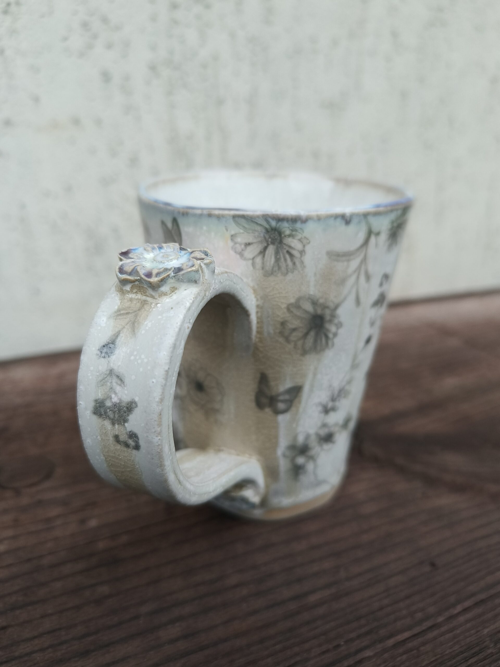 Kõrgkuumus käsitöökeraamika. Kaunite glasuuriefektidega ja tagasihoidliku võluaeda meenutava must-valge taimemustriga kaunistatud tass. Pealt mati, seest läikiva glasuuriga. Tass mahutab 300 ml. Läbimõõt ülevalt 8,5 cm ja alt 6 cm. Kõrgus 10,5 cm. Võib pesta nõudepesumasinas. Komplekti sobiva alustaldriku leiab SIIT. Kohtades, kus glasuuri on paksult, esineb pragulisust (kraklee) ja kollakas läikiv kiht. Tegemist ei ole defektiga, vaid selle glasuuri eripäraga. Vaata viimaseid pilte.